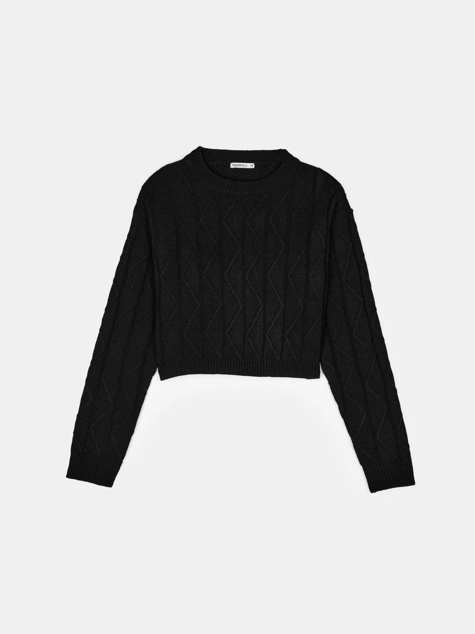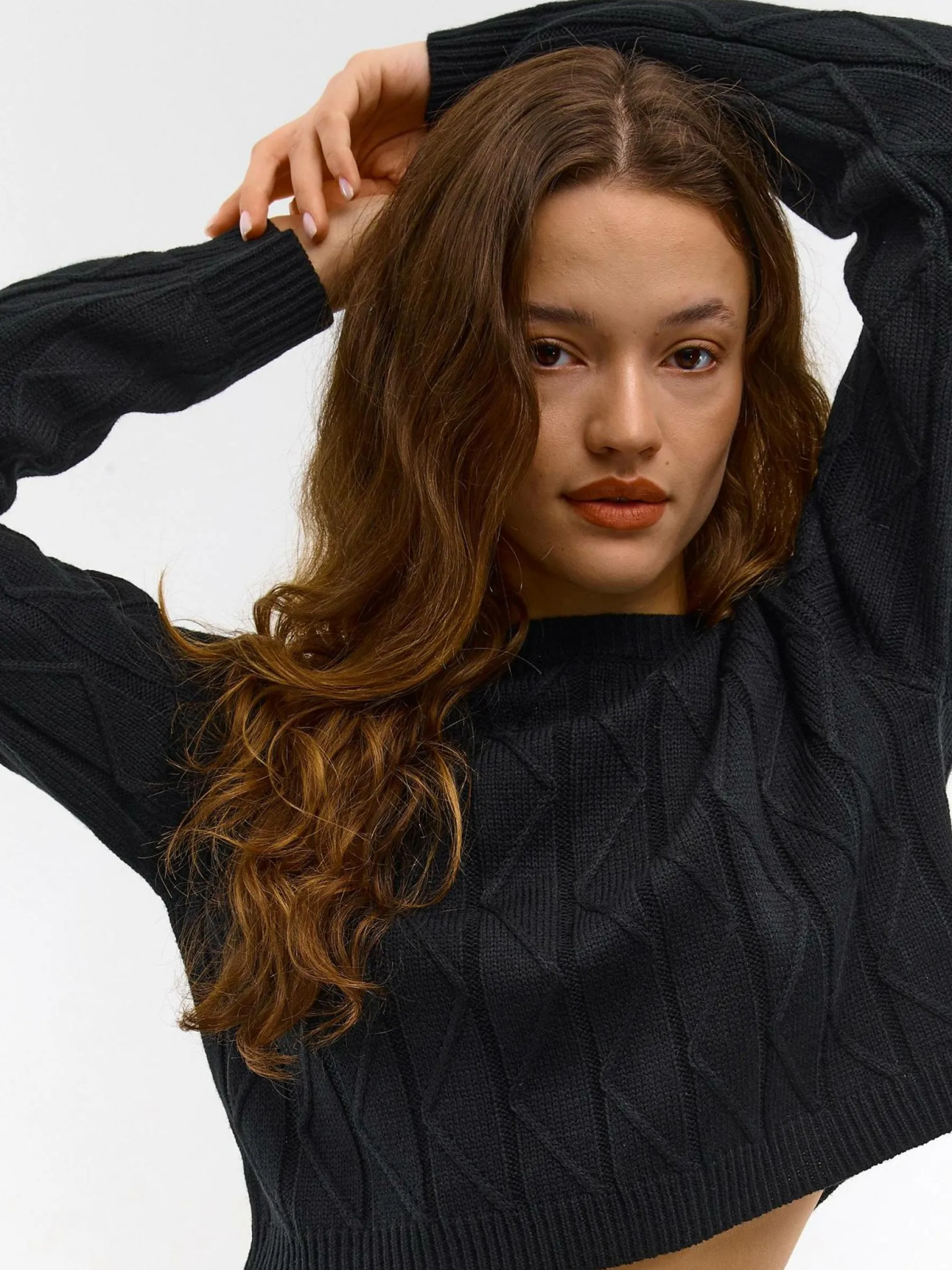 Kolor: czarnyKrój: regularTyp: swetryRekaw: długi rękawDługość: krótki topPattern style: pojedynczy kolor, strukt…