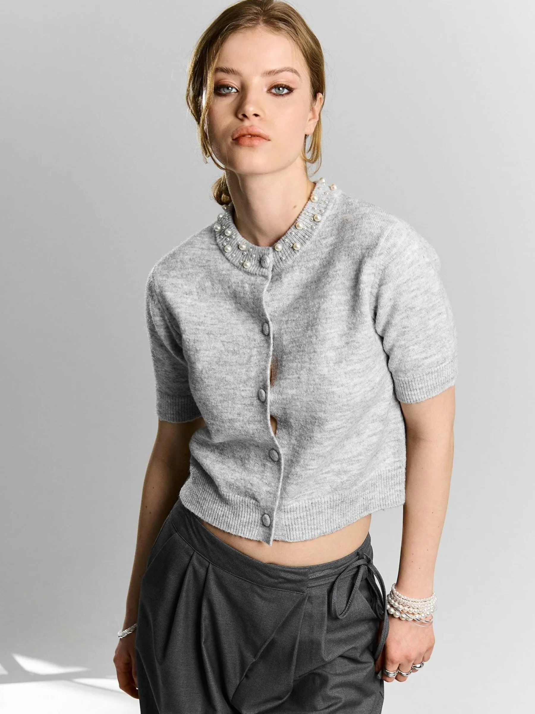 Kolor: szaryKrój: regularTyp: swetryRekaw: krótki rękawDługość: krótki topPattern style: podświetlonyDetal: na g…