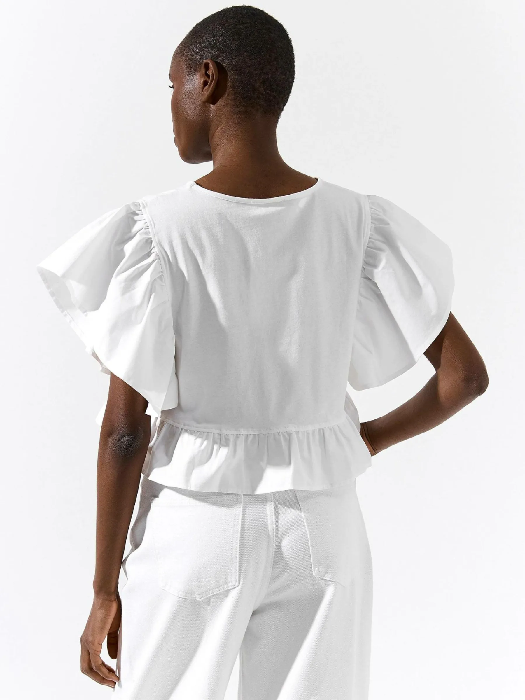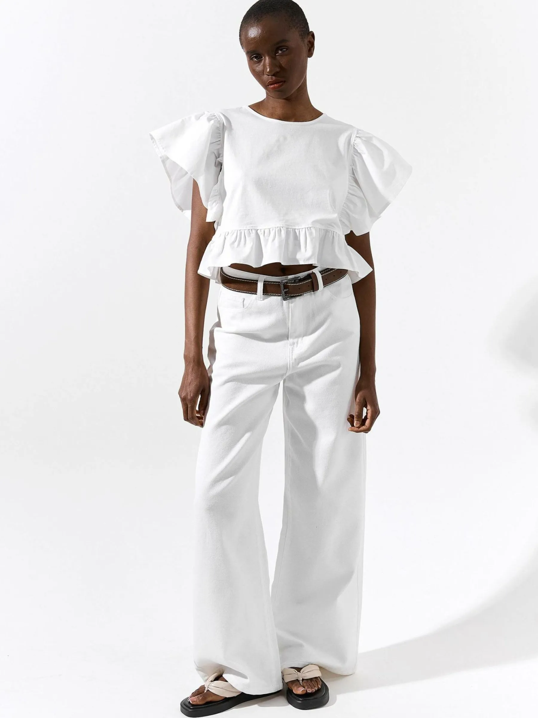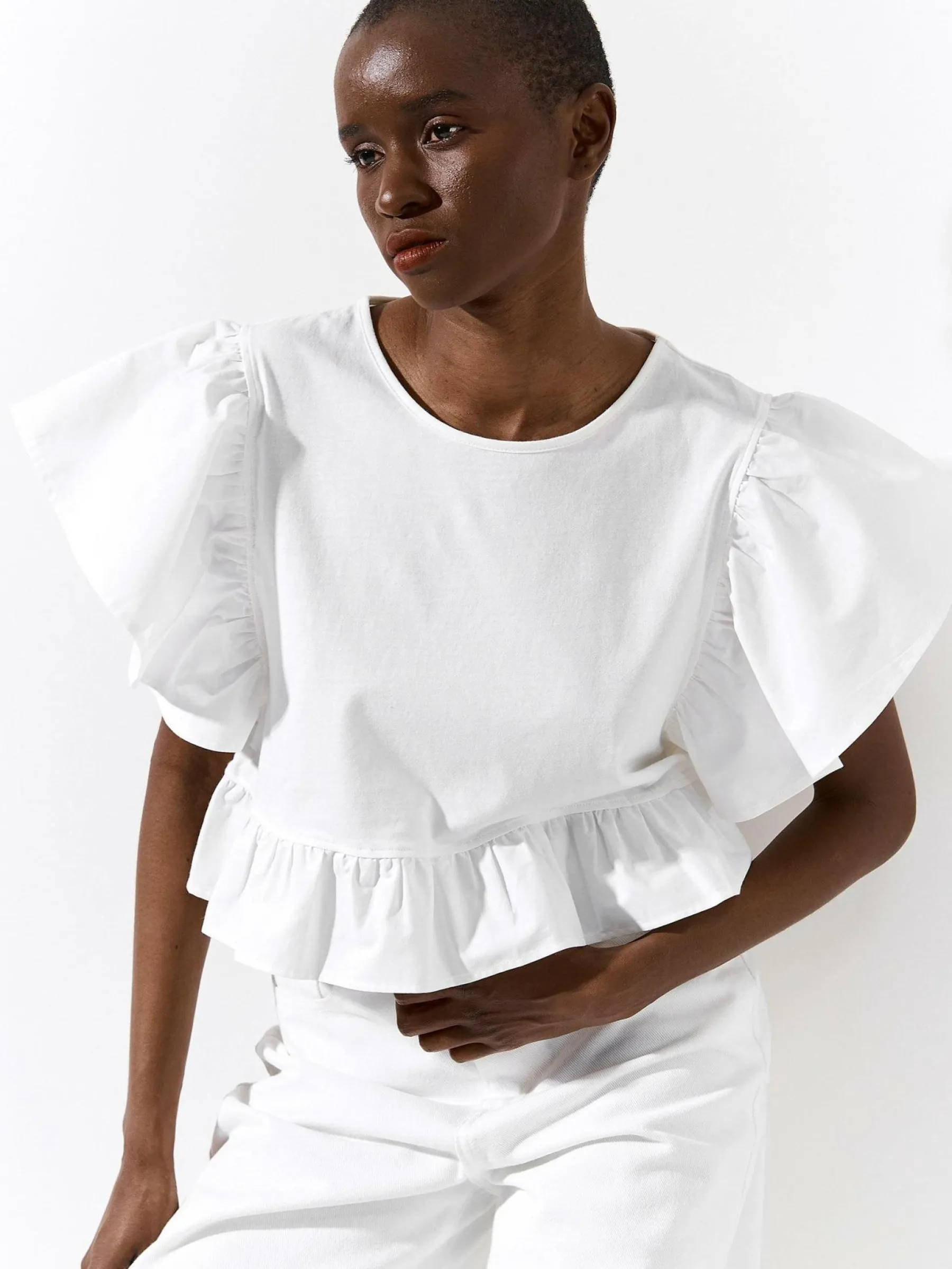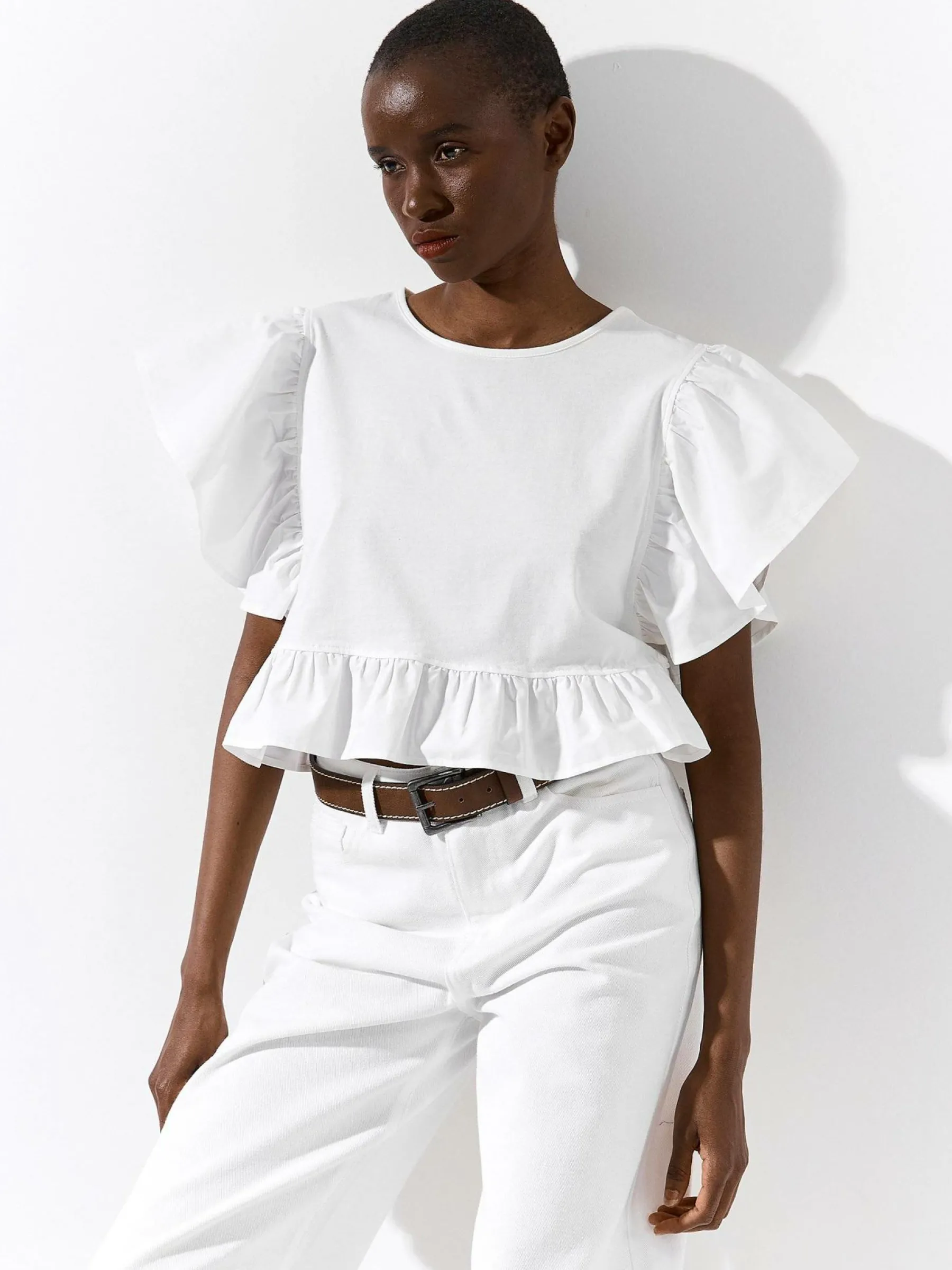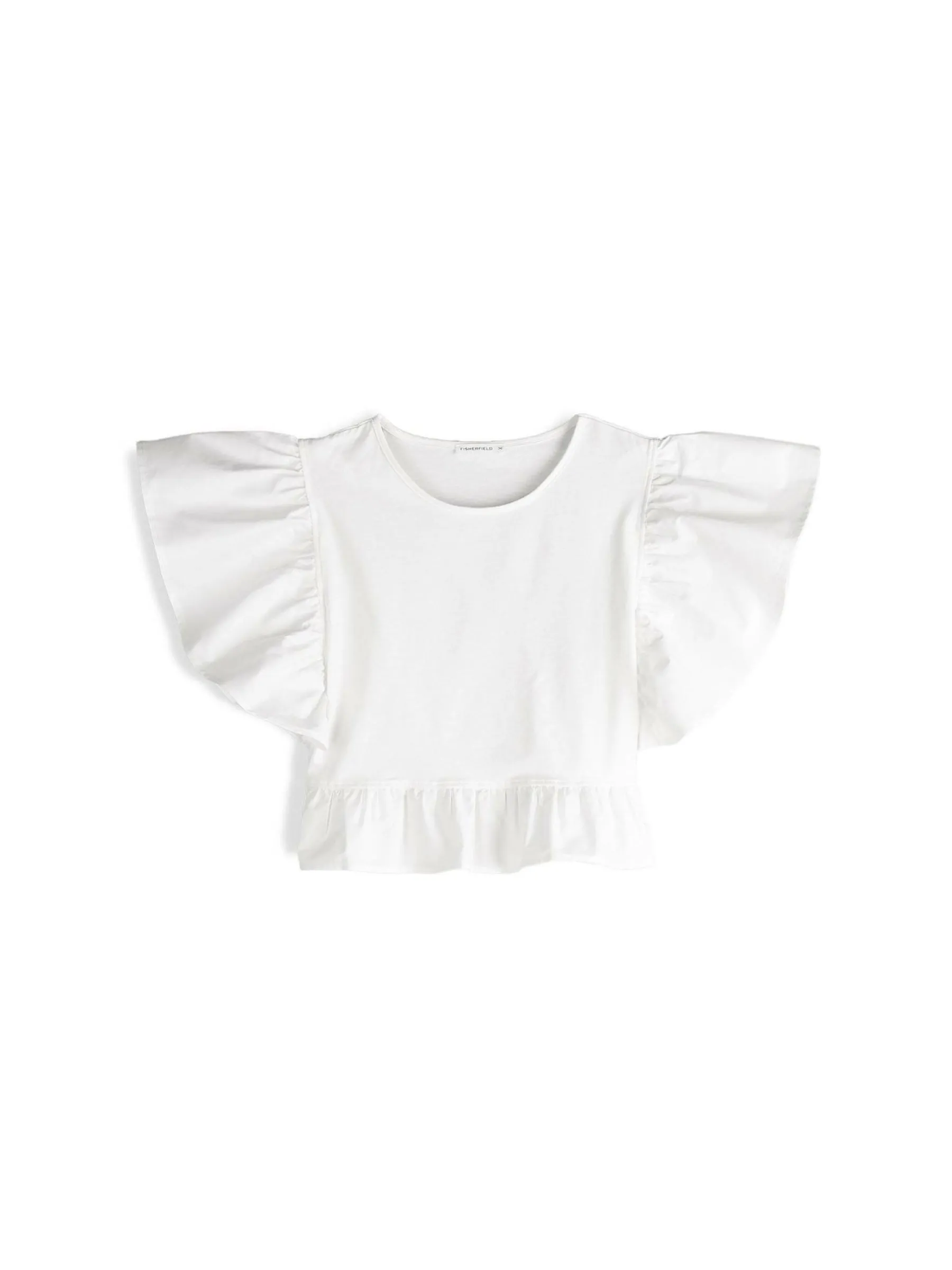 Kolor: białyKrój: z falbanąTyp: topRekaw: krótki rękawDługość: krótki topPattern style: pojedynczy kolorDetal: …