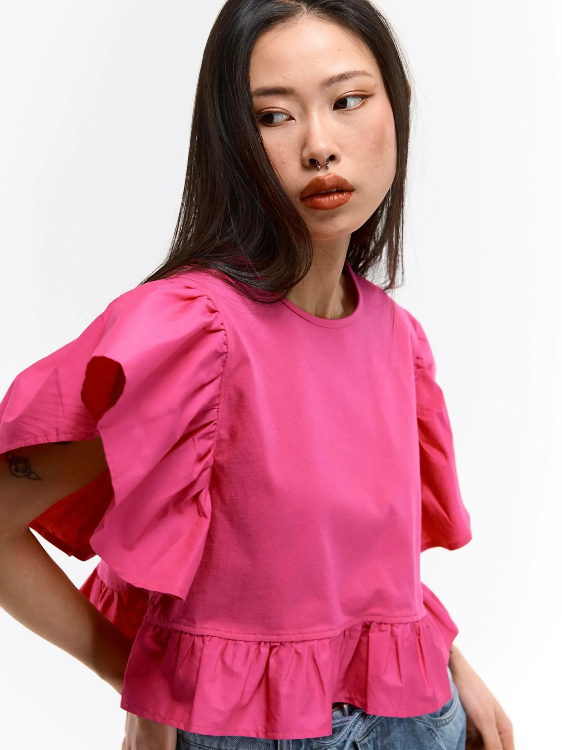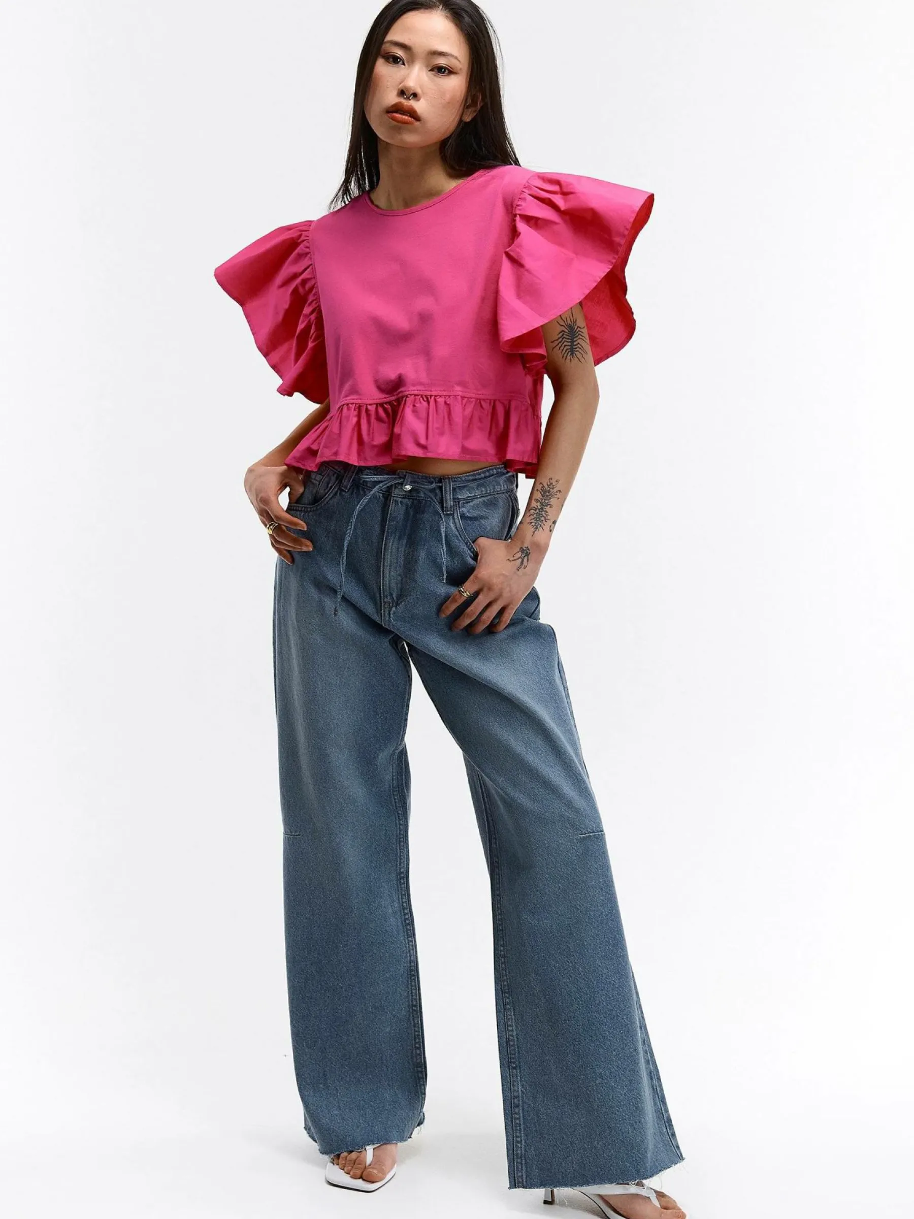 Kolor: różowyKrój: z falbanąTyp: topRekaw: krótki rękawDługość: krótki topPattern style: pojedynczy kolorDetal…