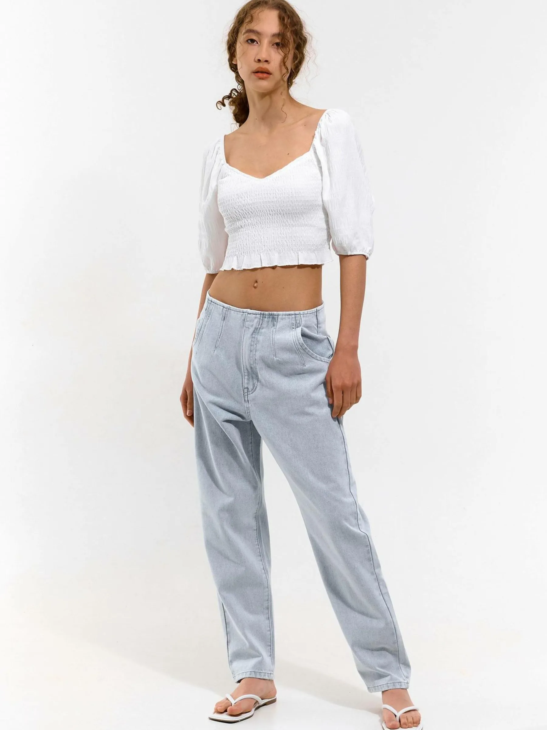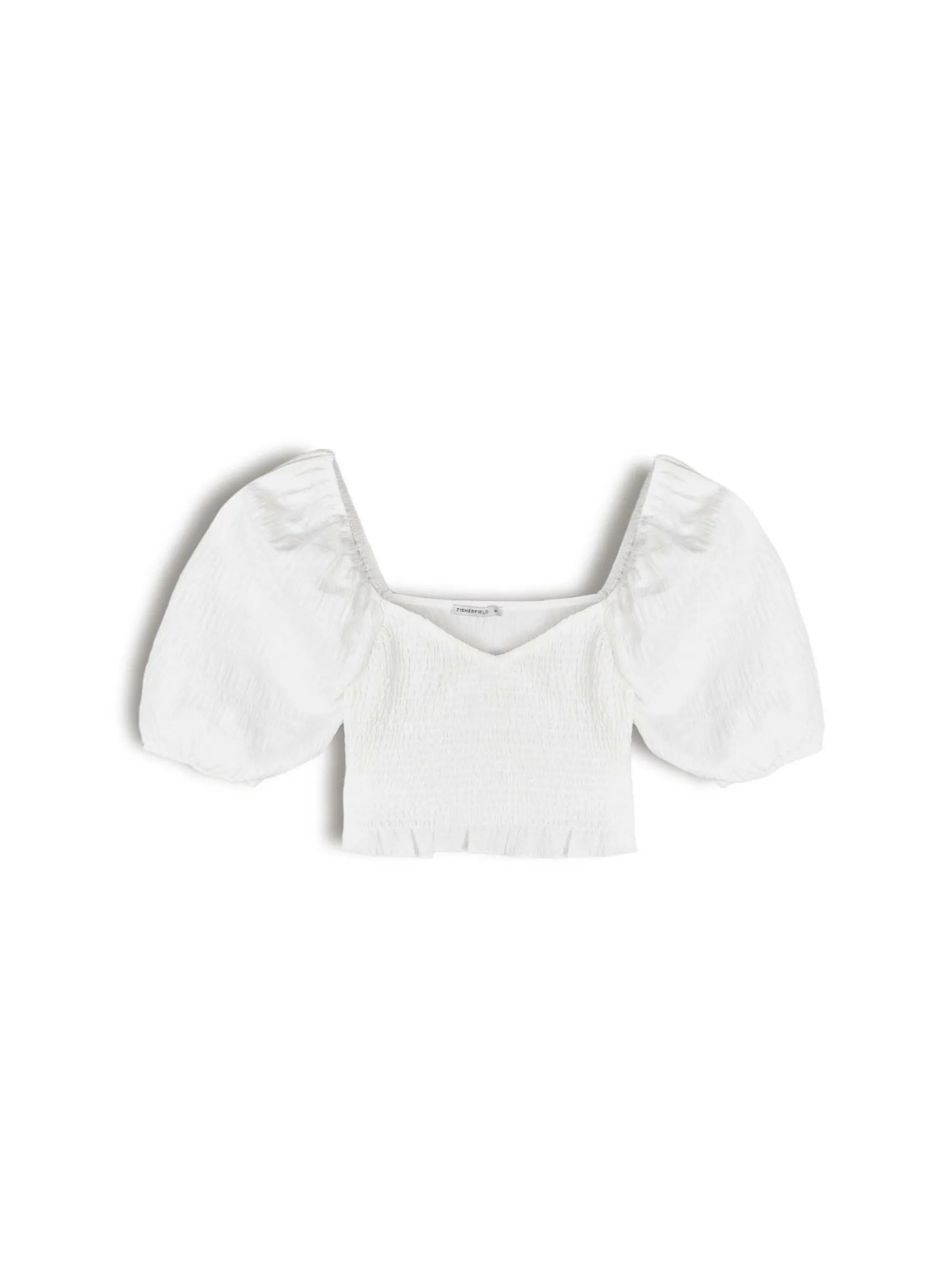 Kolor: białyKrój: z marszczeniemTyp: topRekaw: rękaw 3/4Długość: krótki topPattern style: pojedynczy kolorDetal: …