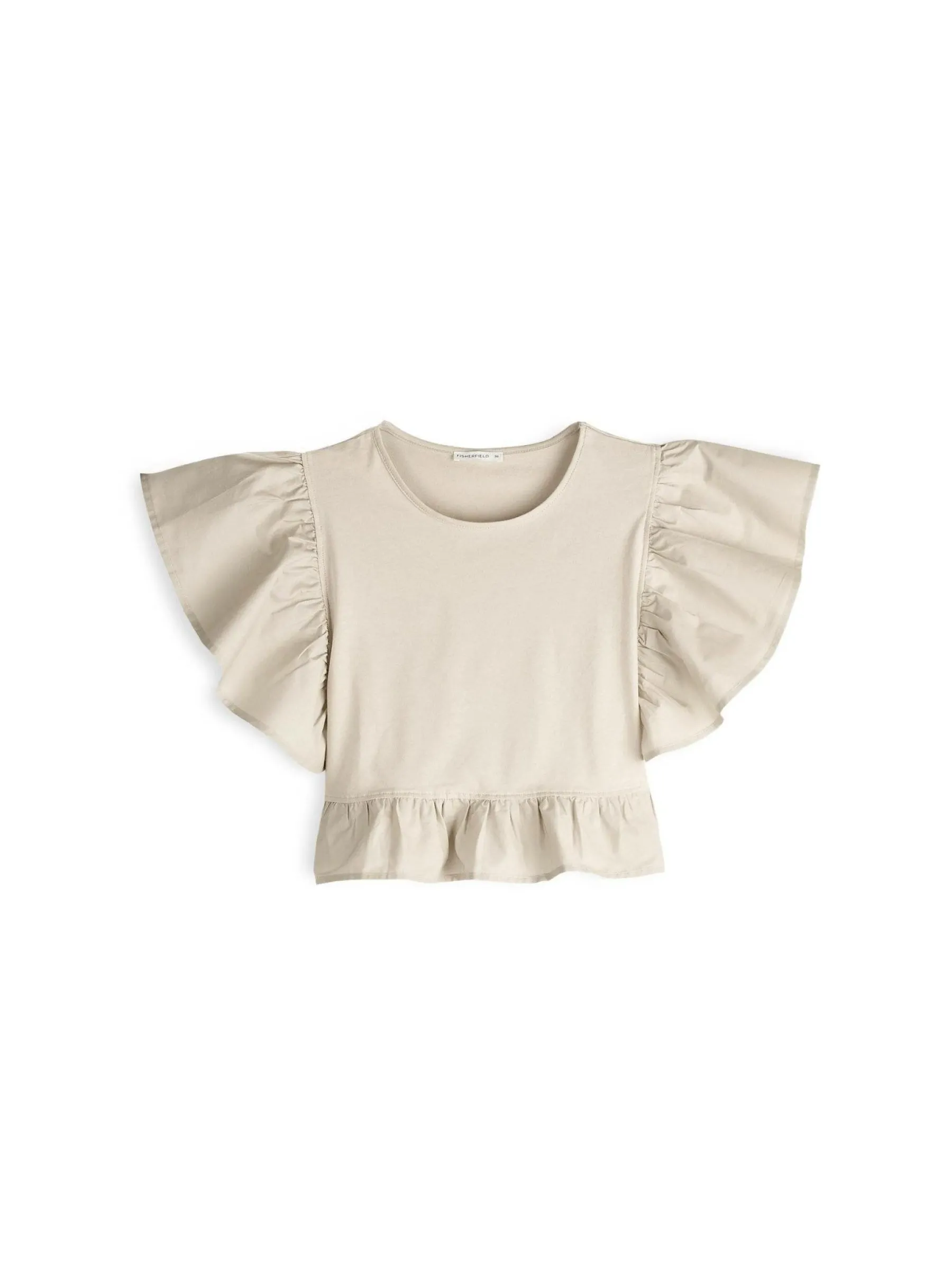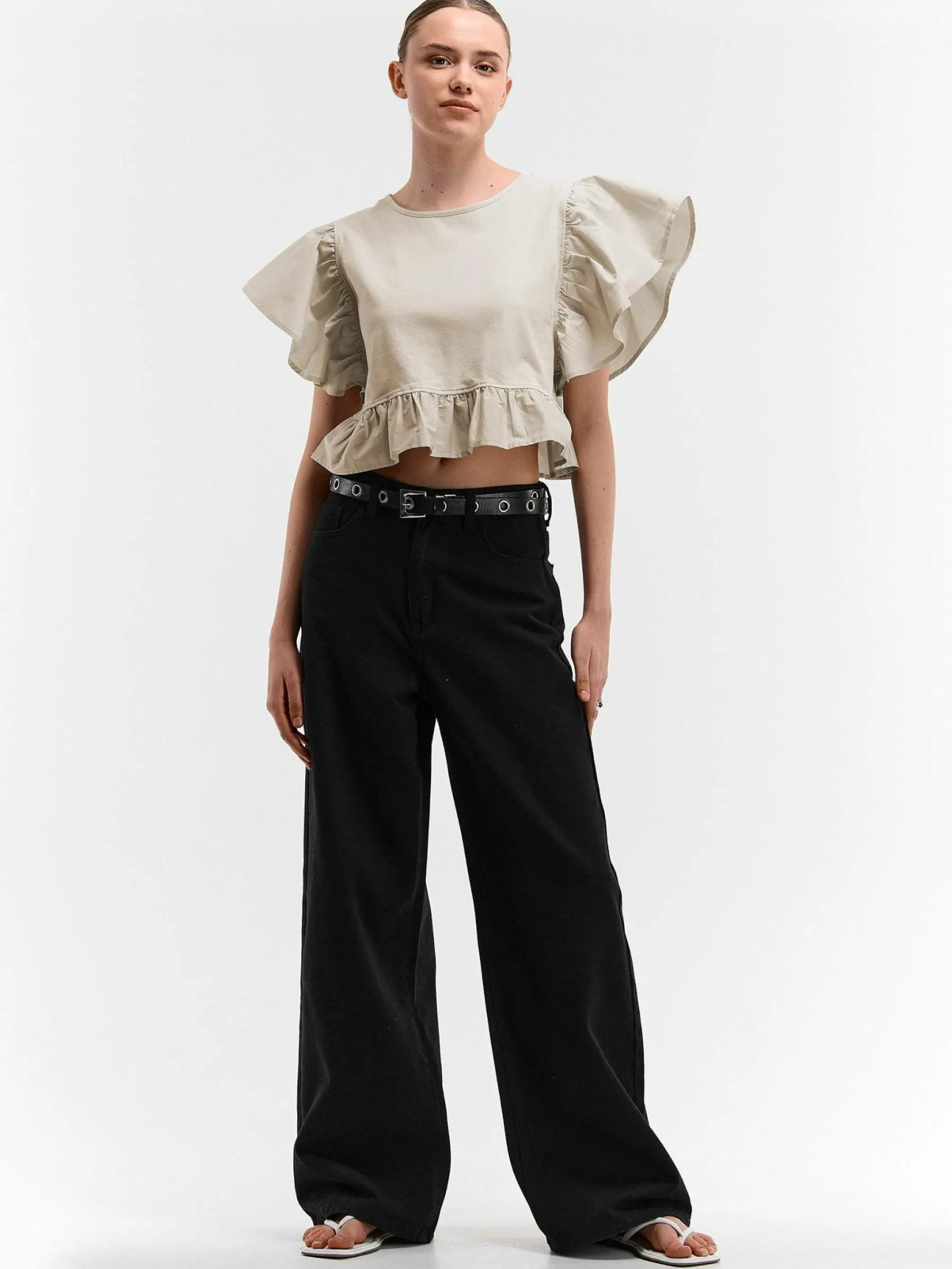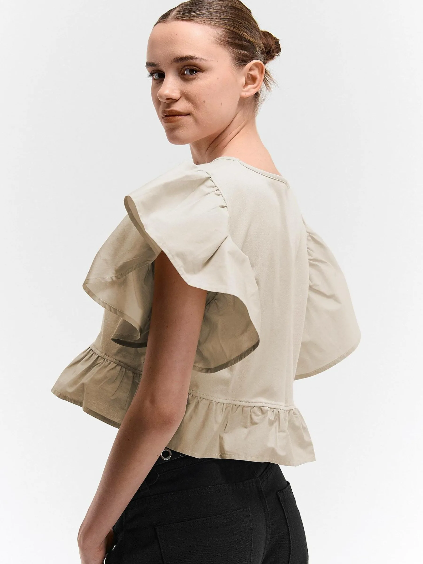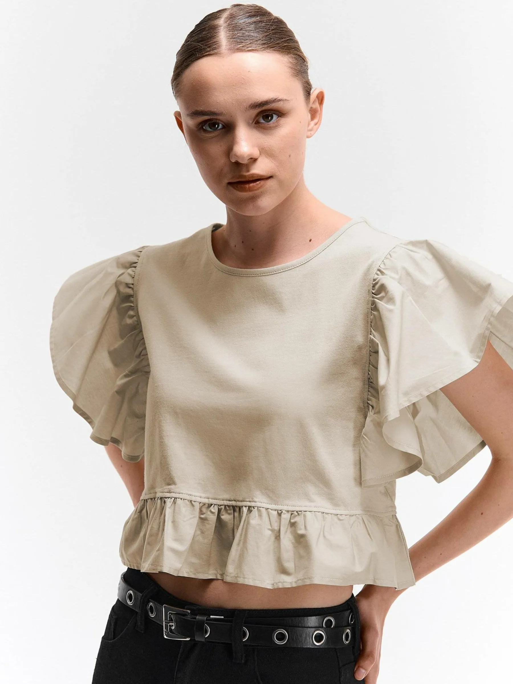Kolor: beżowyKrój: z falbanąTyp: topRekaw: krótki rękawDługość: krótki topPattern style: pojedynczy kolorDetal:…