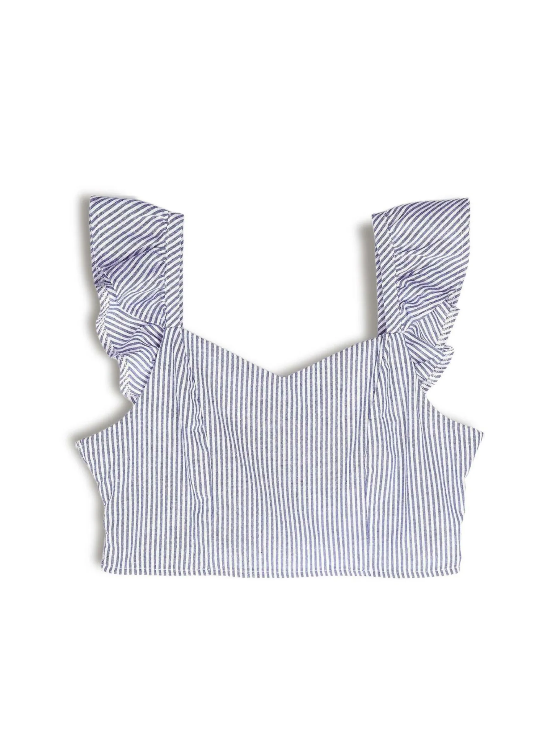Kolor: niebieskiKrój: z falbanąTyp: topRekaw: bez rękawówDługość: krótki topPattern style: w prążkiDetal: nad …