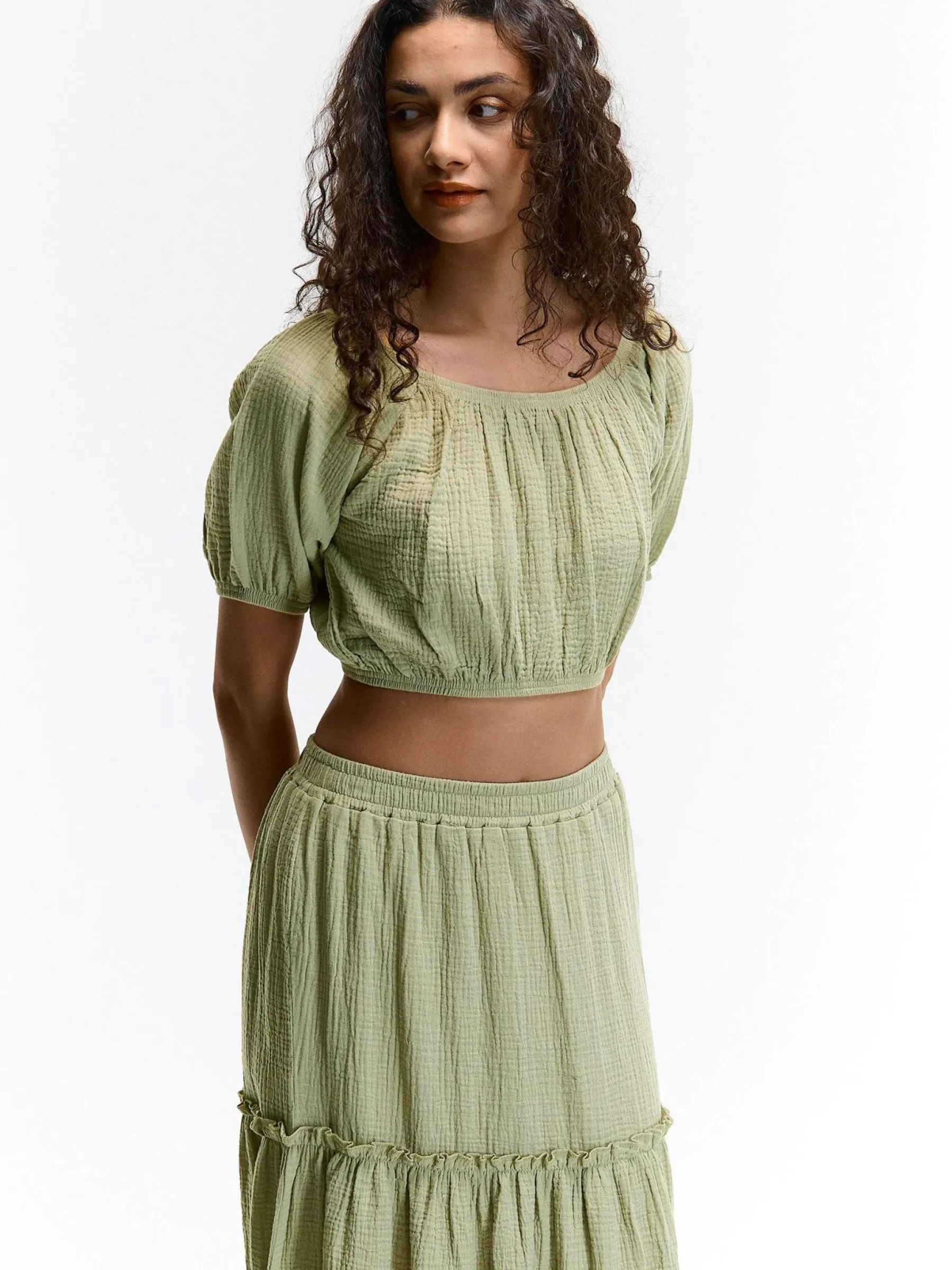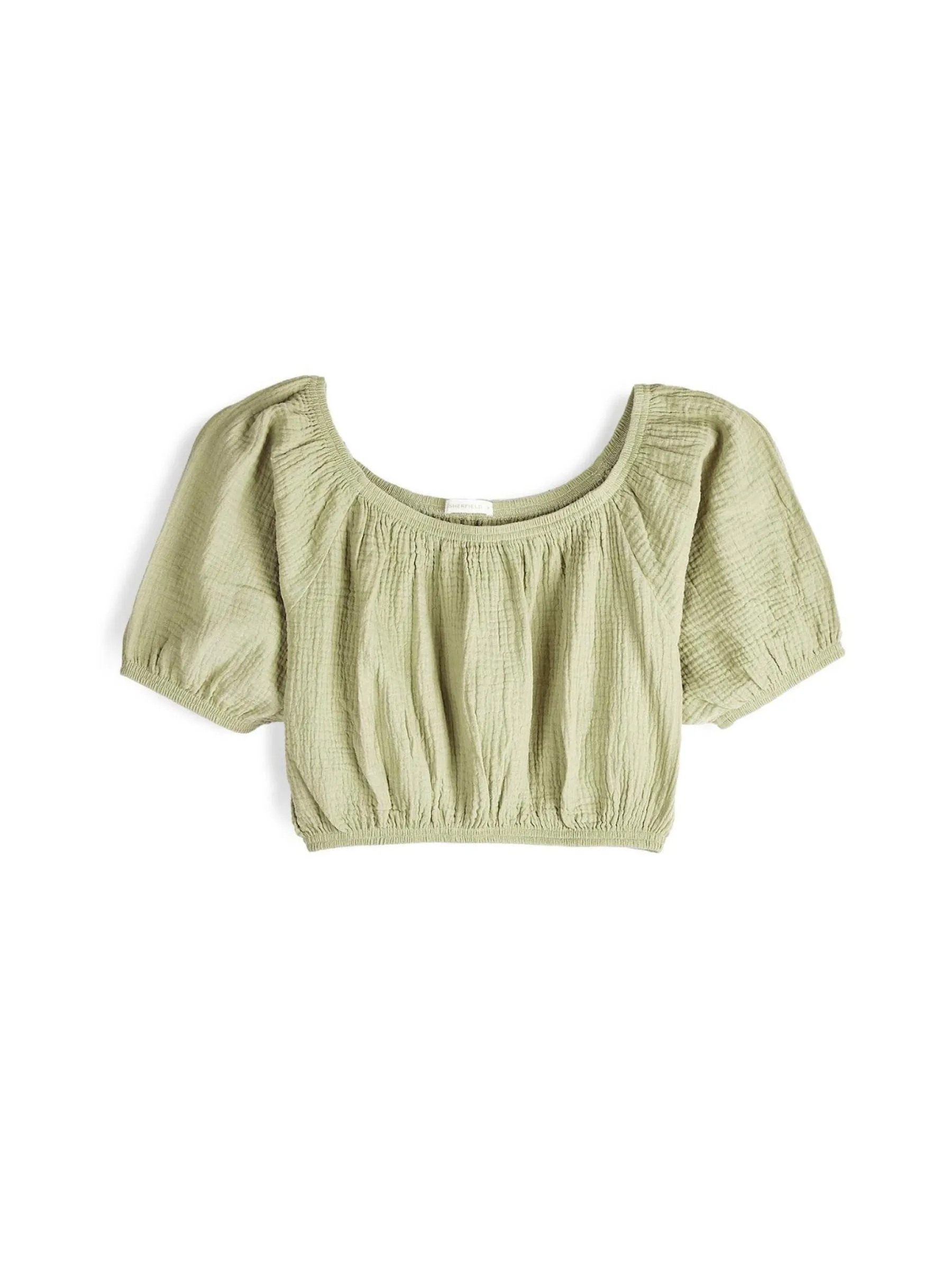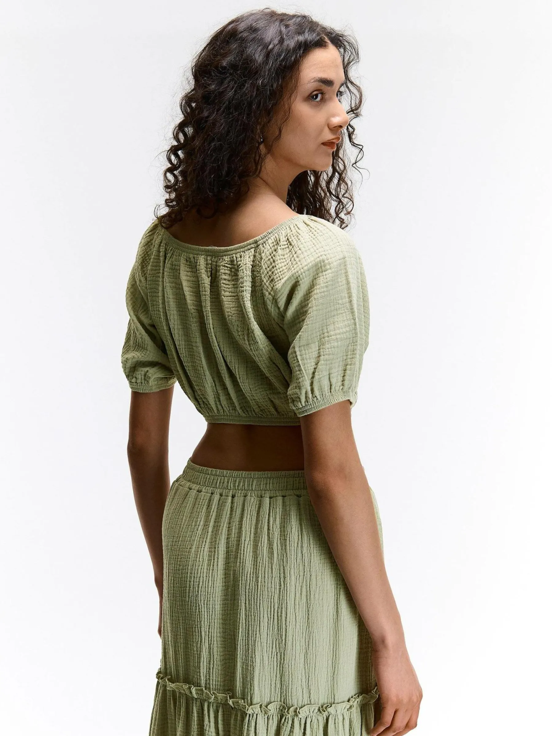 Kolor: zielonyKrój: z marszczeniemTyp: topRekaw: krótki rękawDługość: krótki topPattern style: pojedynczy kolor, …