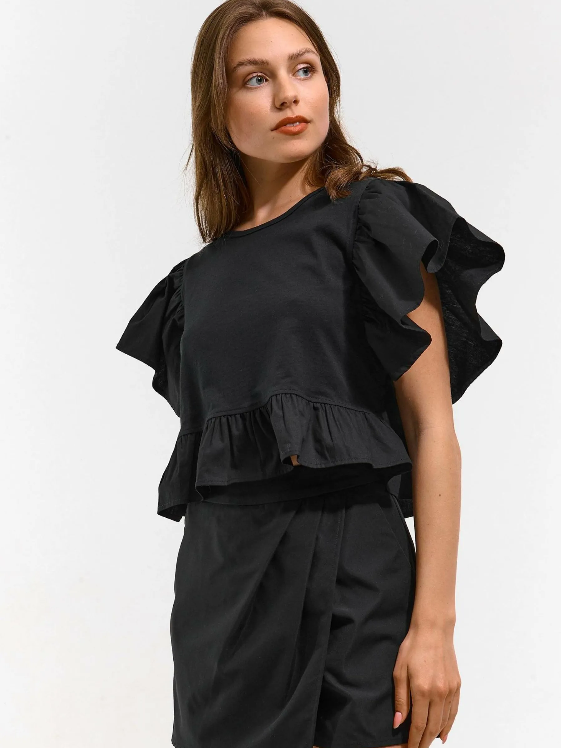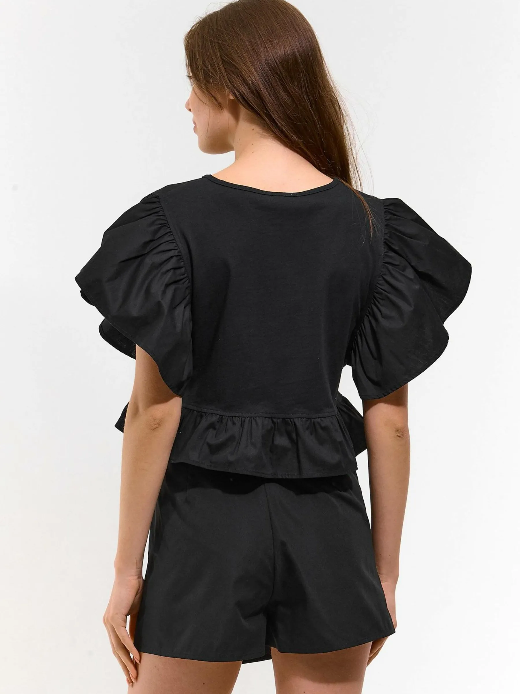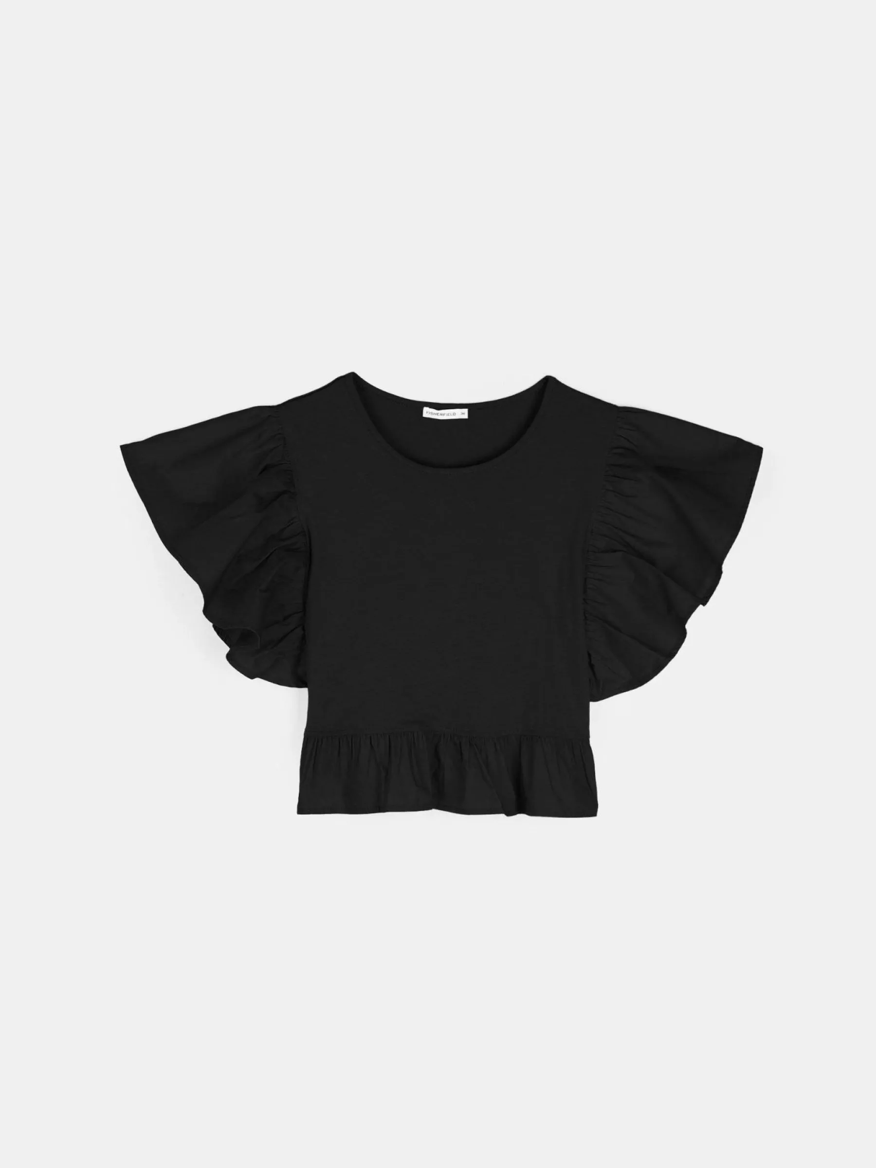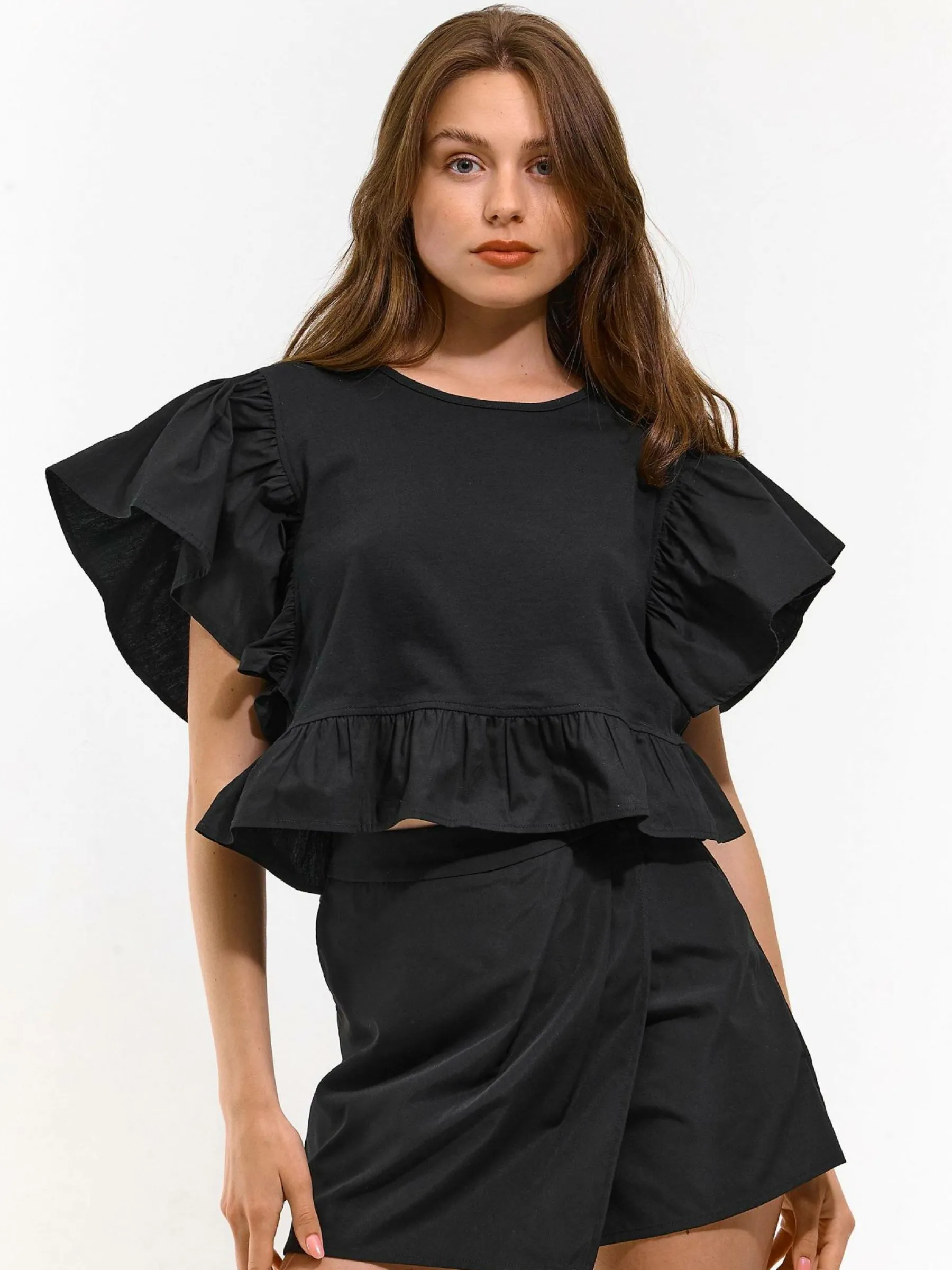 Kolor: czarnyKrój: z falbanąTyp: topRekaw: krótki rękawDługość: krótkiPattern style: pojedynczy kolorDetal: nad …