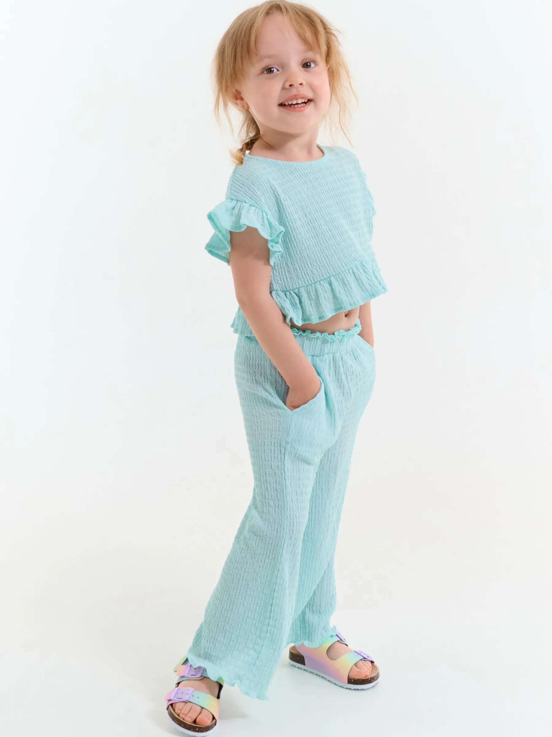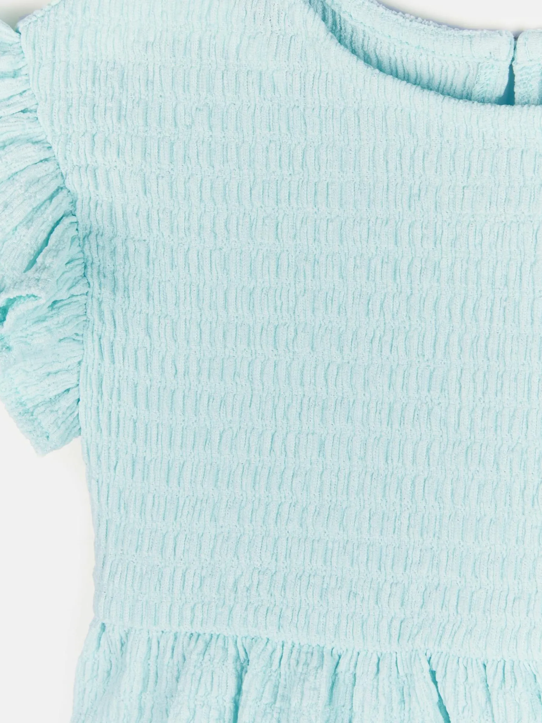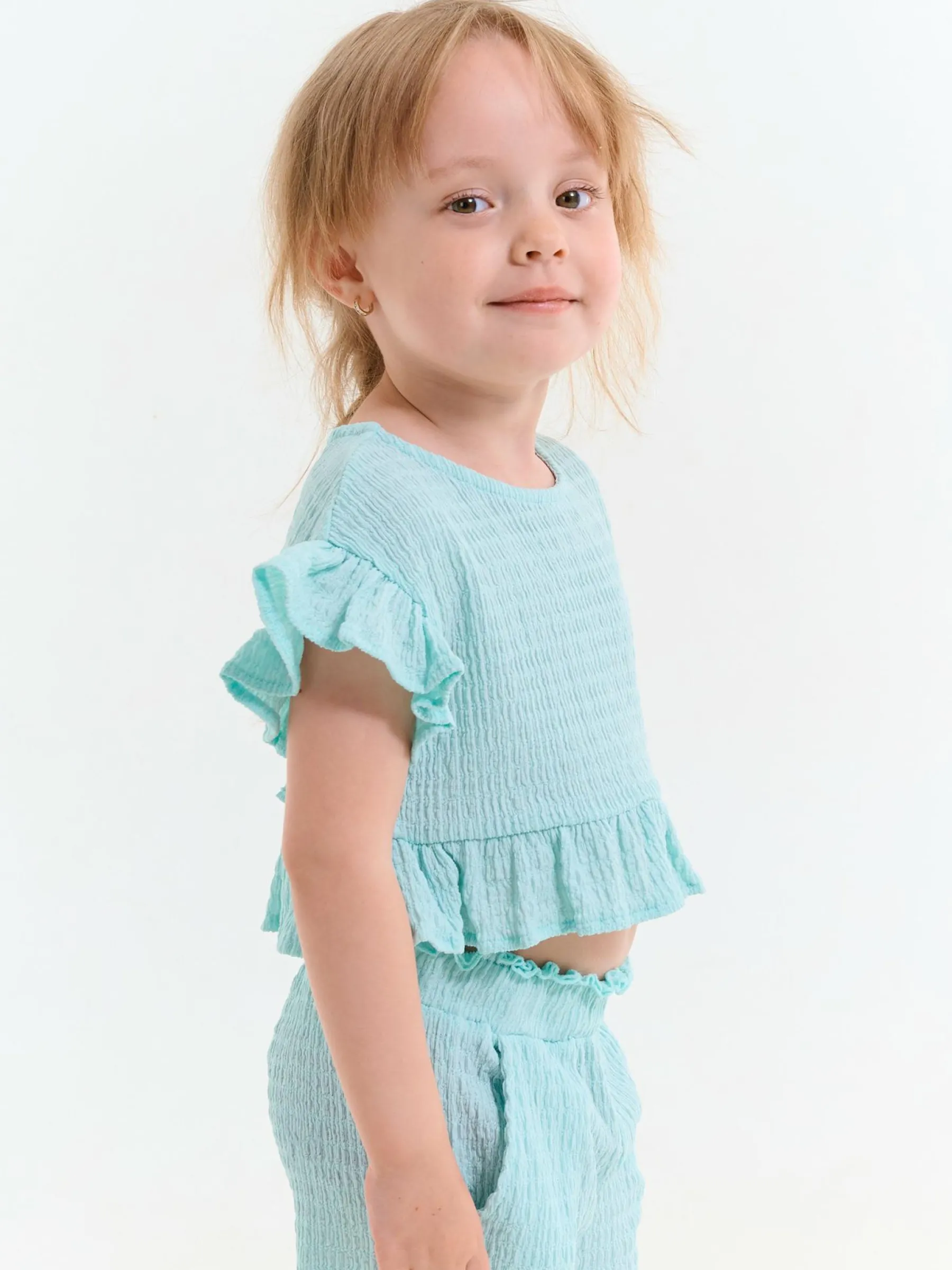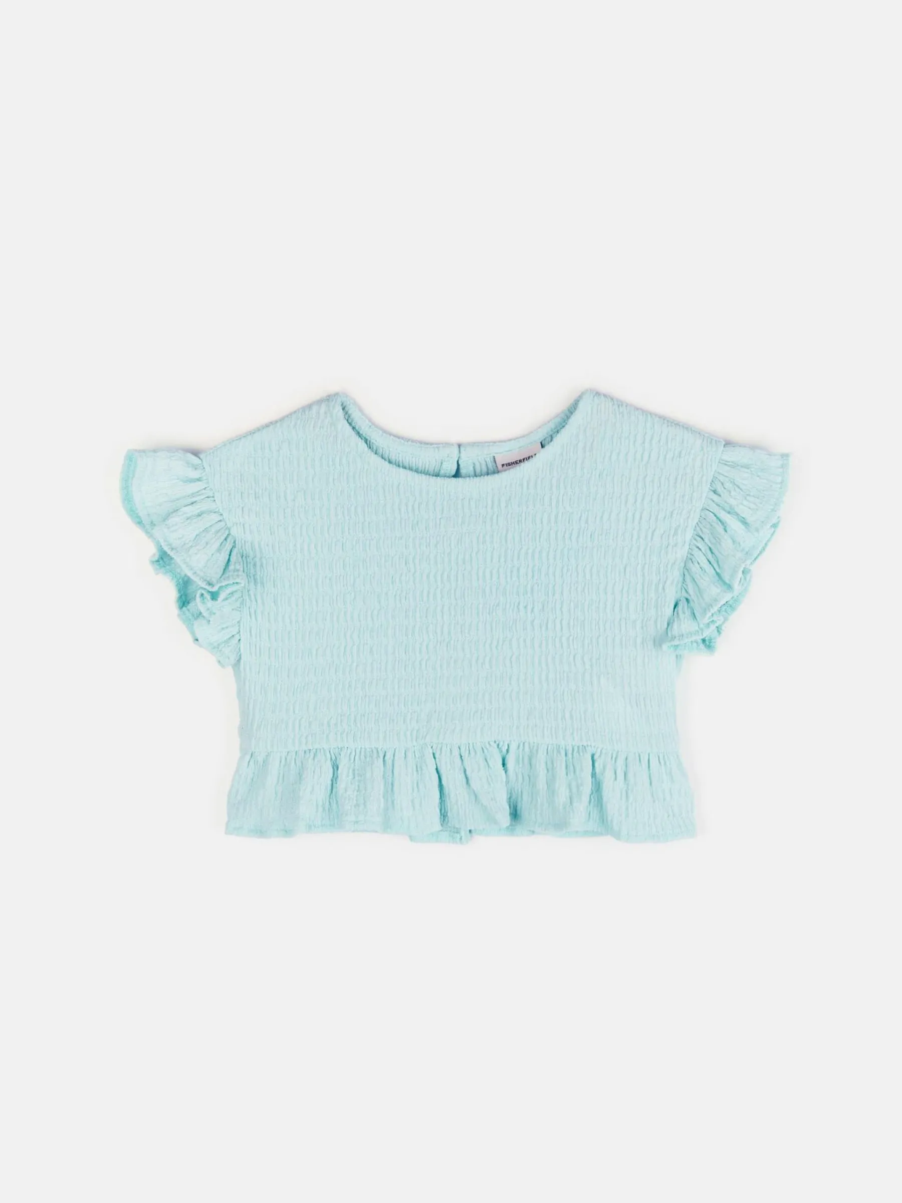 Kolor: zielonyKrój: z falbanąTyp: topRekaw: krótki rękawDługość: krótkiPattern style: pojedynczy kolorDetal: nad…