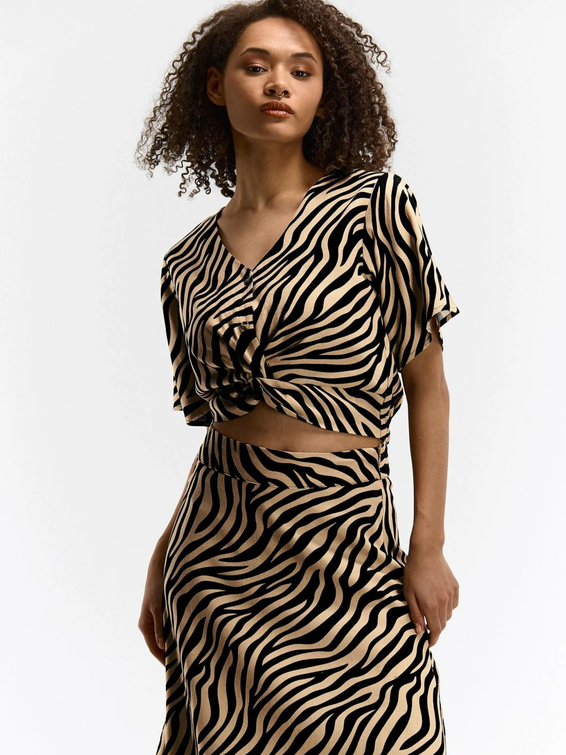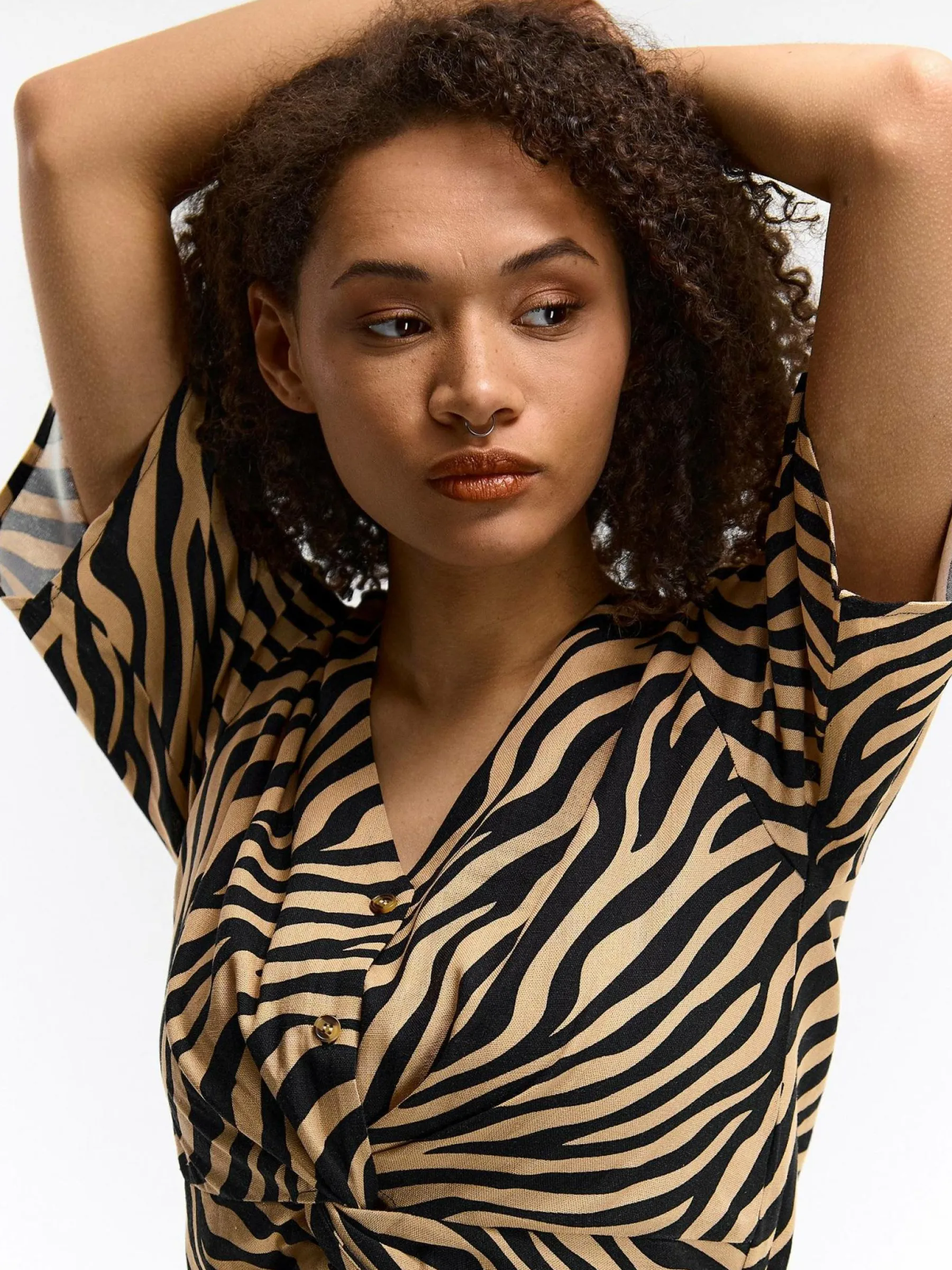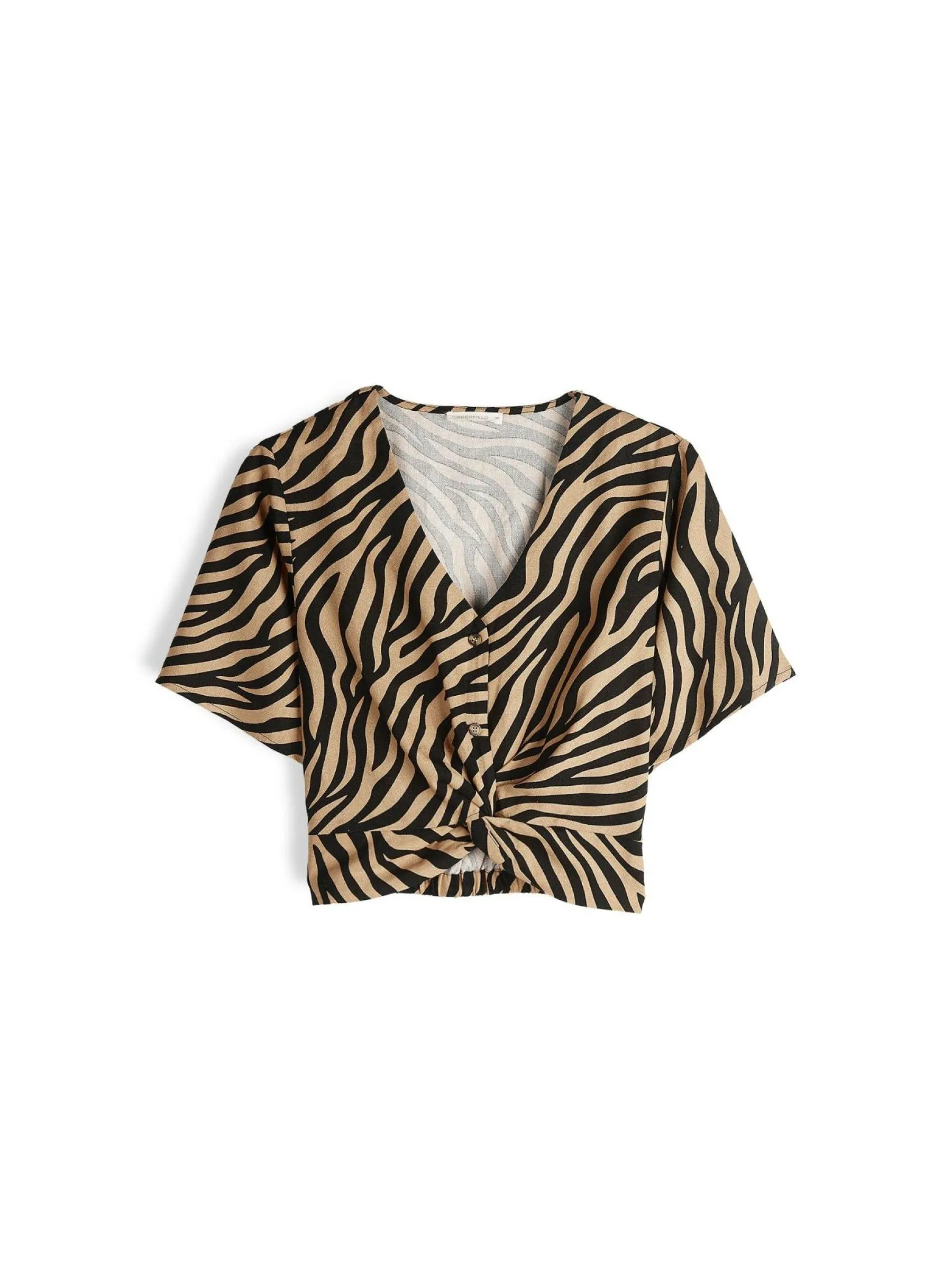 Kolor: beżowy, brązowyKrój: z marszczeniemTyp: topRekaw: krótki rękawDługość: krótki topPattern style: zwierzec…