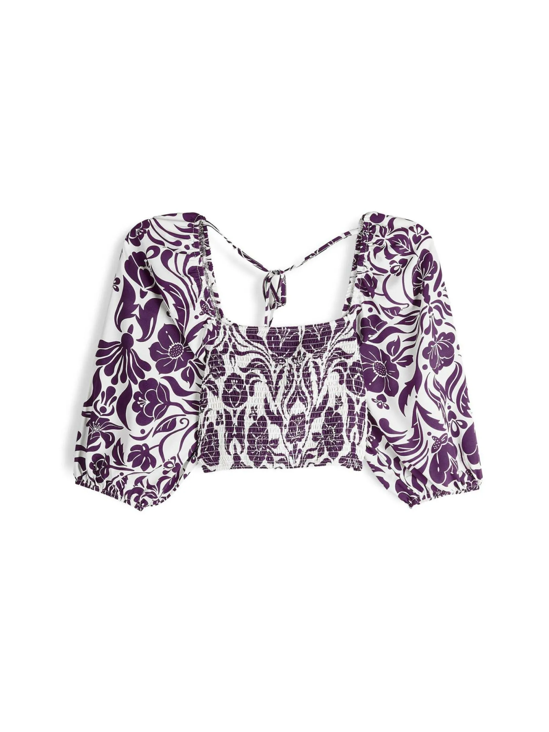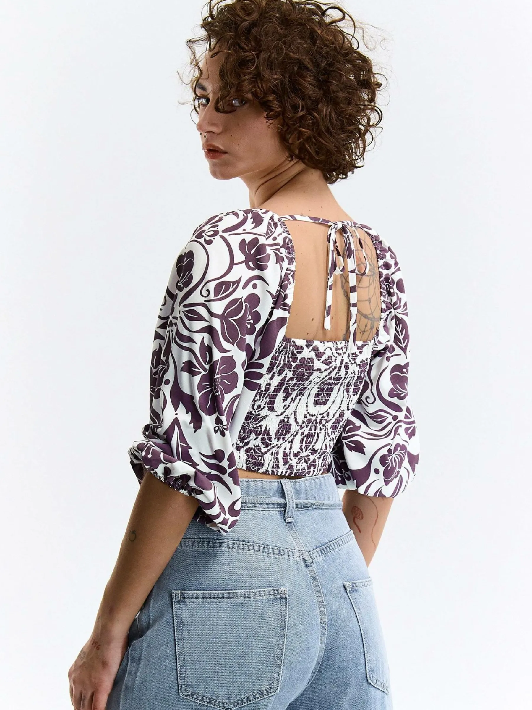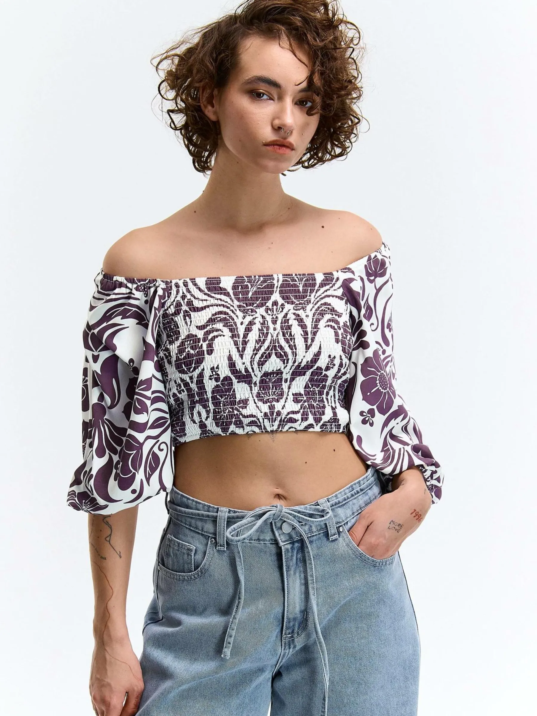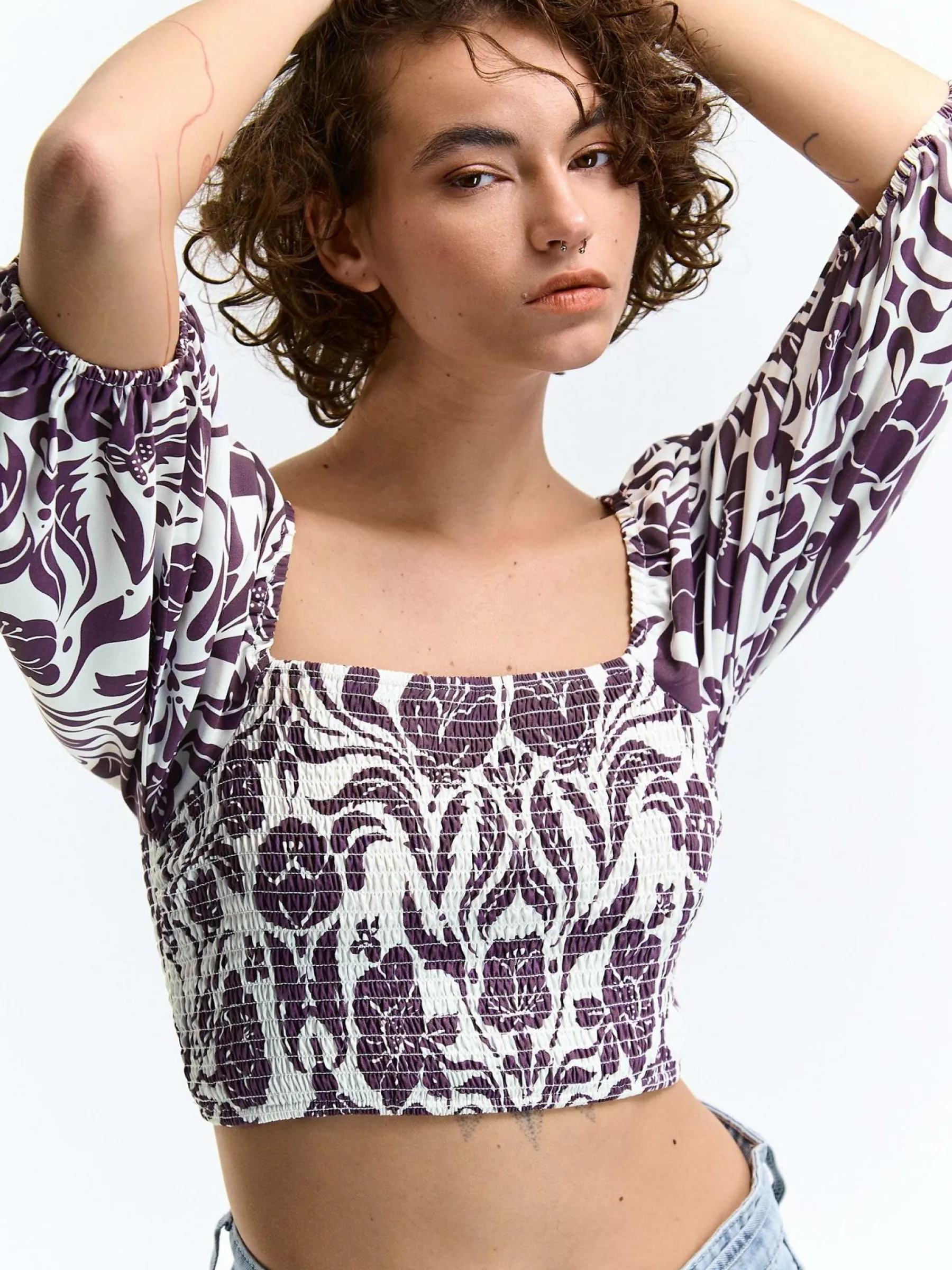 Kolor: purpurowyKrój: z marszczeniemTyp: topRekaw: krótki rękawDługość: krótki topPattern style: wzorzysteDetal: …