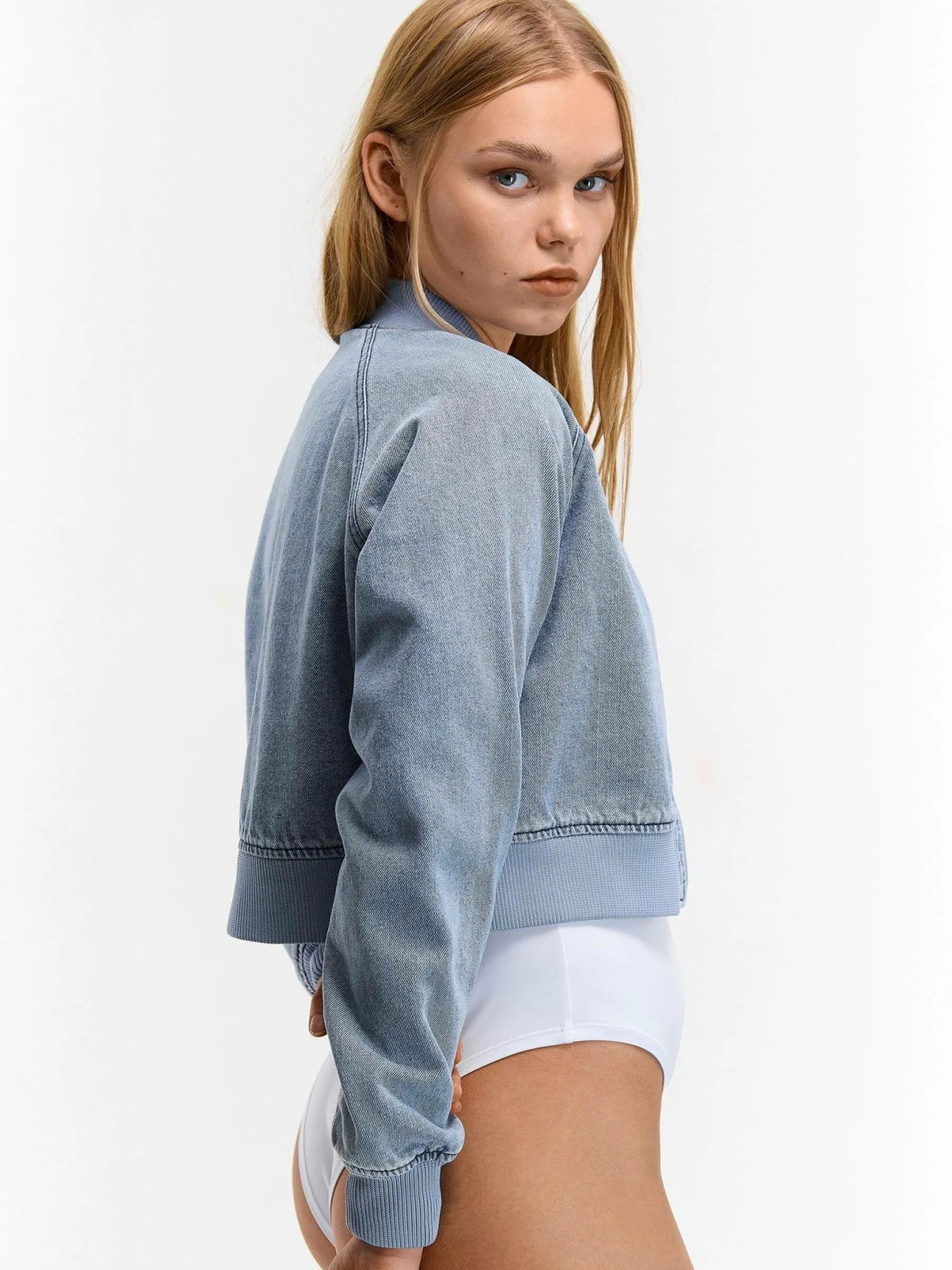 Kolor: niebieskiKrój: bomberTyp: kurtka przejściowaRekaw: długi rękawDługość: krótki topPattern style: pojedyncz…