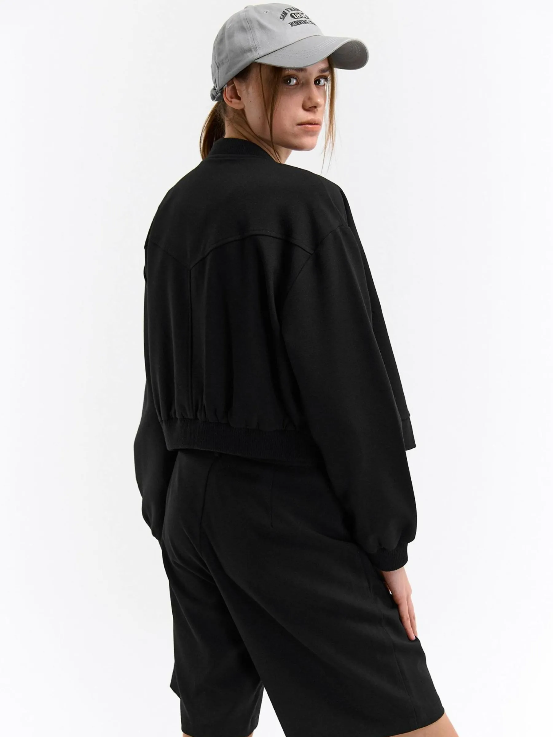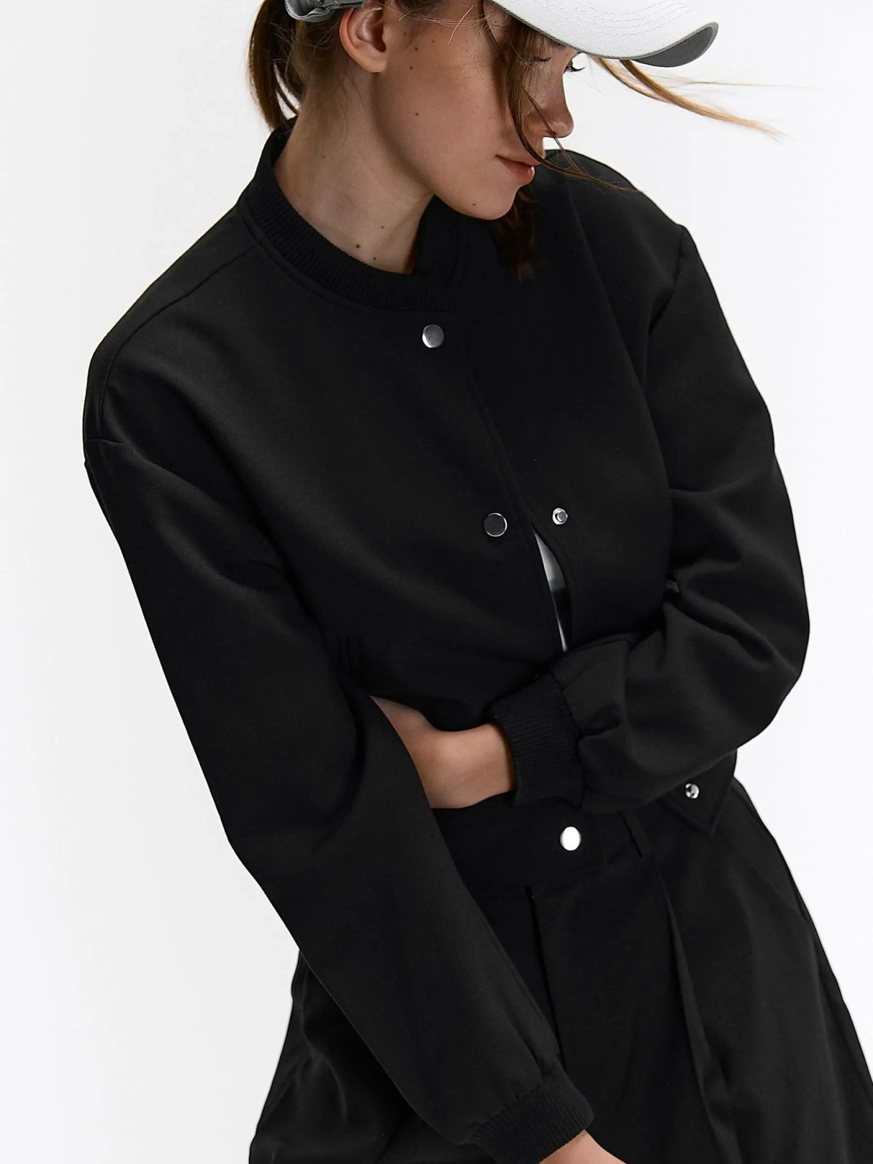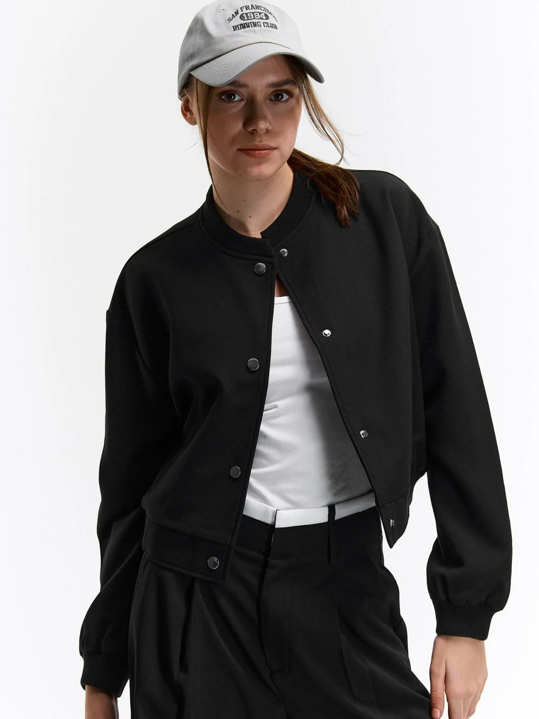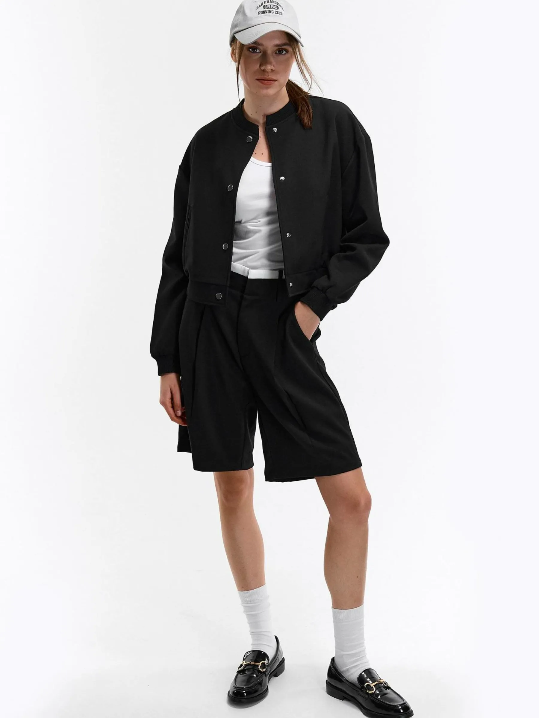 Kolor: czarnyKrój: bomberTyp: kurtka przejściowaRekaw: długi rękawDługość: krótkiPattern style: pojedynczy kolor…