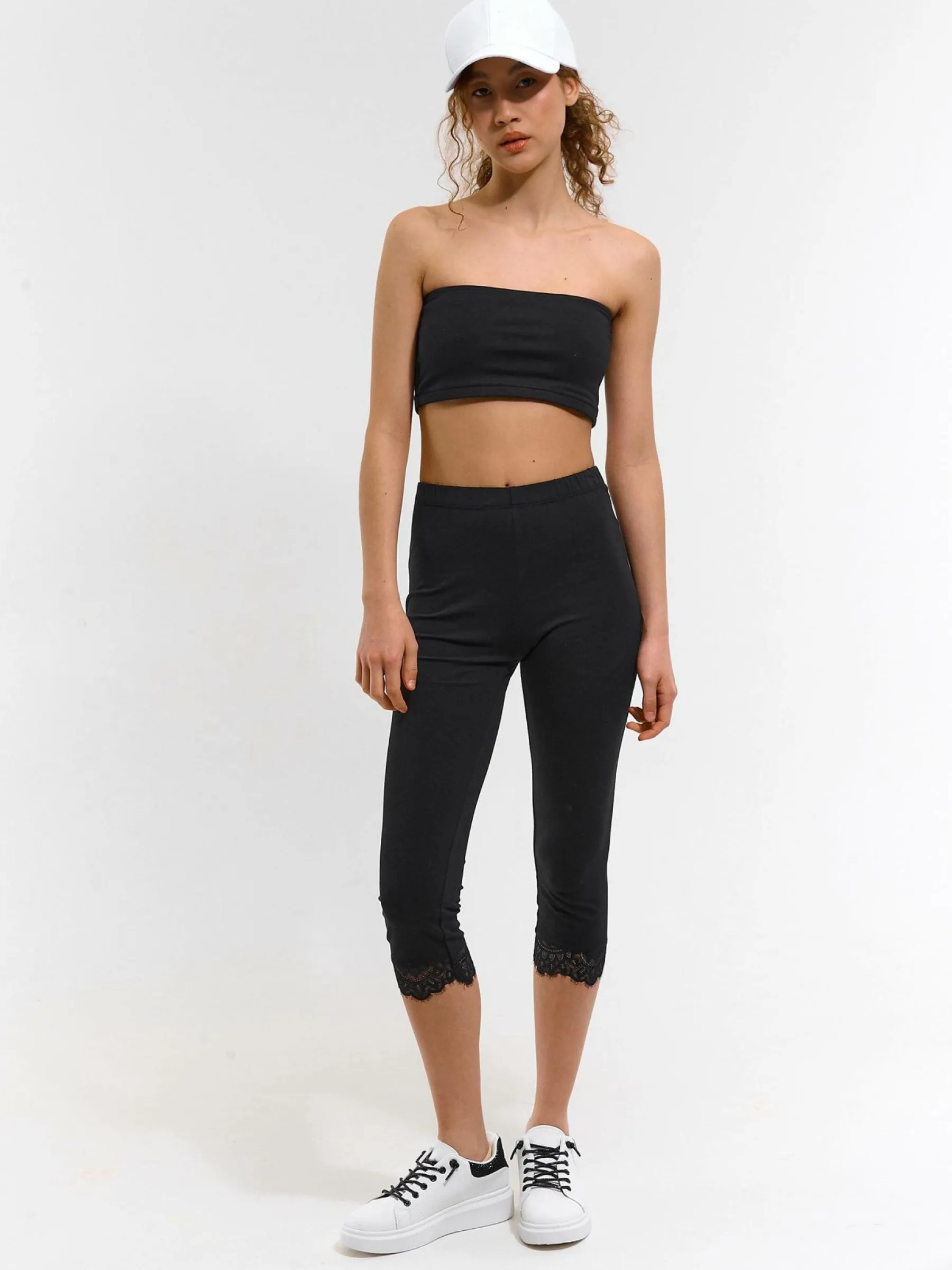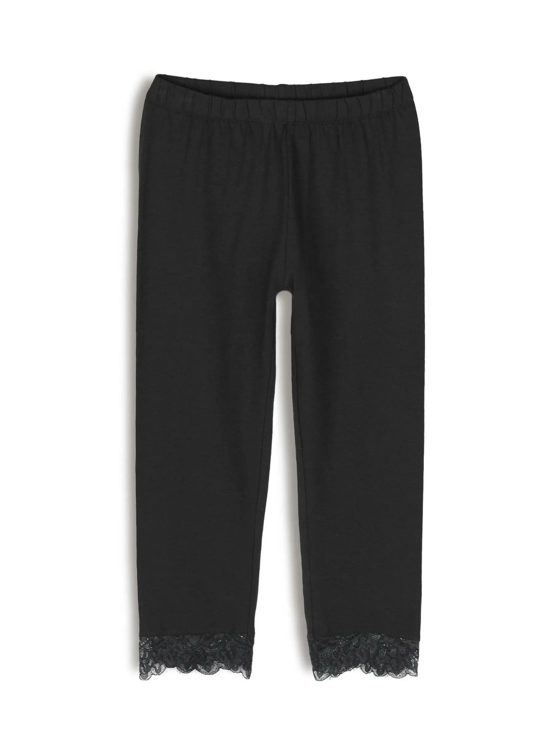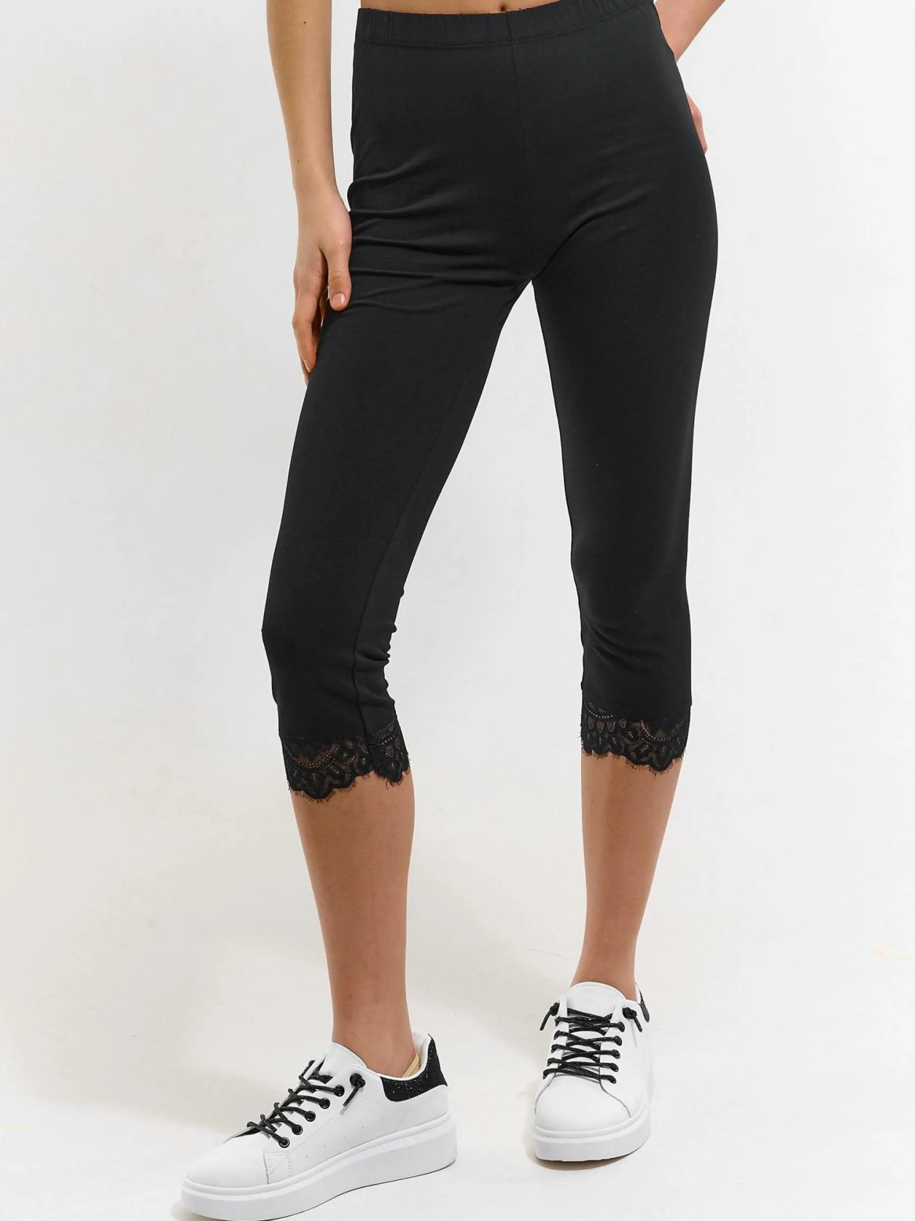 Kolor: czarnyKrój: slimTyp: legginsyDługość: trzy czwartePattern style: pojedynczy kolorDetal: z koronkąMateriał: …
