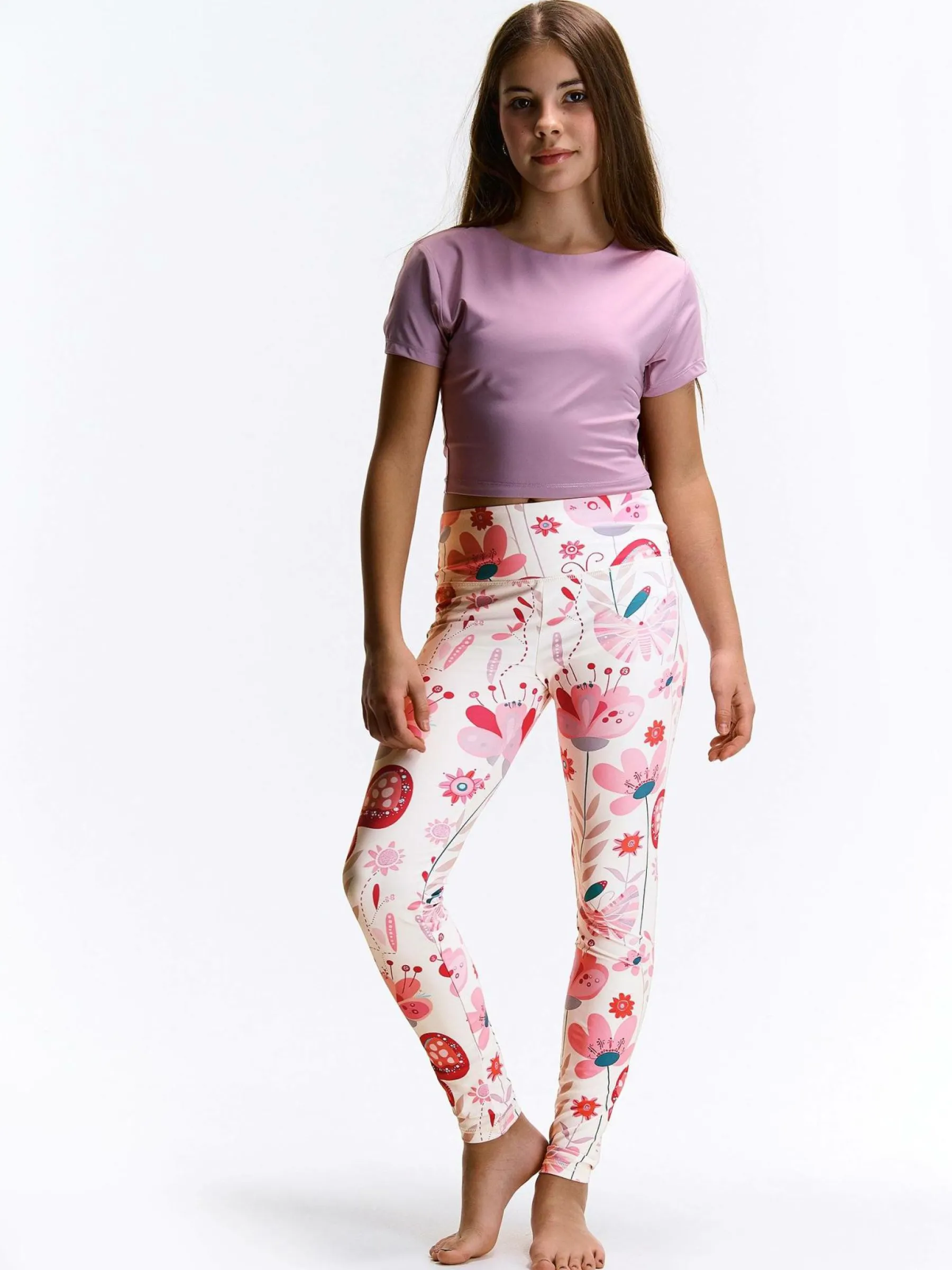 Kolor: białyKrój: slimTyp: legginsyDługość: dlugiePattern style: z nadrukiem, kwiatoweDetal: z elastyczną opaskąM…