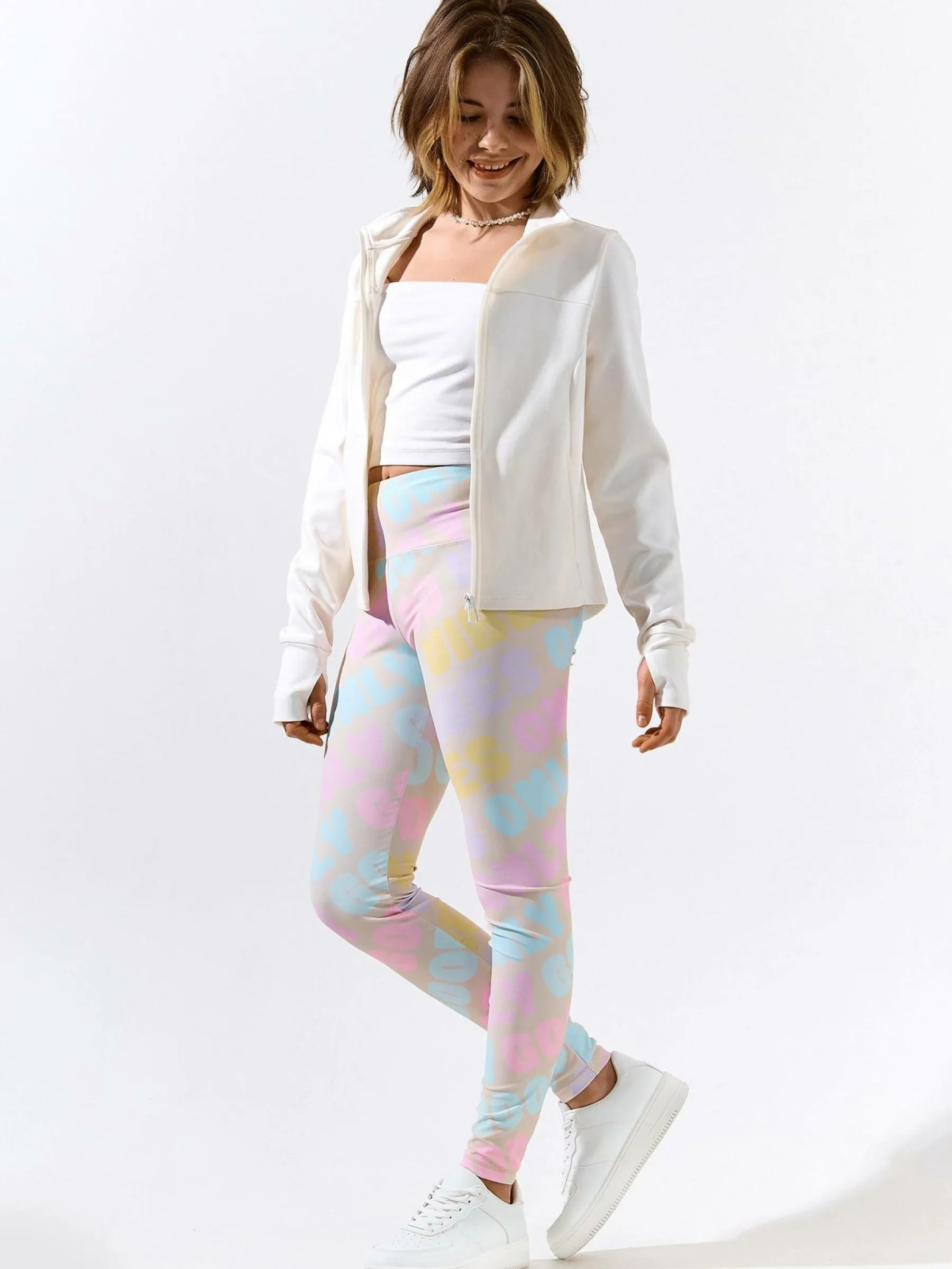 Kolor: beżowyKrój: slimTyp: legginsyDługość: dlugiePattern style: wielobarwnyDetal: z elastyczną opaskąMateriał:…