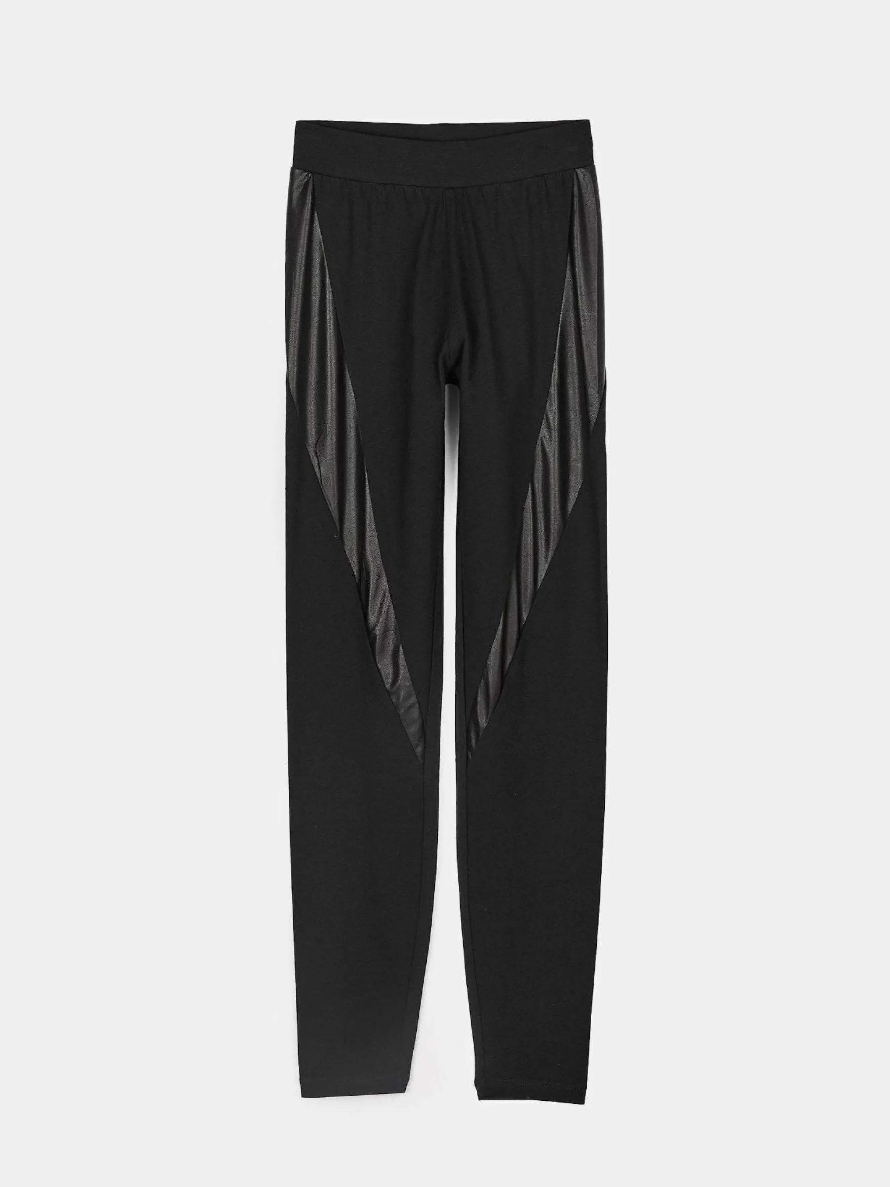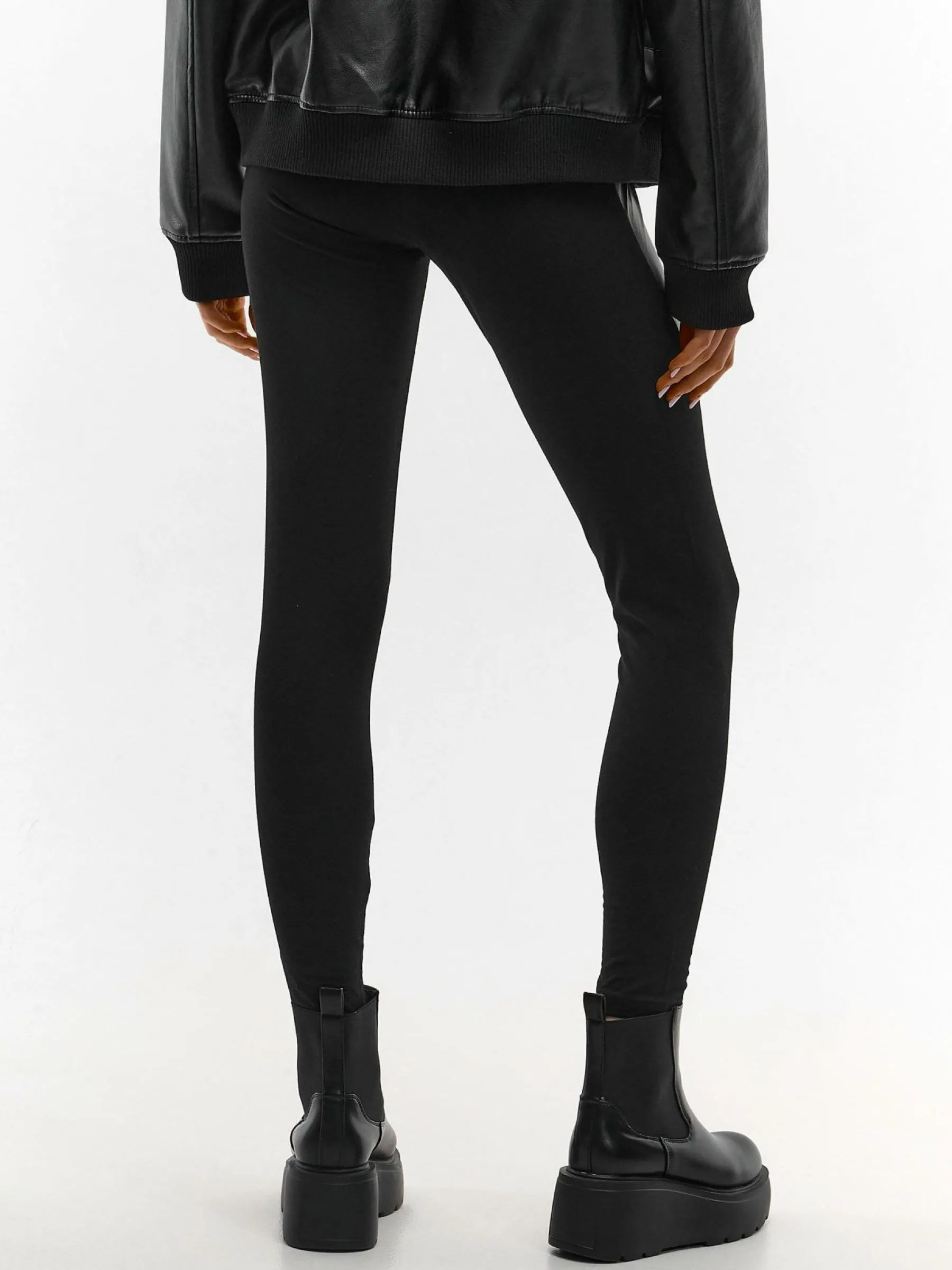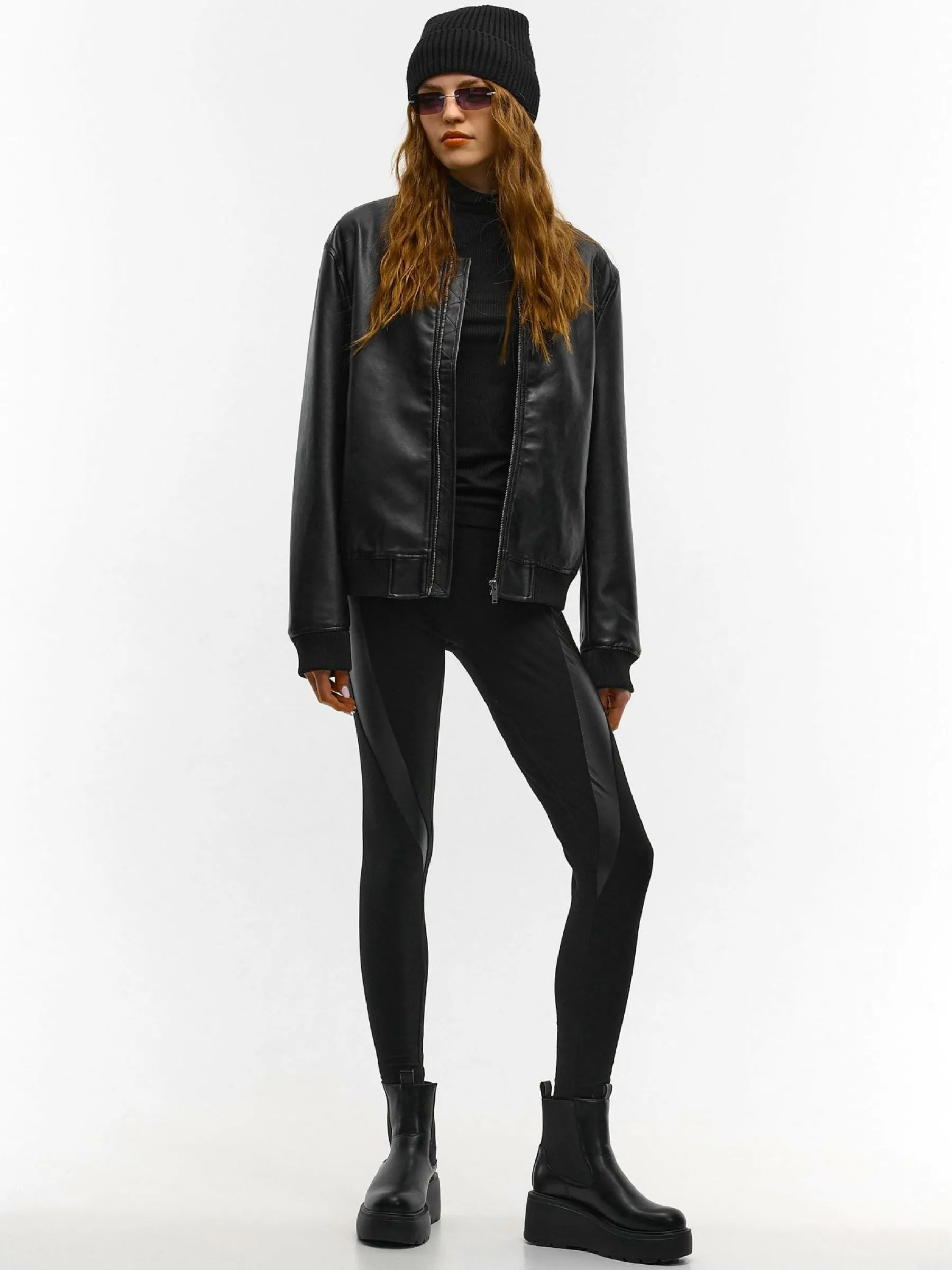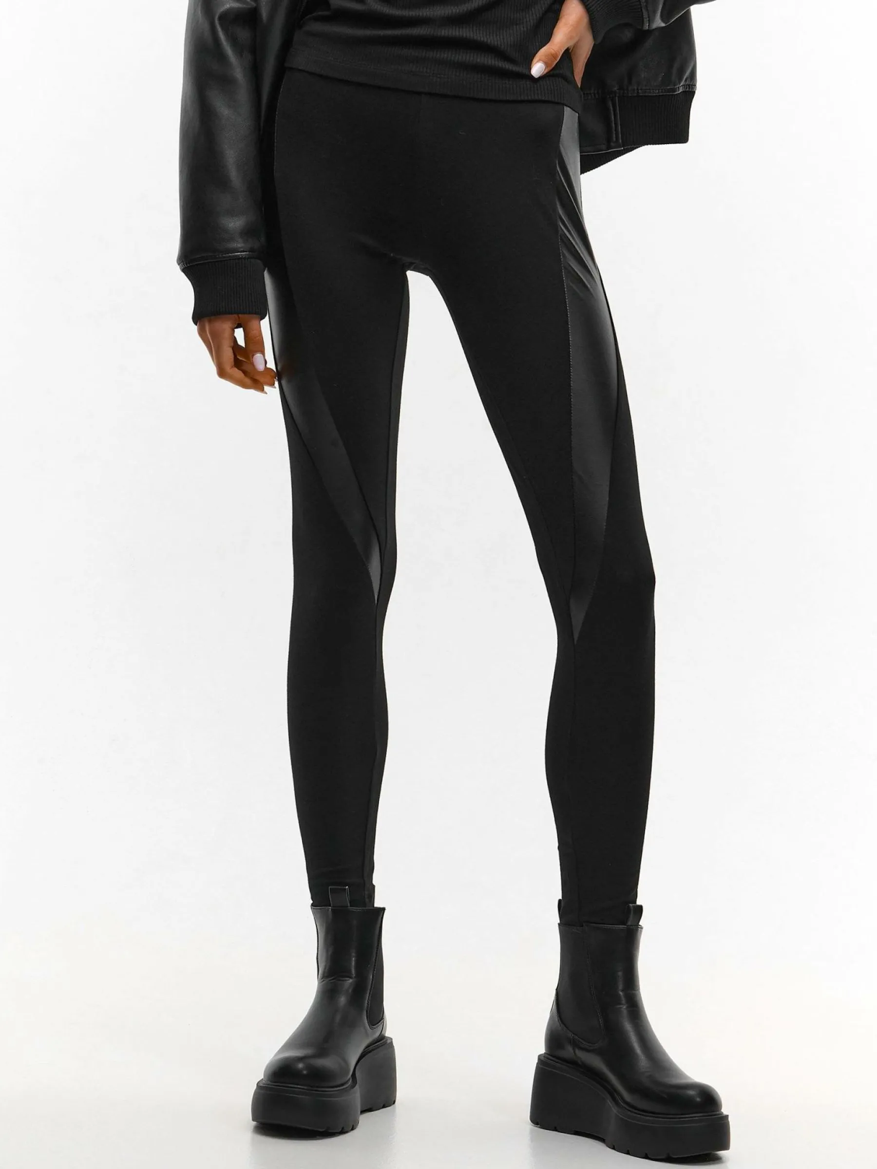 Kolor: czarnyKrój: slimTyp: legginsyDługość: dlugiePattern style: pojedynczy kolorMateriał: sztuczna skóra, baweł…