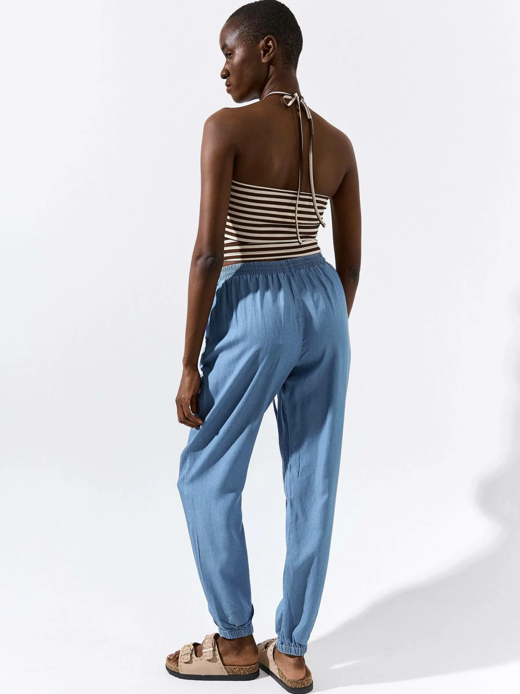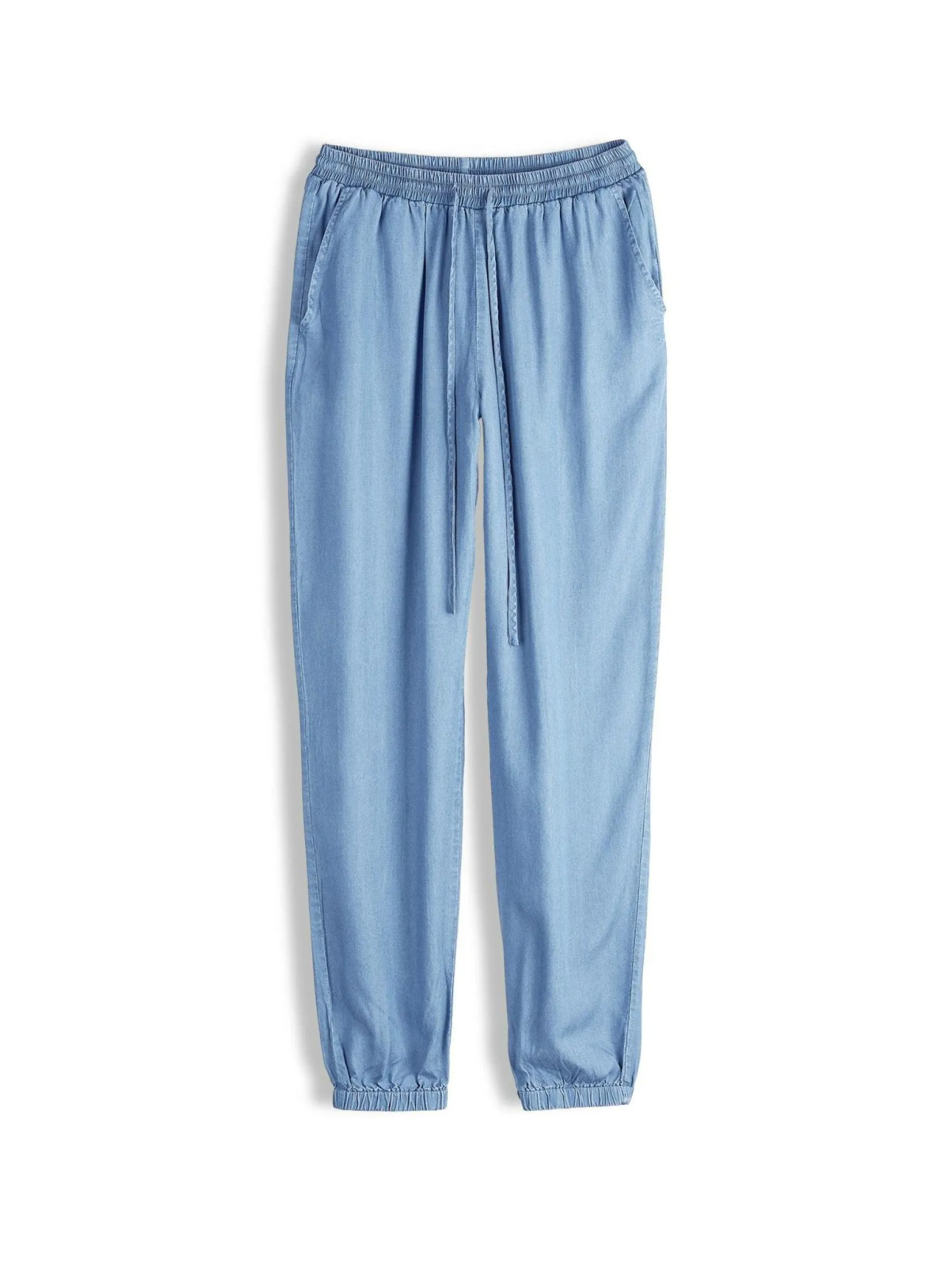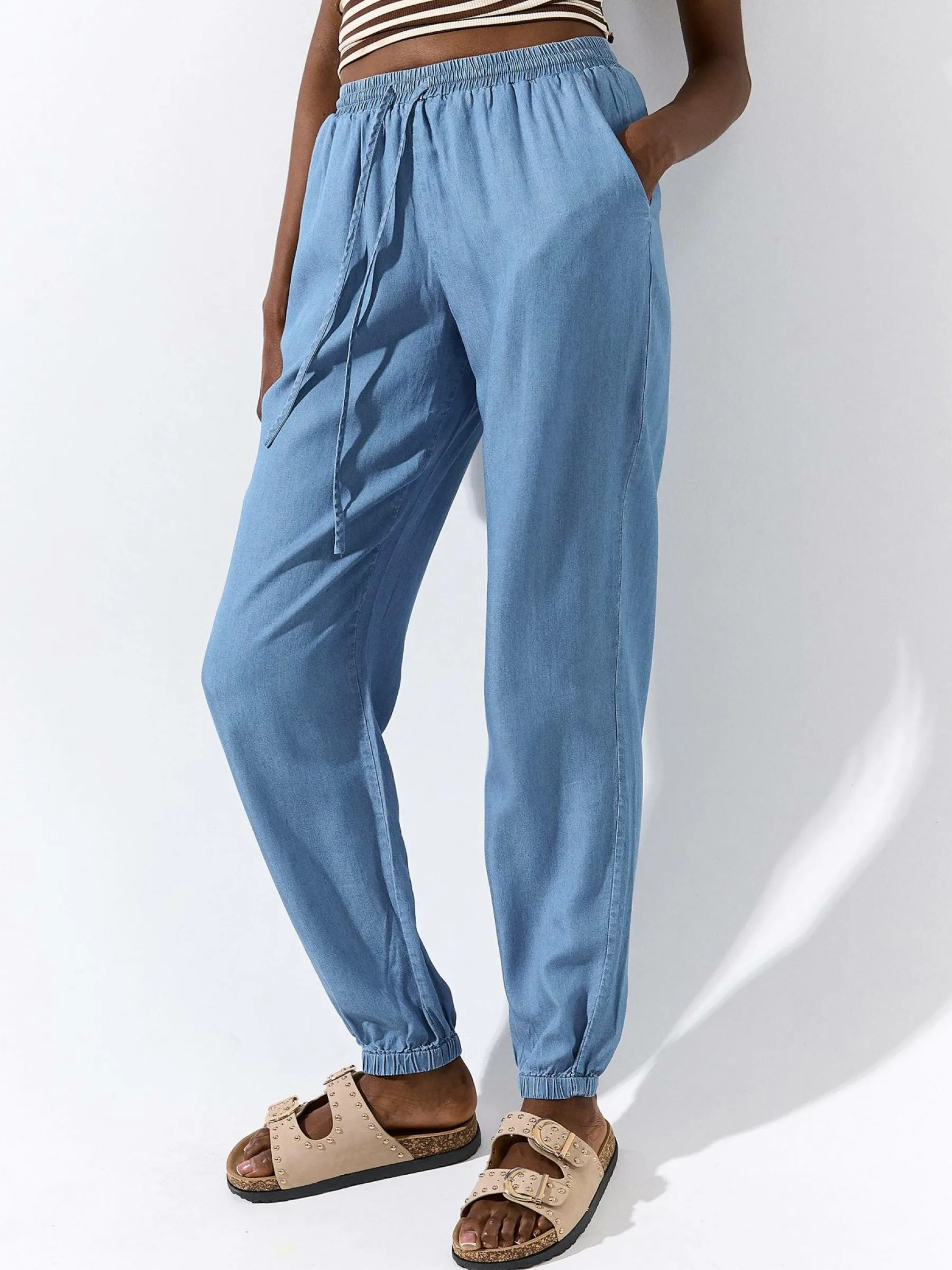 Kolor: niebieskiKrój: joggerTyp: jeansDługość: dlugiePattern style: pojedynczy kolorDetal: ze sznurowaniem, z kiesze…