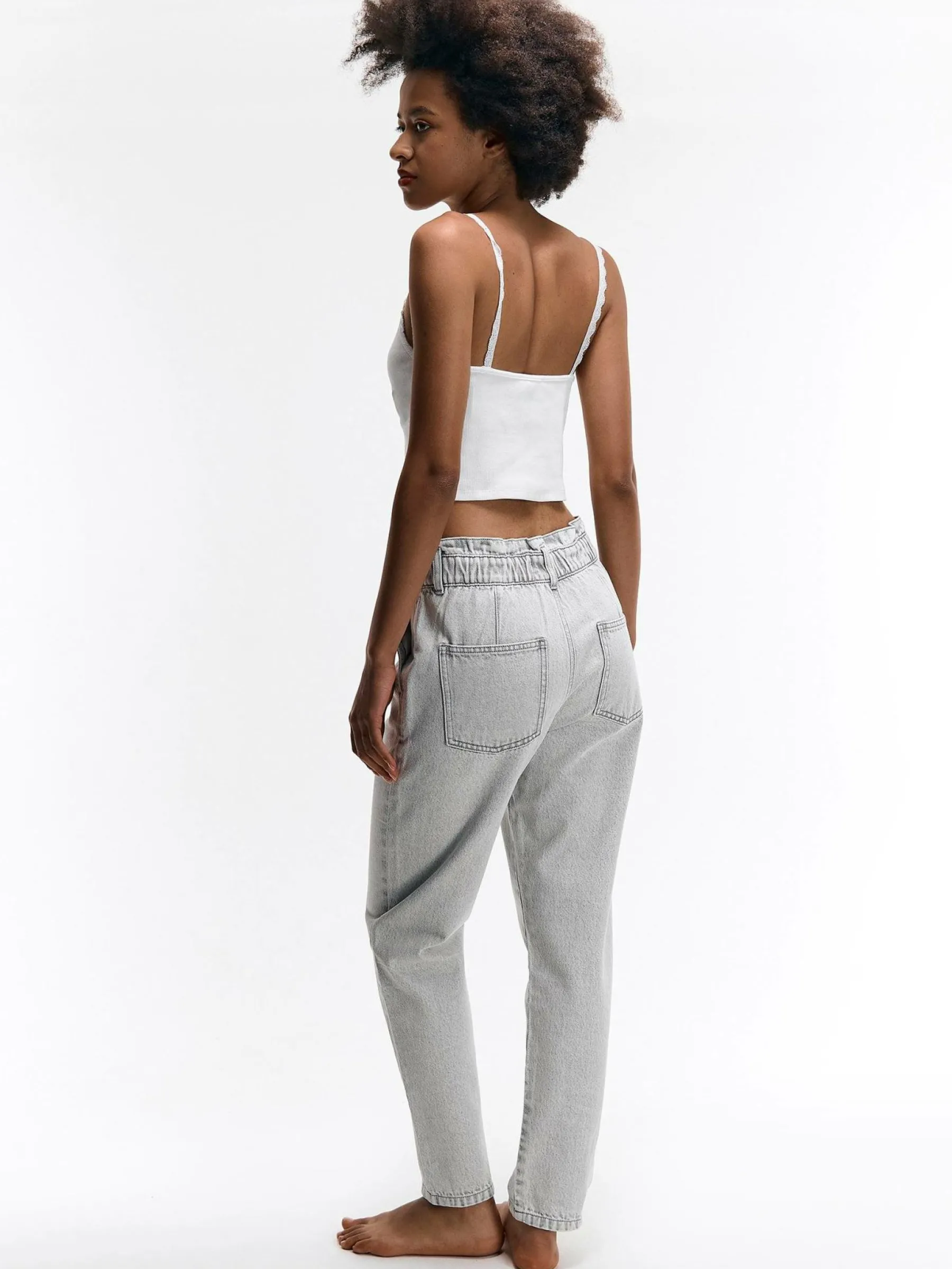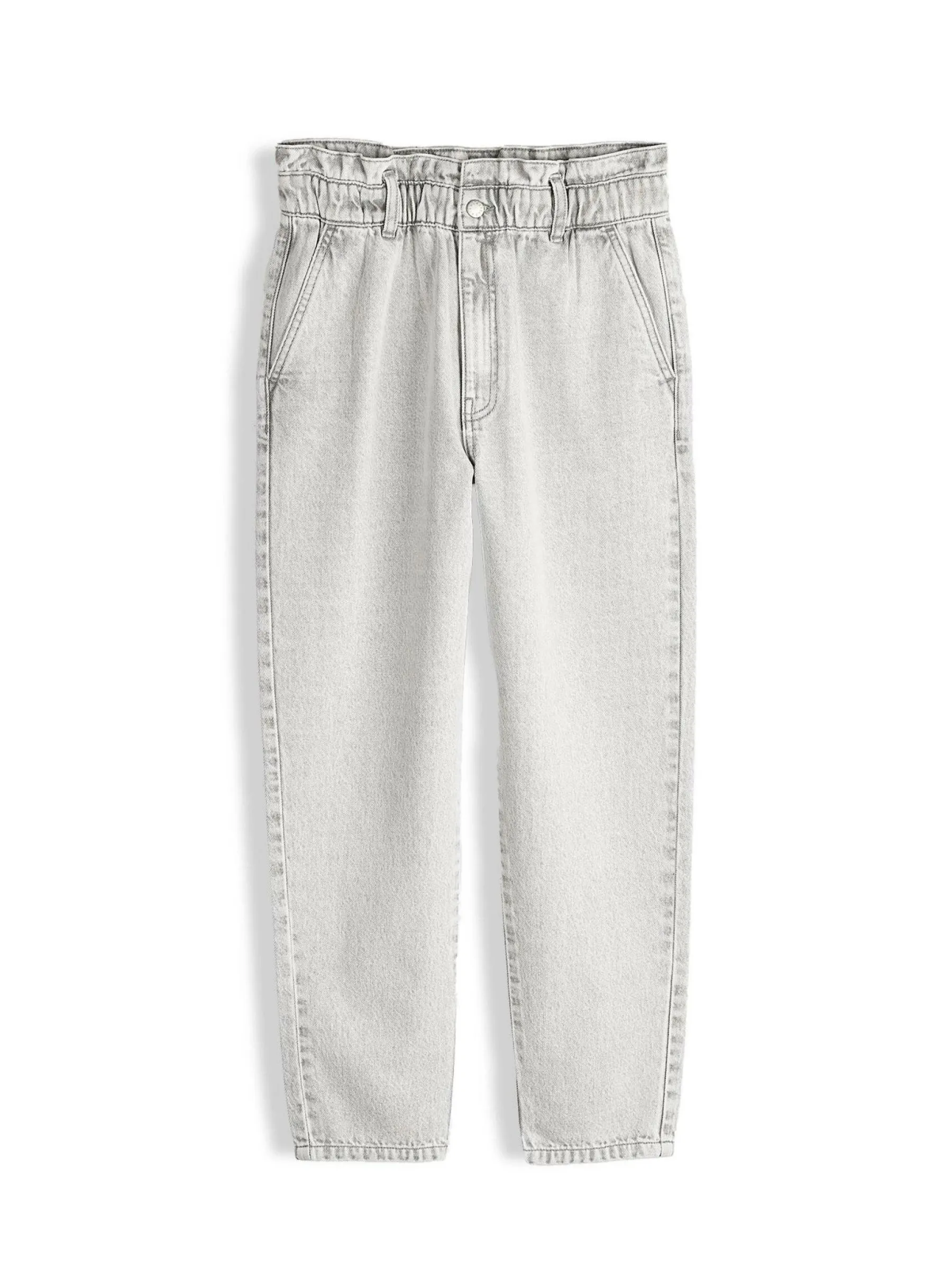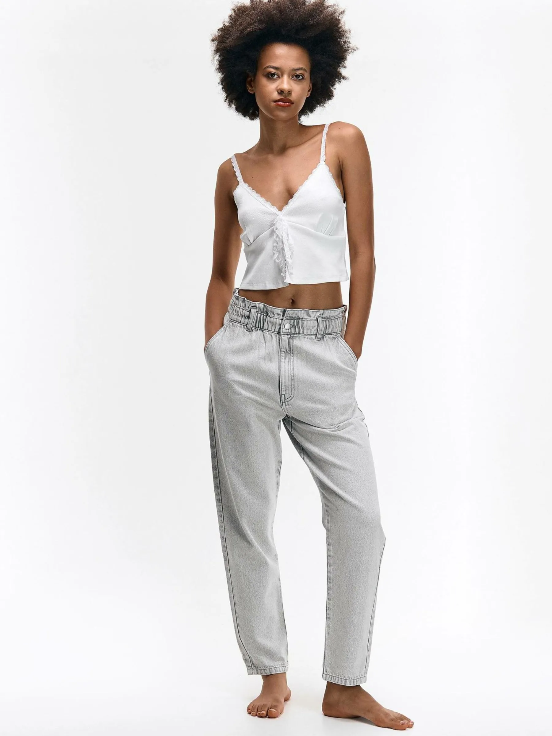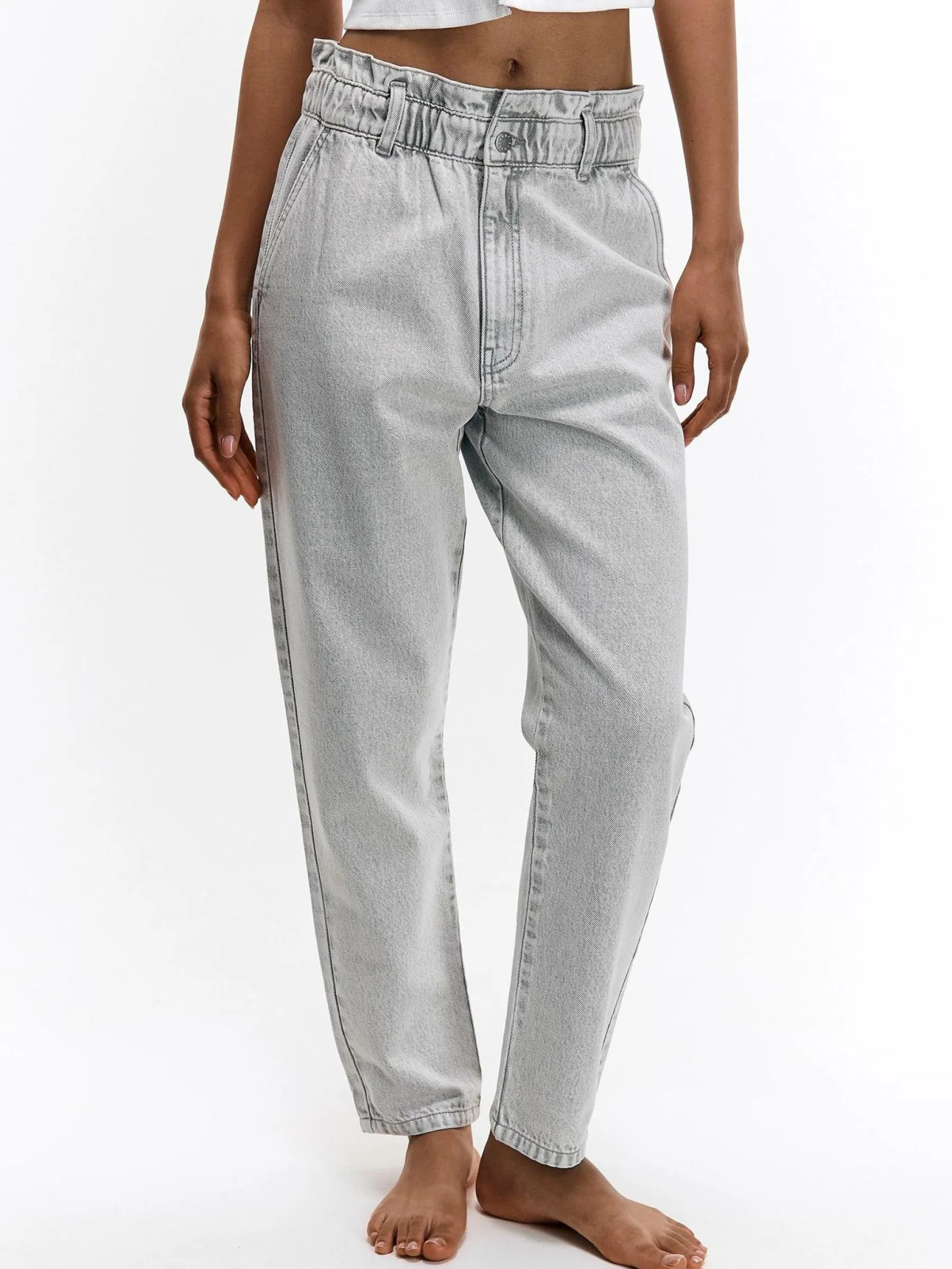 Kolor: szaryKrój: paperbagTyp: jeansDługość: dlugiePattern style: pojedynczy kolorDetal: z kieszeniami, na zamekMate…