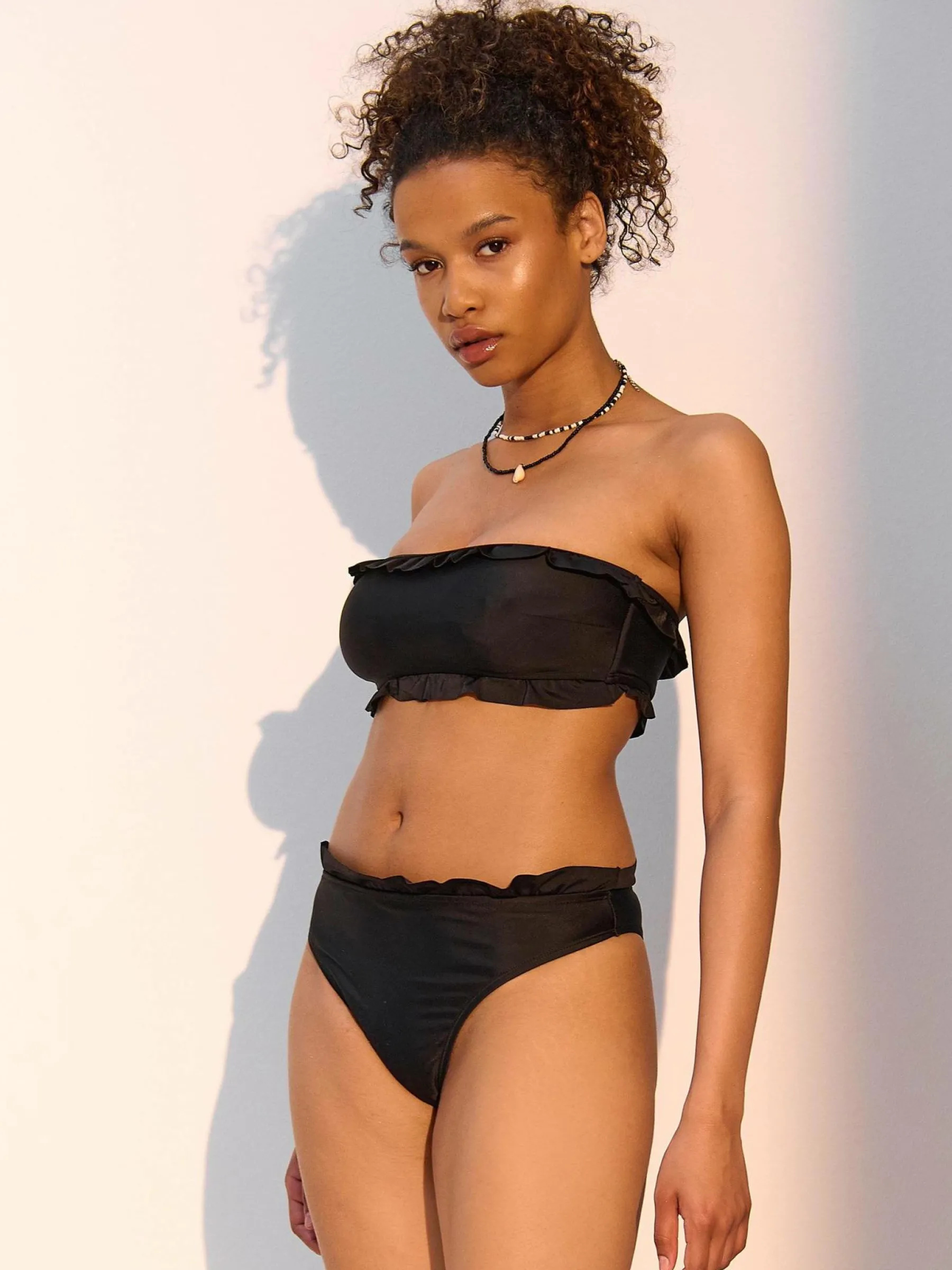 Kolor: czarnyKrój: bikini, z wysokim stanemTyp: dół bikiniPattern style: pojedynczy kolorDetal: z falbanąMateriał: …