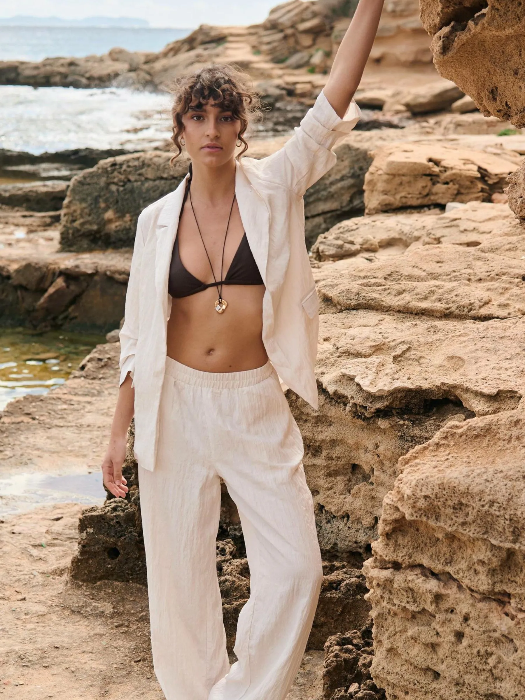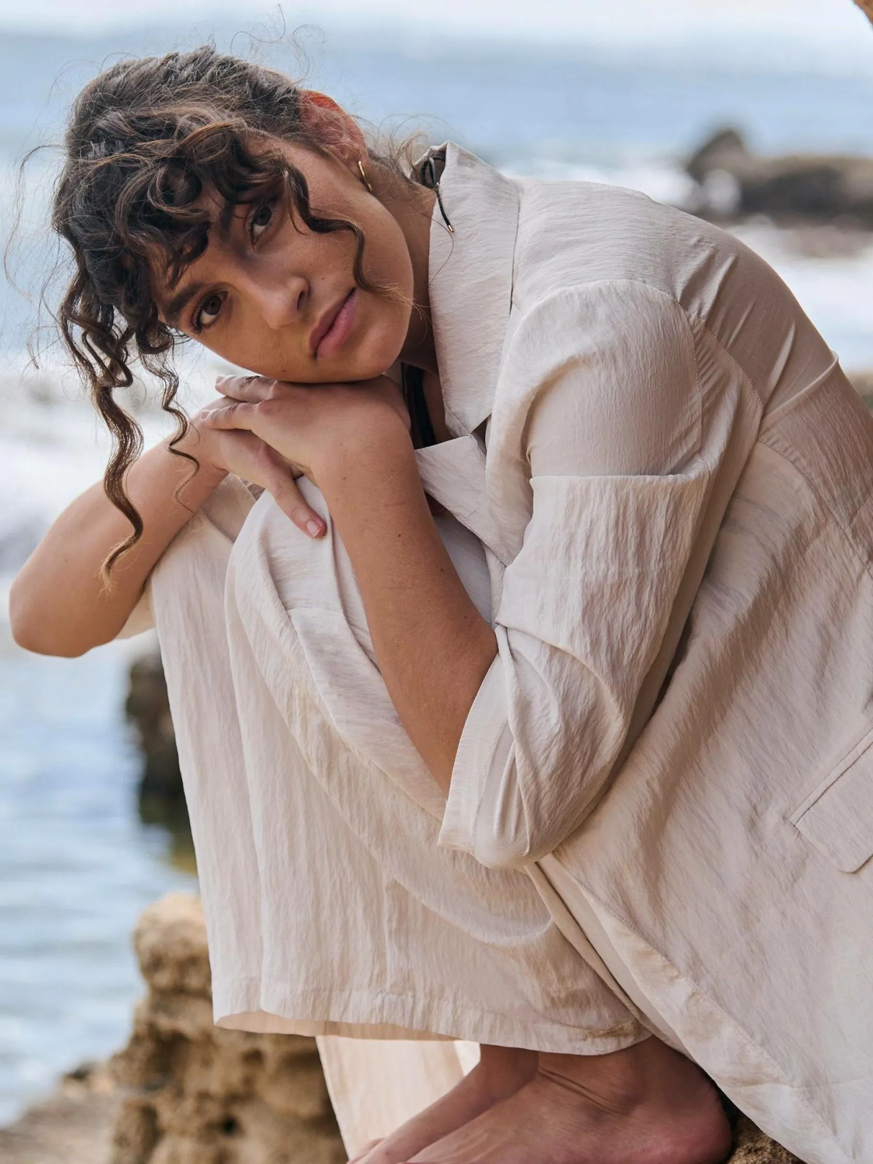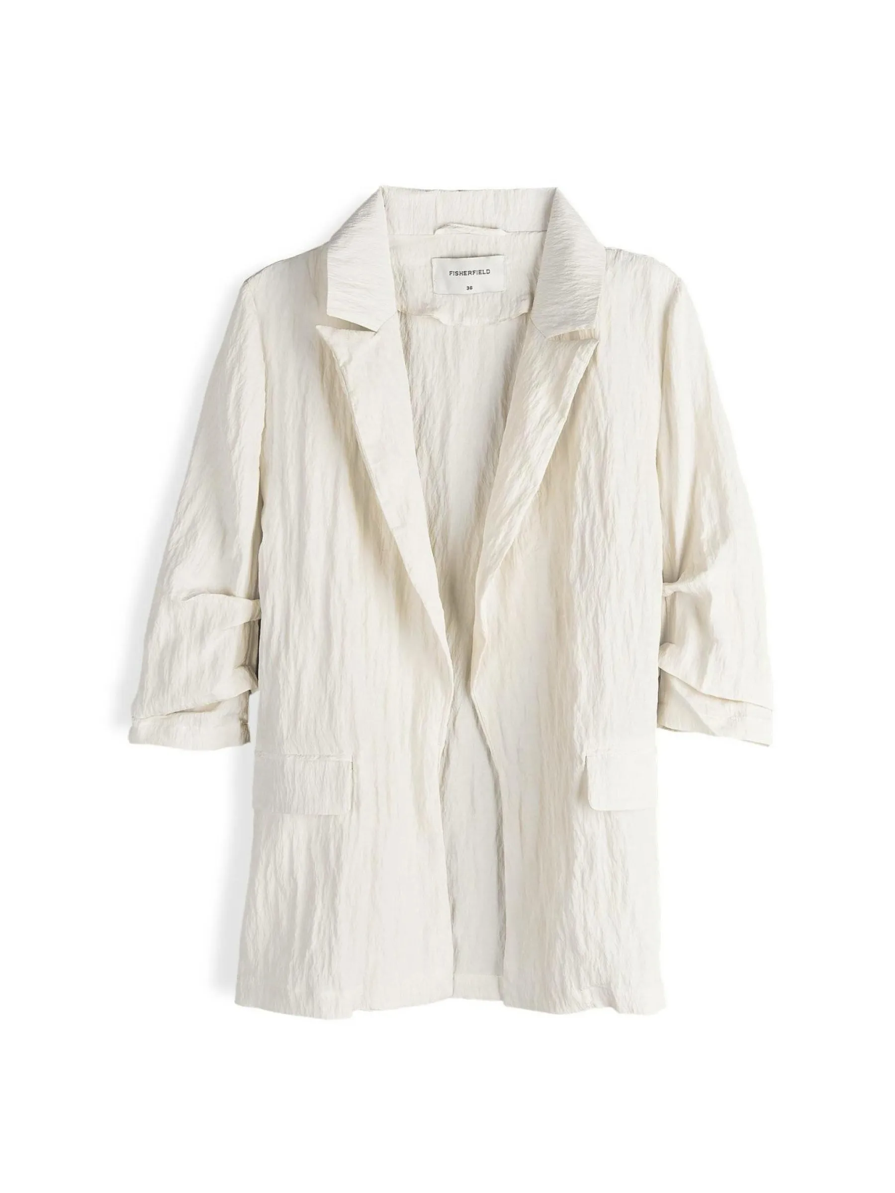 Kolor: beżowyKrój: regularTyp: marynarkaRekaw: rękaw 3/4Długość: krótkiPattern style: pojedynczy kolorDetal: bez …