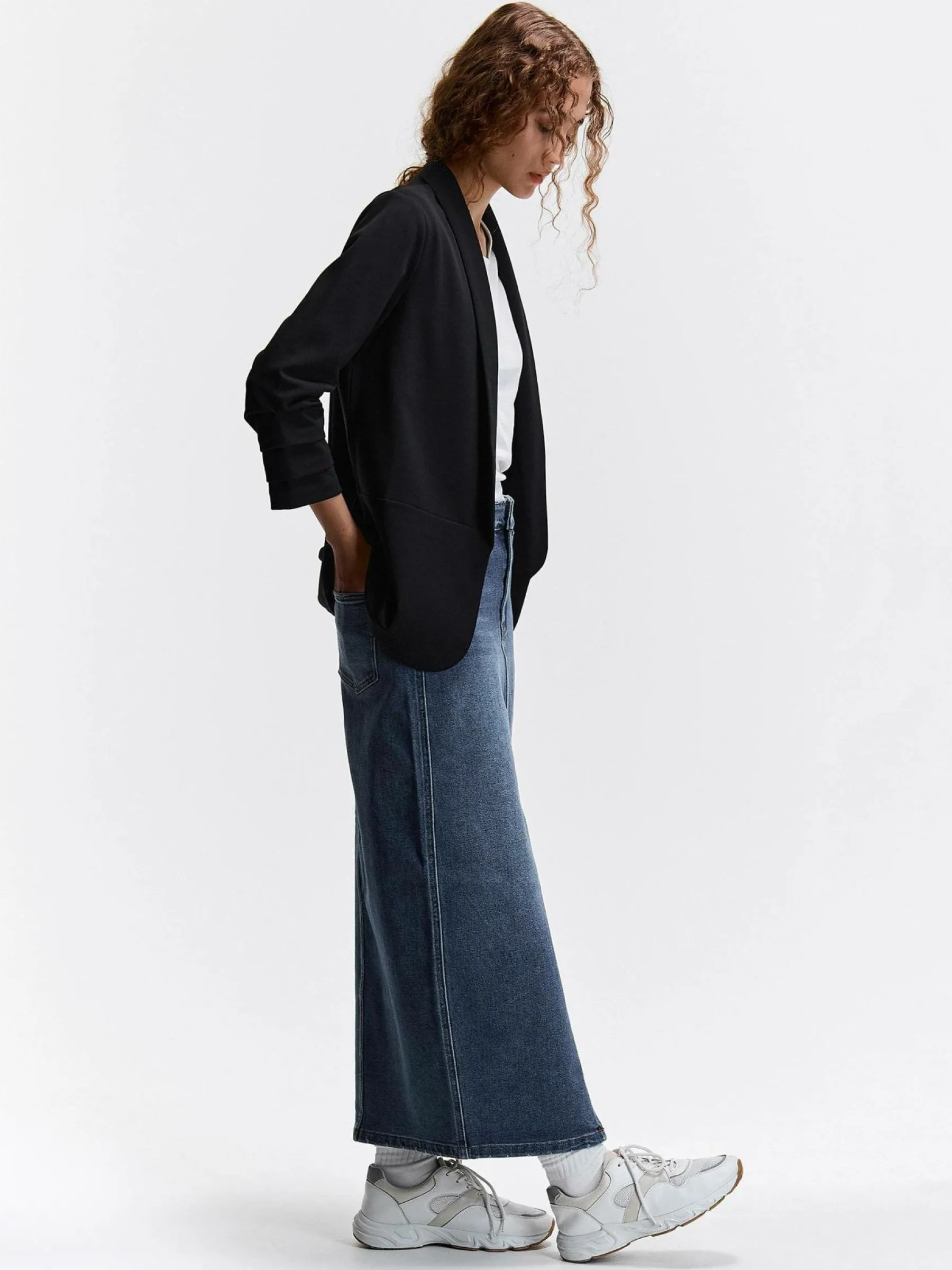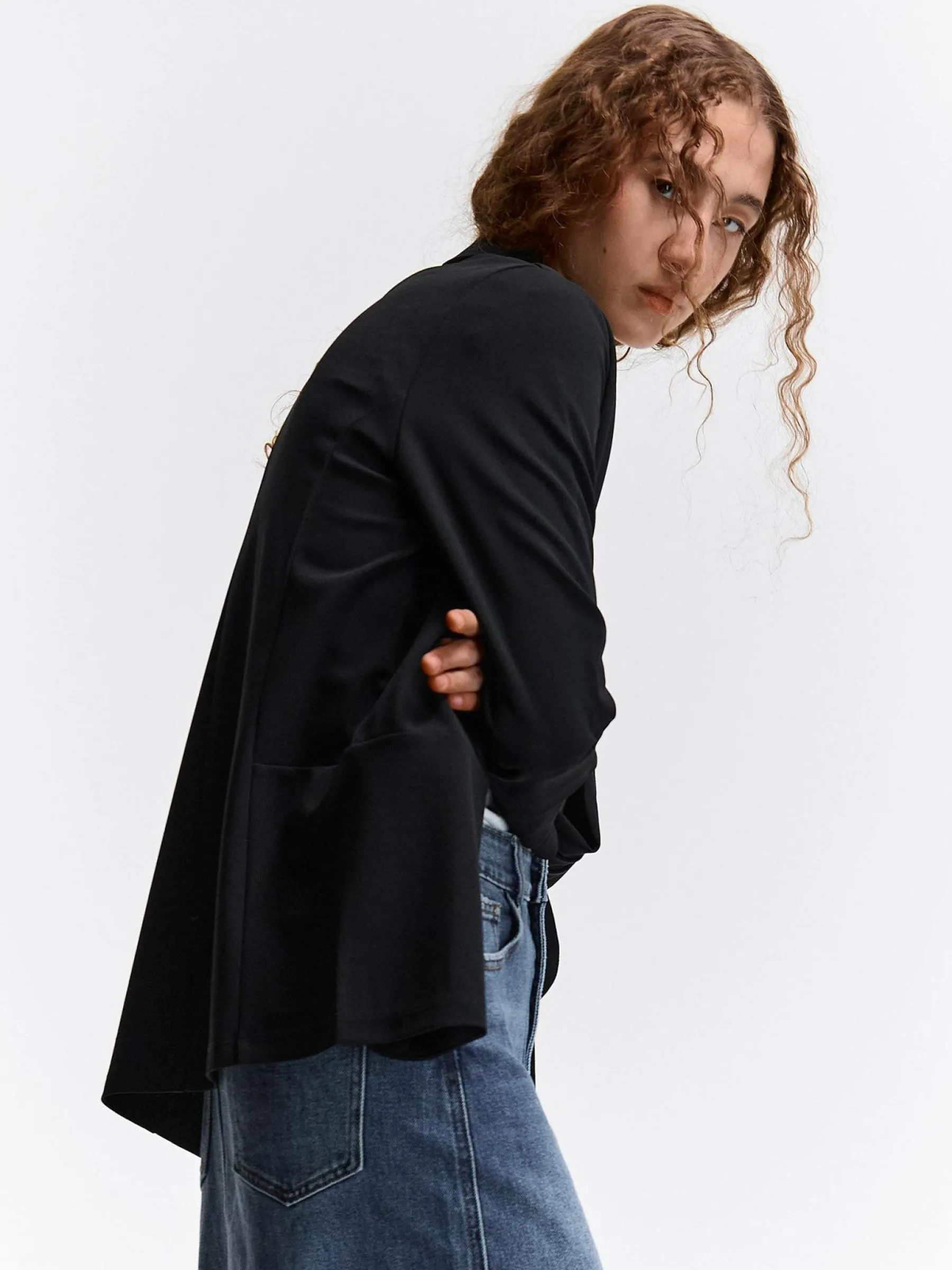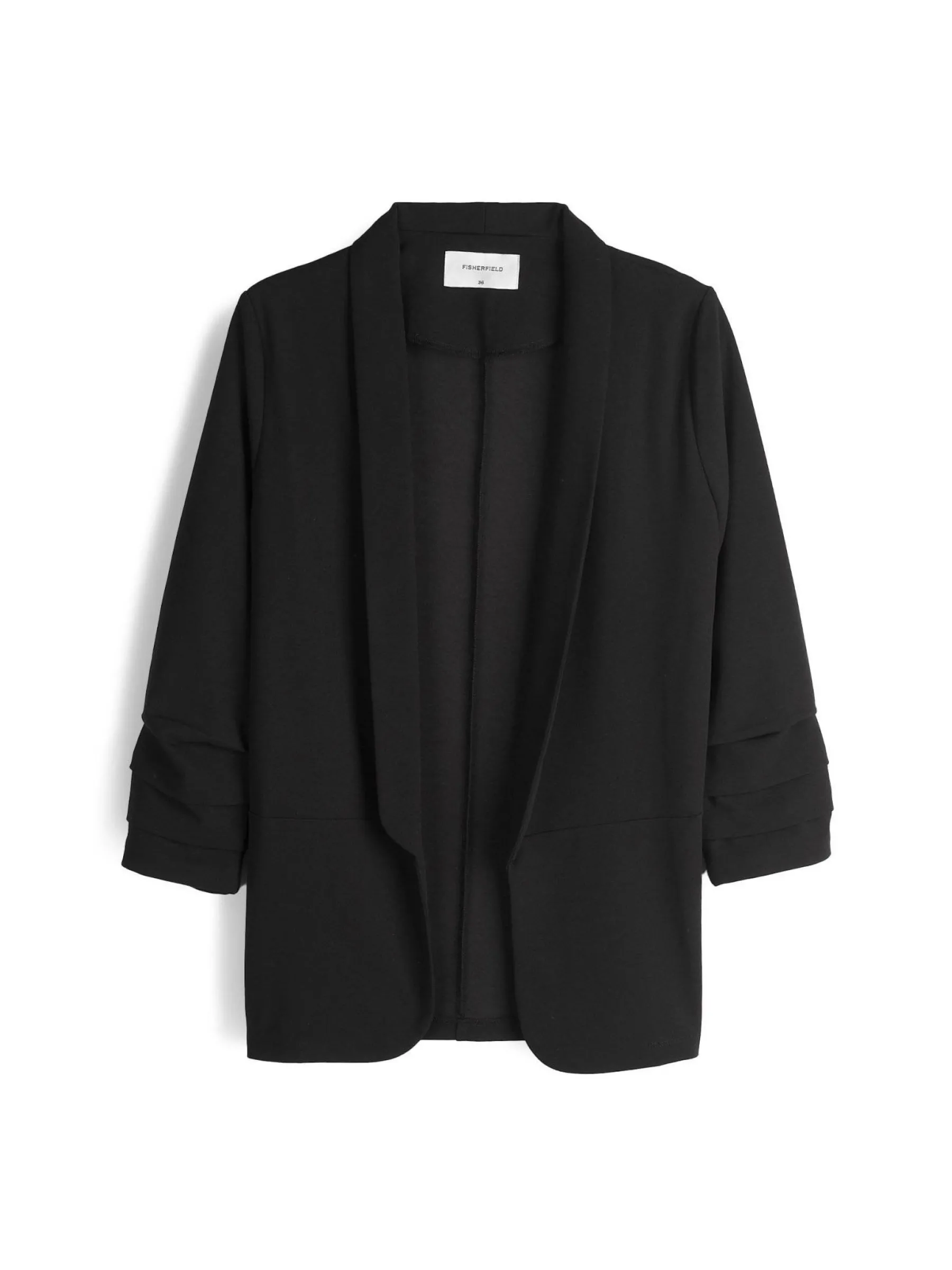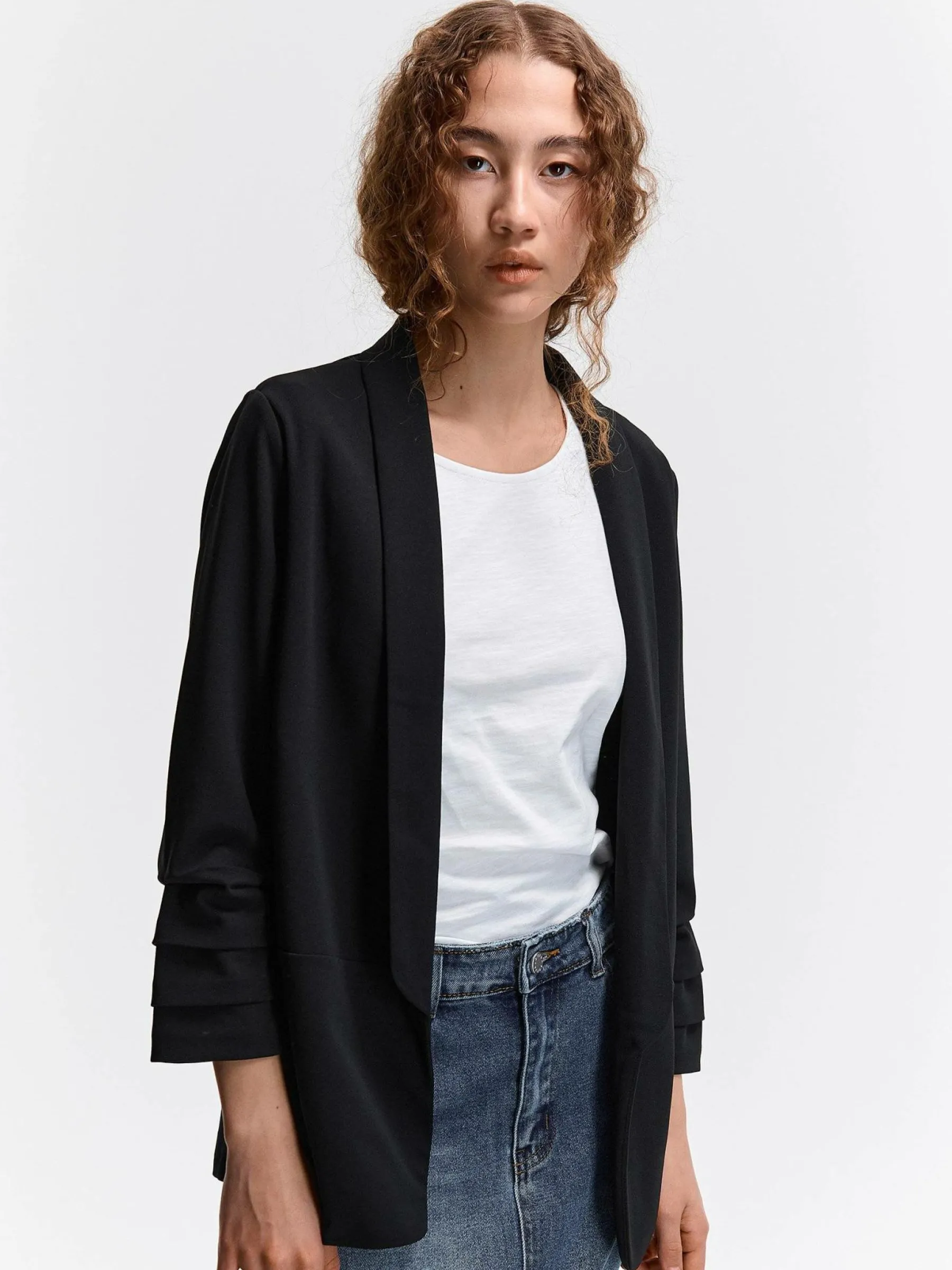 Kolor: czarnyKrój: regularTyp: marynarkaRekaw: rękaw 3/4Długość: krótkiPattern style: pojedynczy kolorDetal: bez z…