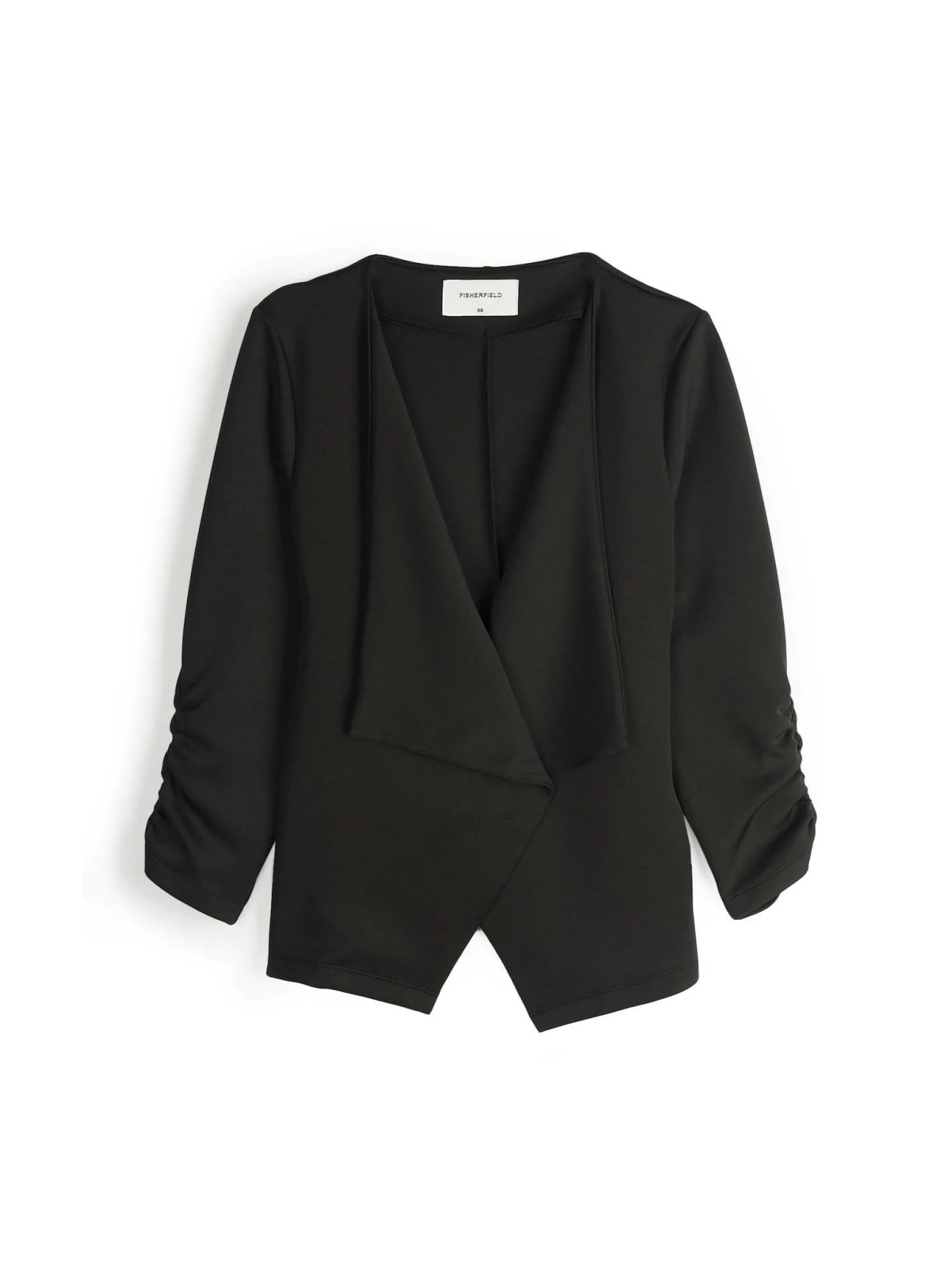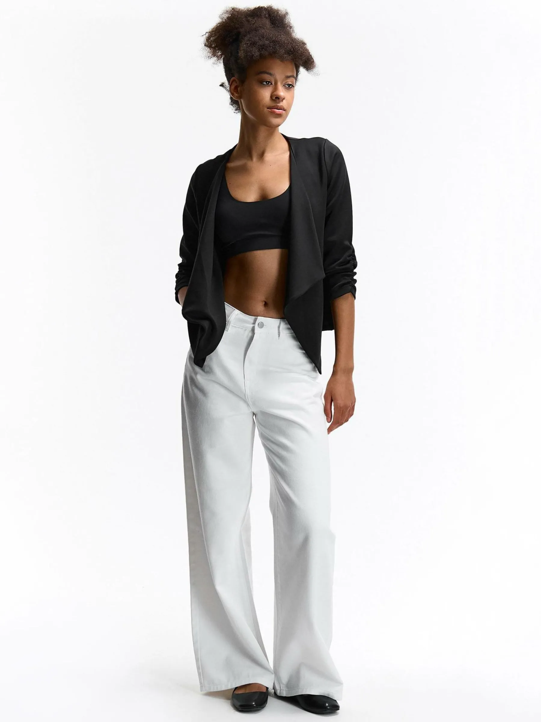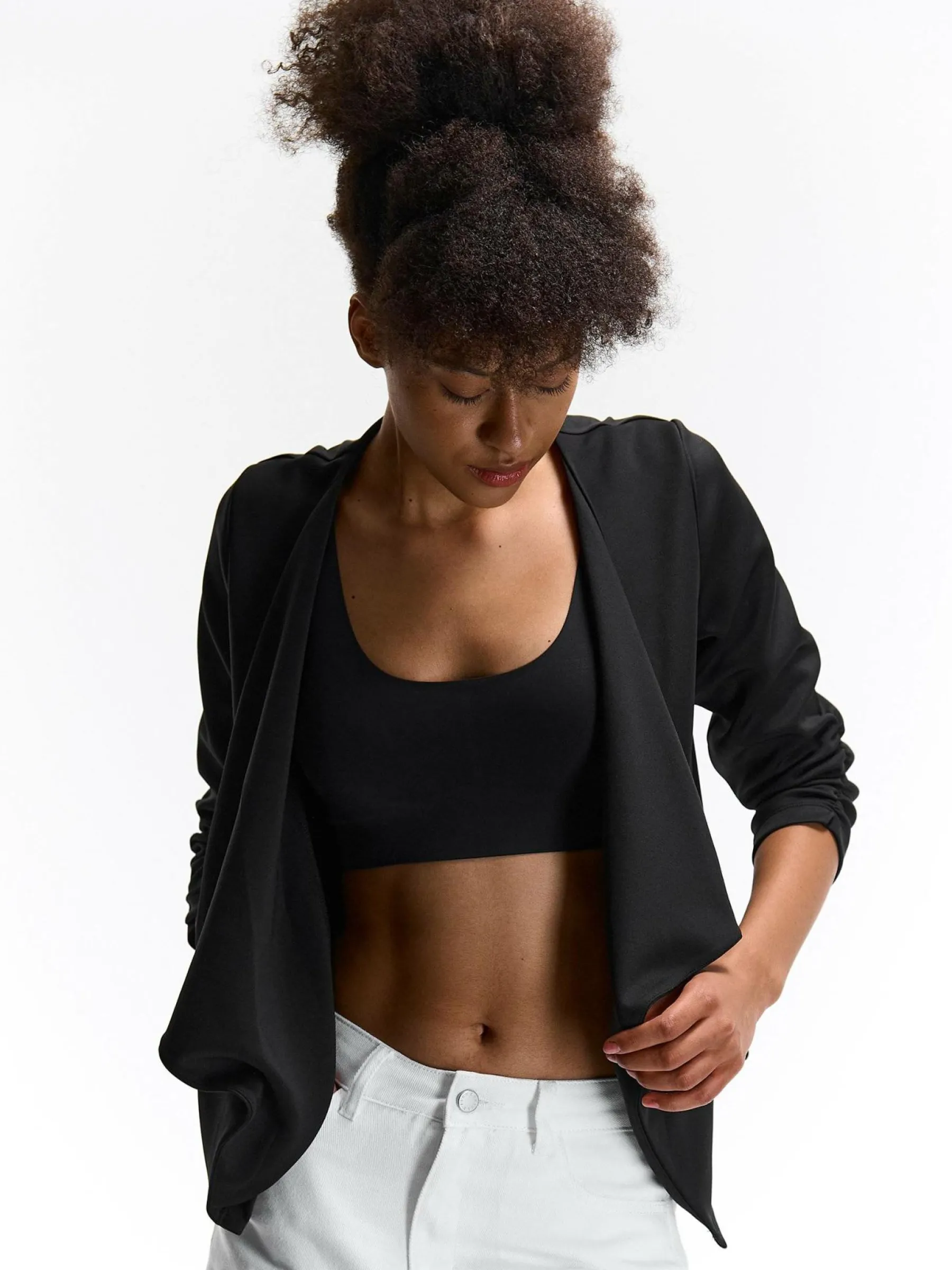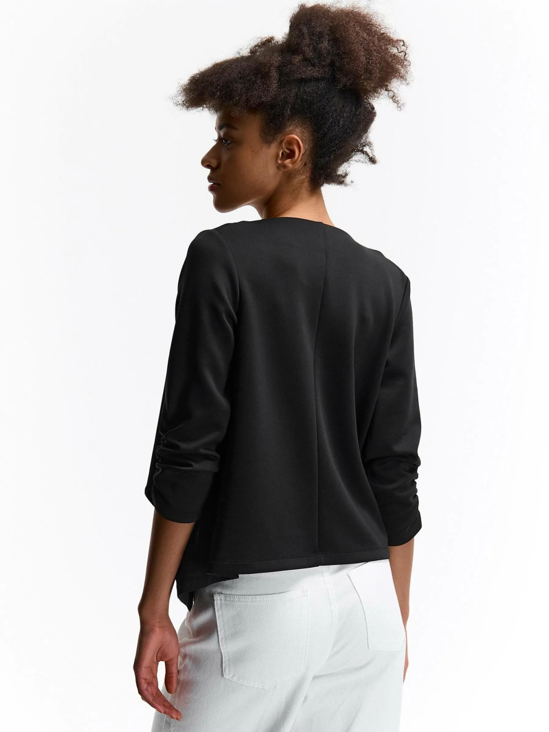 Kolor: czarnyKrój: z marszczeniemTyp: blezerRekaw: rękaw 3/4Długość: krótkiPattern style: pojedynczy kolorDetal: b…