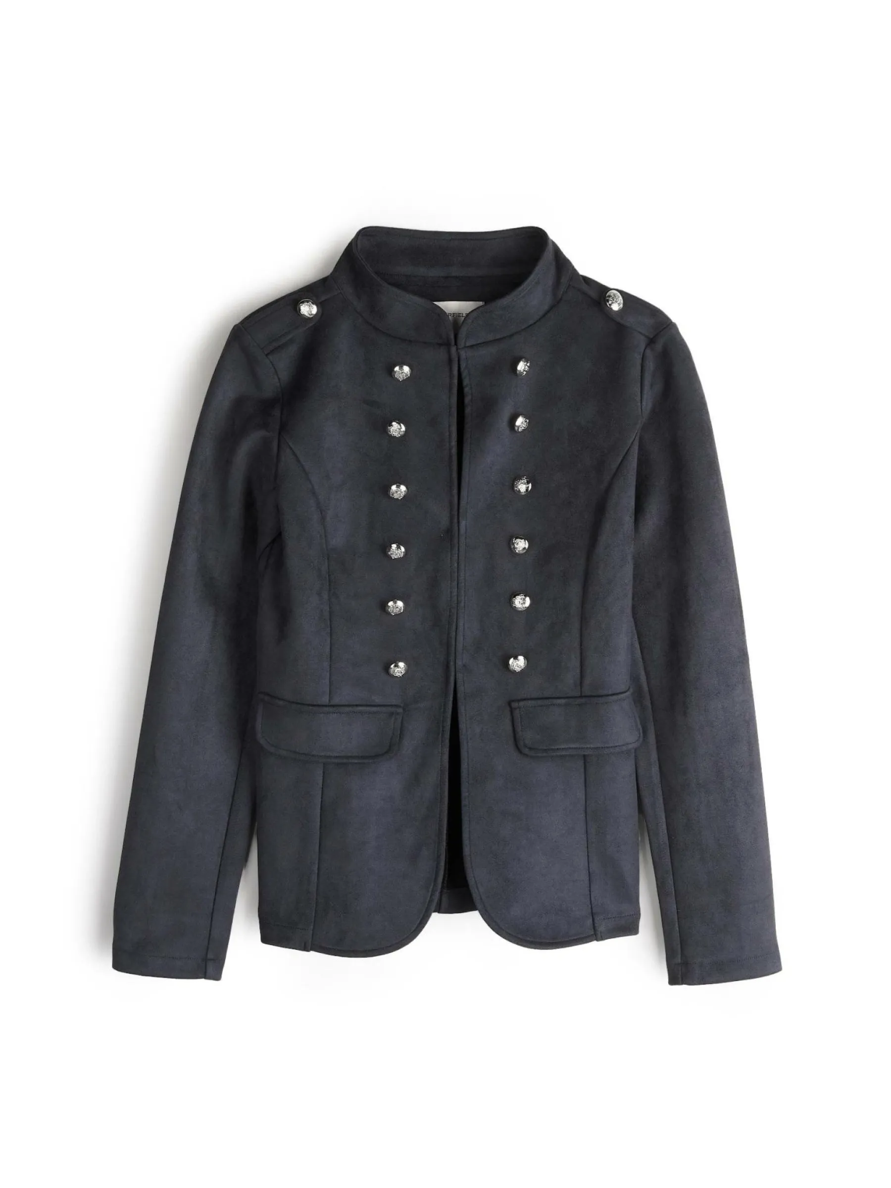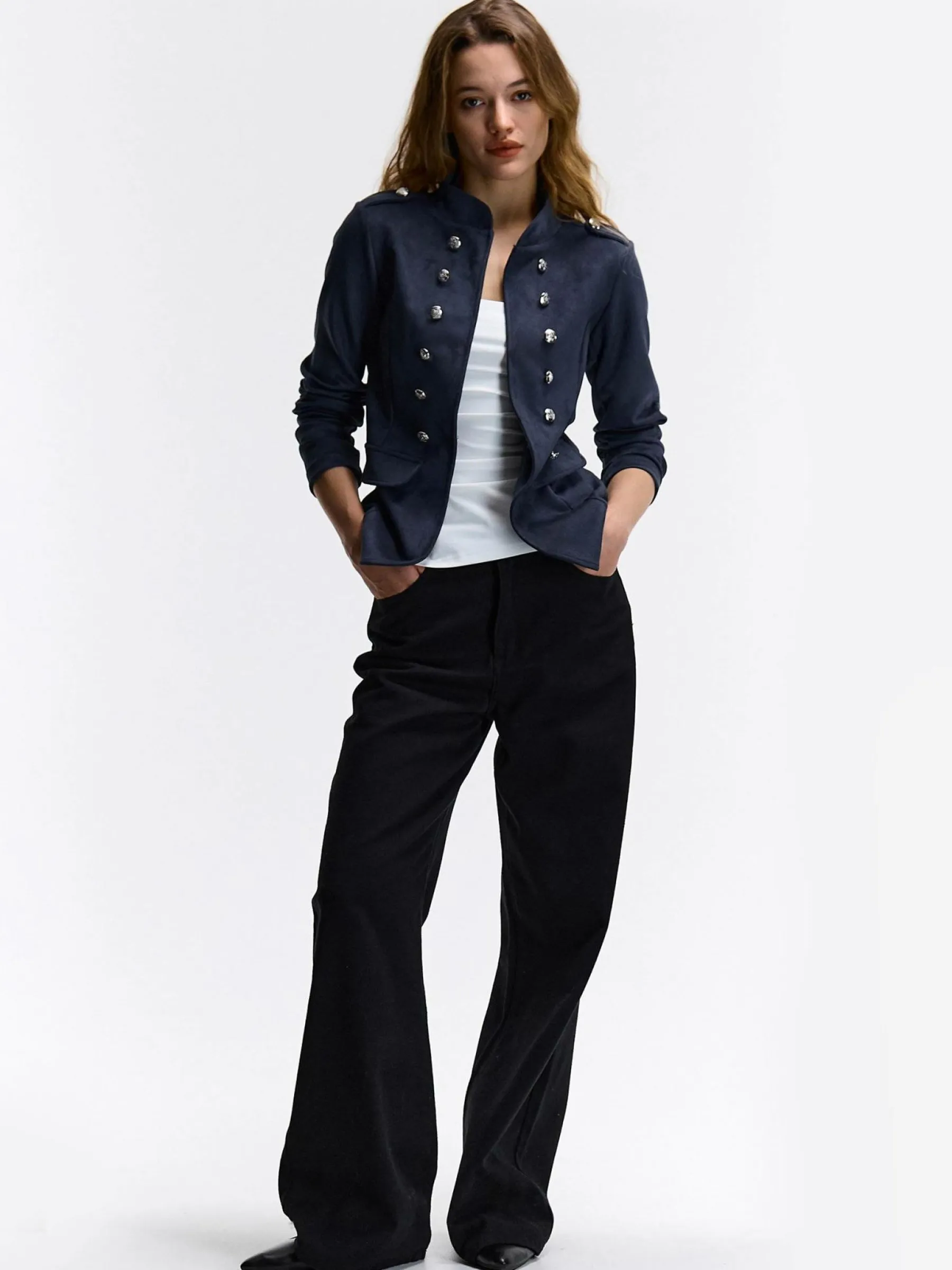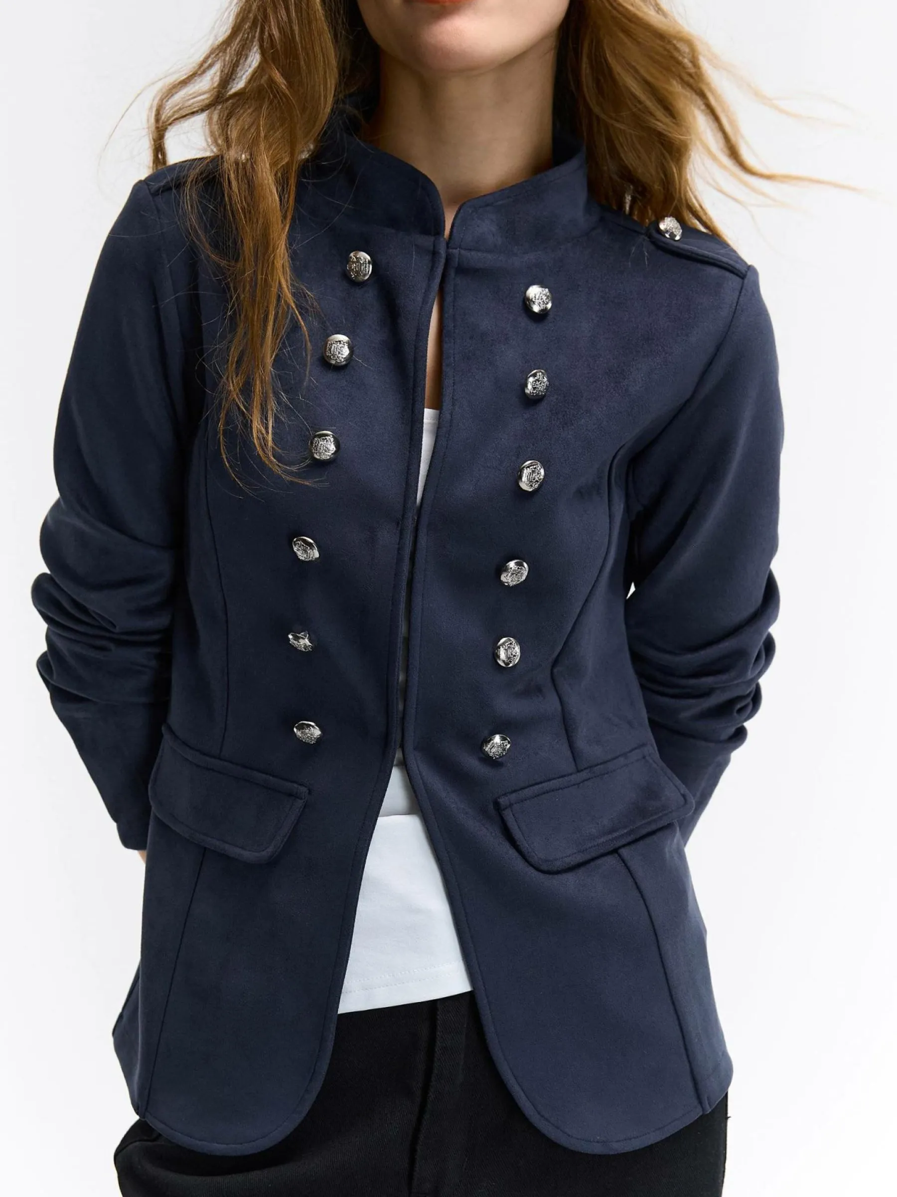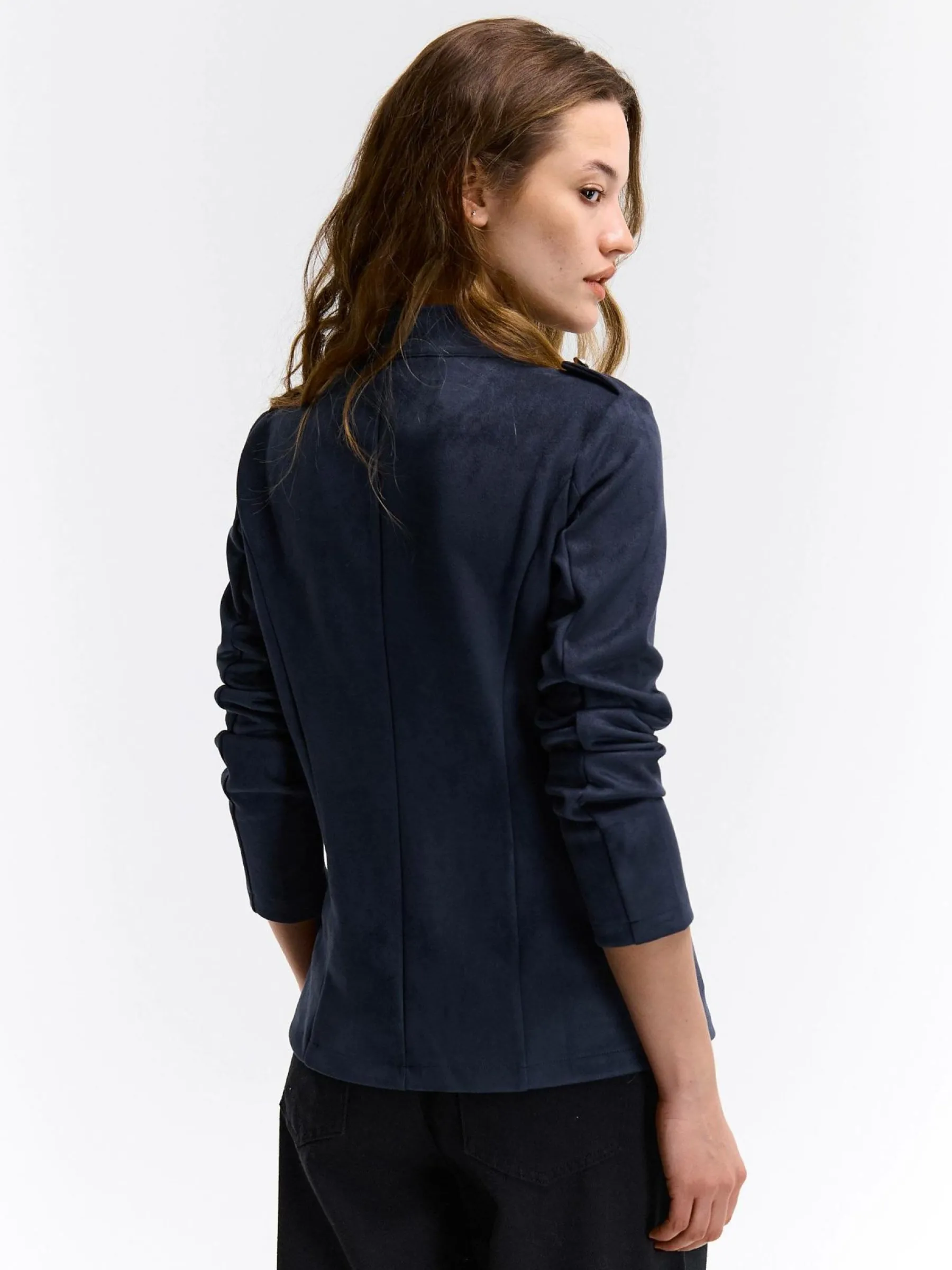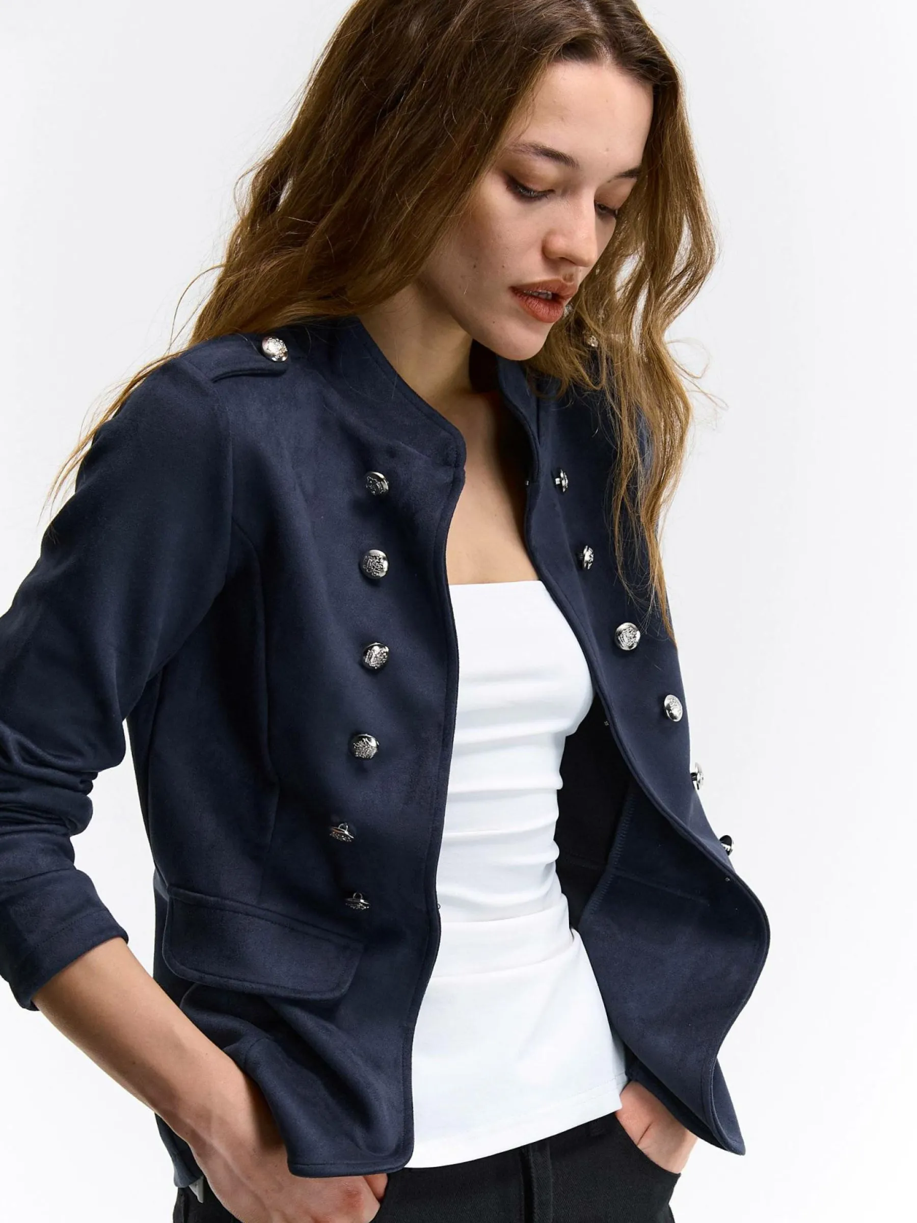 Kolor: granatowy, niebieskiKrój: regularTyp: blezerRekaw: długi rękawDługość: krótkiPattern style: pojedynczy kol…
