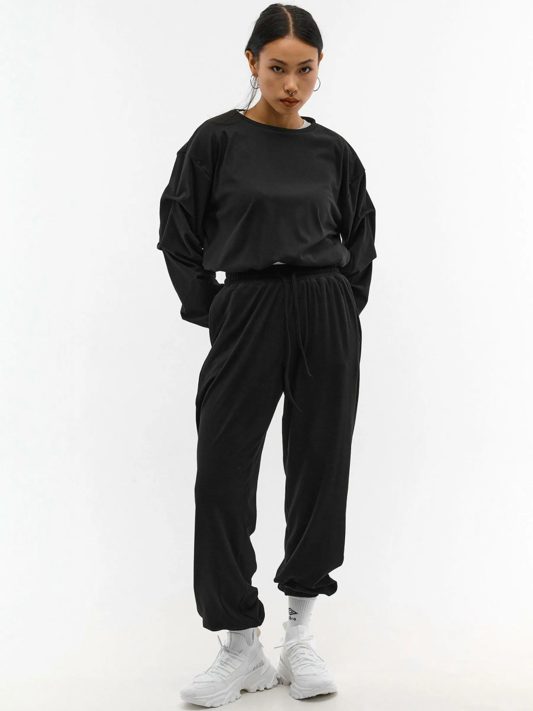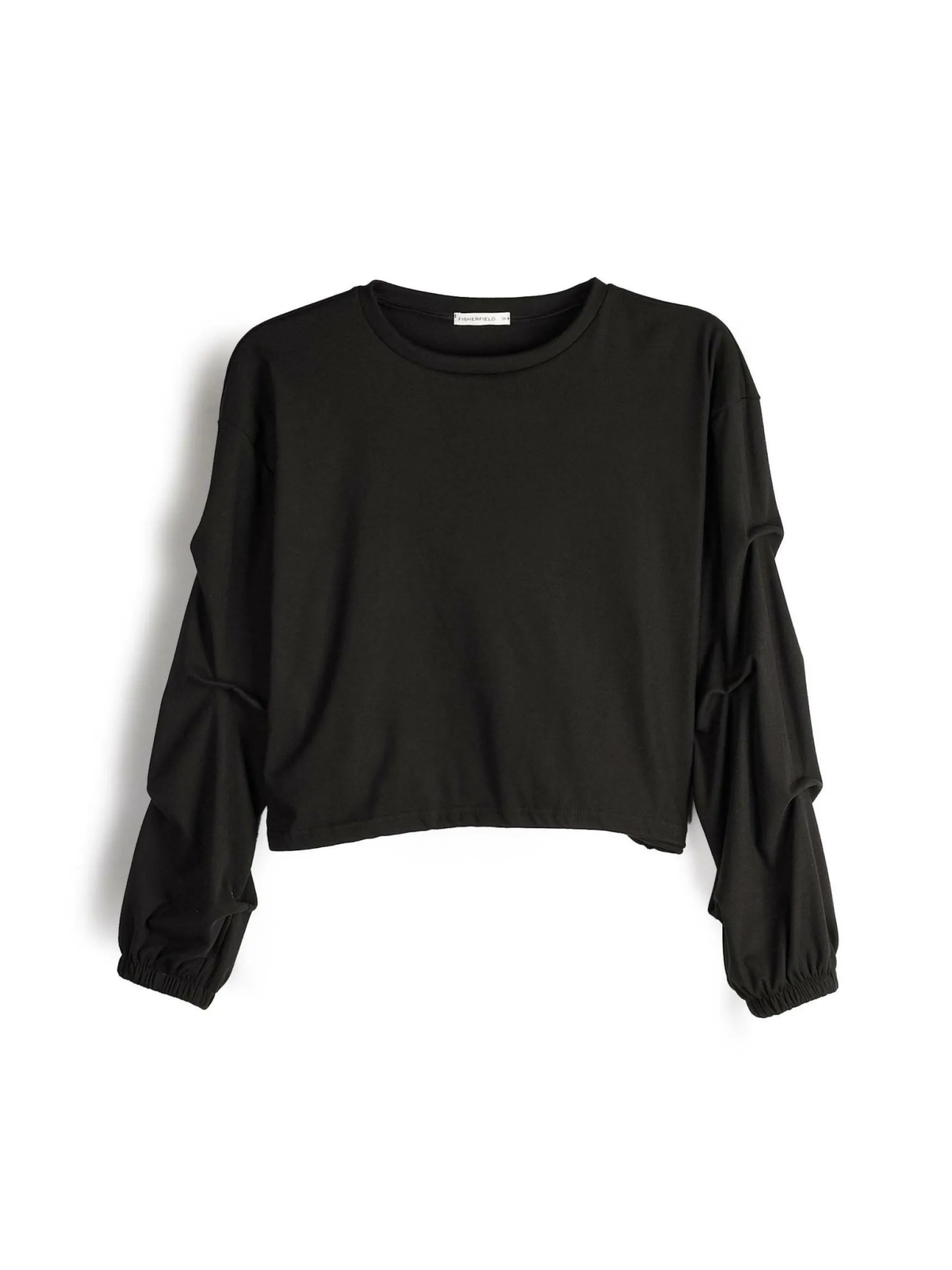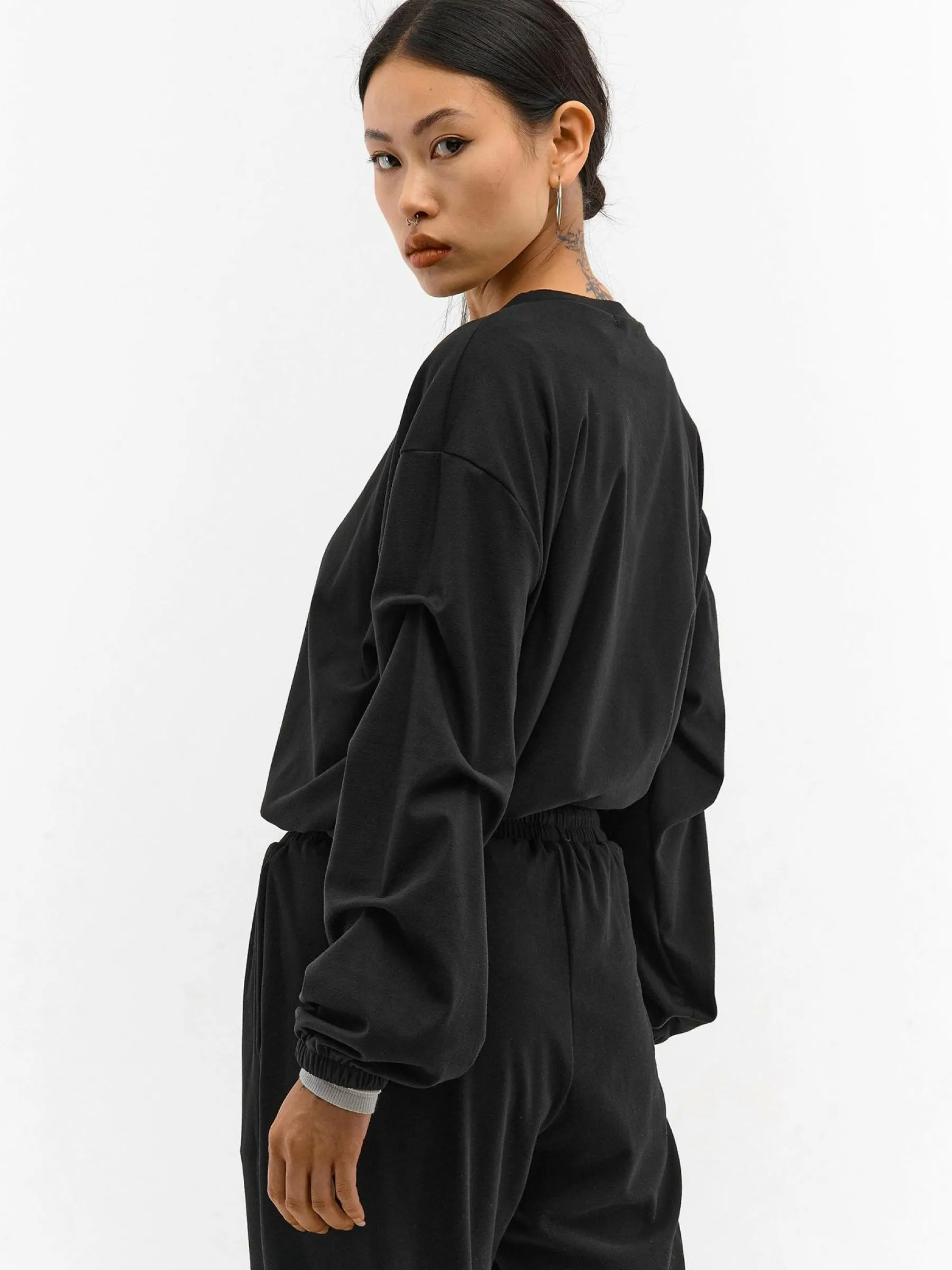 Kolor: czarnyKrój: z marszczeniemTyp: bluzaRekaw: długi rękawDługość: krótkiPattern style: pojedynczy kolorDetal:…