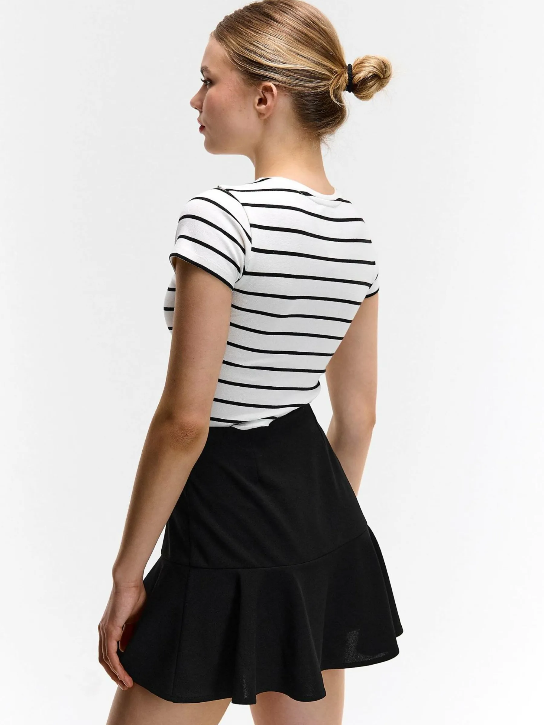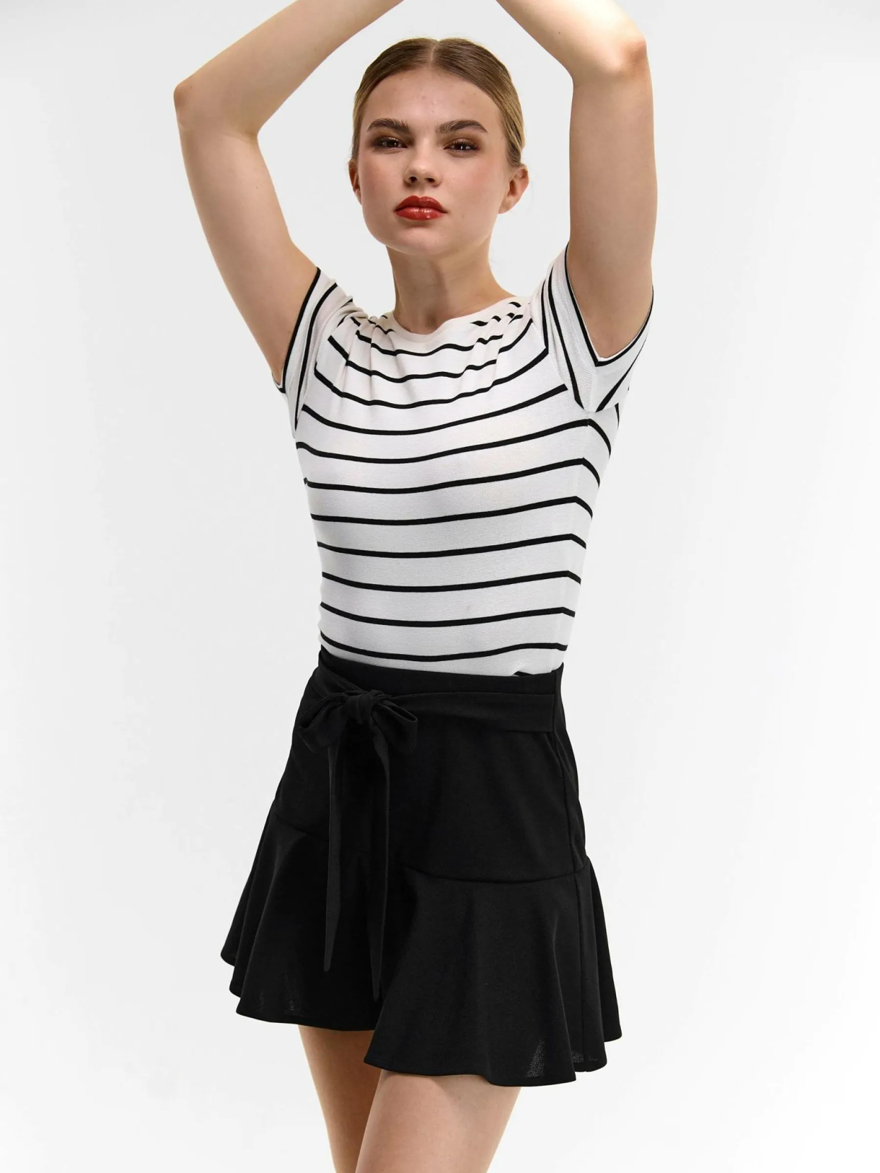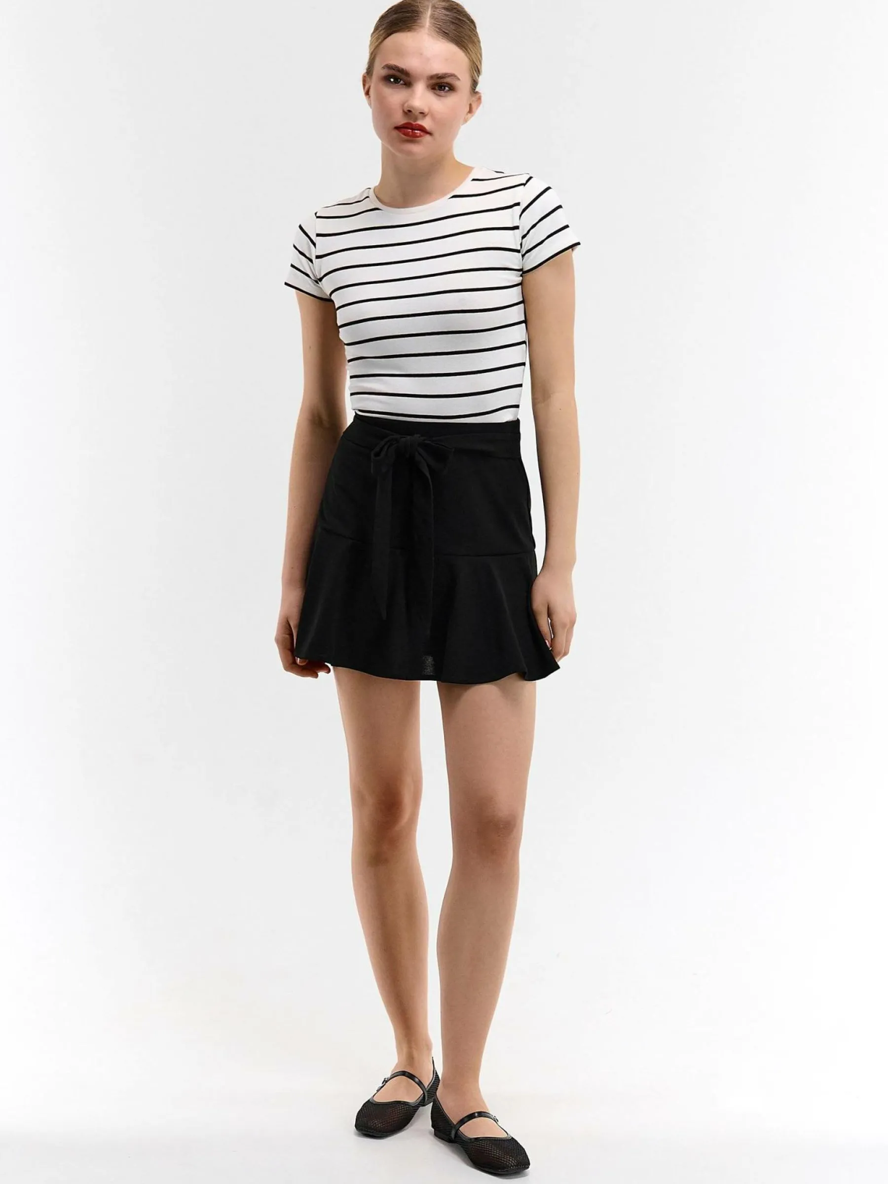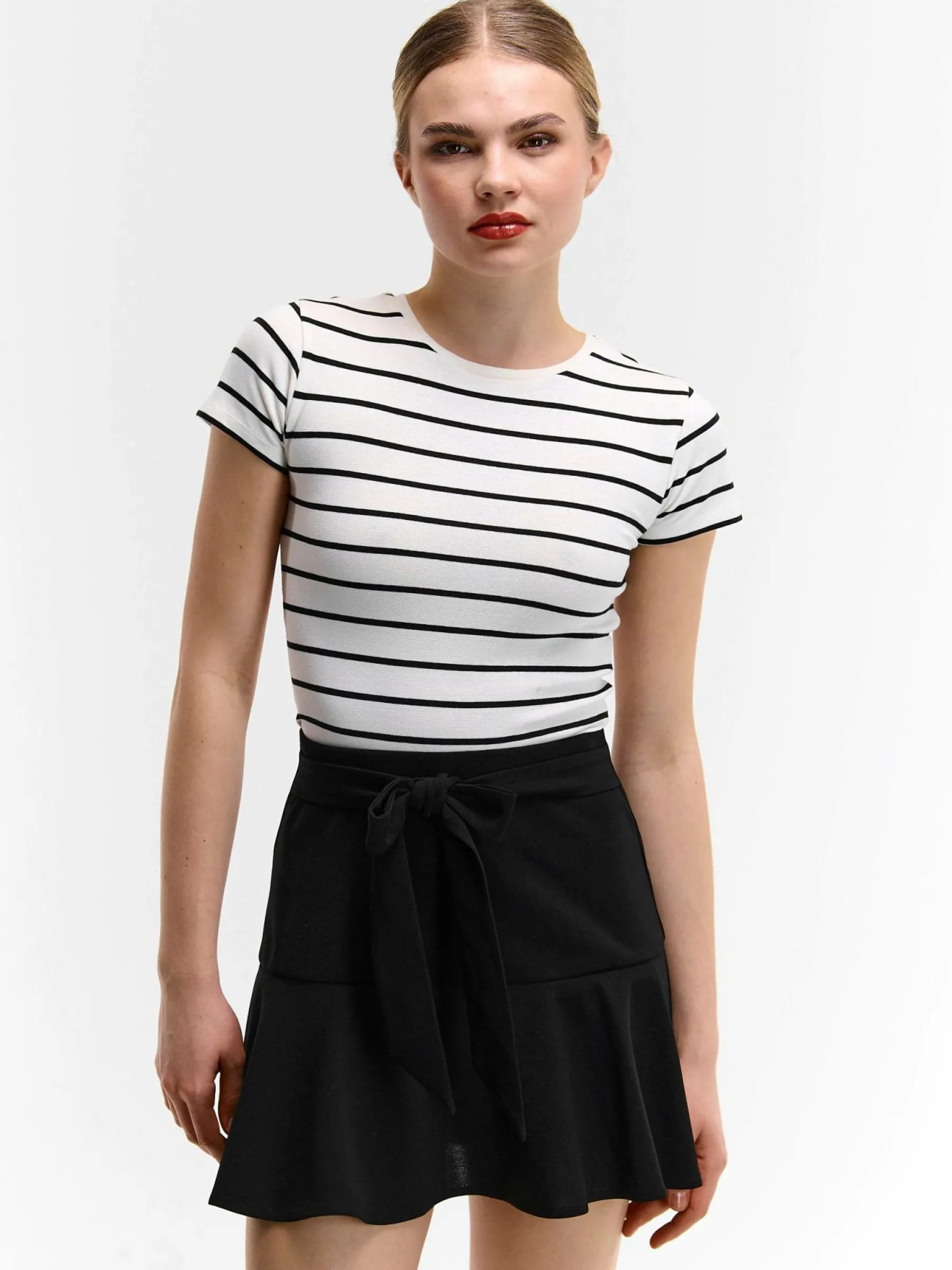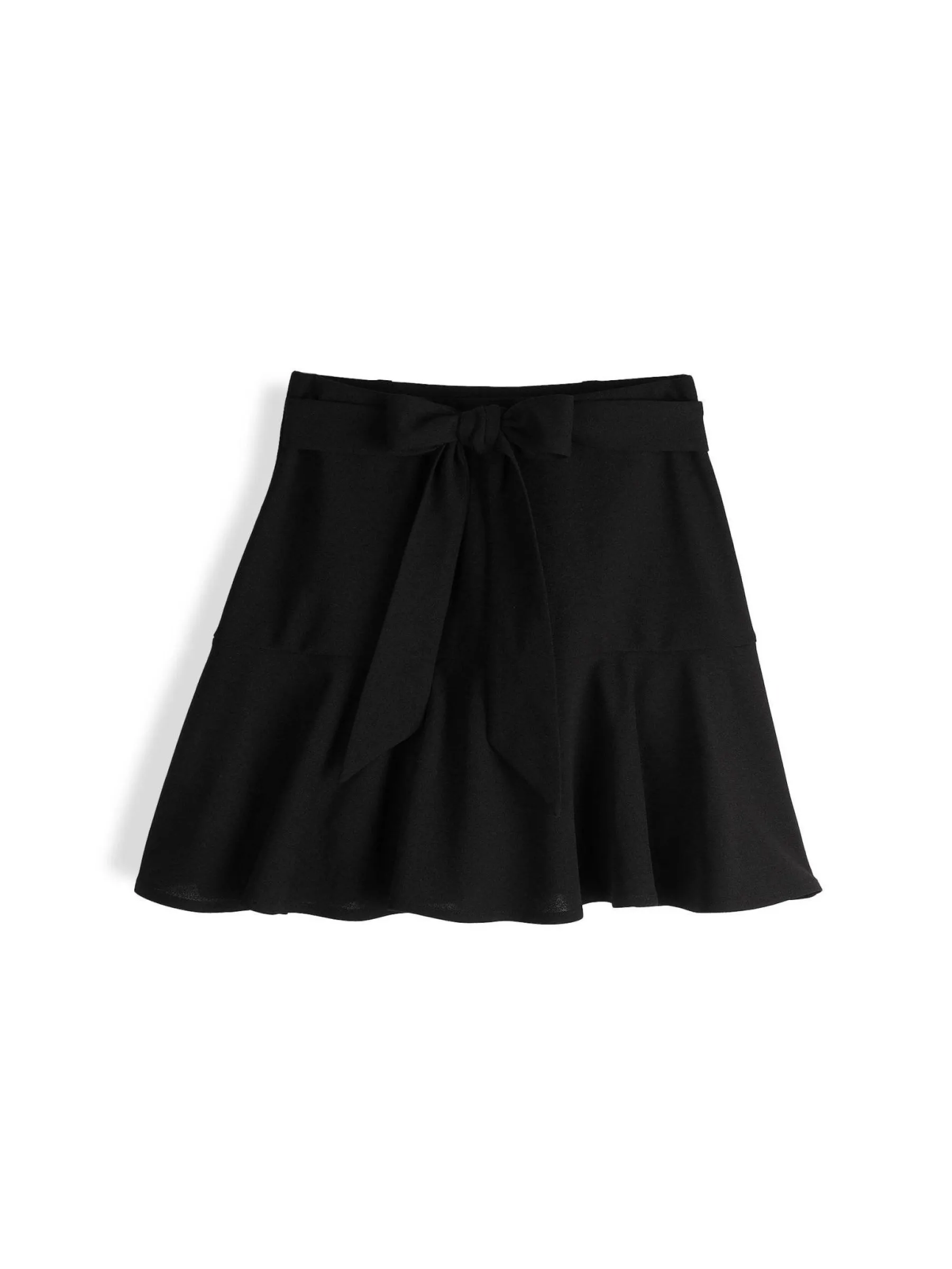 Kolor: czarnyKrój: asyTyp: spódnicaDługość: miniPattern style: pojedynczy kolorDetal: z kokardkąMateriał: syntety…