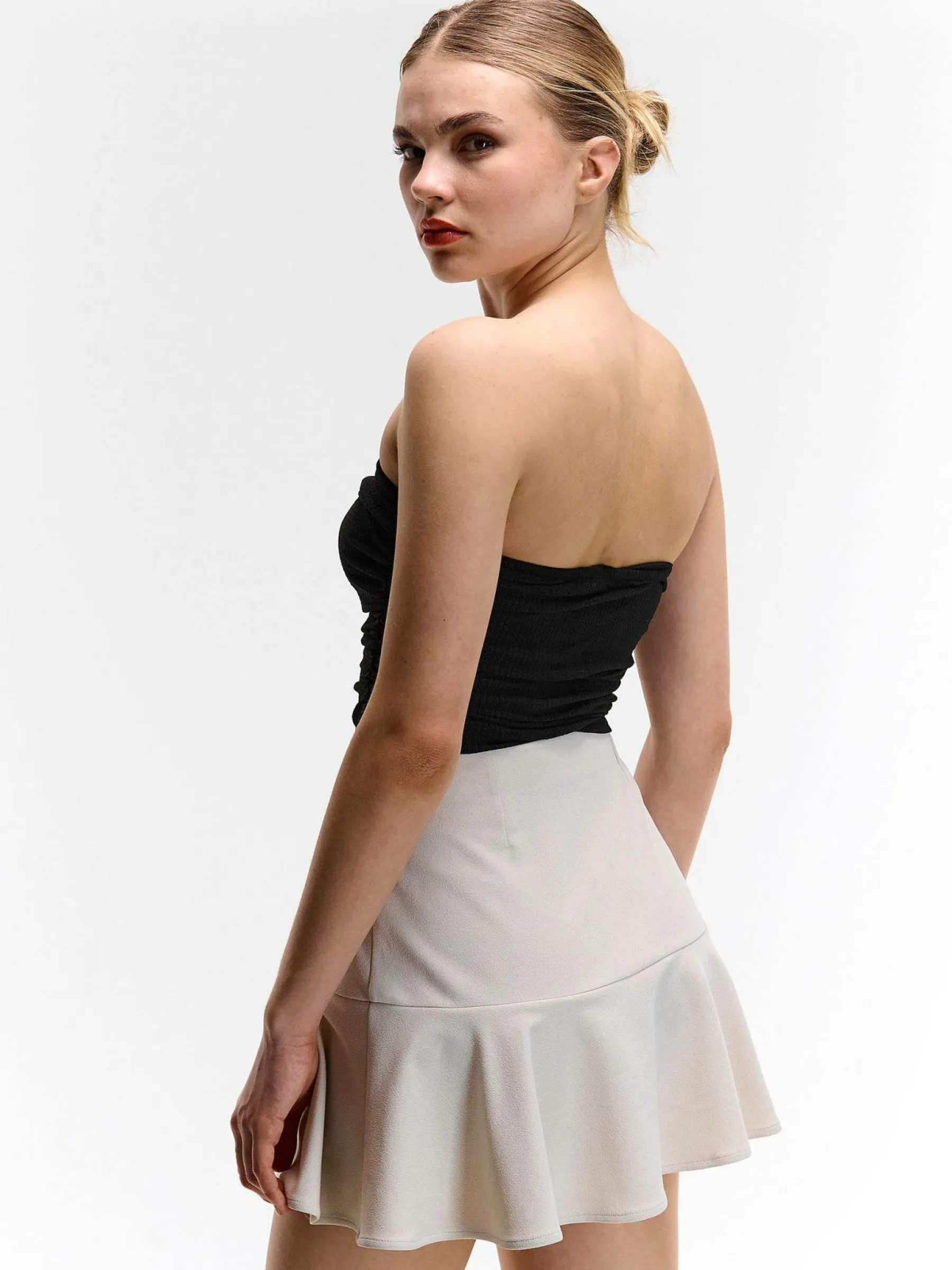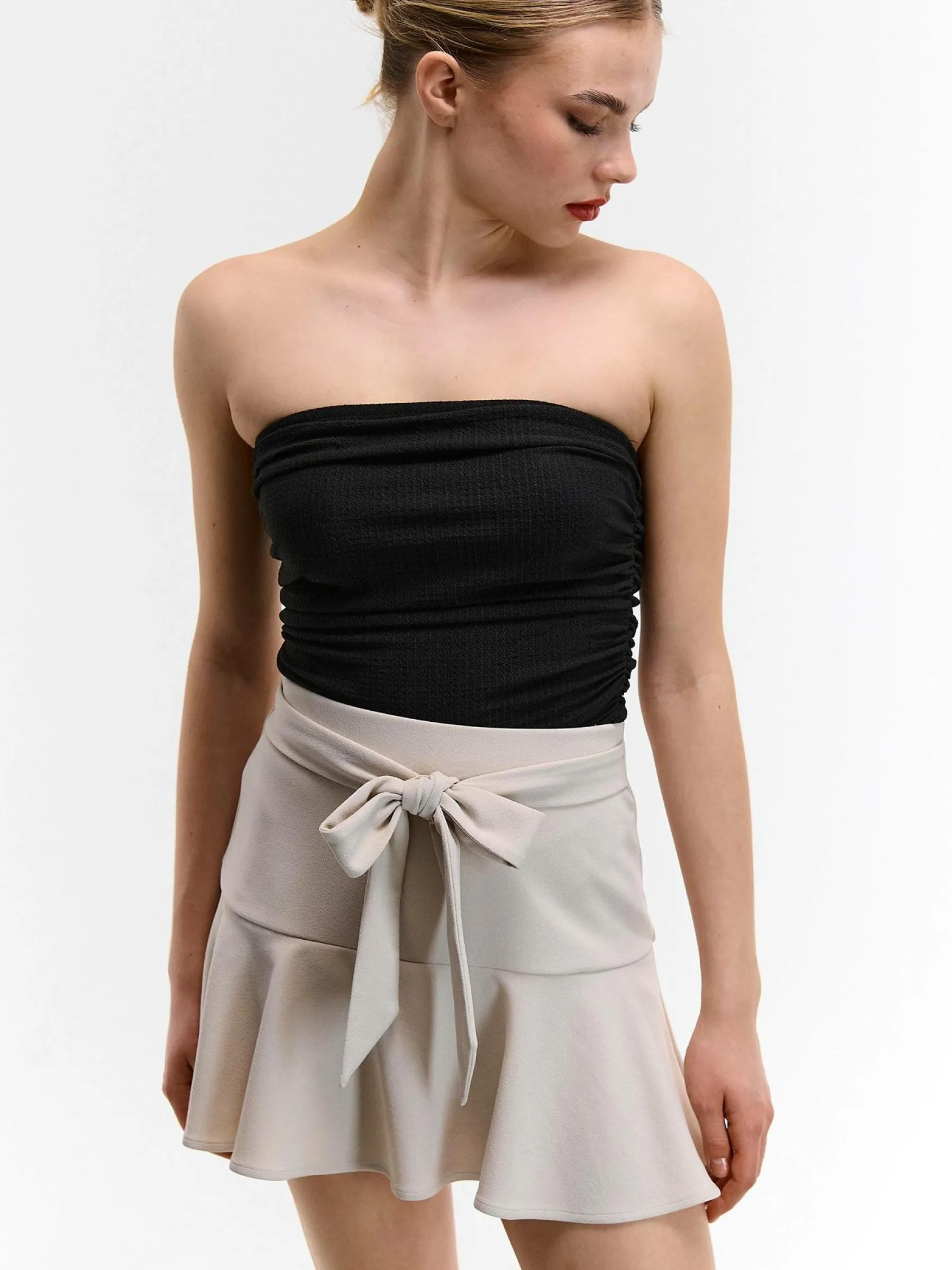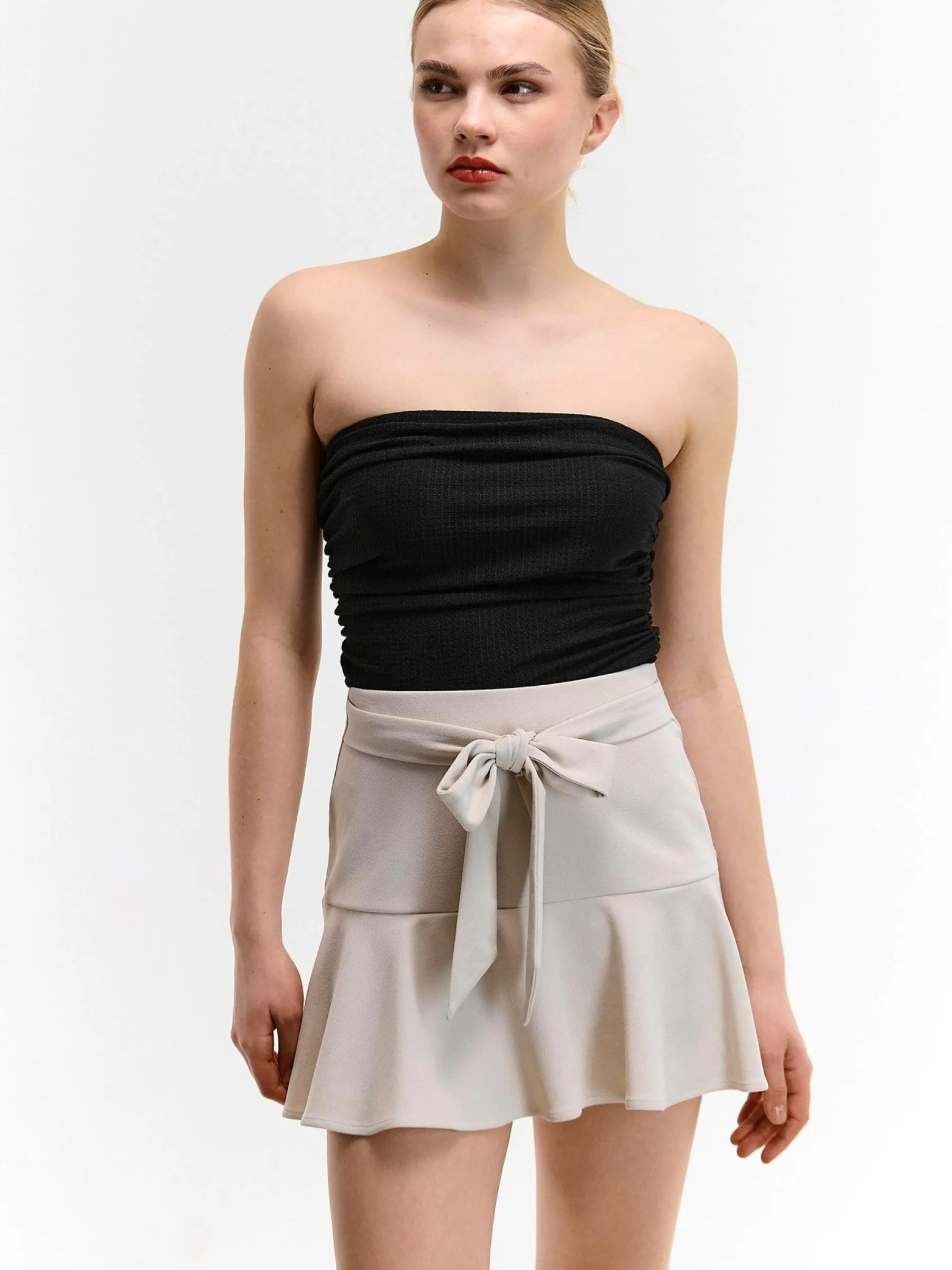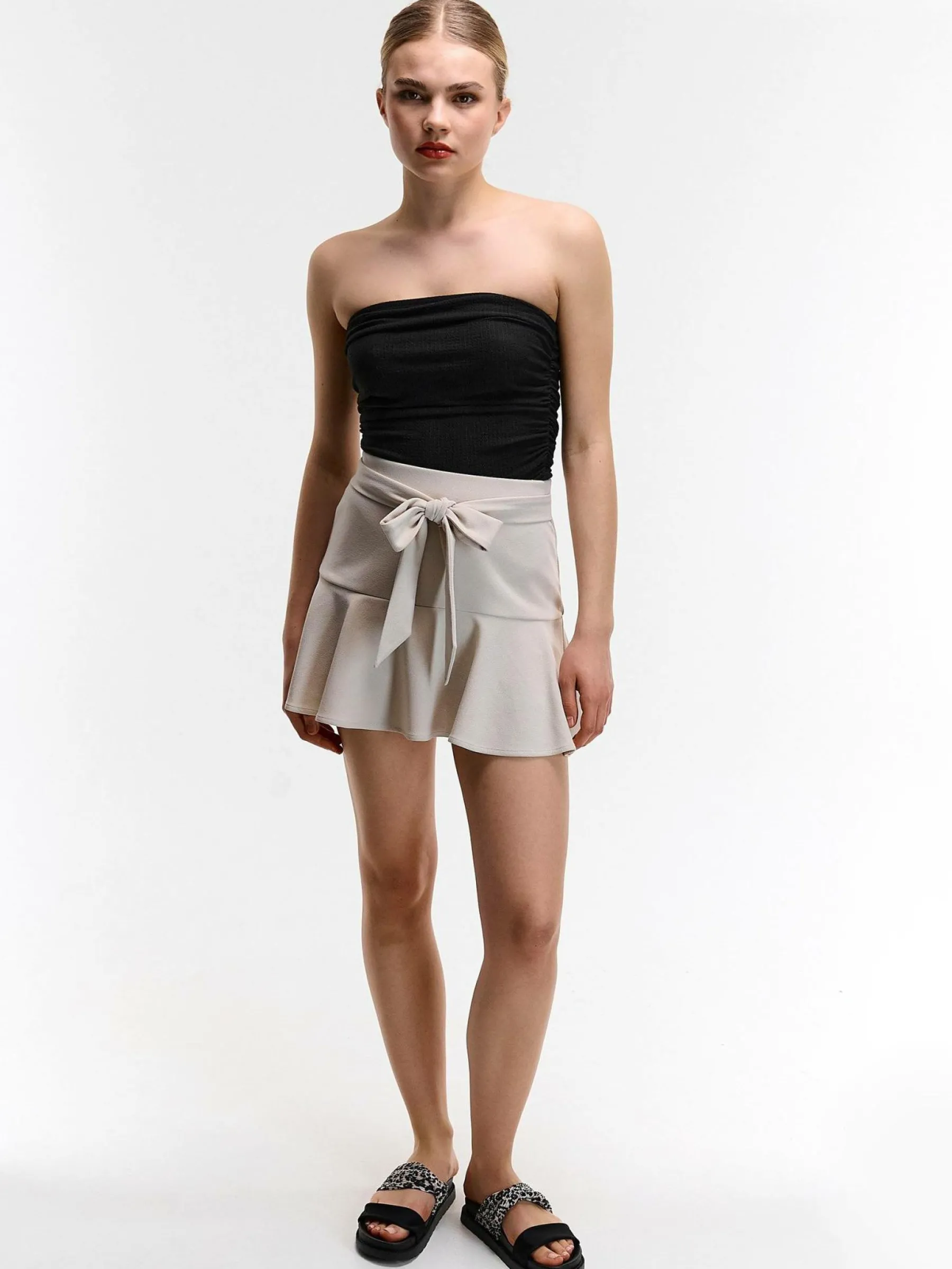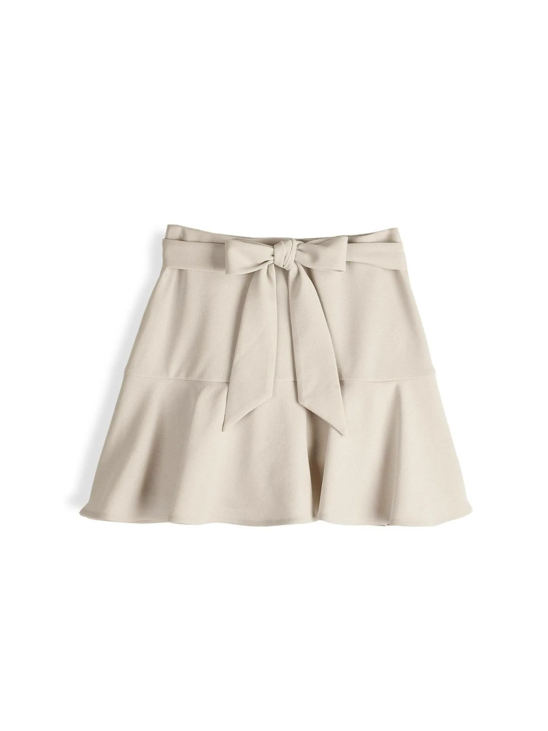 Kolor: beżowyKrój: asyTyp: spódnicaDługość: miniPattern style: pojedynczy kolorDetal: z kokardkąMateriał: syntet…