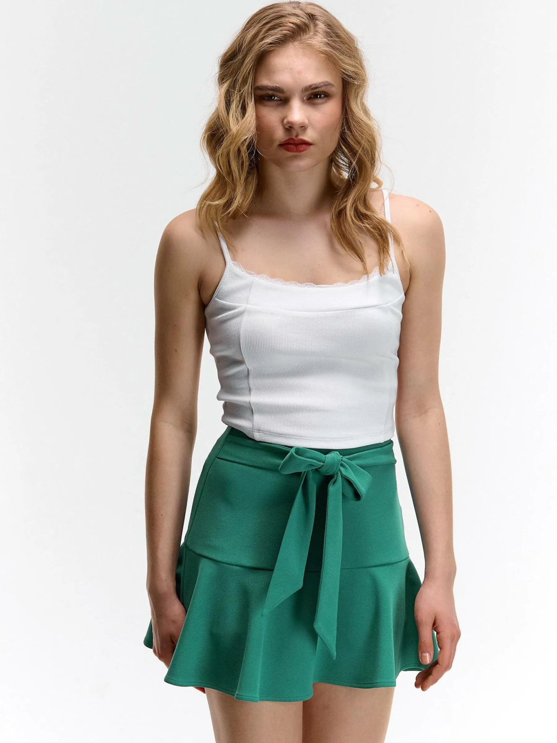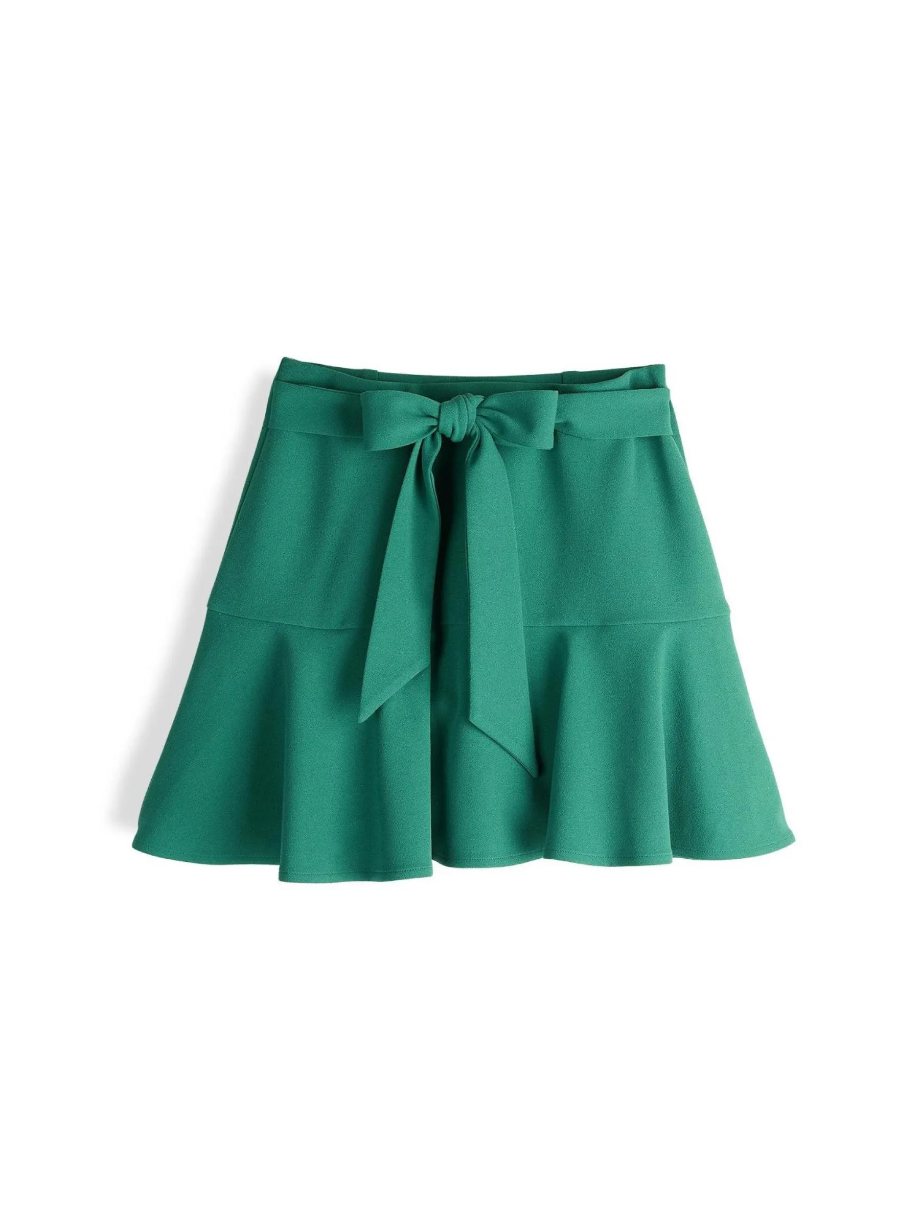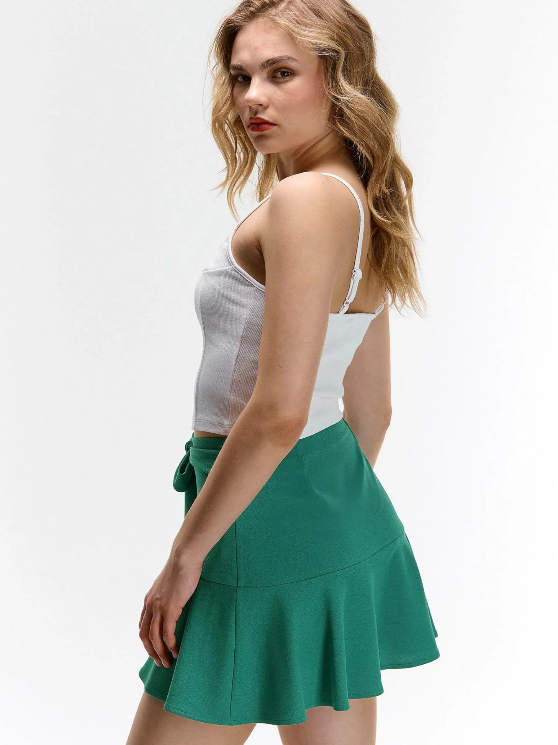 Kolor: zielonyKrój: asyTyp: spódnicaDługość: miniPattern style: pojedynczy kolorDetal: z kokardkąMateriał: syntet…