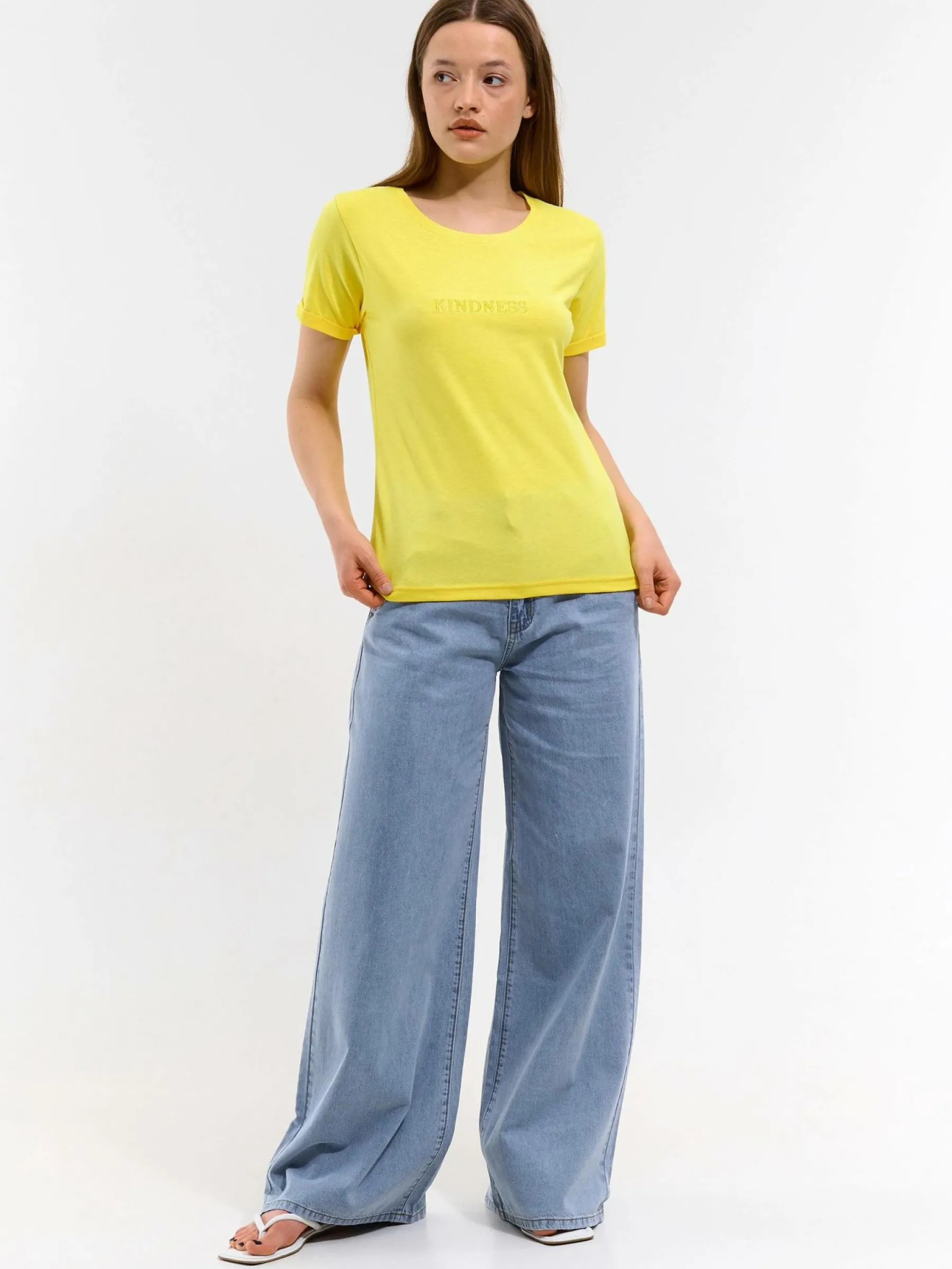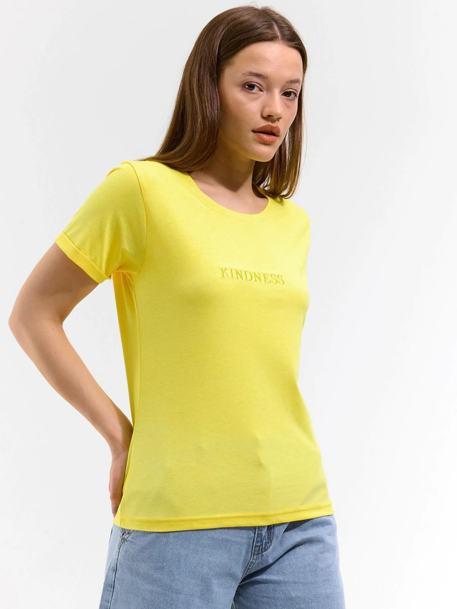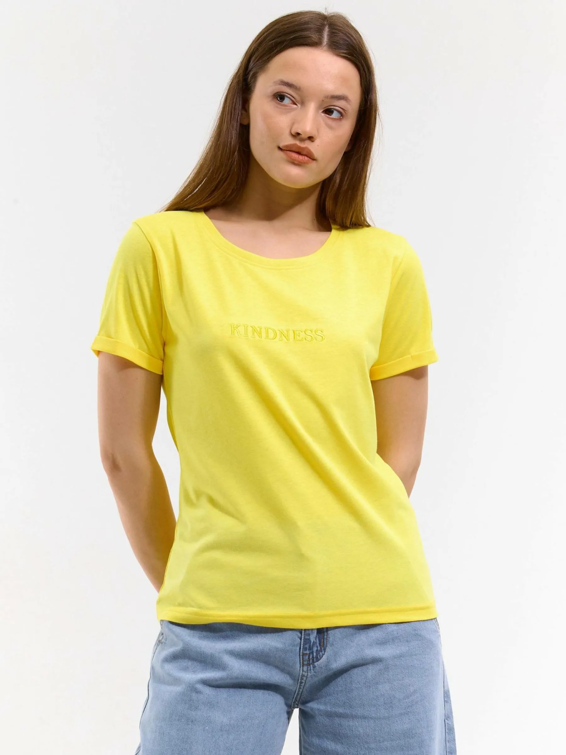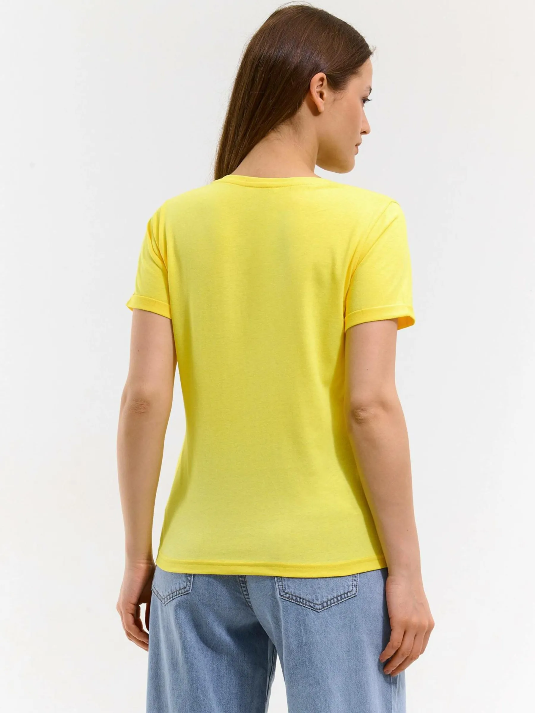 Kolor: żółtyKrój: podstawowyTyp: koszulkaRekaw: krótki rękawDługość: krótkiPattern style: pojedynczy kolorDeta…