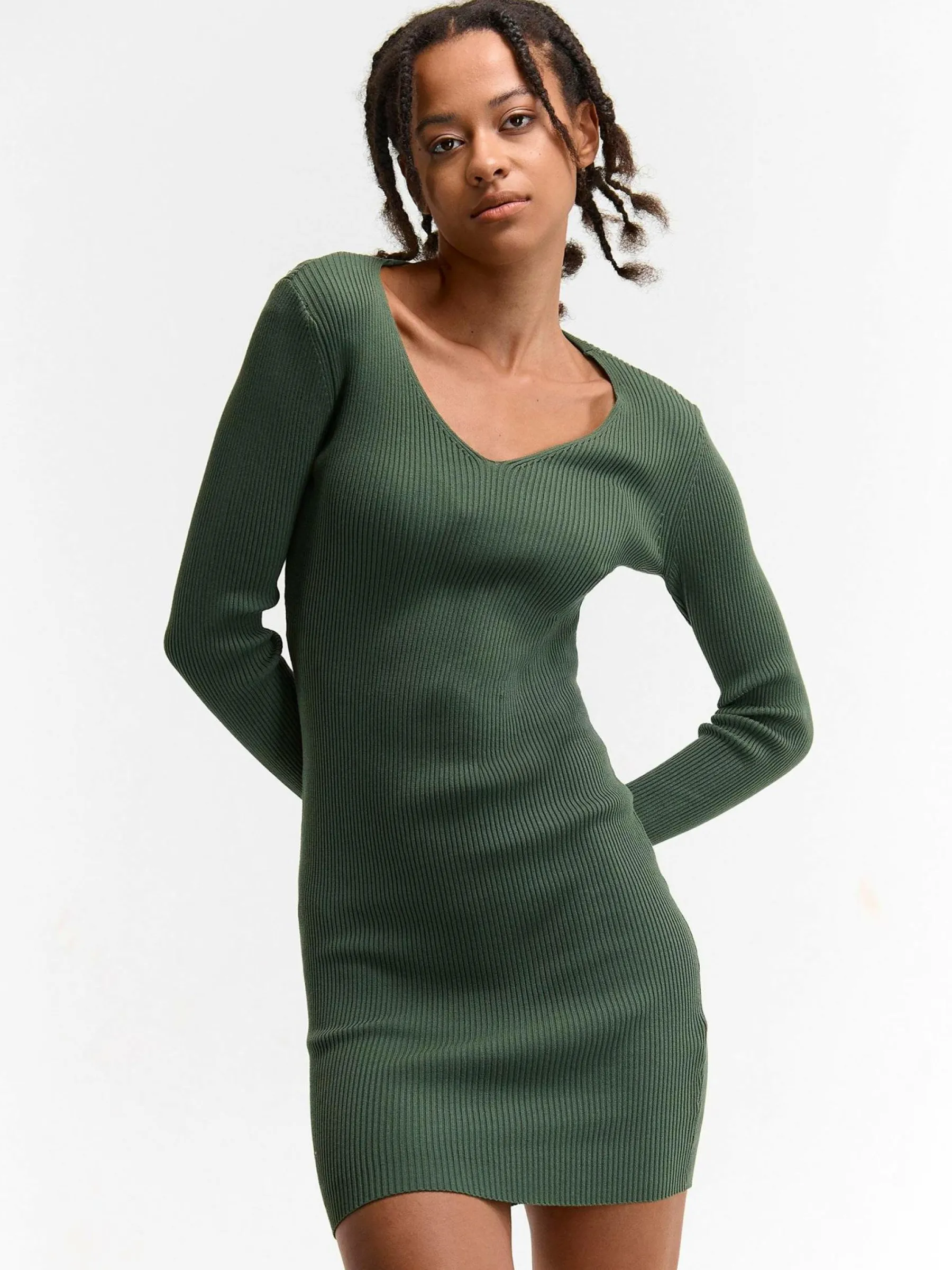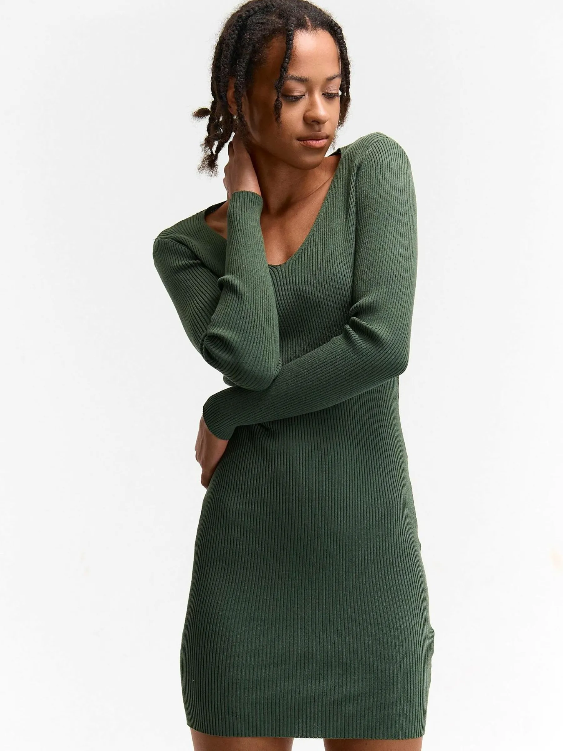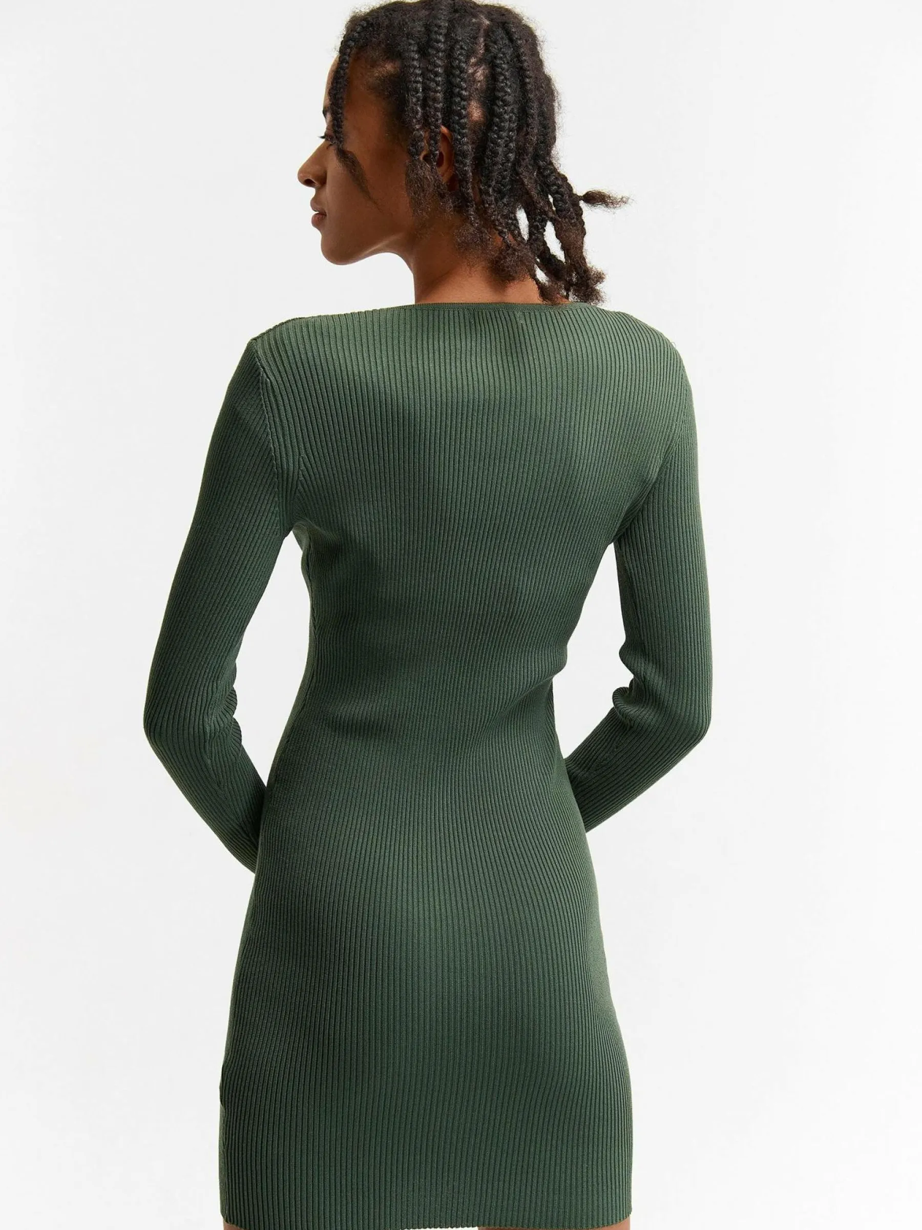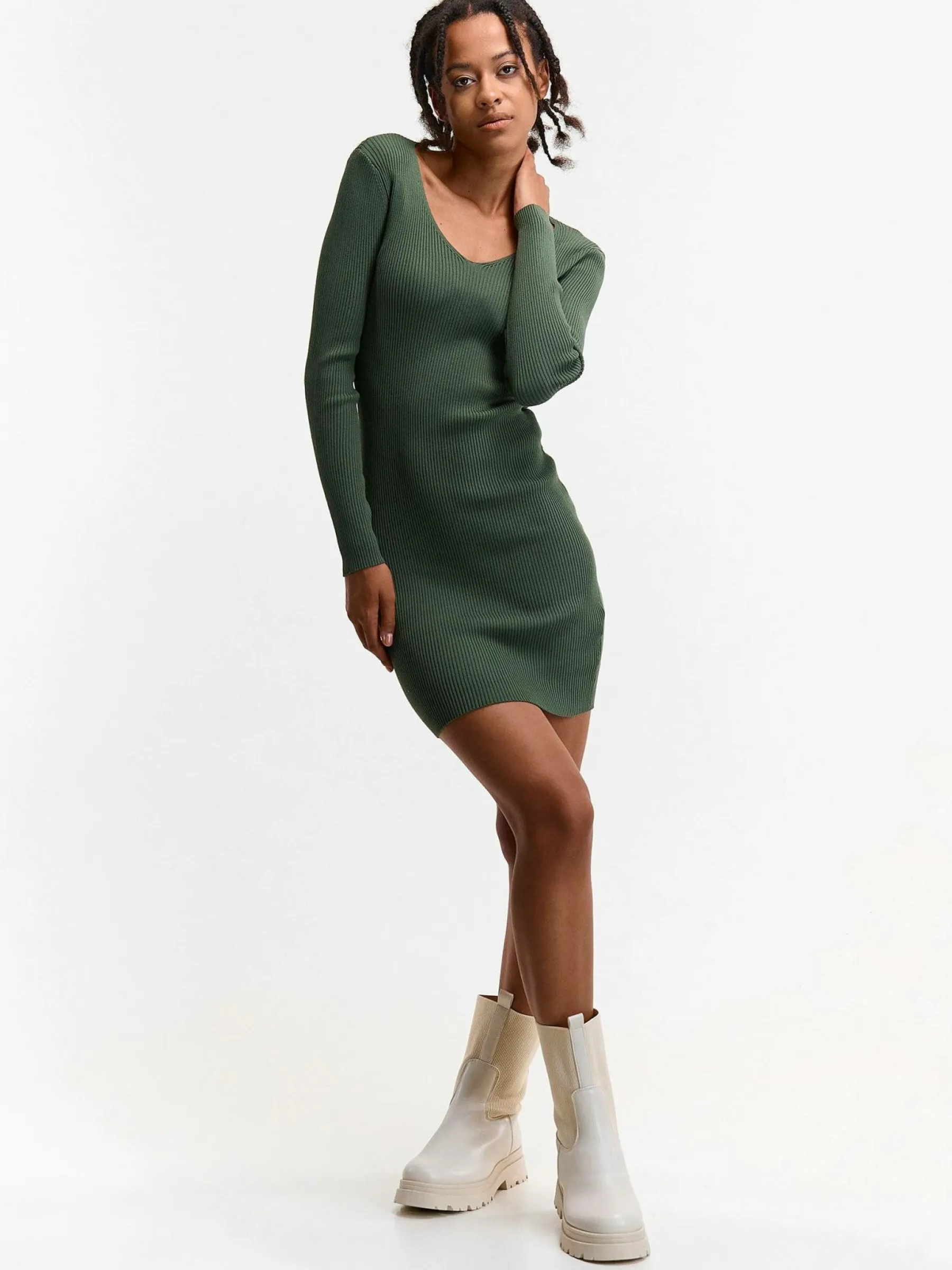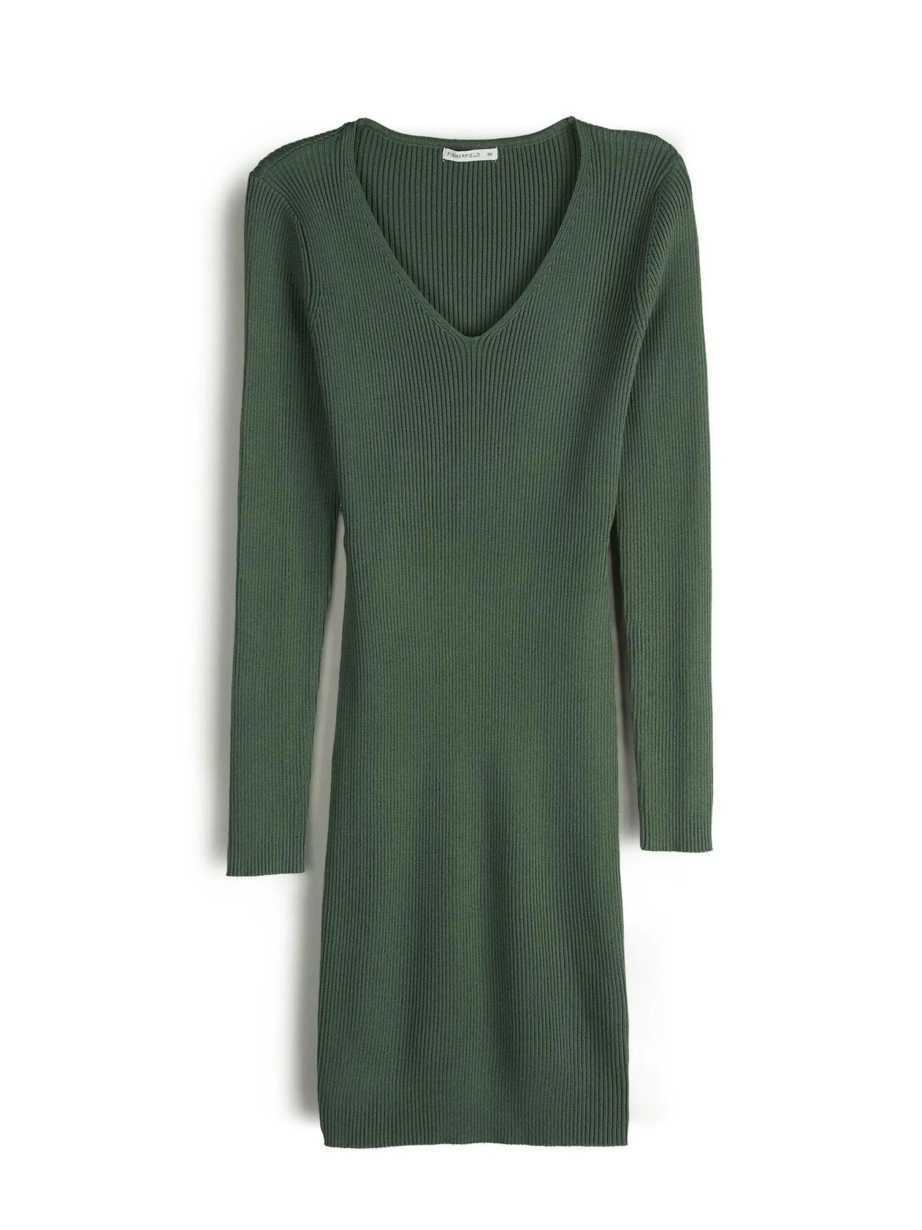 Kolor: khakiKrój: regularTyp: sukienkaRekaw: długi rękawDługość: miniPattern style: pojedynczy kolor, żebrowanyDe…