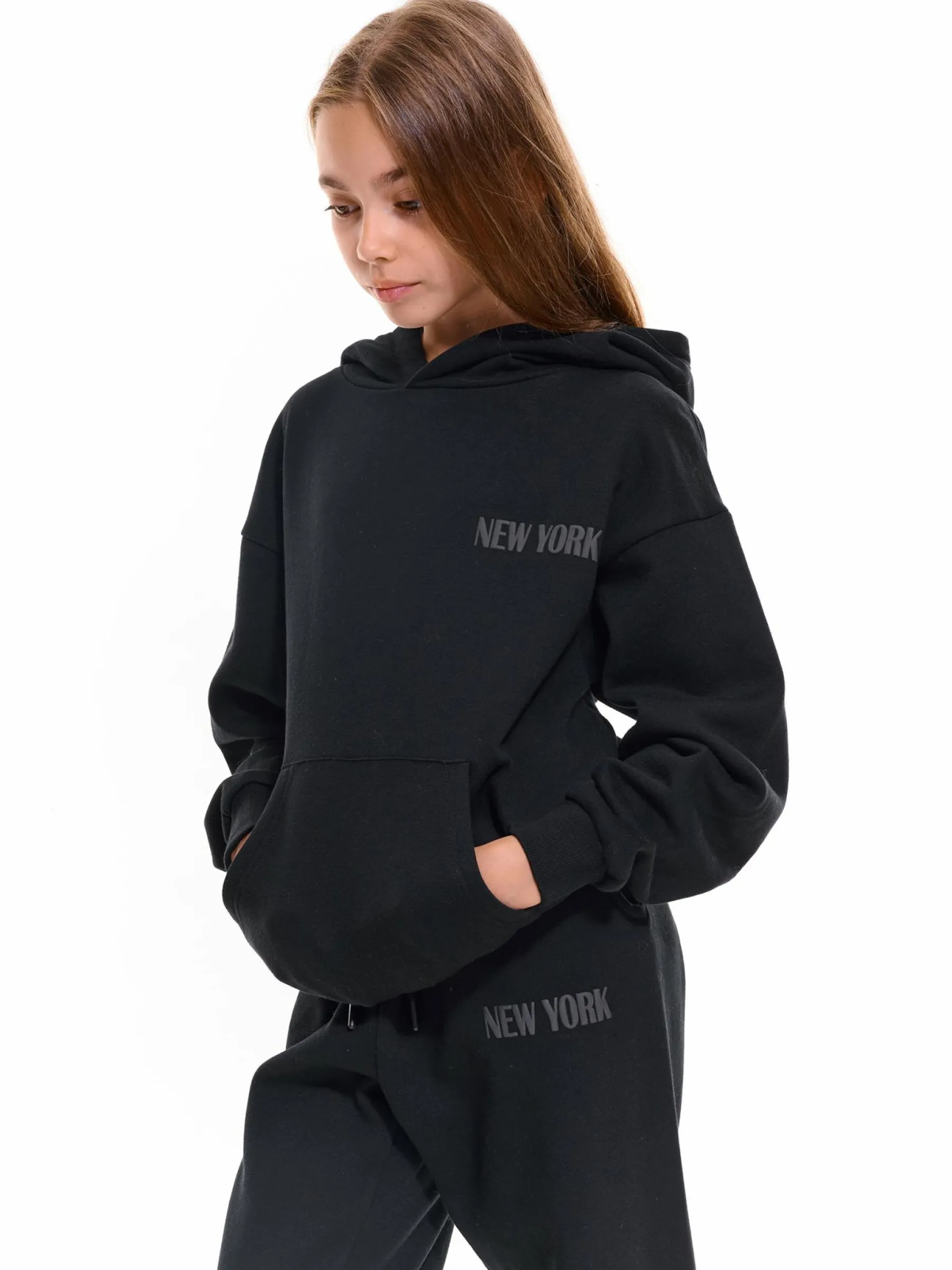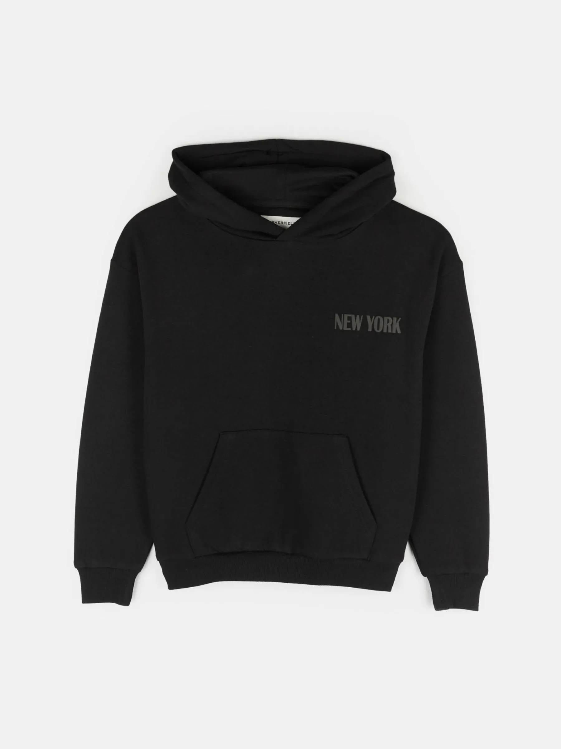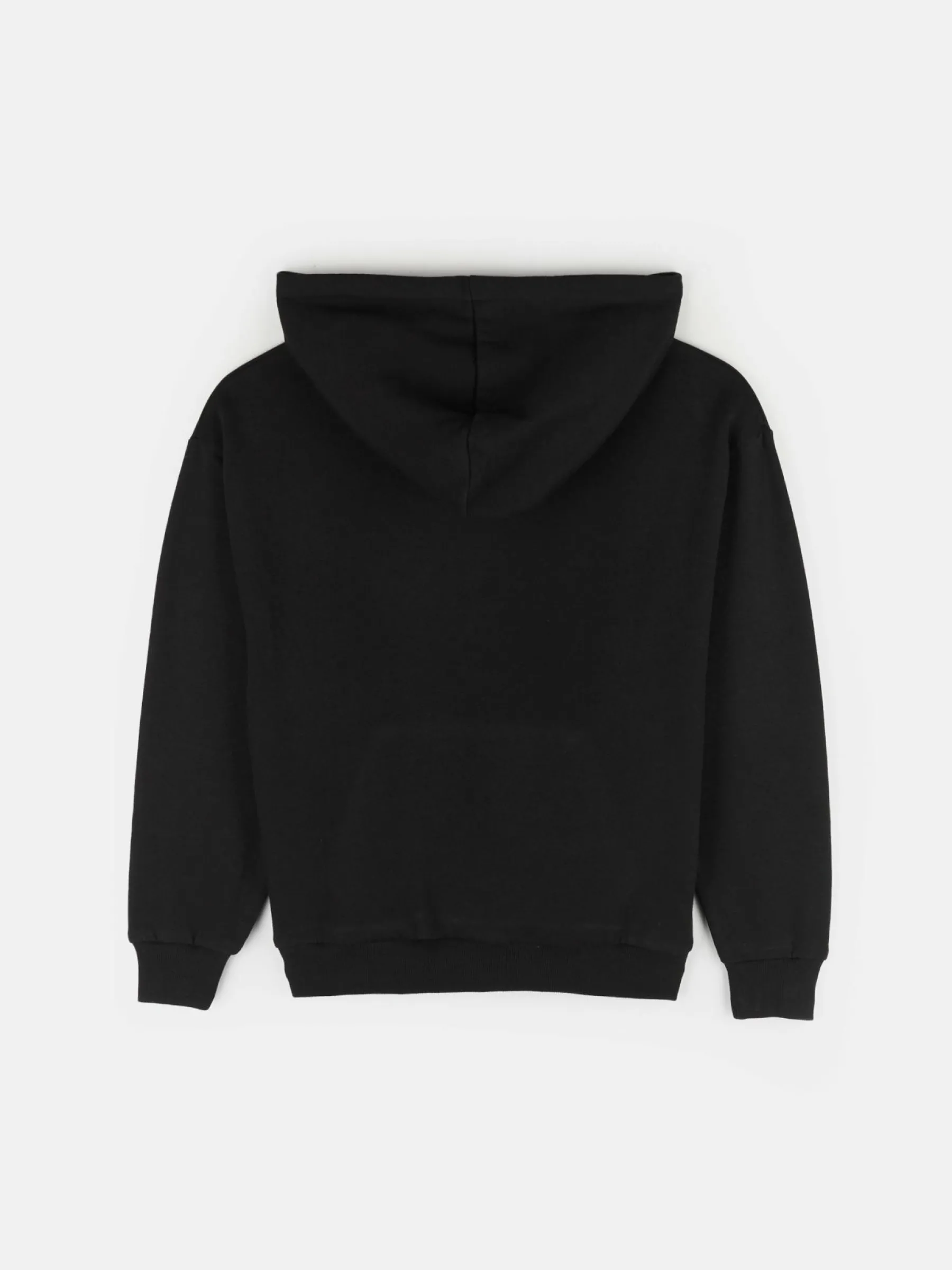 Kolor: czarnyKrój: oversizedTyp: bluzaRekaw: długi rękawDługość: krótkiPattern style: z napisemDetal: bluza z kap…