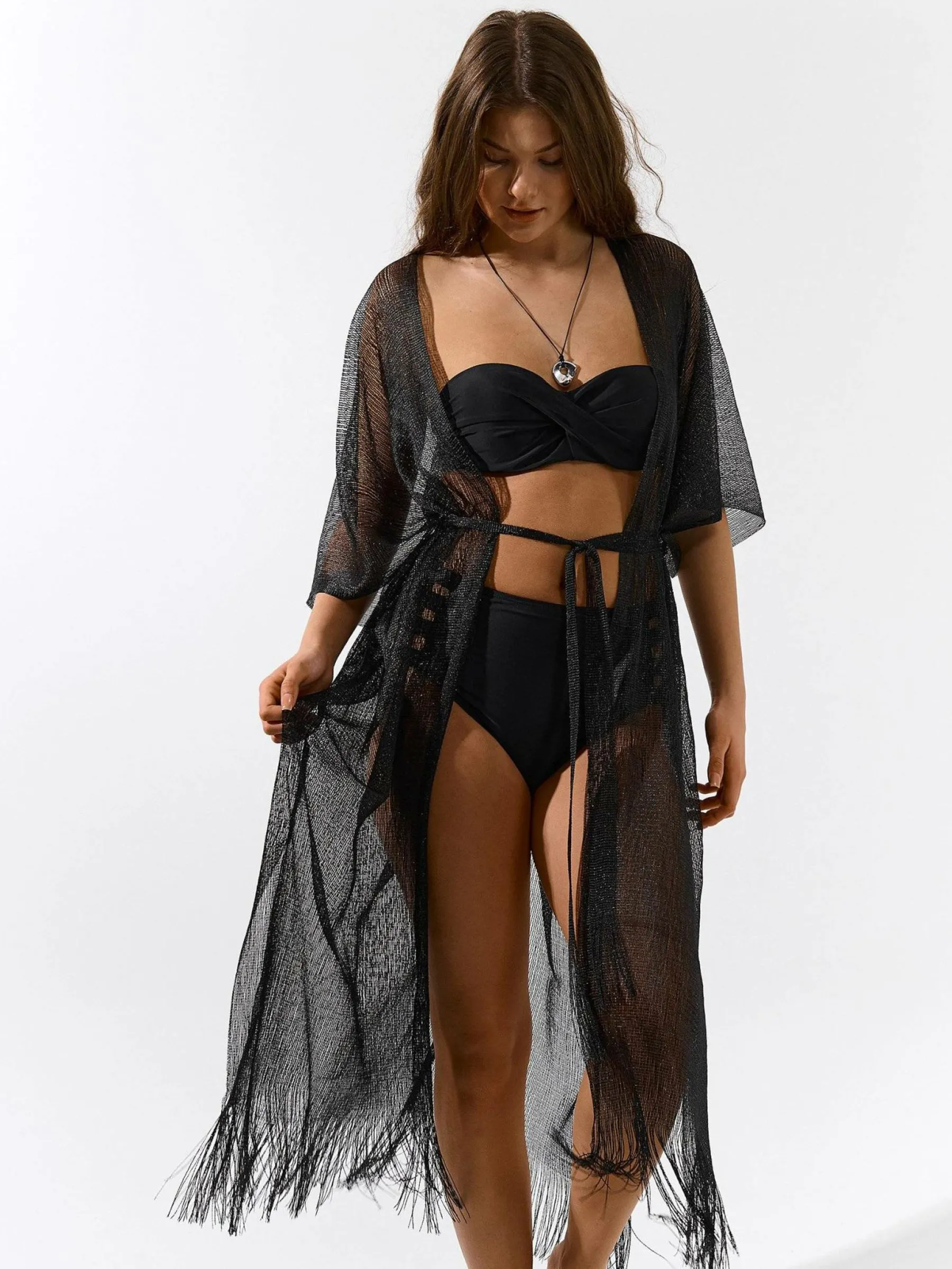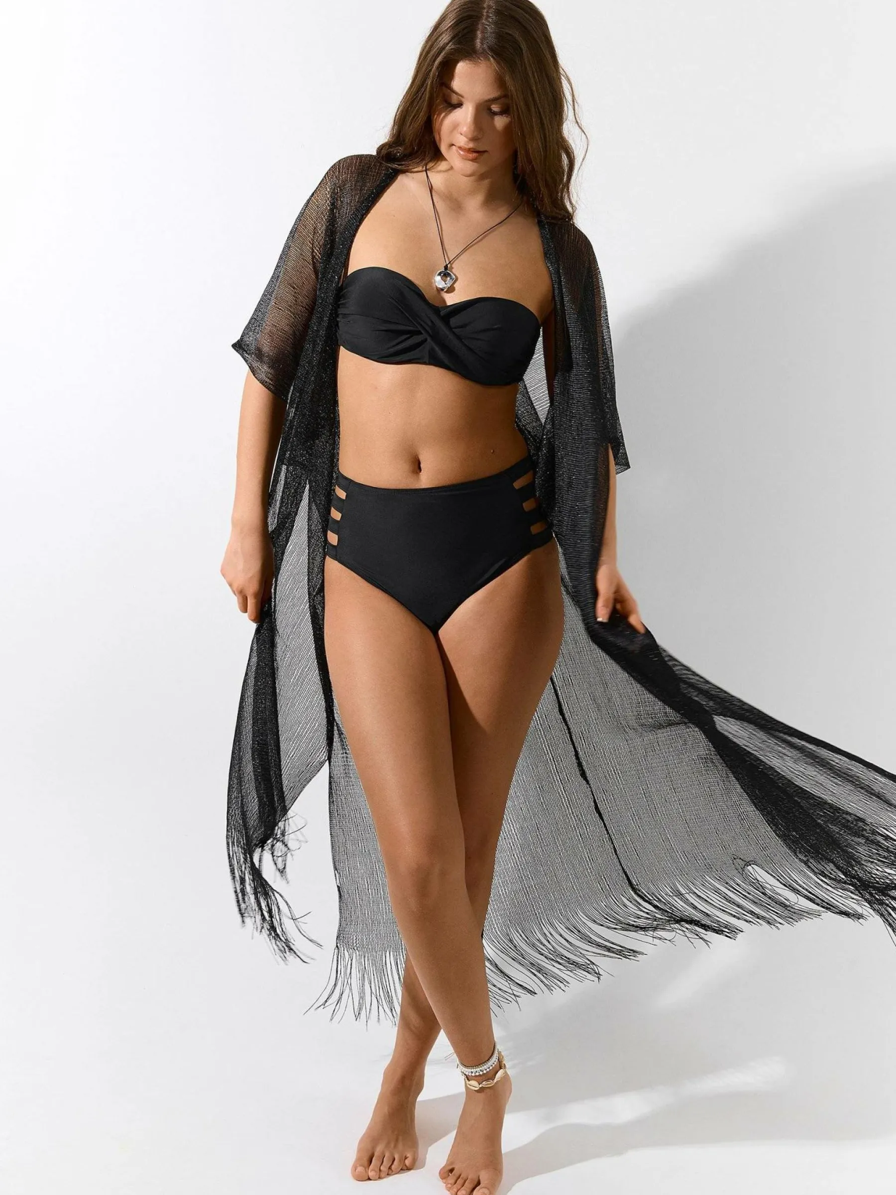 Kolor: czarnyKrój: asymetryczneTyp: szal, ponchoRekaw: rękaw 3/4Długość: dlugiePattern style: pojedynczy kolorDetal…