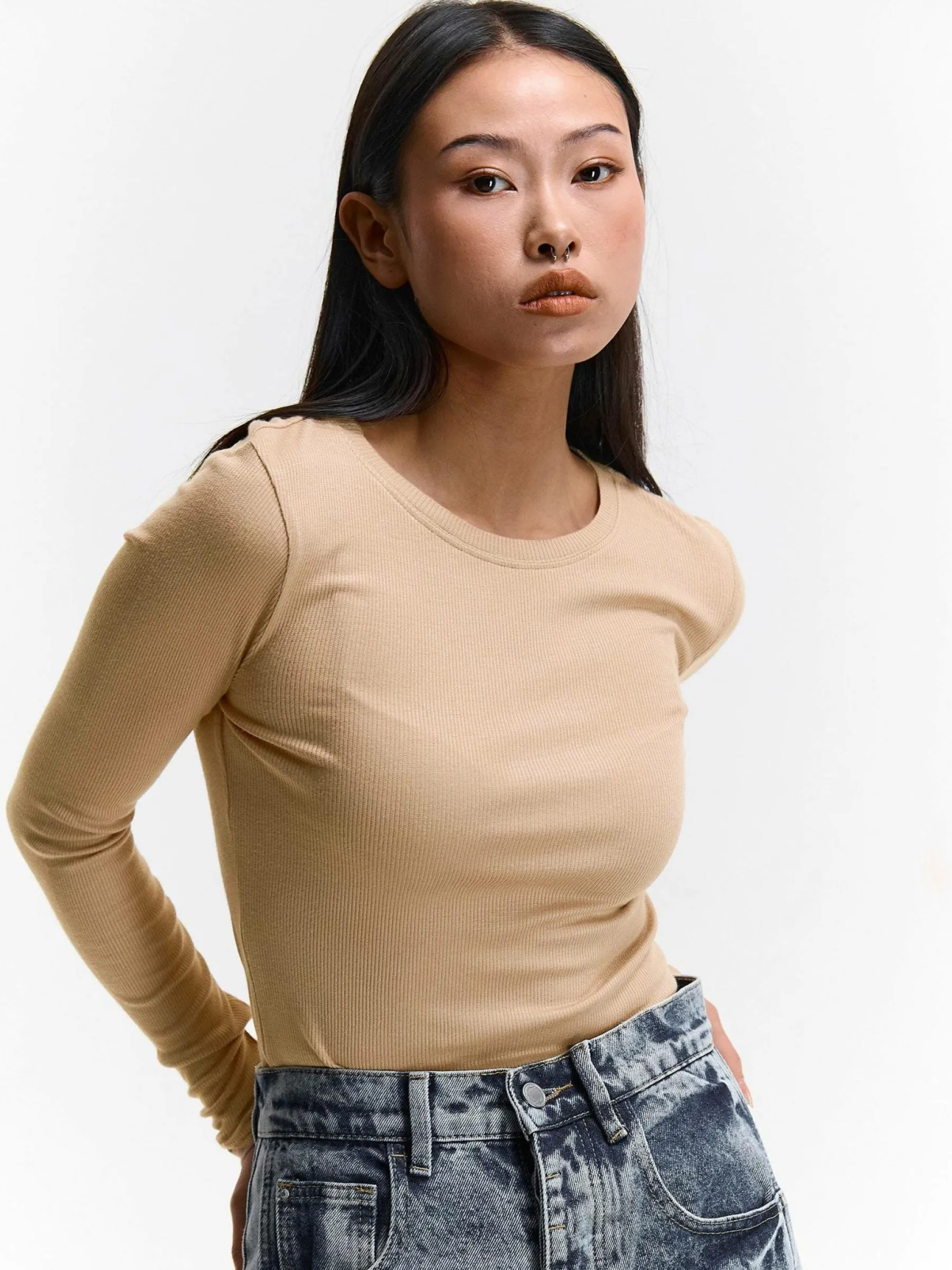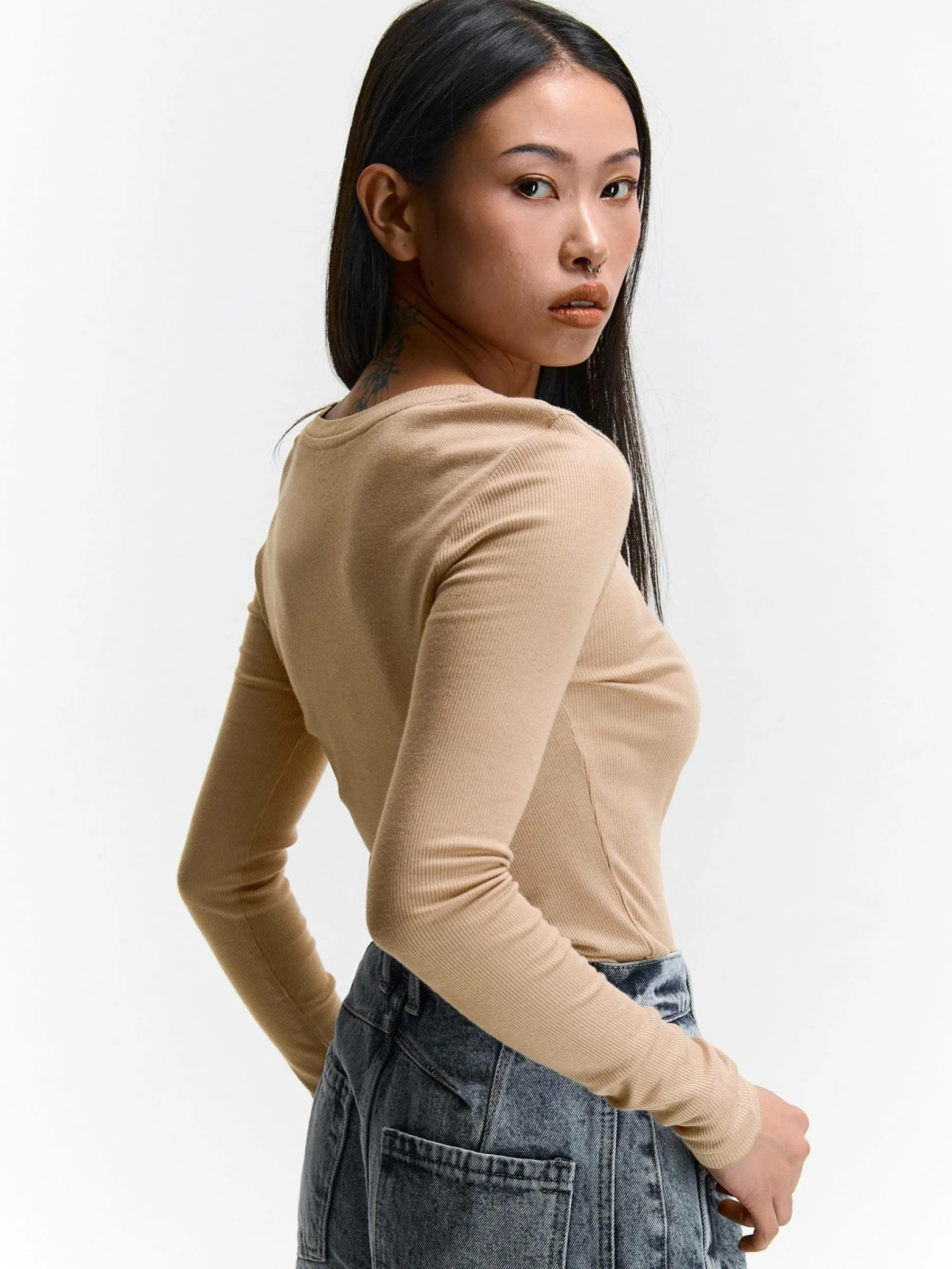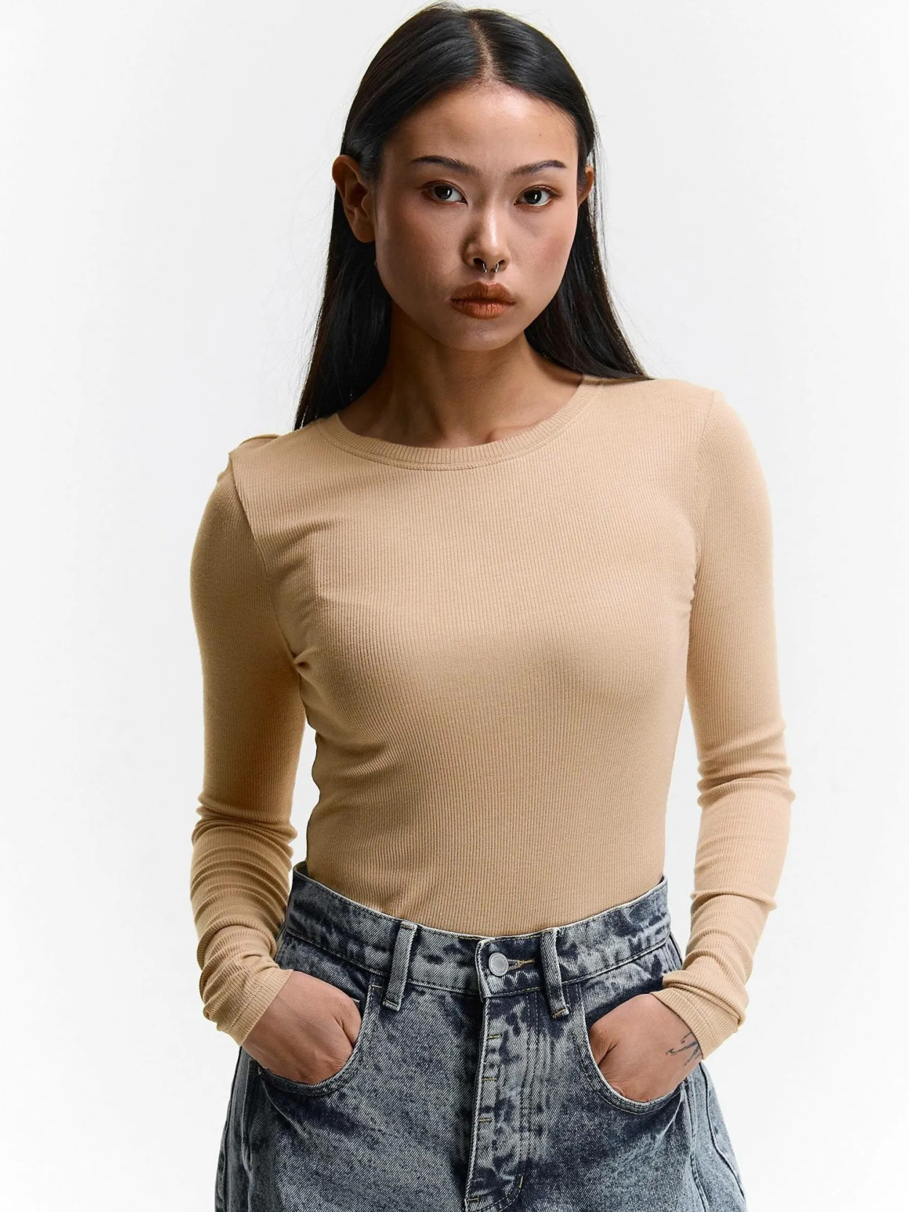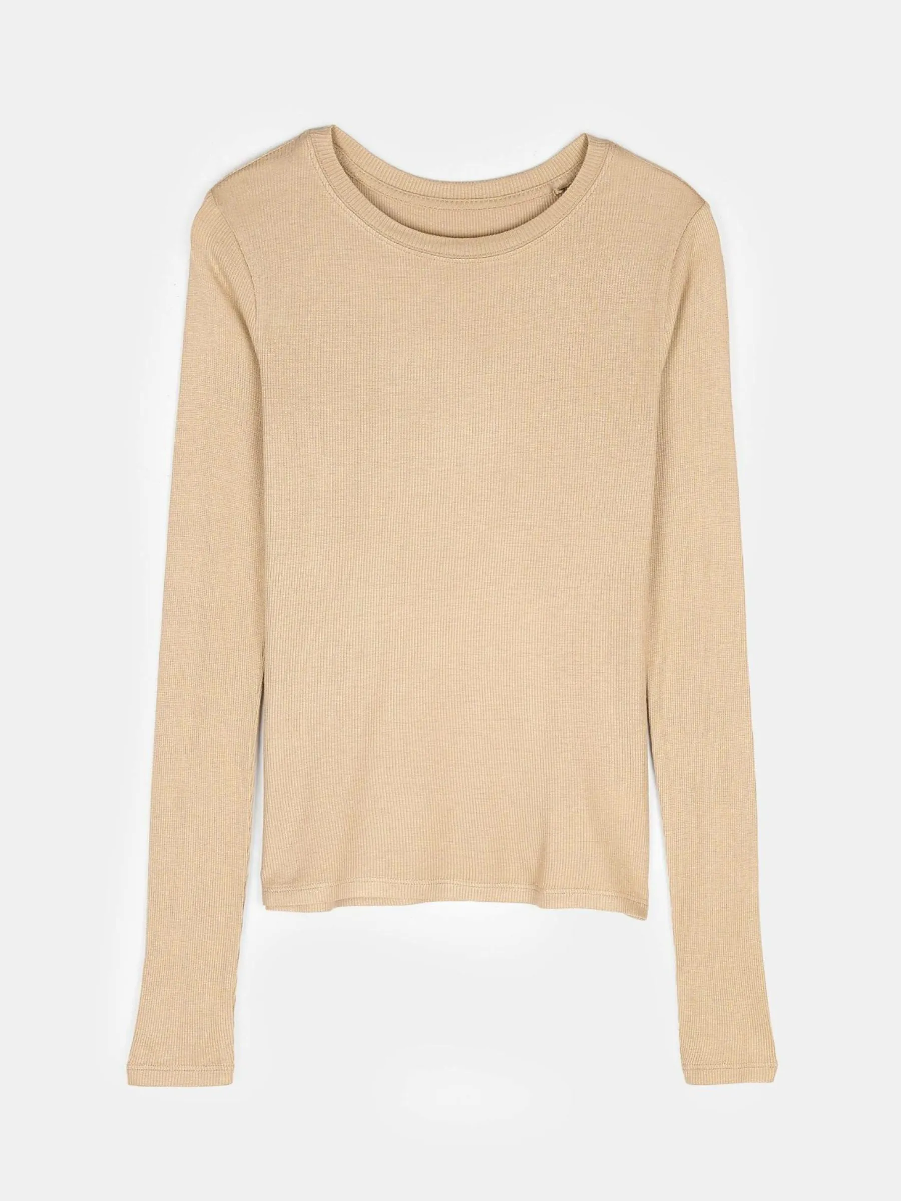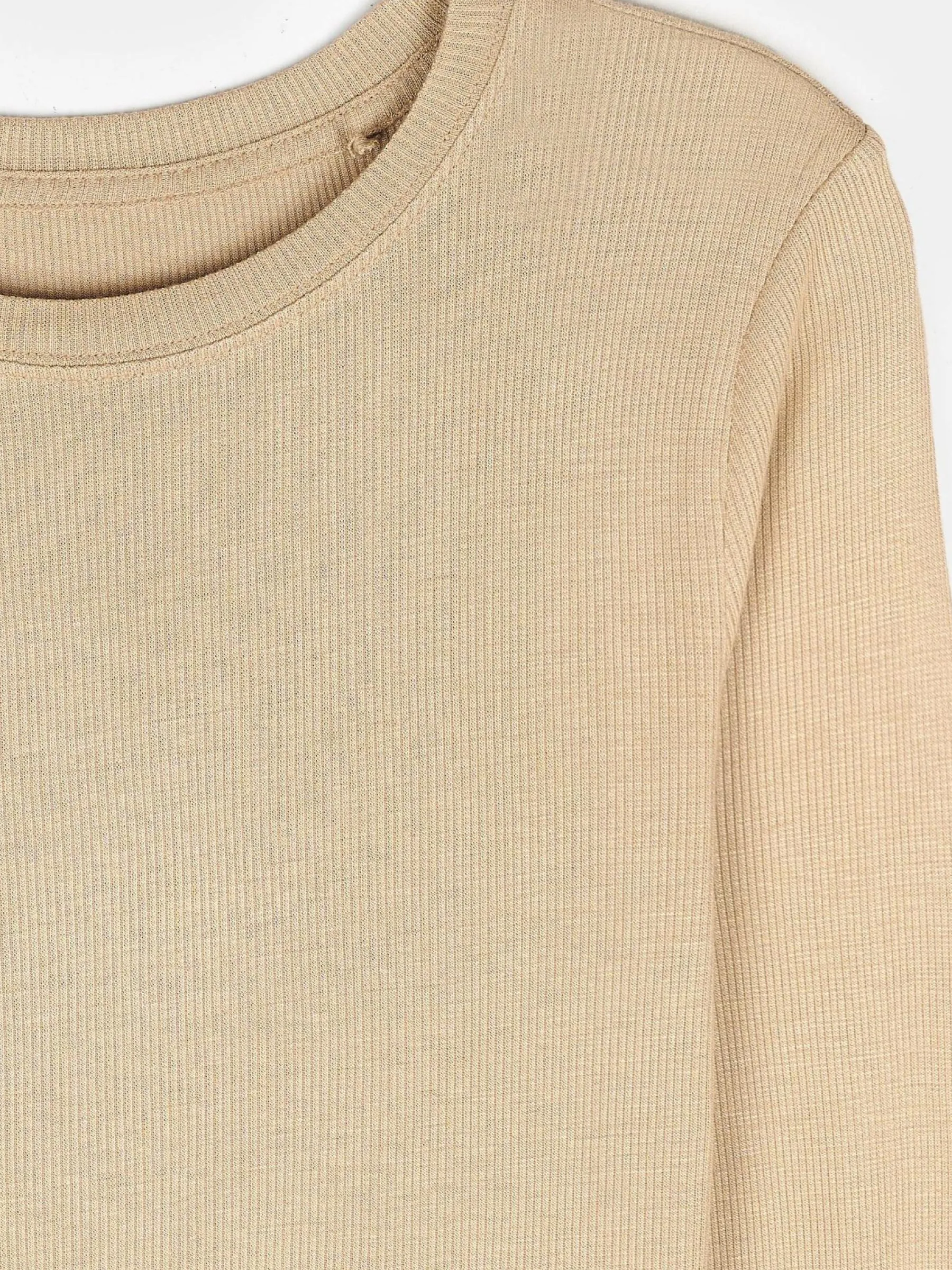 Kolor: beżowyKrój: regularTyp: koszulkaRekaw: długi rękawDługość: krótkiPattern style: pojedynczy kolor, żebrow…