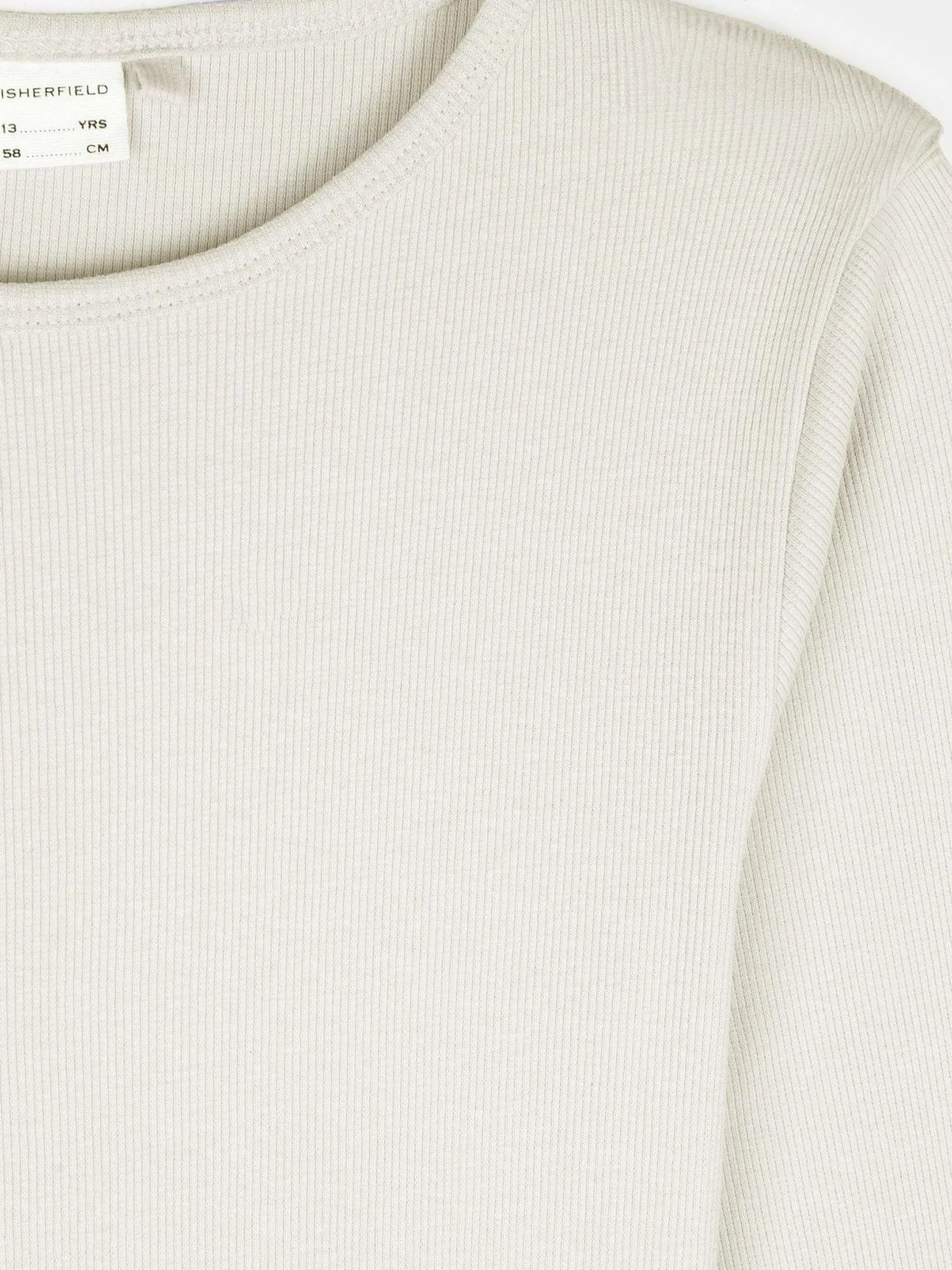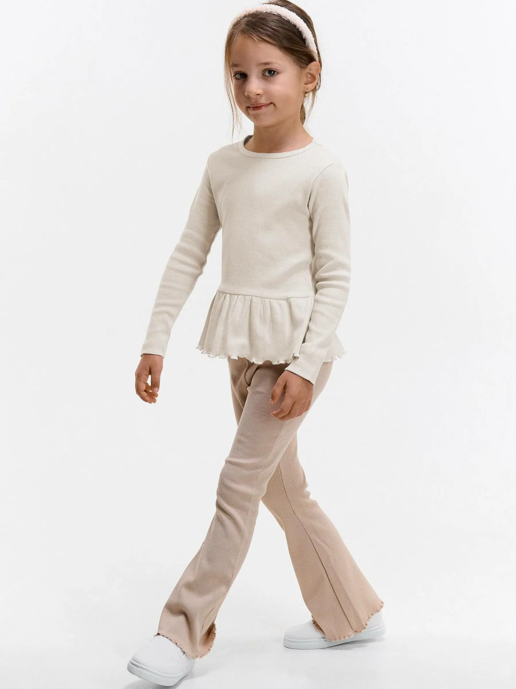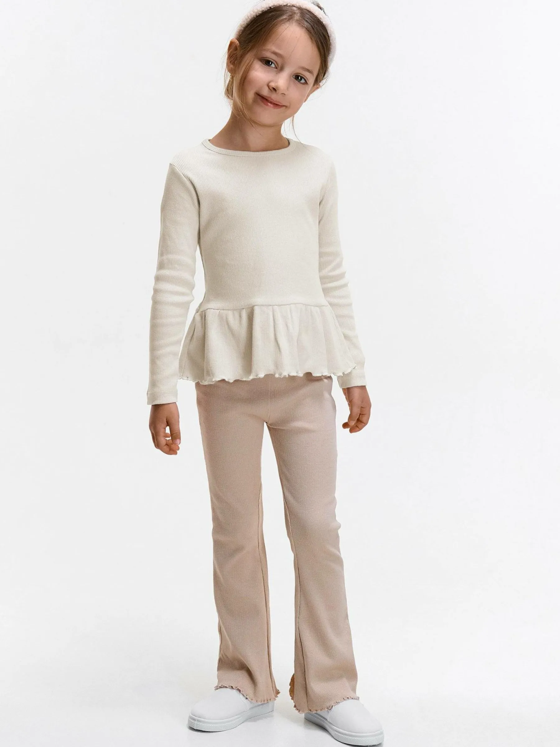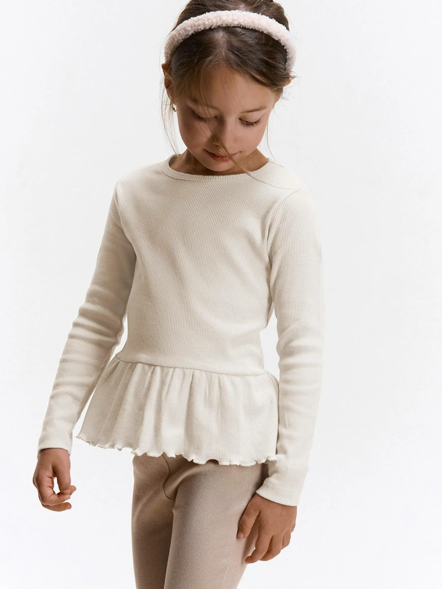 Kolor: beżowyKrój: z falbanąTyp: koszulkaRekaw: długi rękawDługość: krótkiPattern style: pojedynczy kolor, żeb…