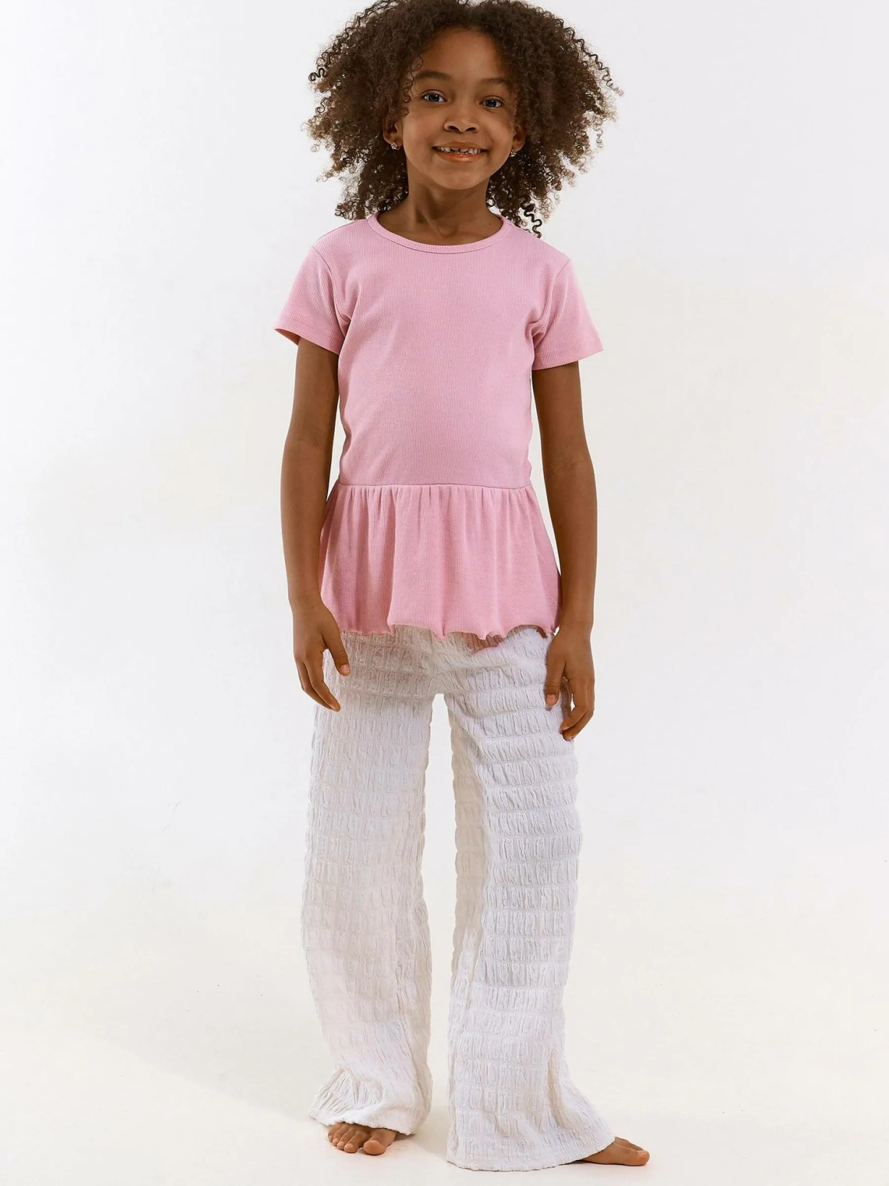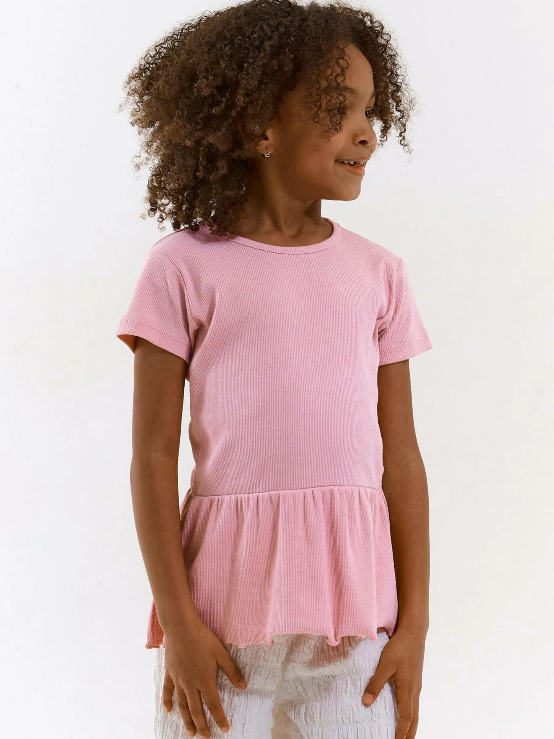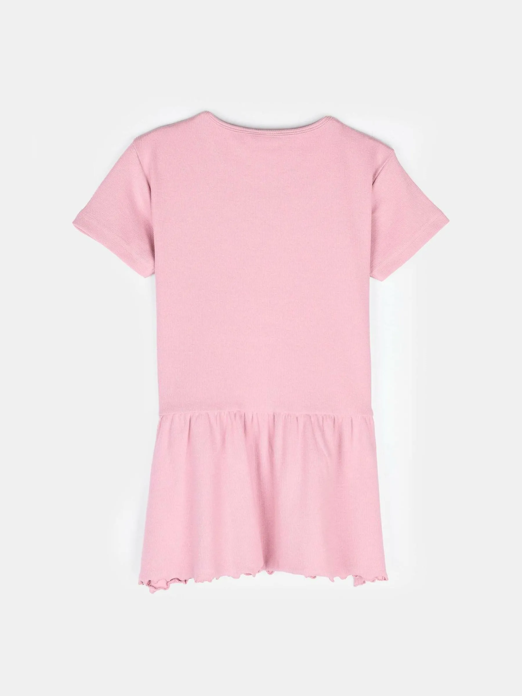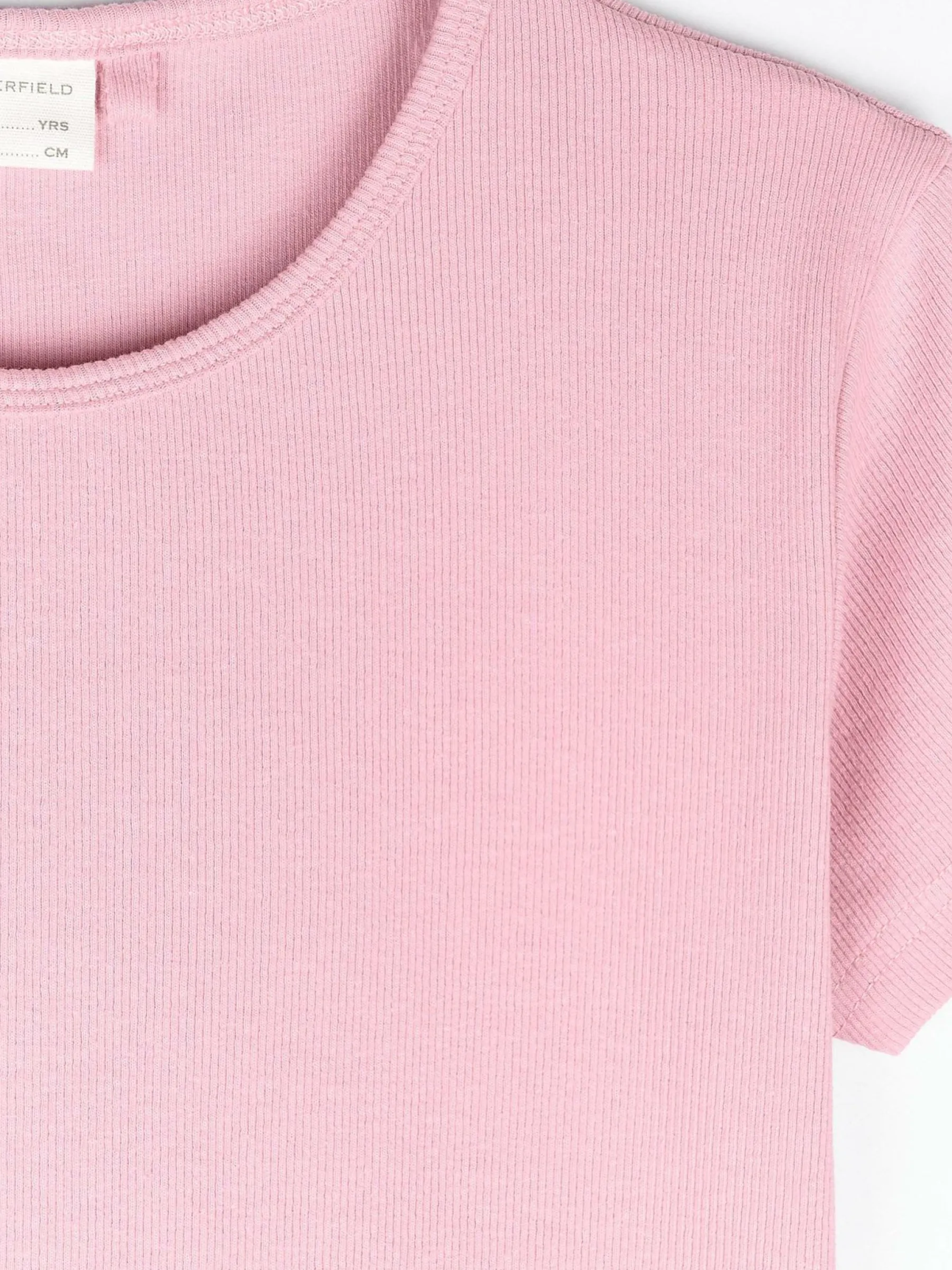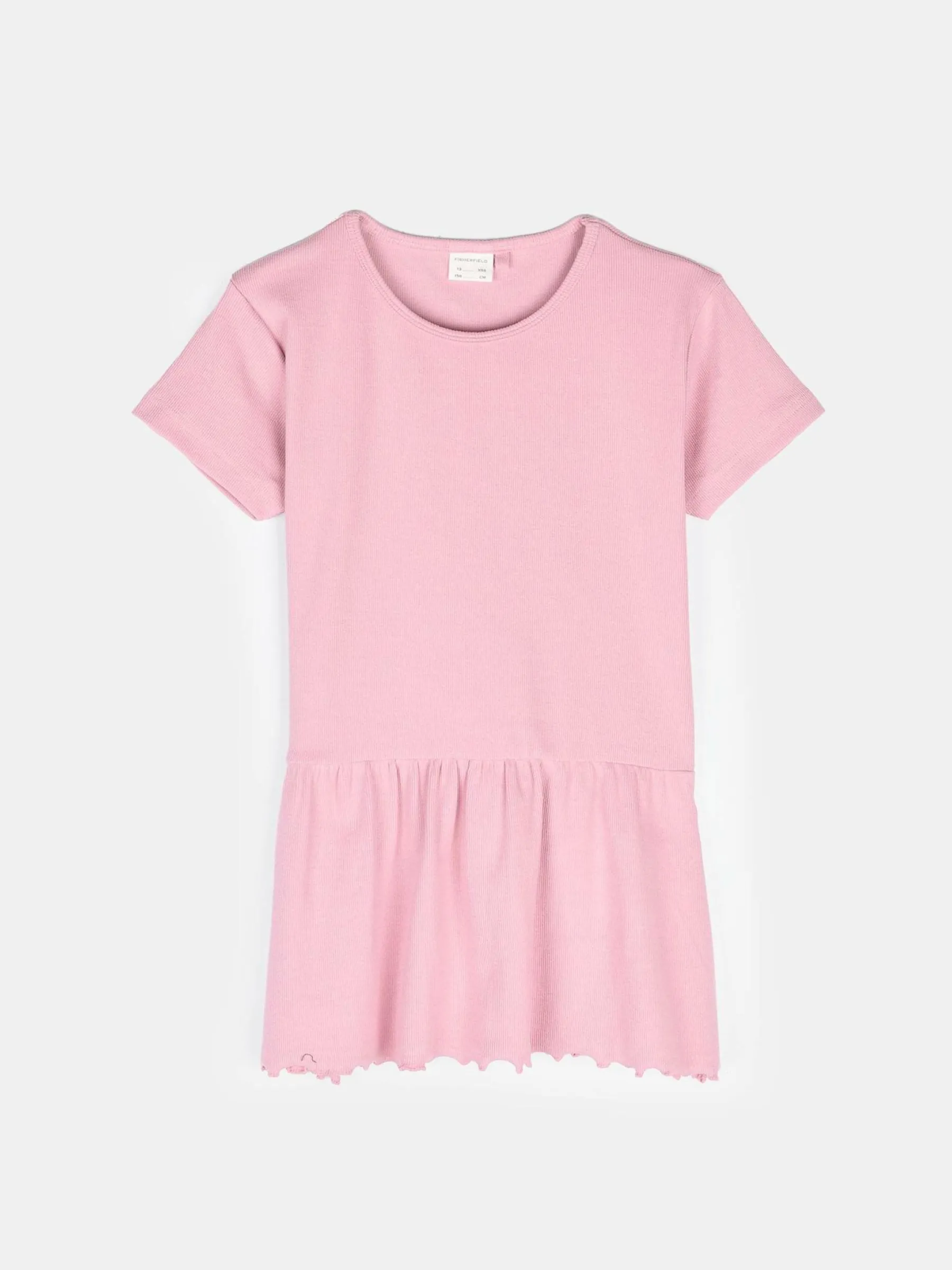 Kolor: różowyKrój: z falbanąTyp: koszulkaRekaw: krótki rękawDługość: krótkiPattern style: pojedynczy kolor, ż…