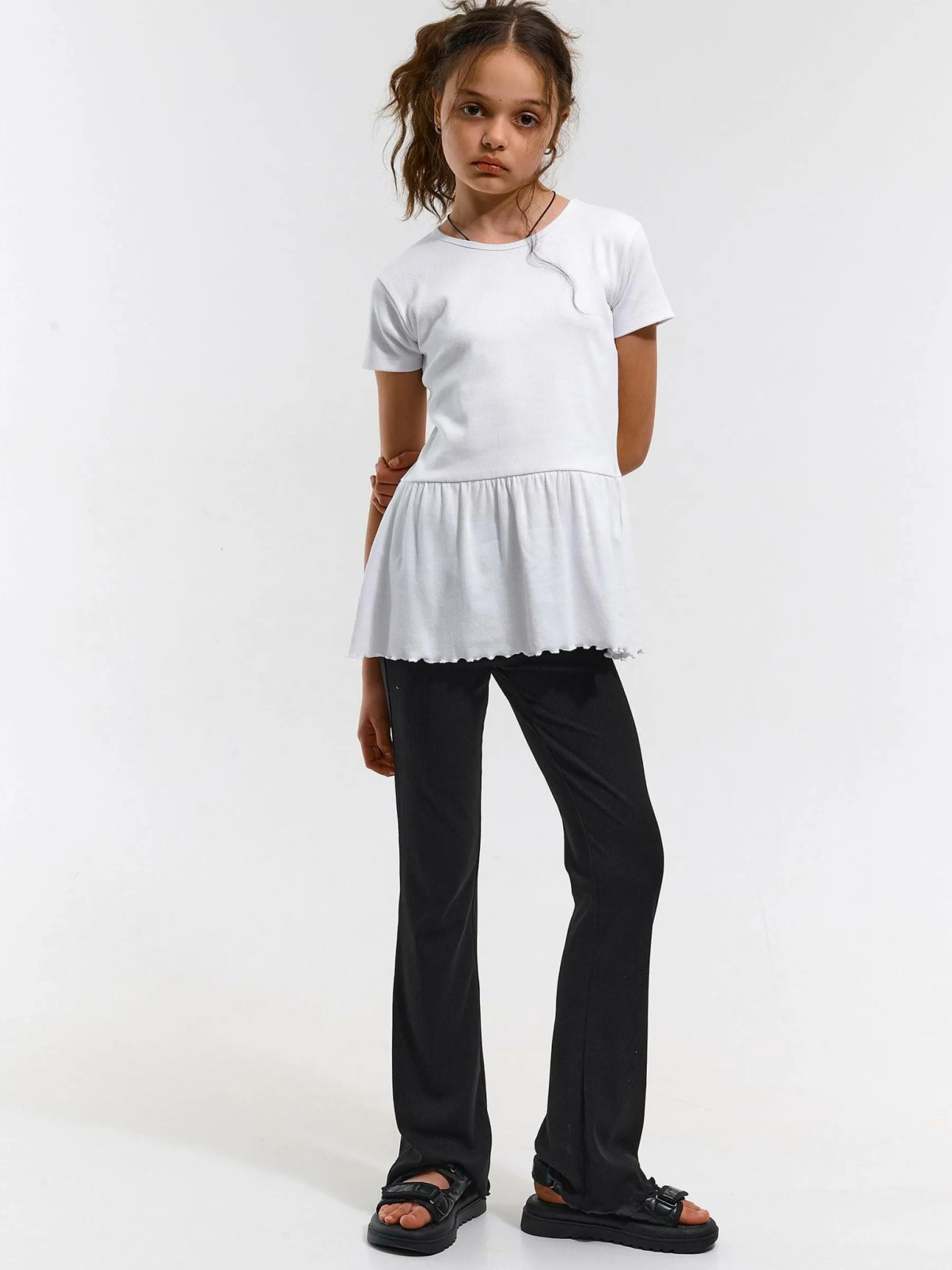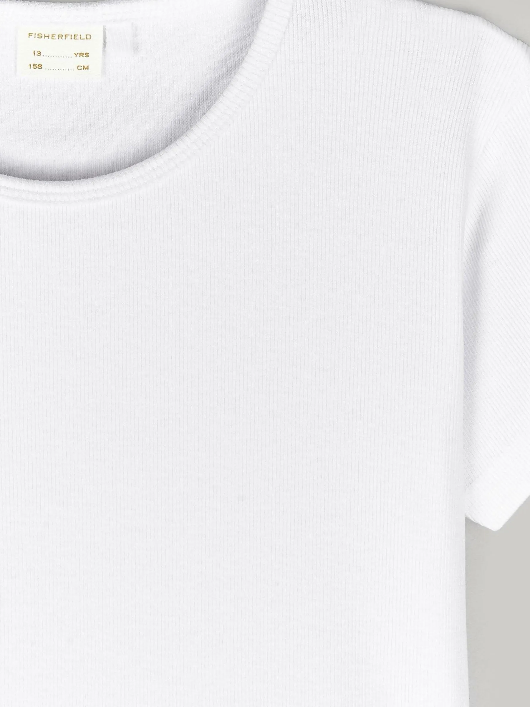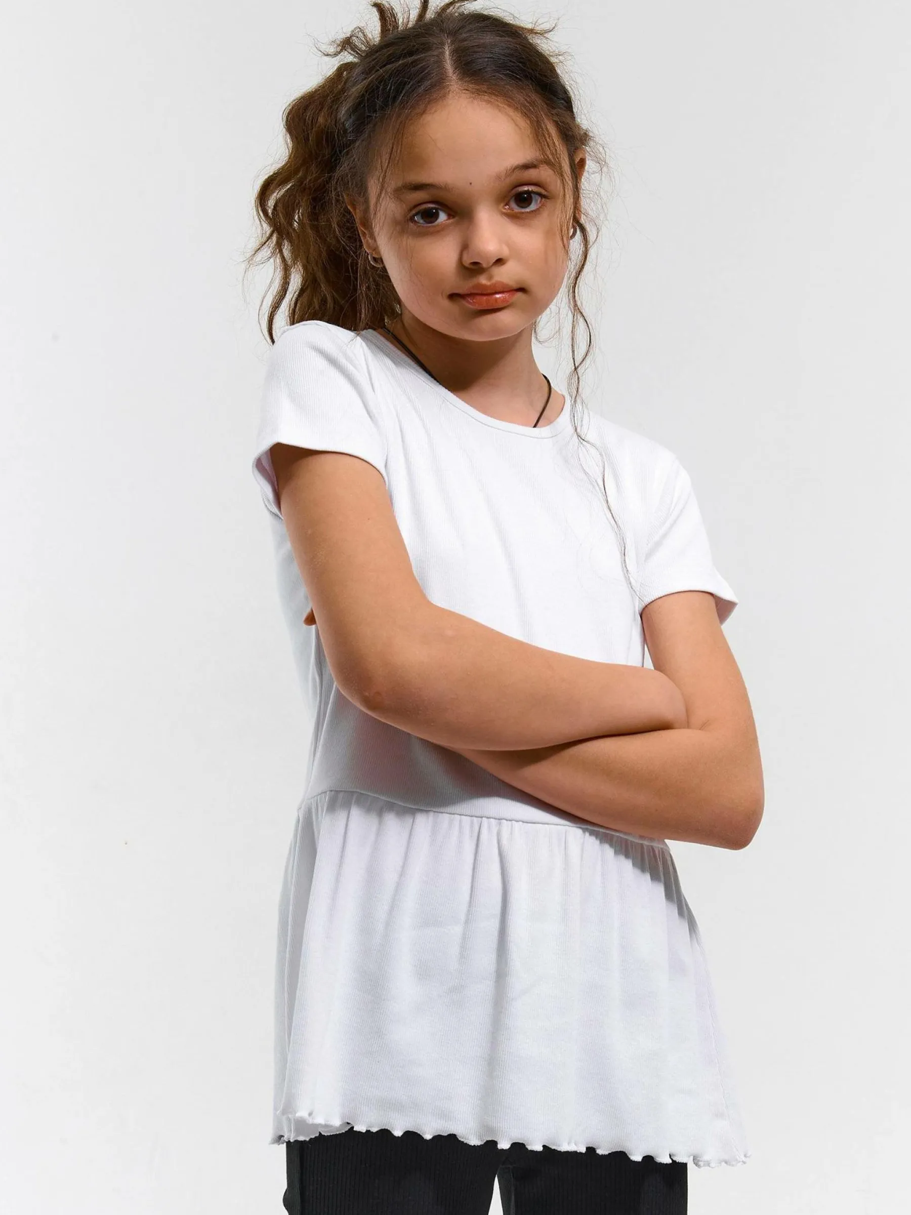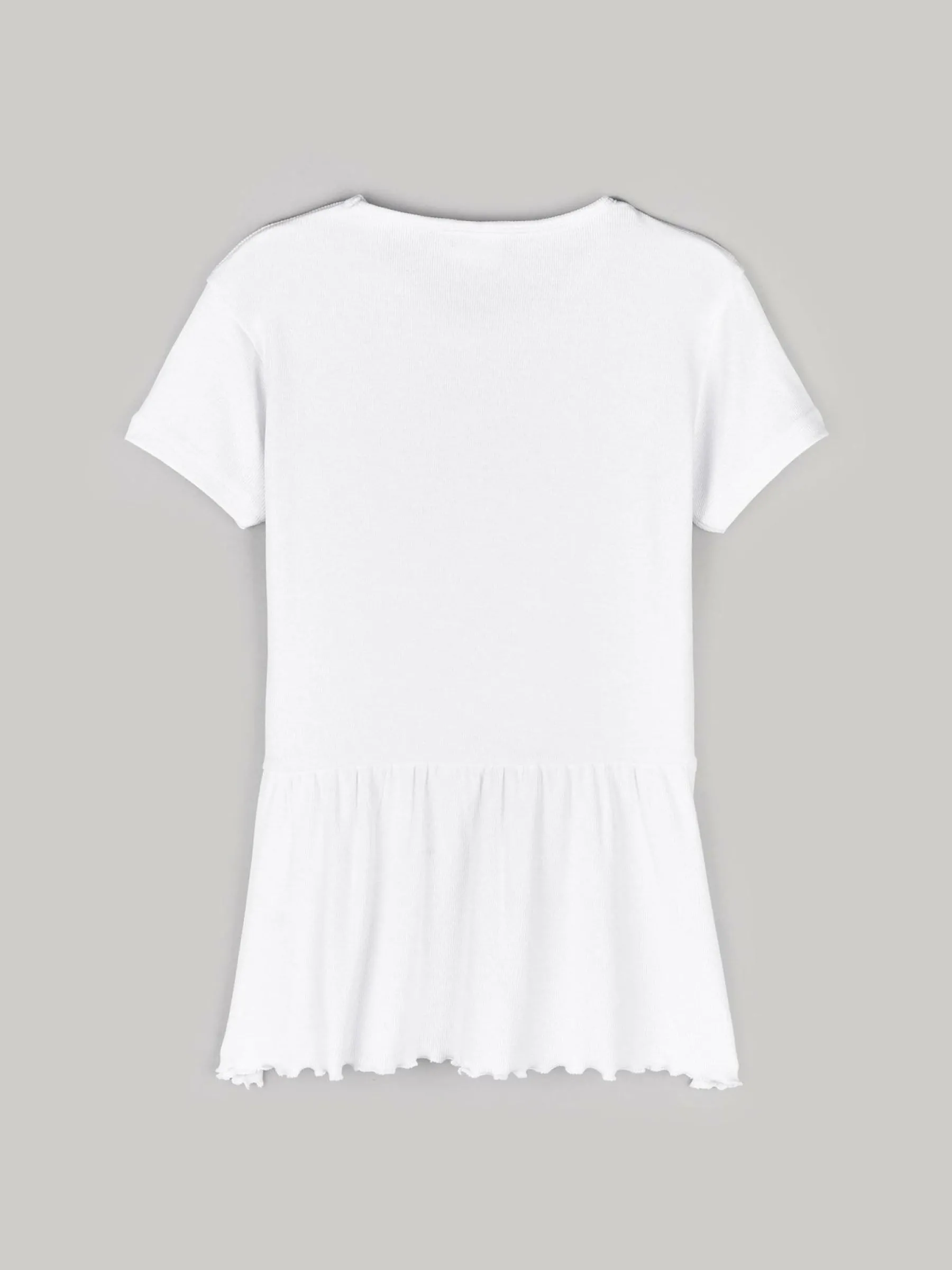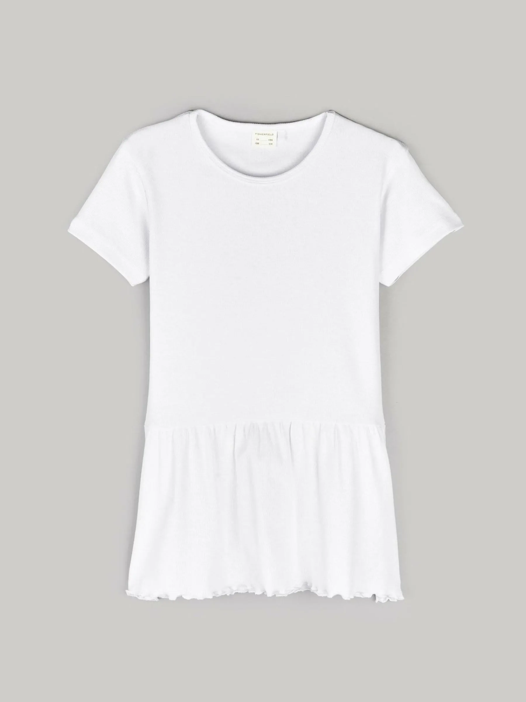Kolor: białyKrój: z falbanąTyp: koszulkaRekaw: krótki rękawDługość: krótkiPattern style: pojedynczy kolor, żeb…