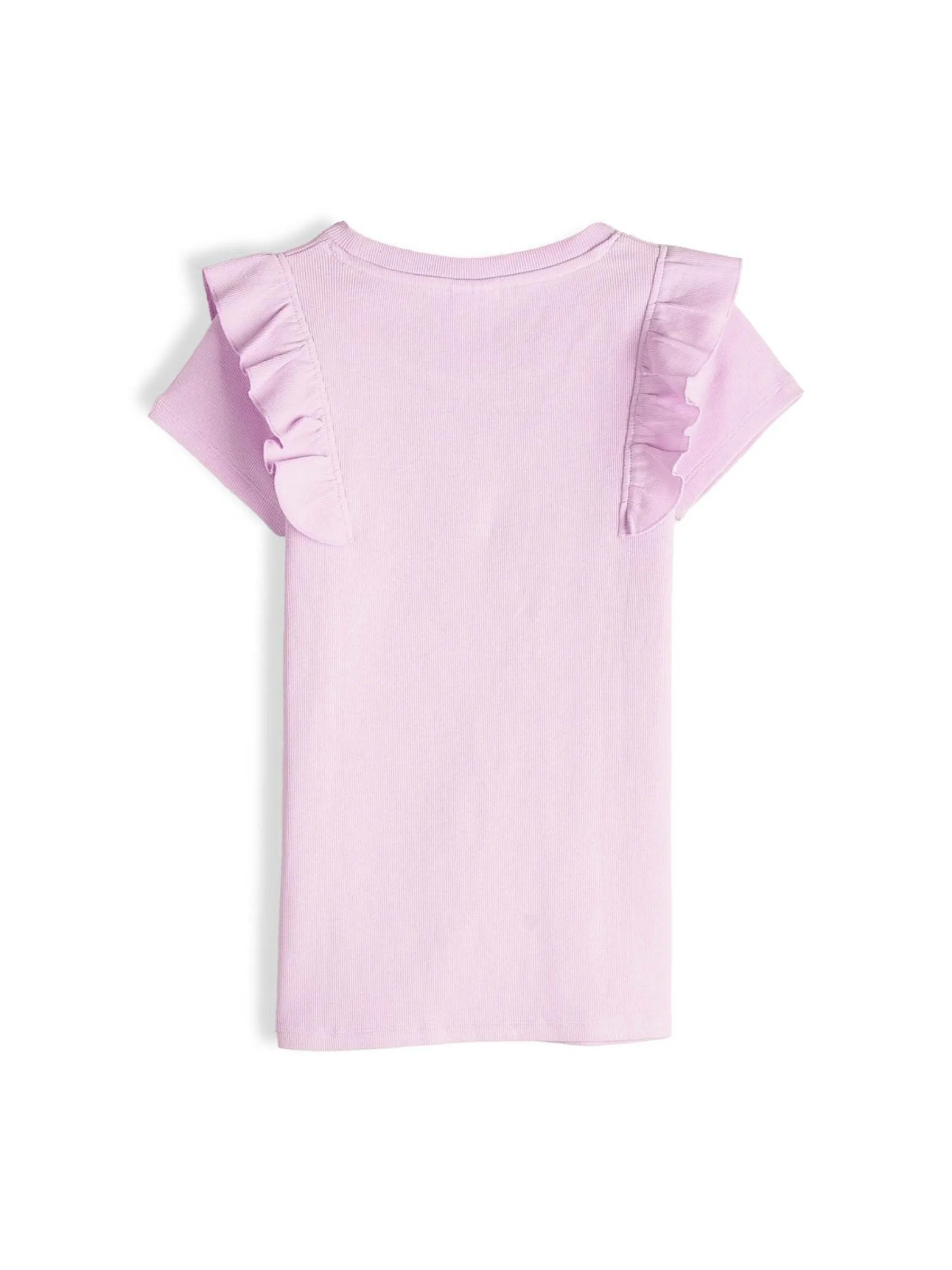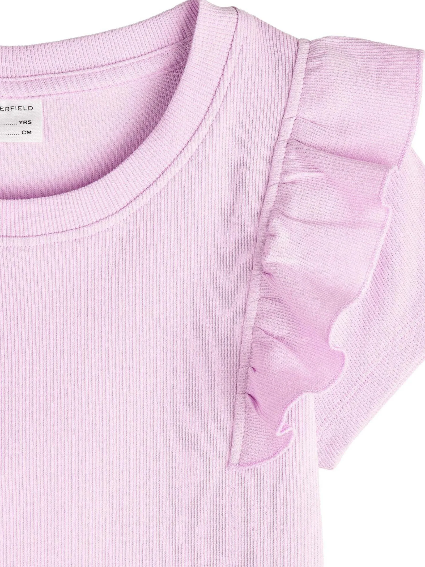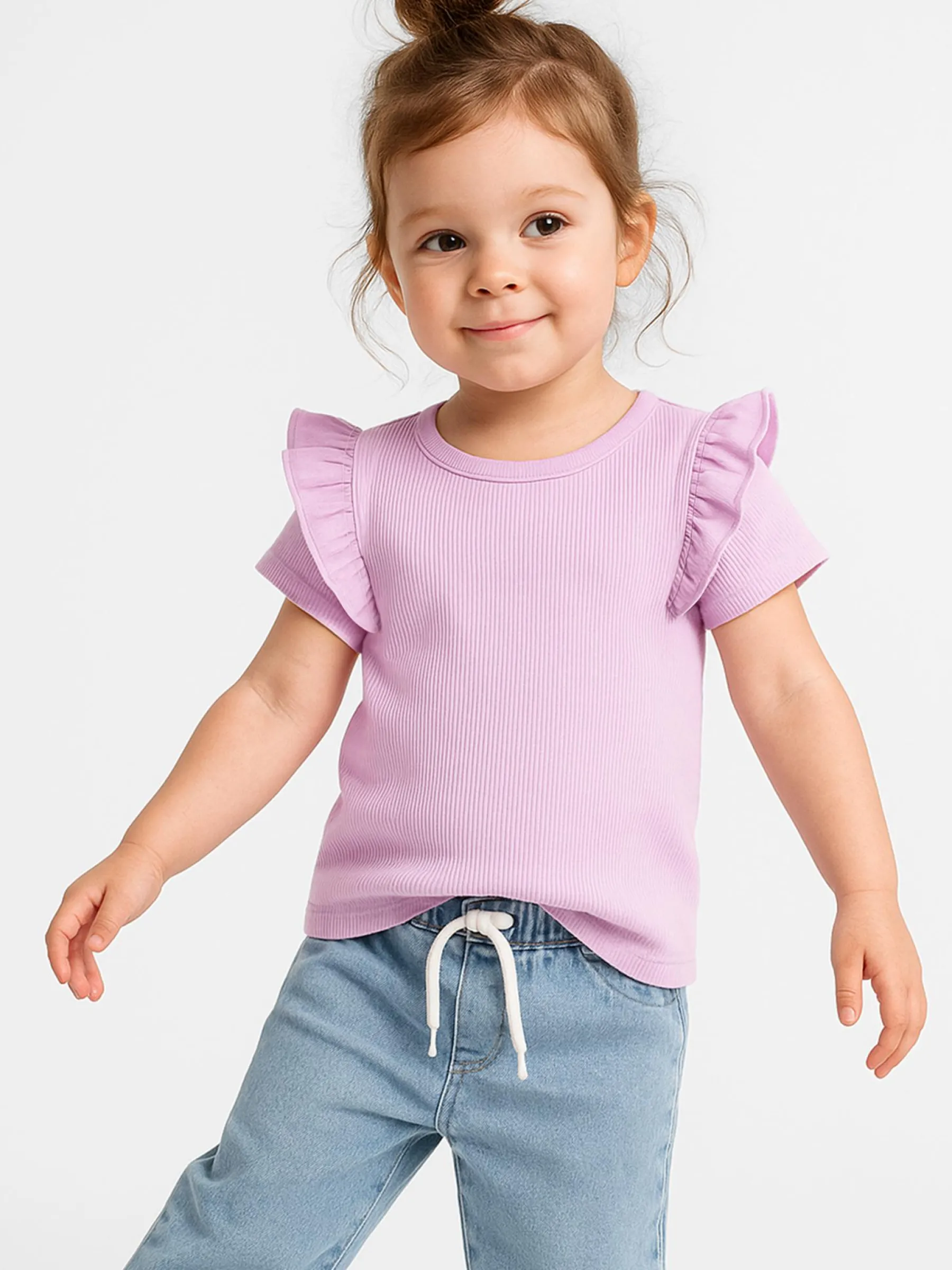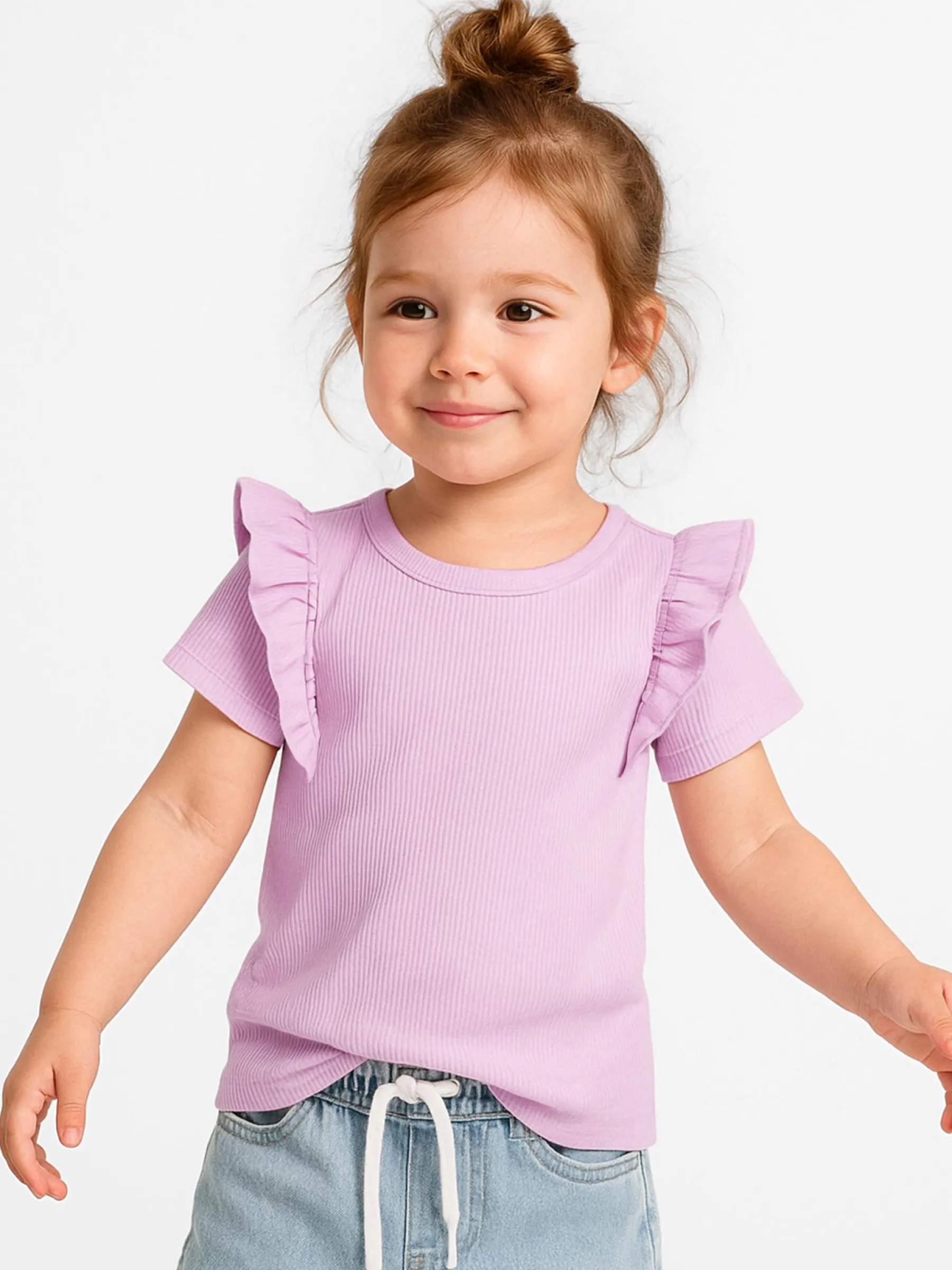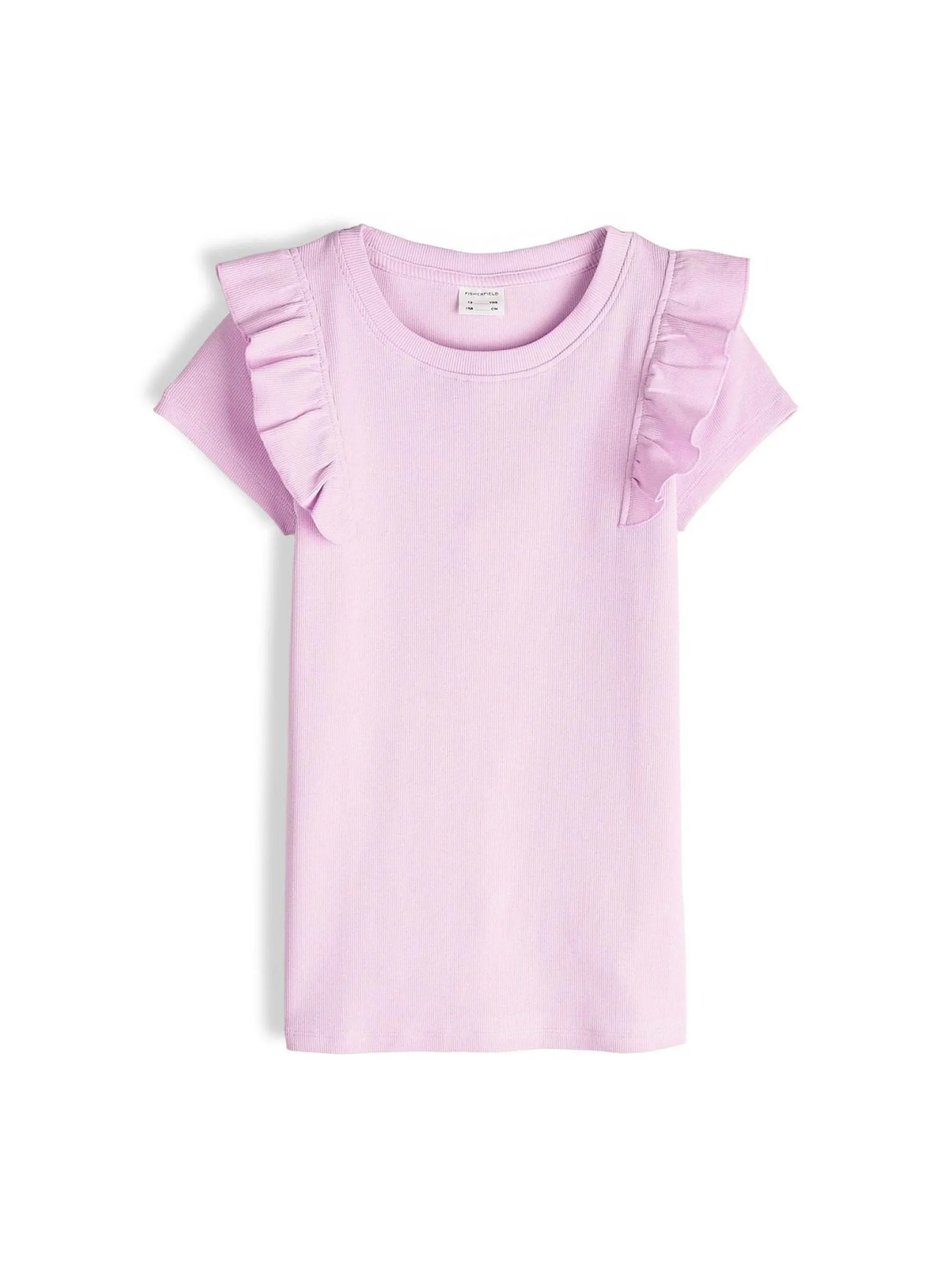Kolor: różowyKrój: z falbanąTyp: koszulkaRekaw: krótki rękawDługość: krótkiPattern style: pojedynczy kolor, ż…