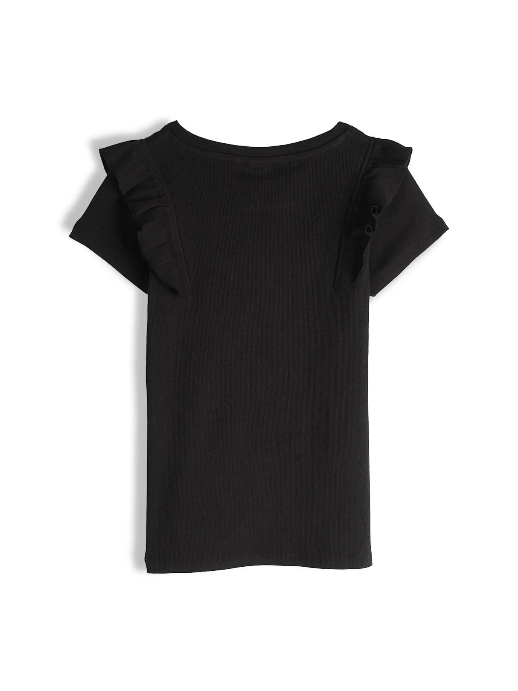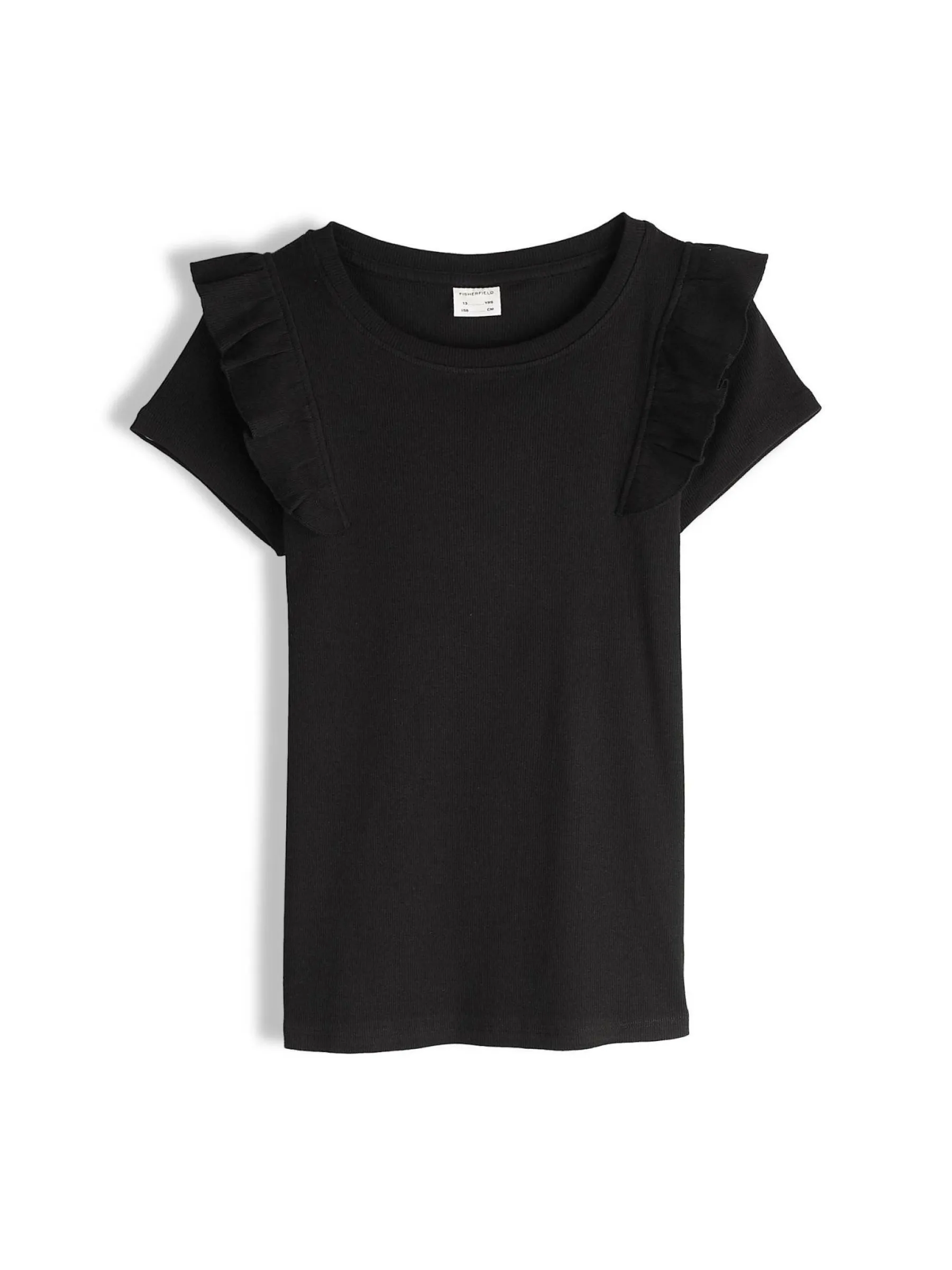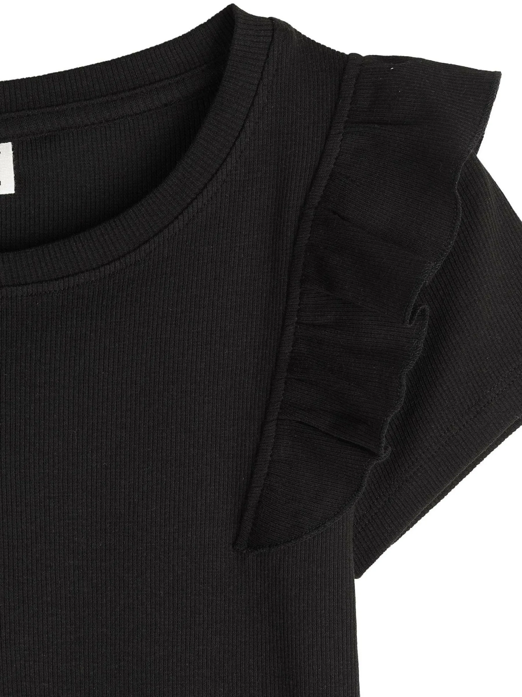 Kolor: czarnyKrój: z falbanąTyp: koszulkaRekaw: krótki rękawDługość: krótkiPattern style: pojedynczy kolor, żeb…