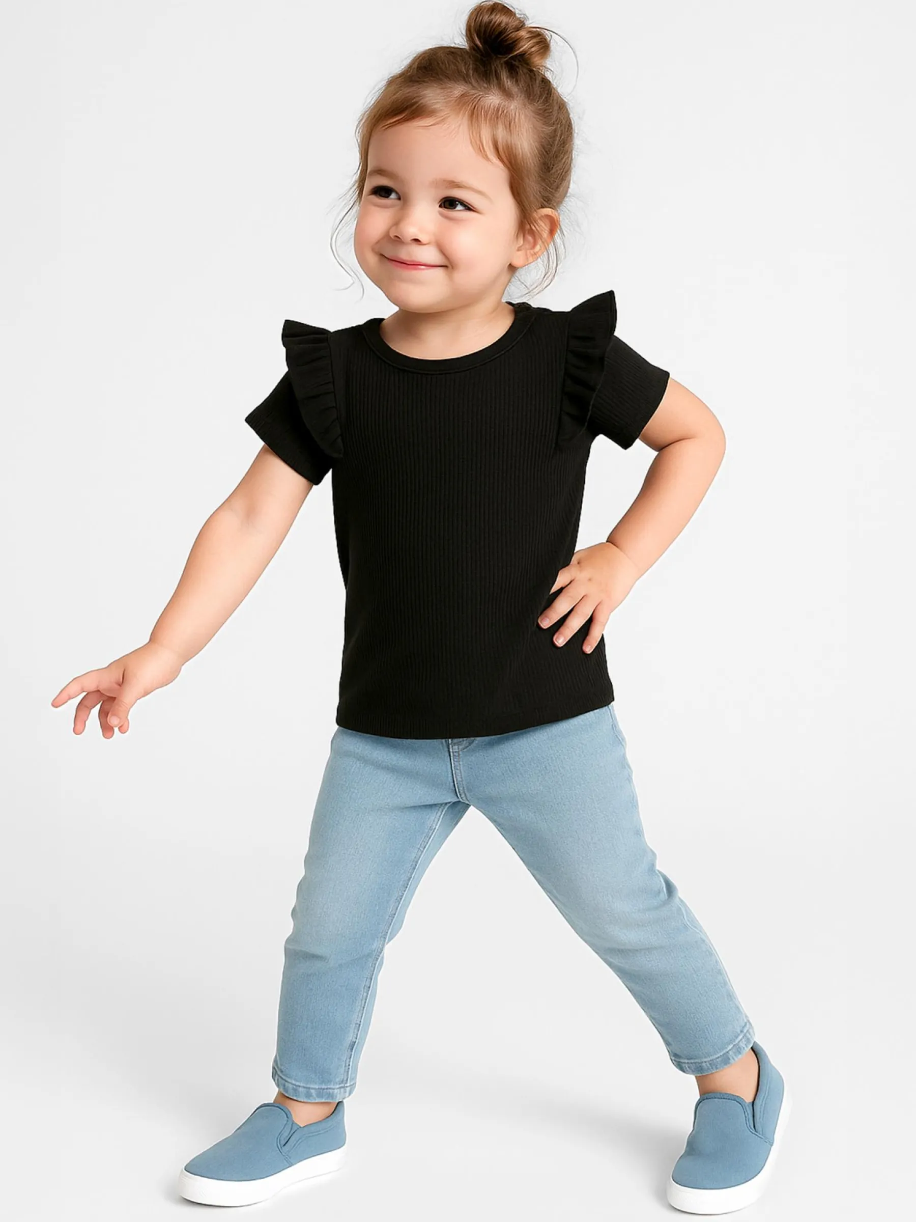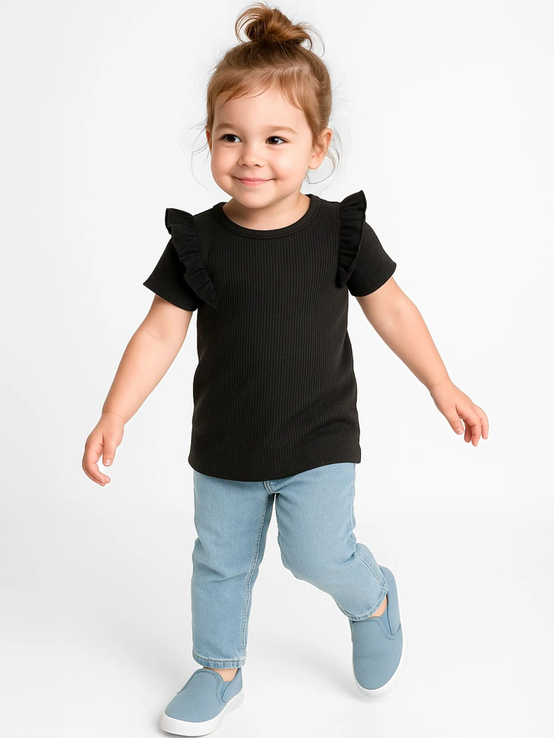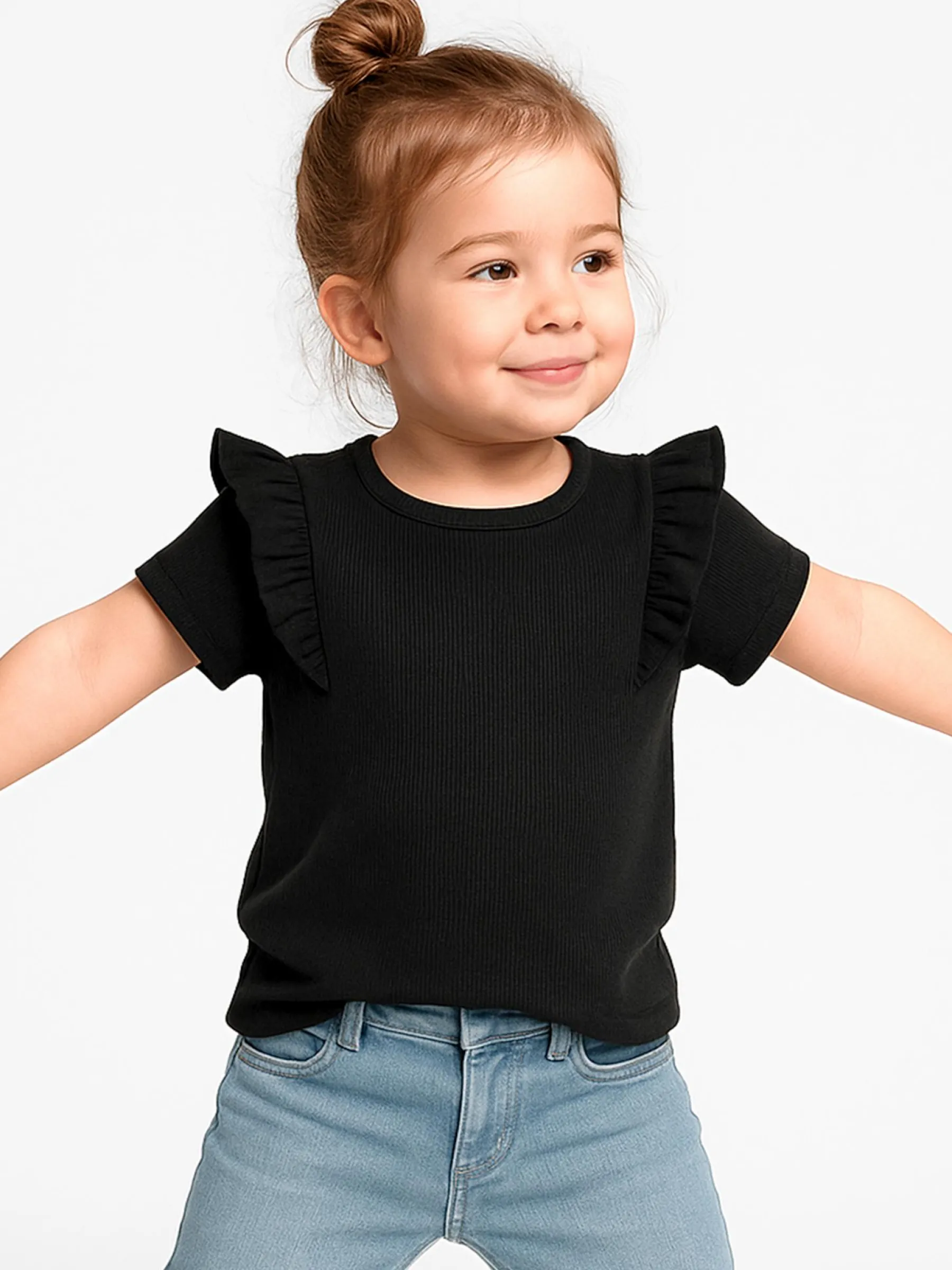 Kolor: czarnyKrój: z falbanąTyp: koszulkaRekaw: krótki rękawDługość: krótkiPattern style: pojedynczy kolor, żeb…