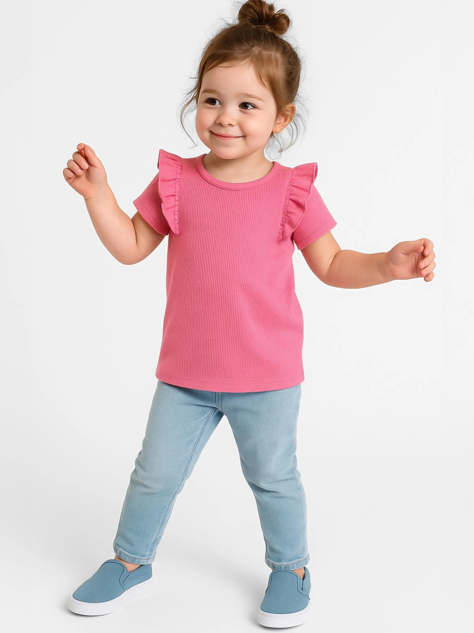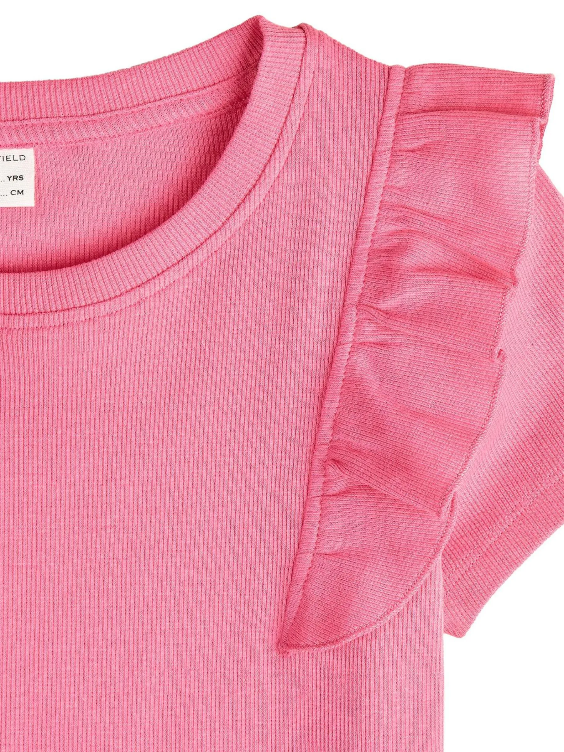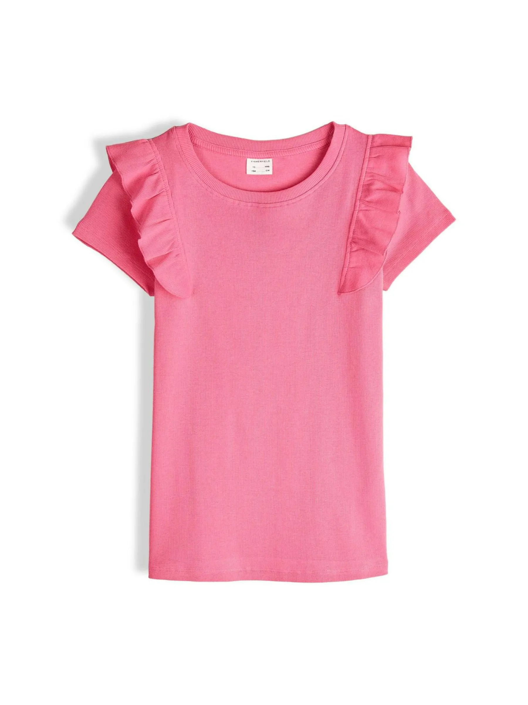 Kolor: różowyKrój: z falbanąTyp: koszulkaRekaw: krótki rękawDługość: krótkiPattern style: pojedynczy kolor, ż…