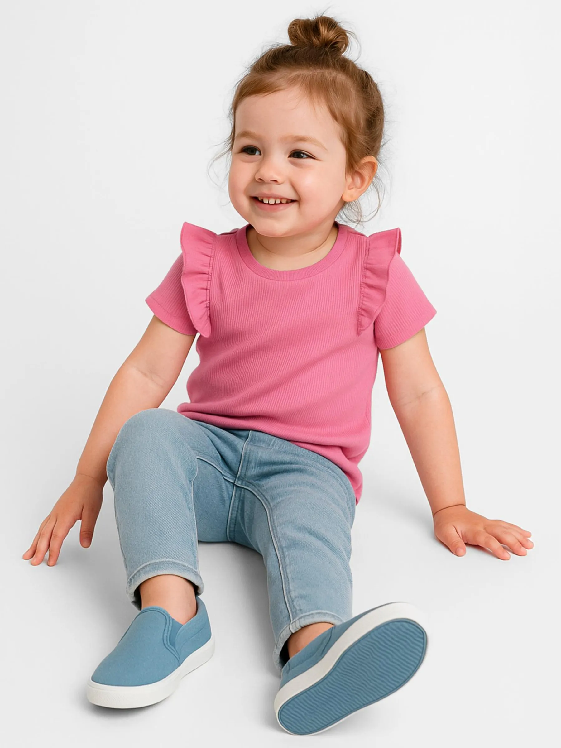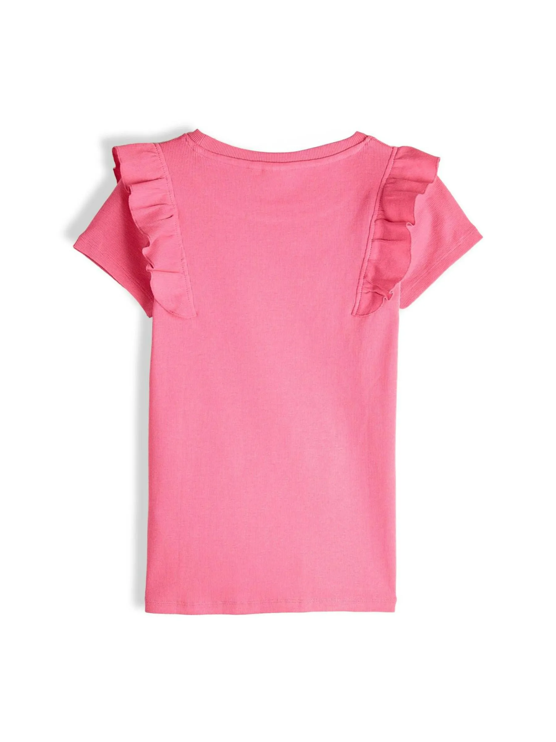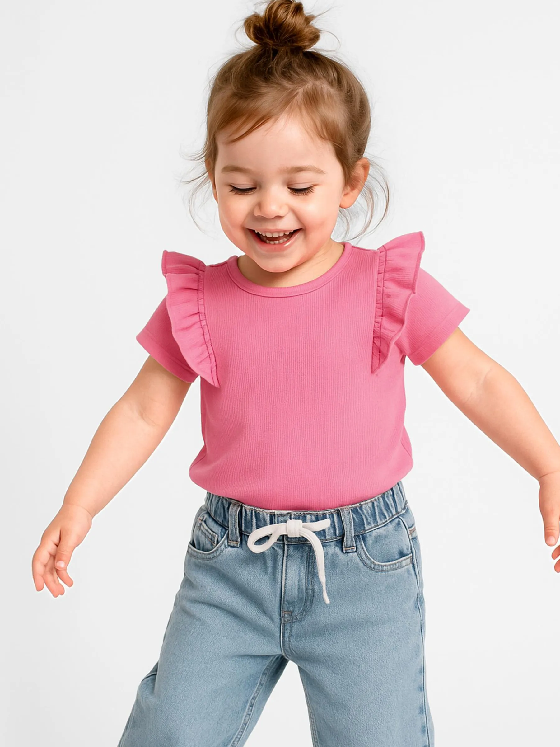Kolor: różowyKrój: z falbanąTyp: koszulkaRekaw: krótki rękawDługość: krótkiPattern style: pojedynczy kolor, ż…