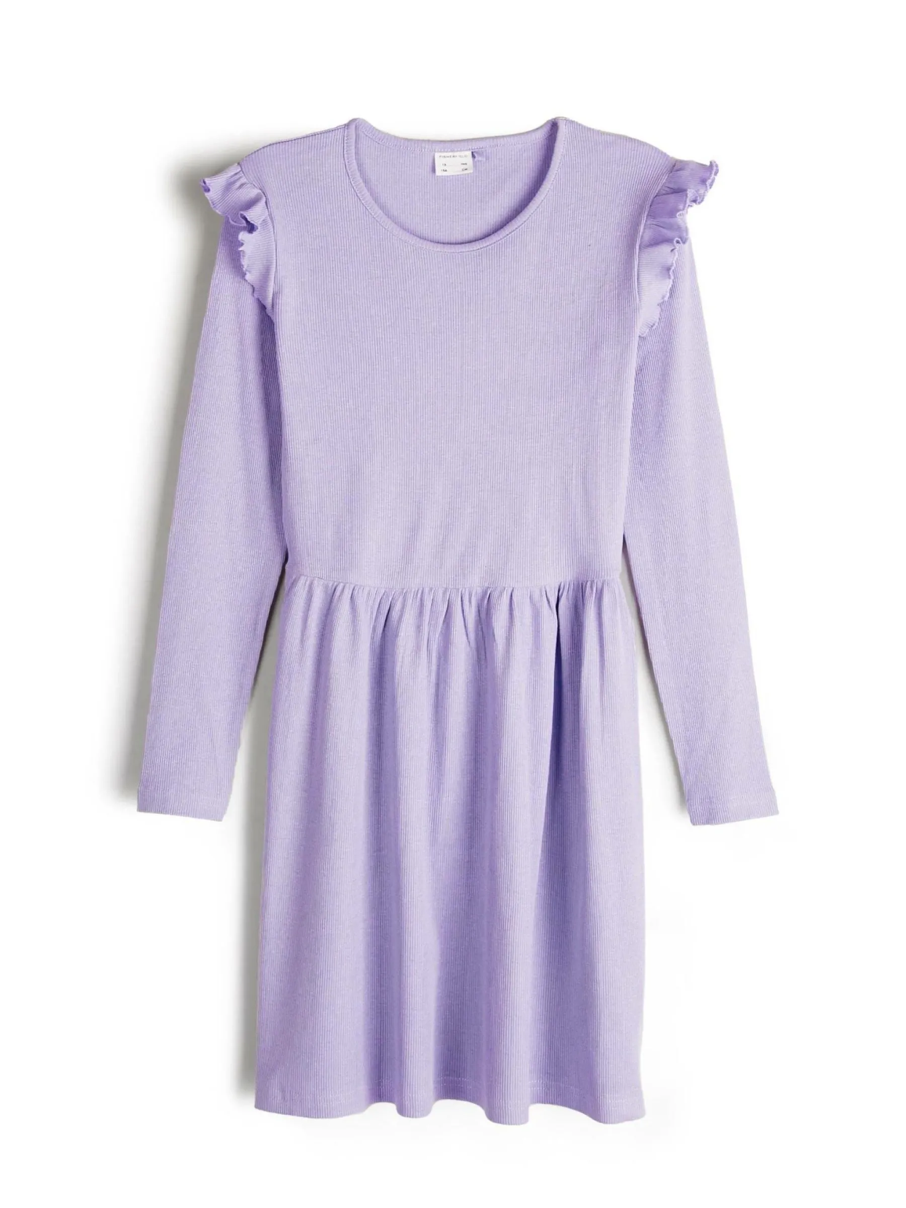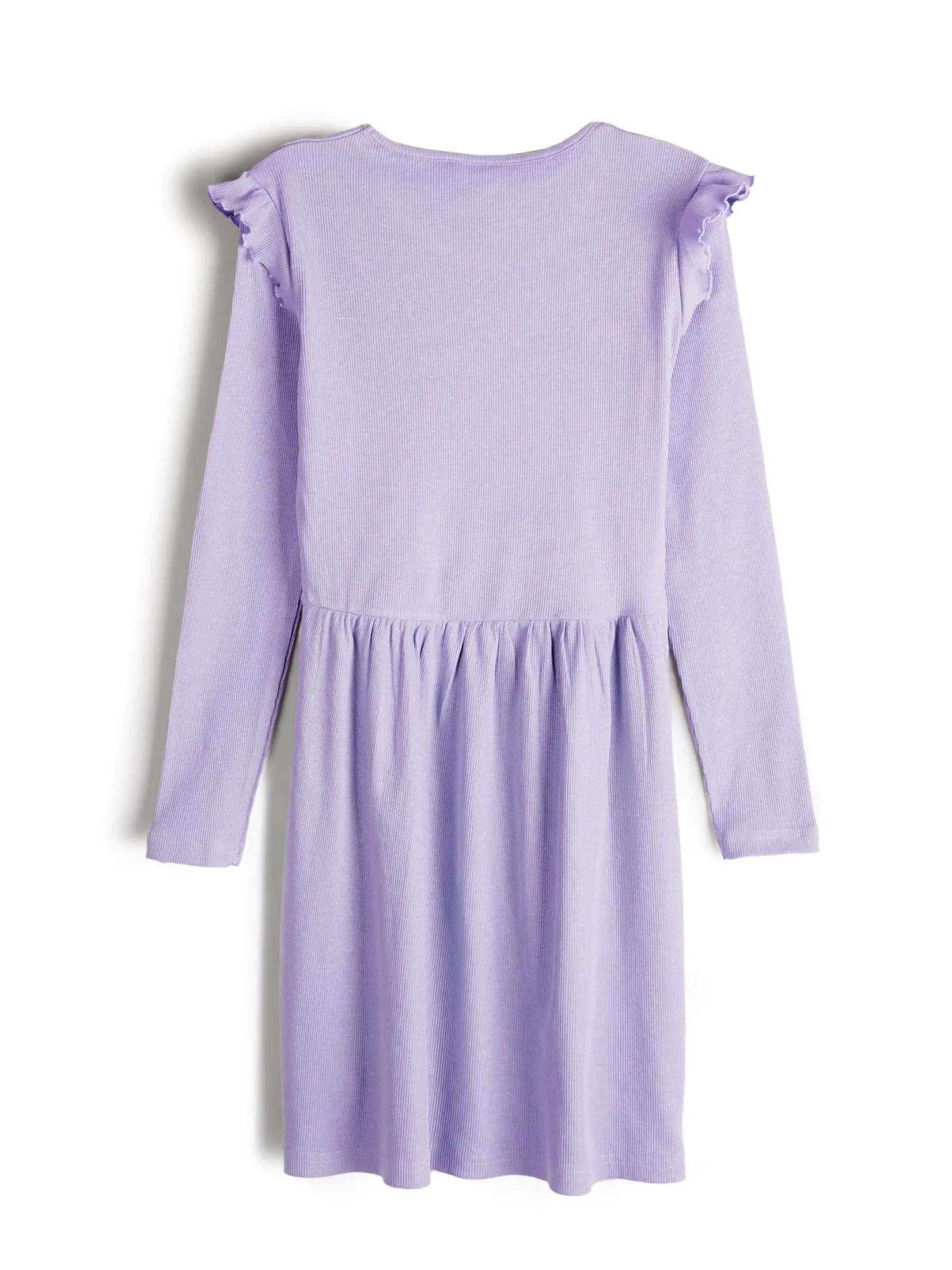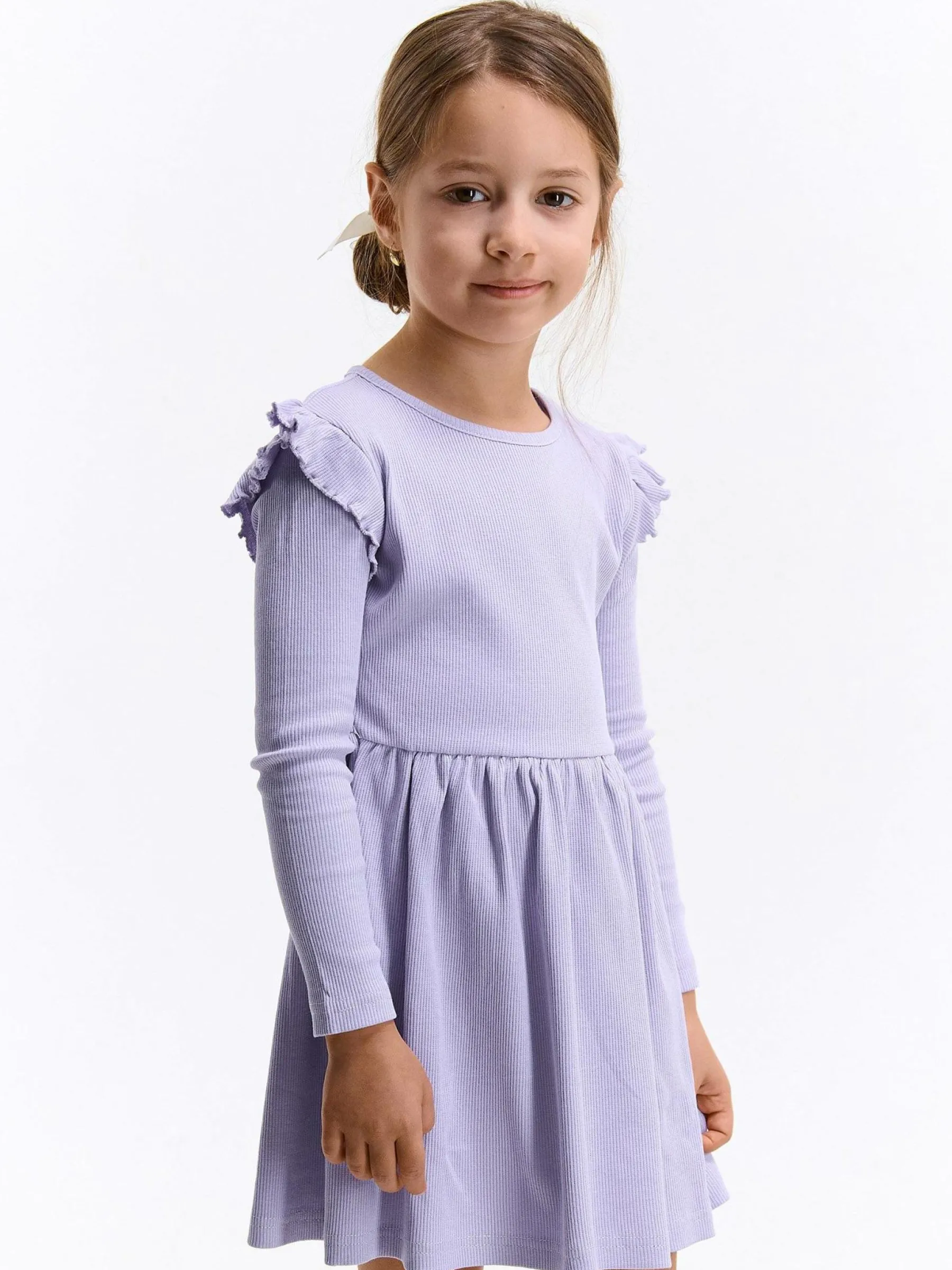 Kolor: purpurowyKrój: z falbanąTyp: sukienkaRekaw: długi rękawDługość: miniPattern style: pojedynczy kolor, żebr…
