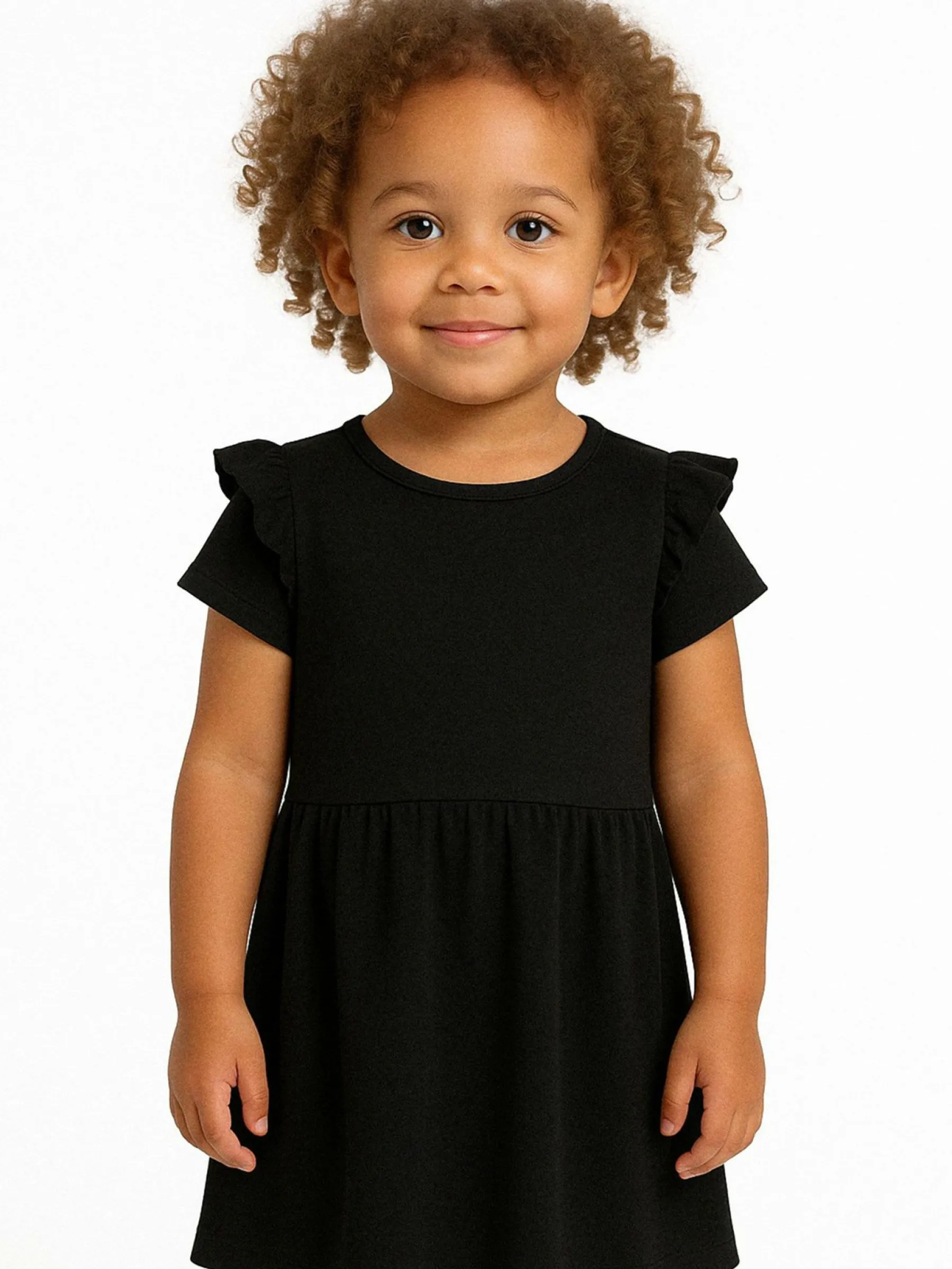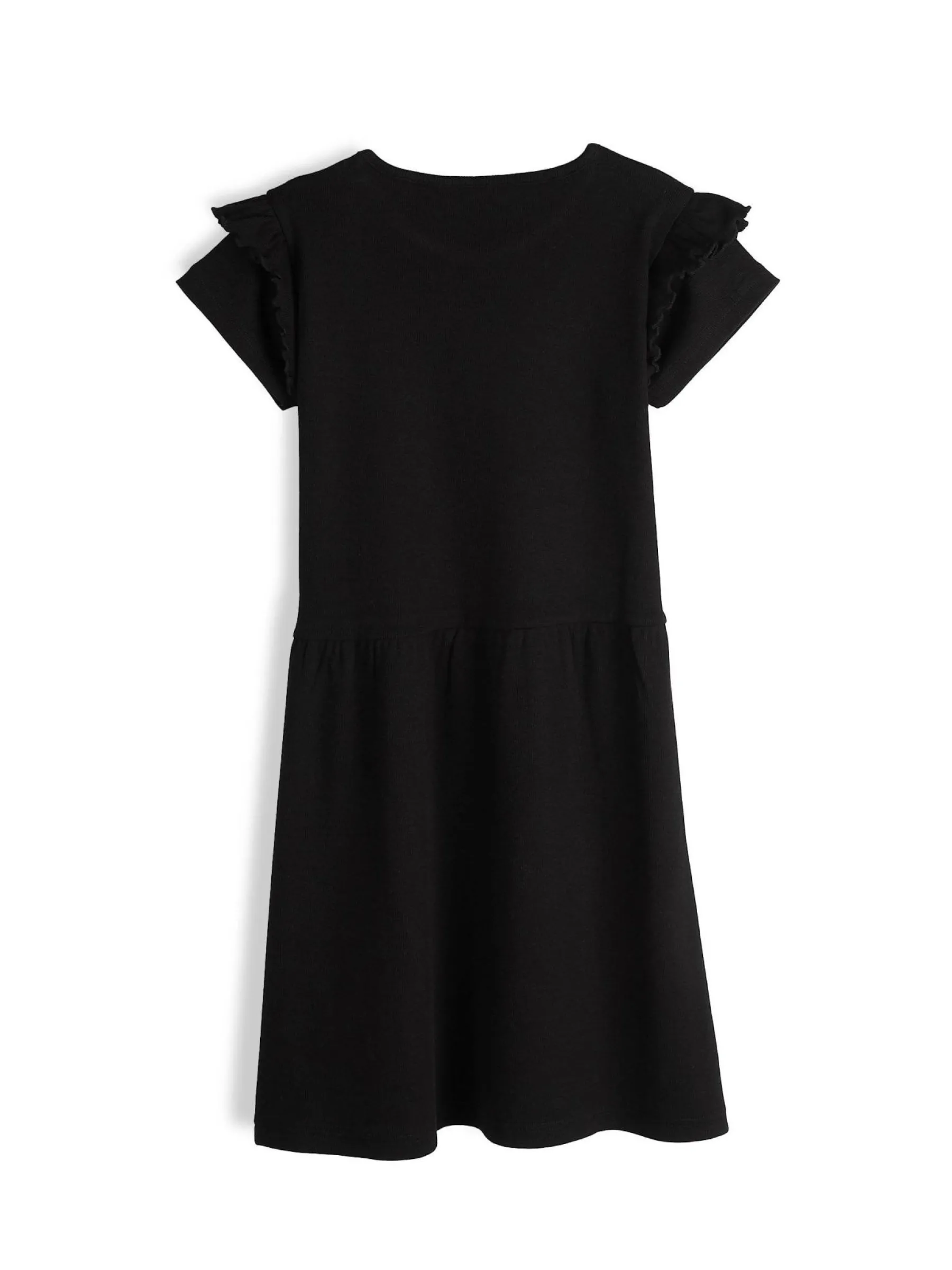 Kolor: czarnyKrój: z falbanąTyp: sukienkaRekaw: krótki rękawDługość: miniPattern style: pojedynczy kolor, żebrow…