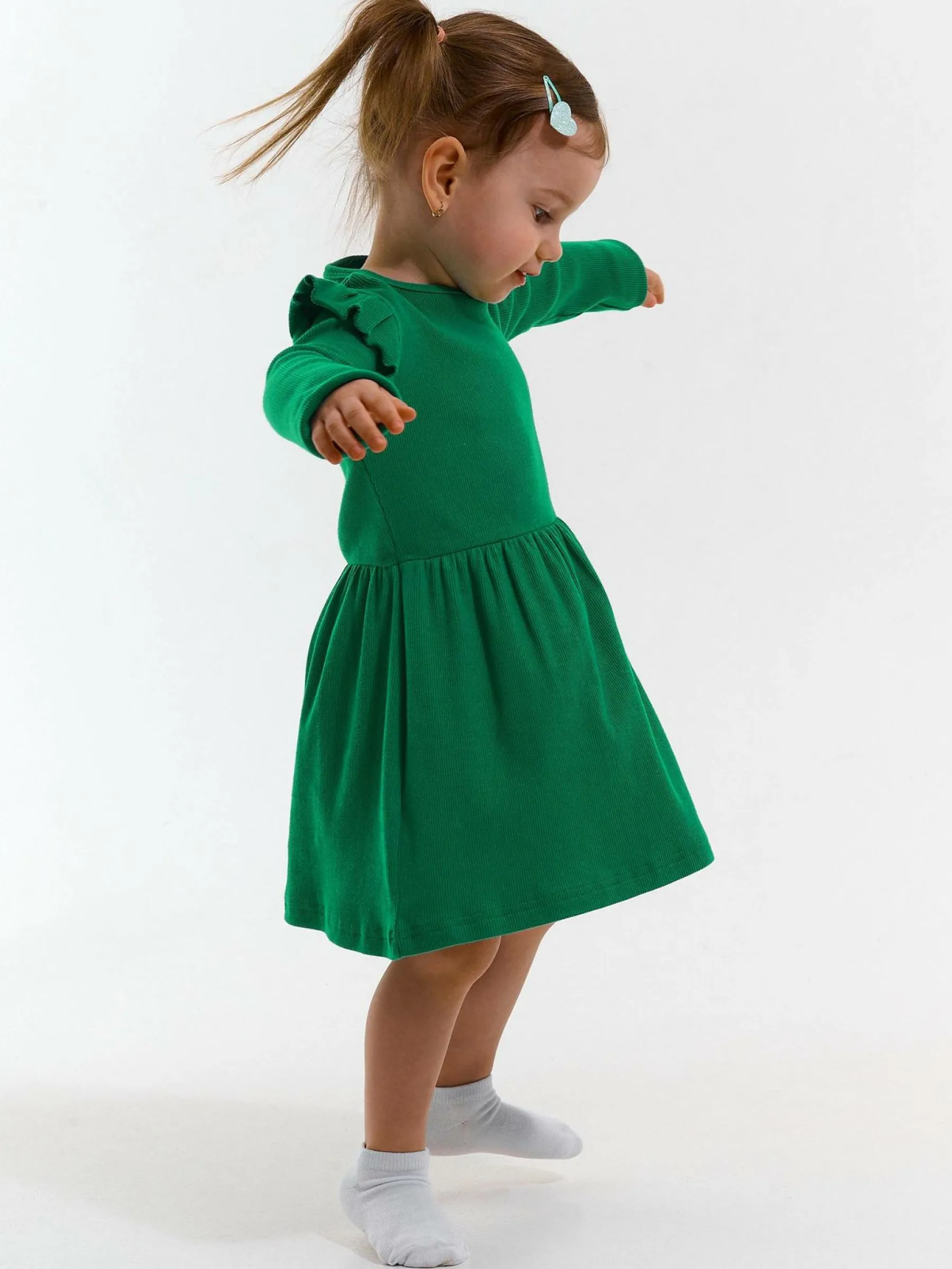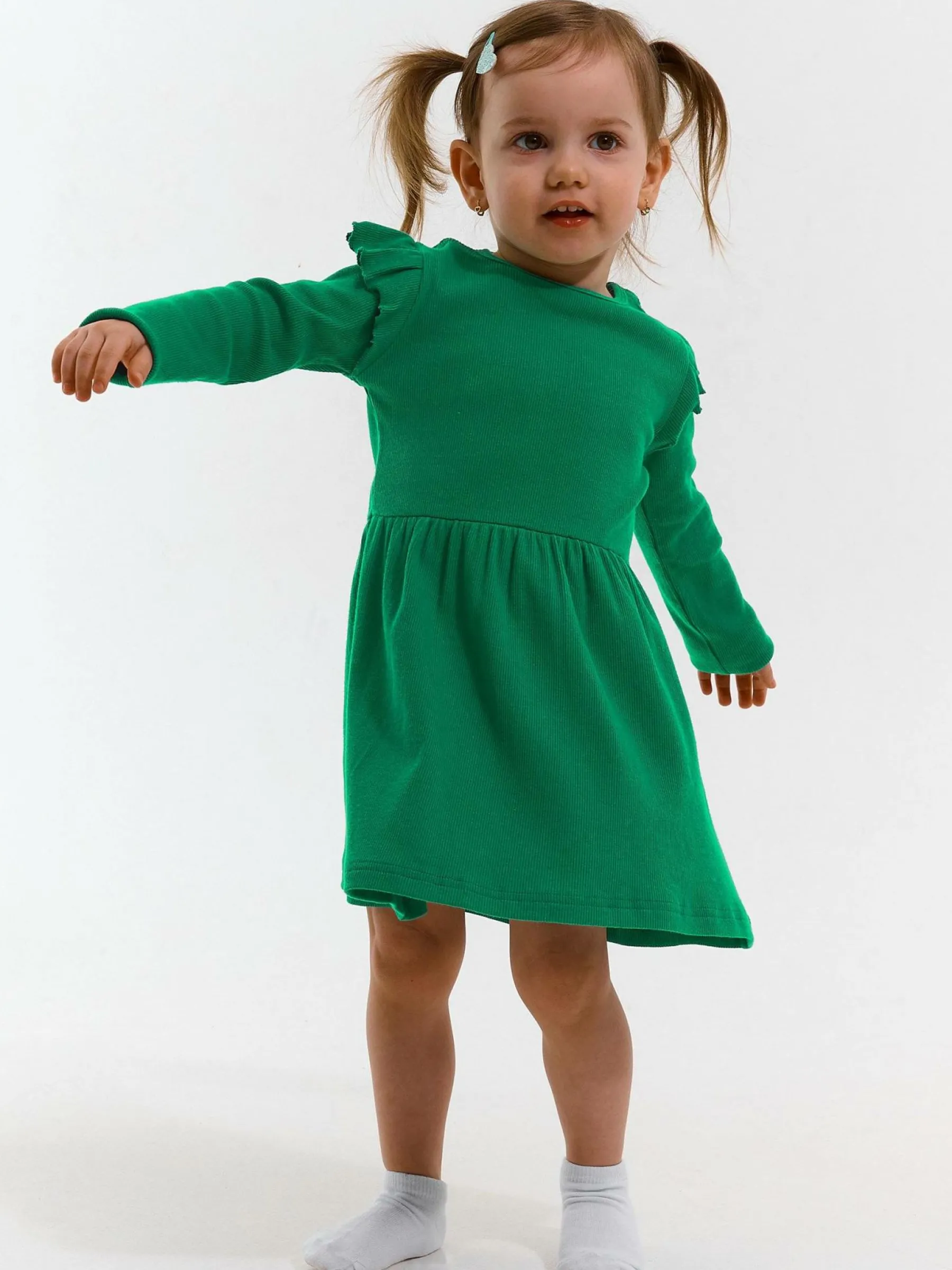 Kolor: zielonyKrój: asy, z falbanąTyp: sukienkaRekaw: długi rękawDługość: miniPattern style: żebrowany, pojedync…