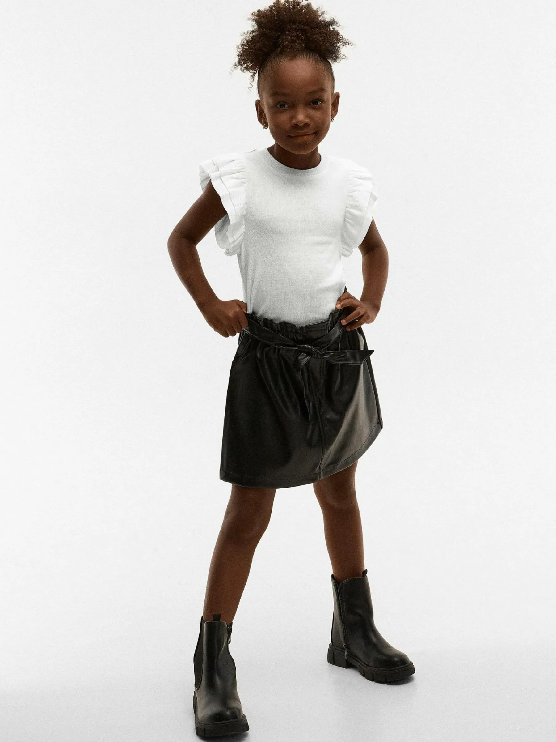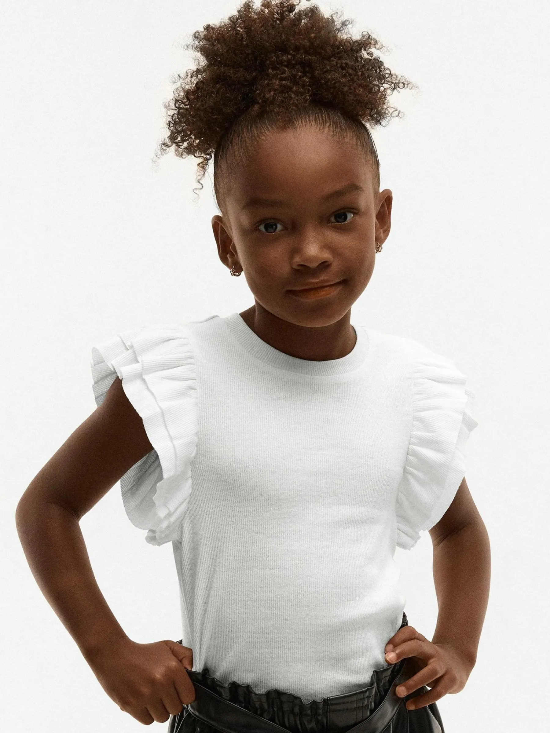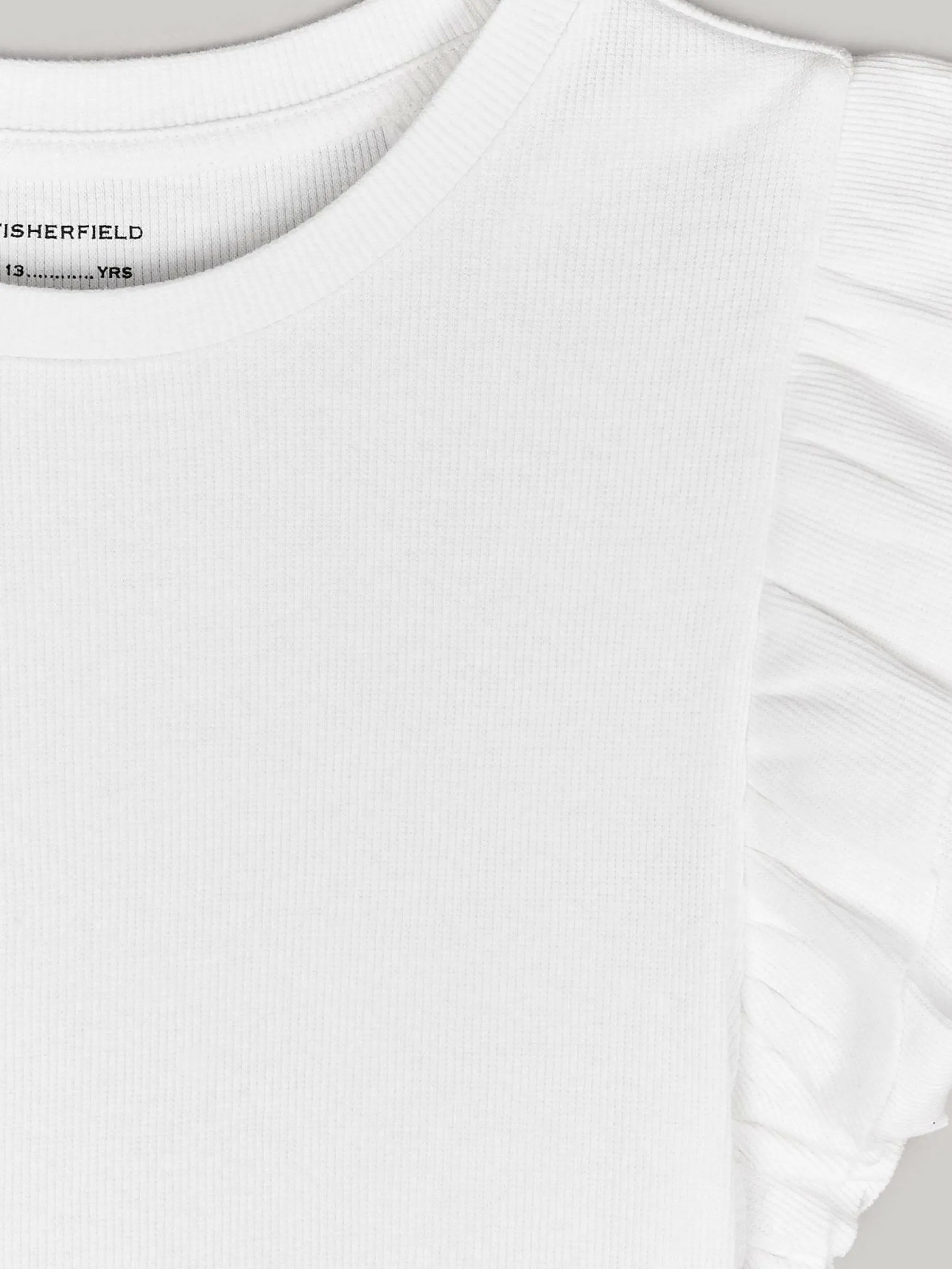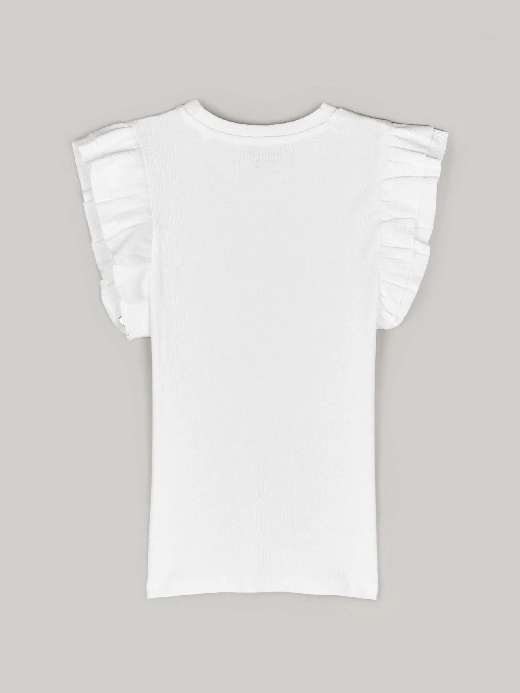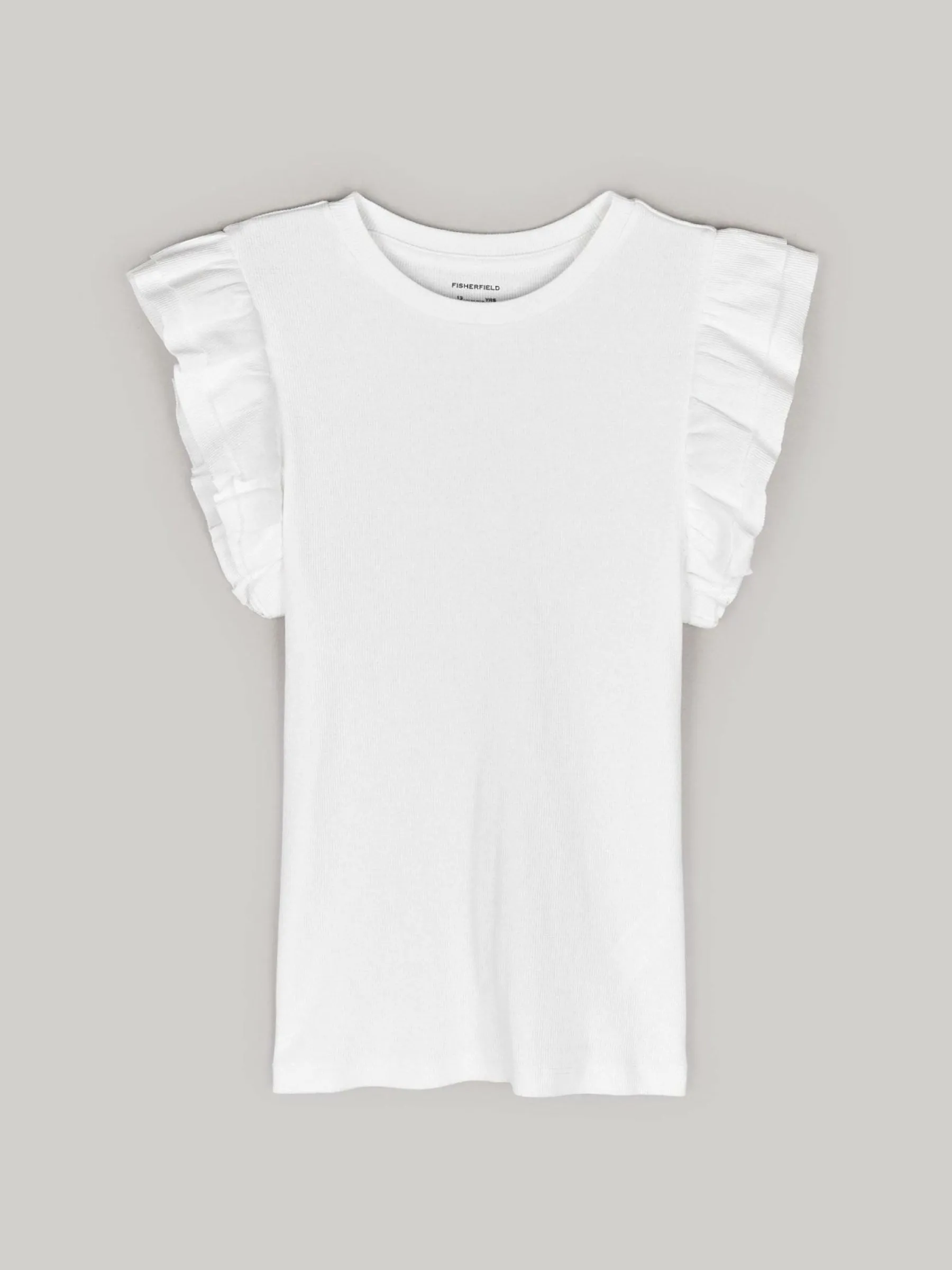 Kolor: białyKrój: z falbanąTyp: koszulkaRekaw: krótki rękawDługość: krótkiPattern style: pojedynczy kolor, żeb…