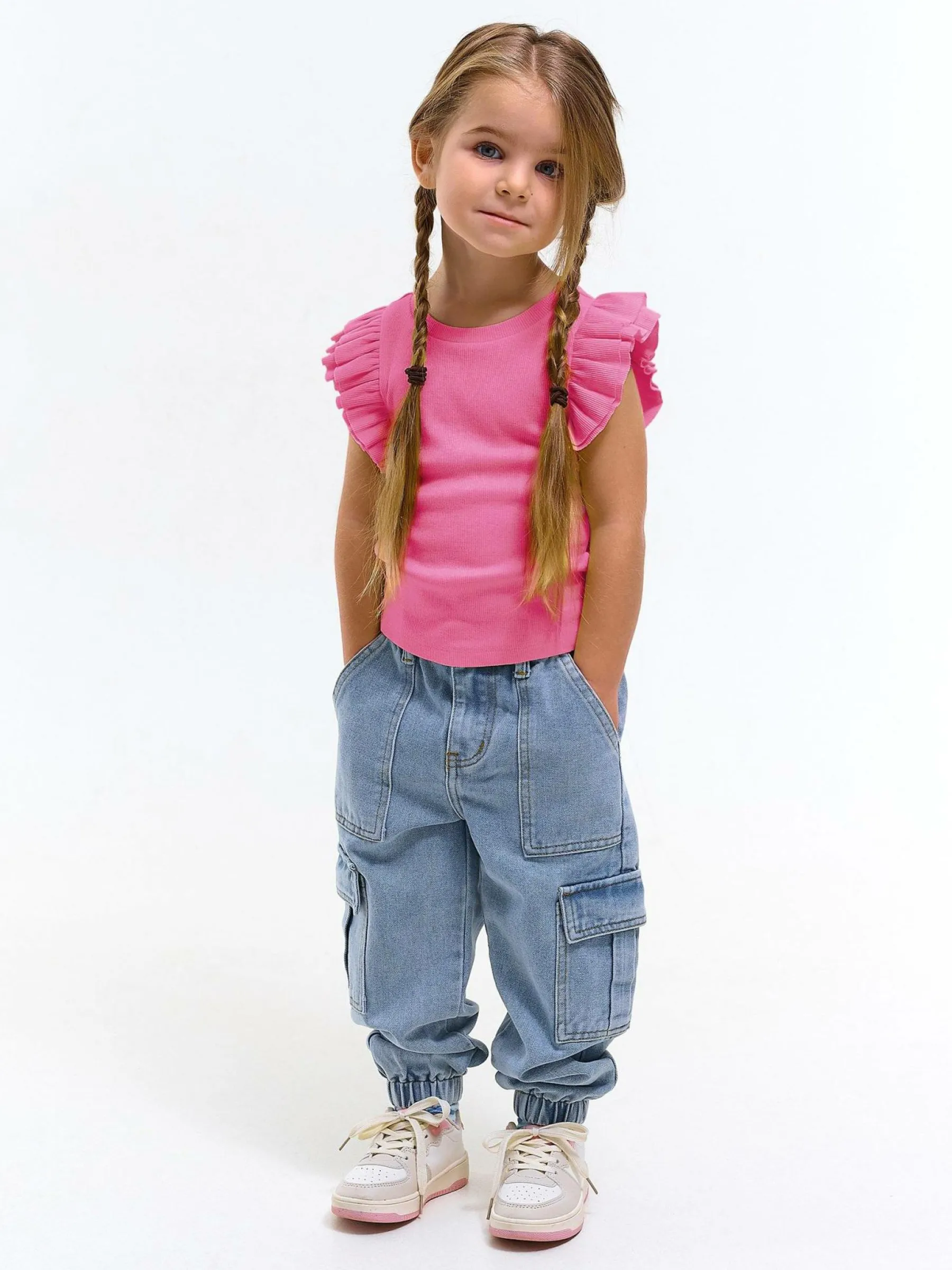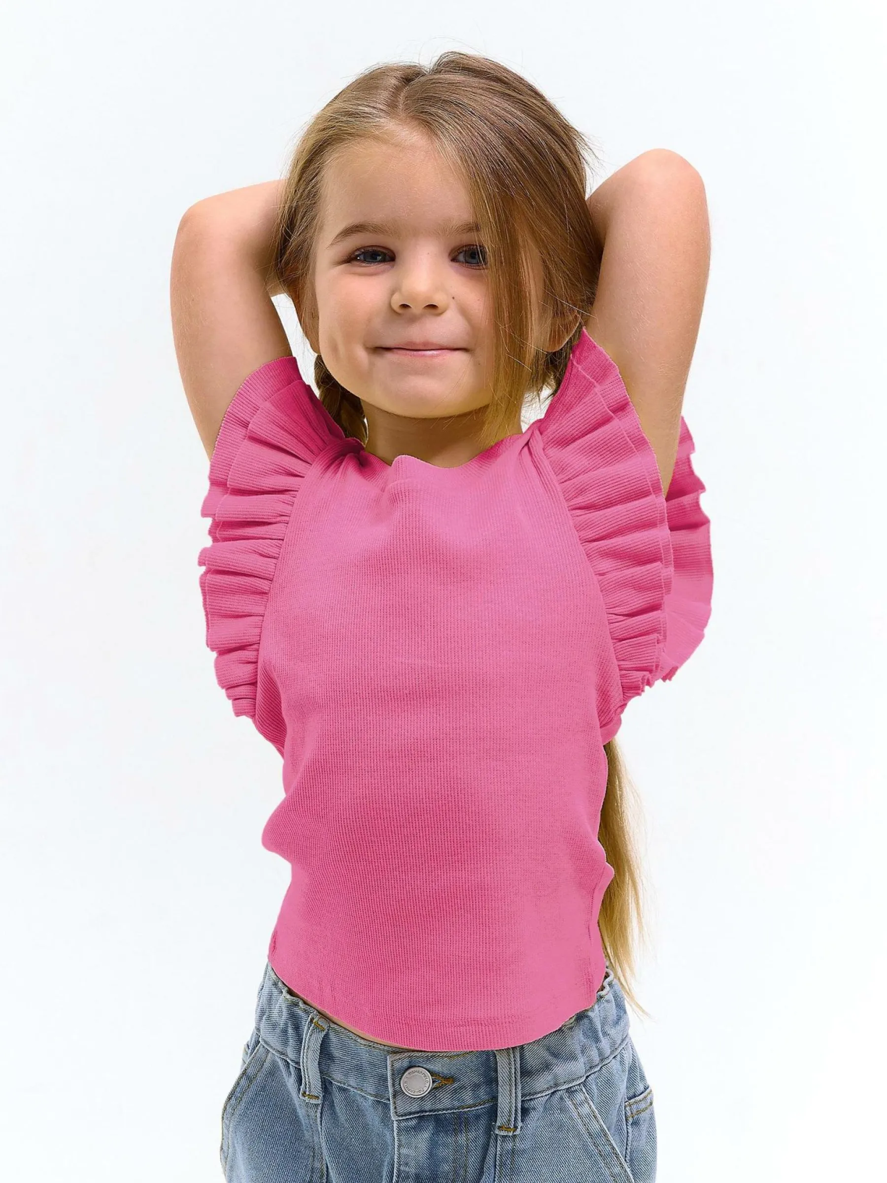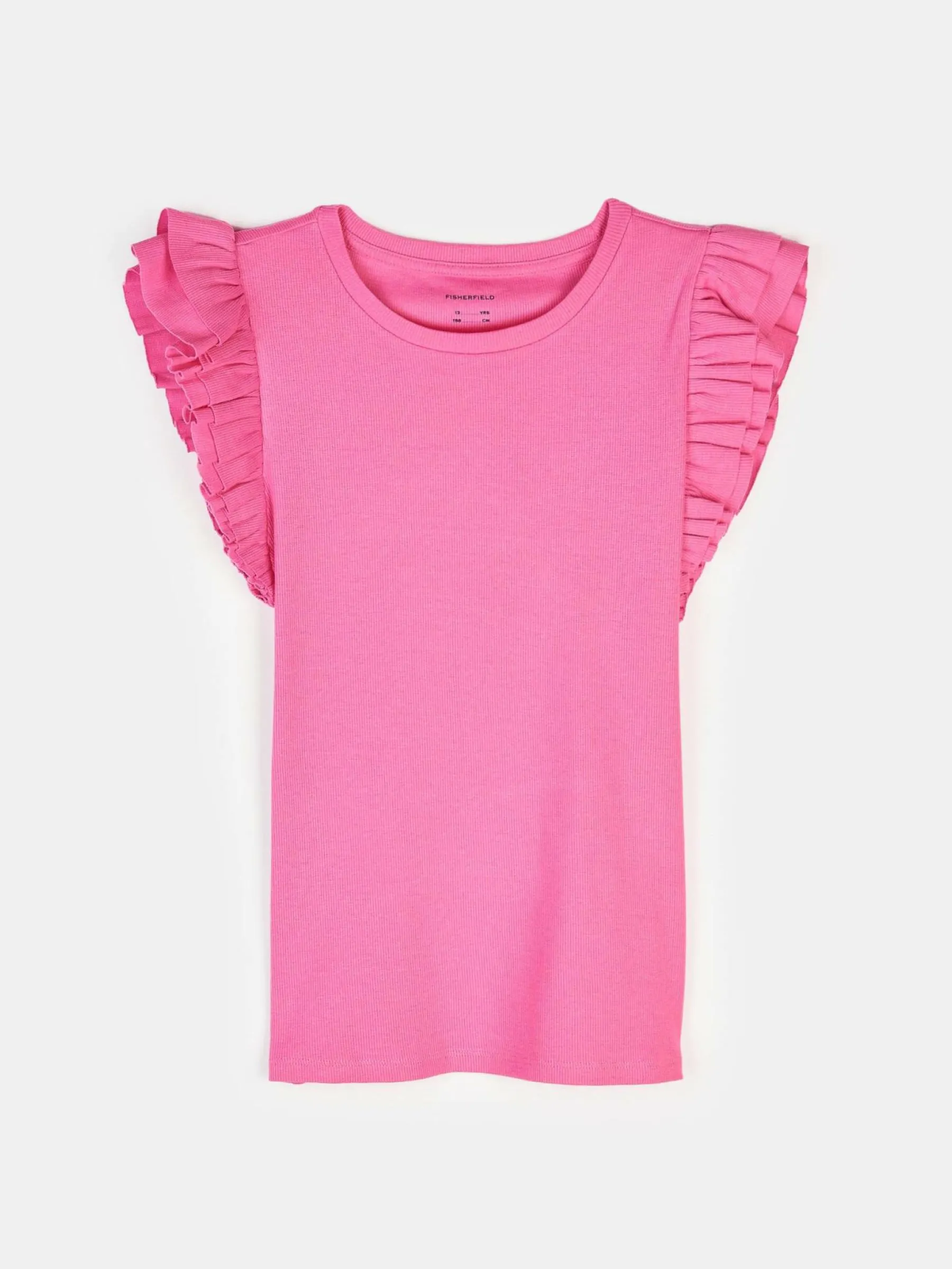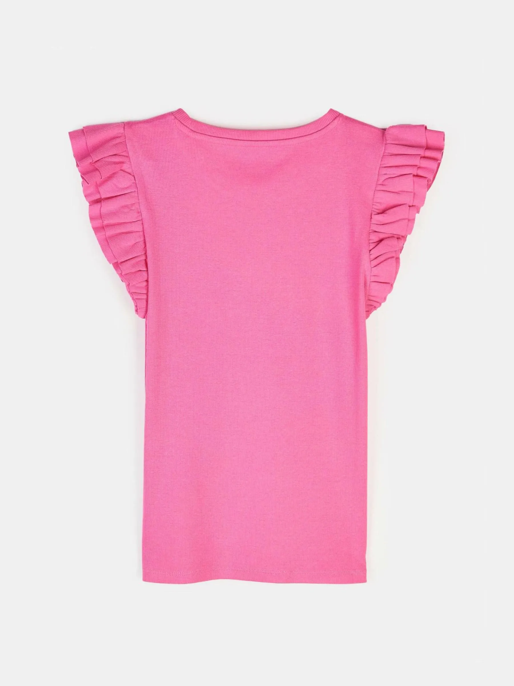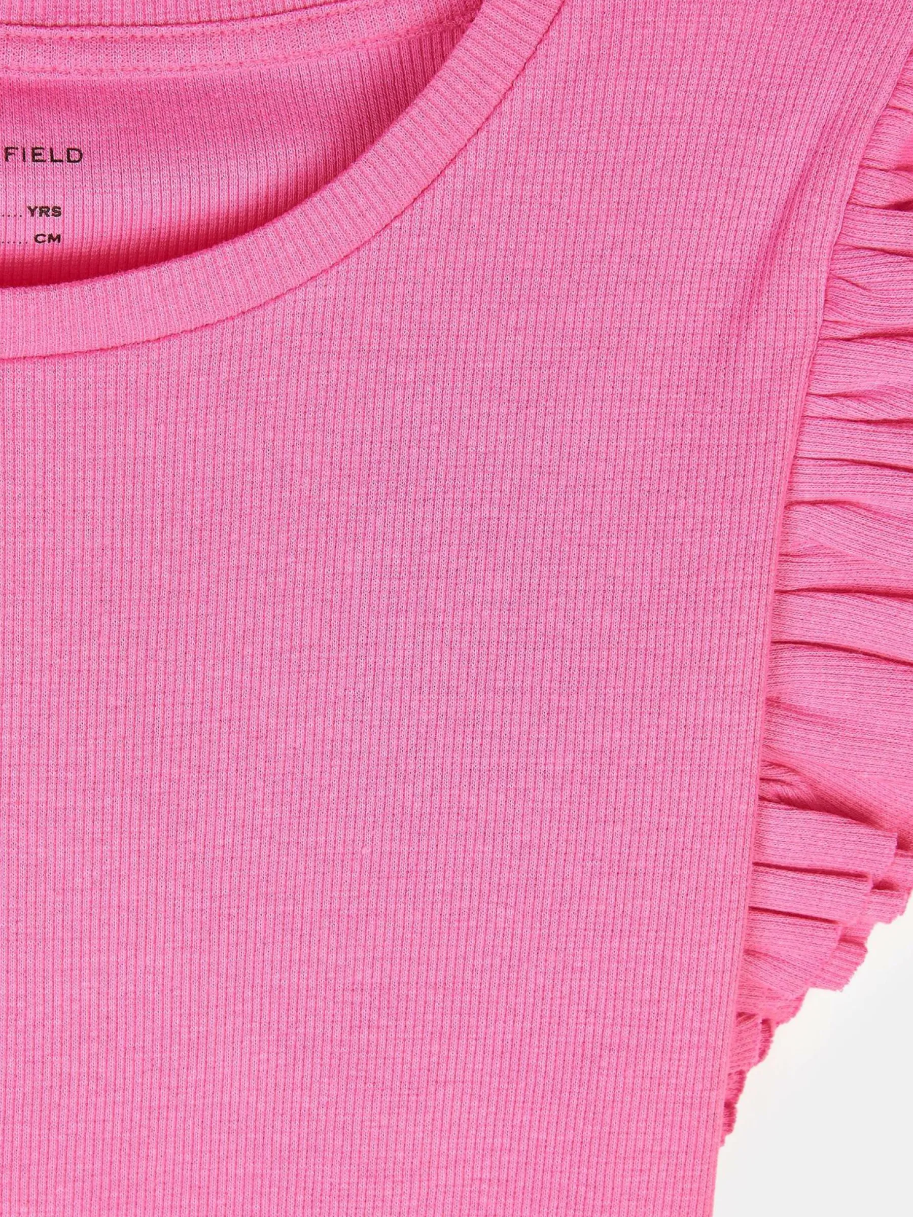 Kolor: różowyKrój: z falbanąTyp: koszulkaRekaw: krótki rękawDługość: krótkiPattern style: pojedynczy kolor, ż…