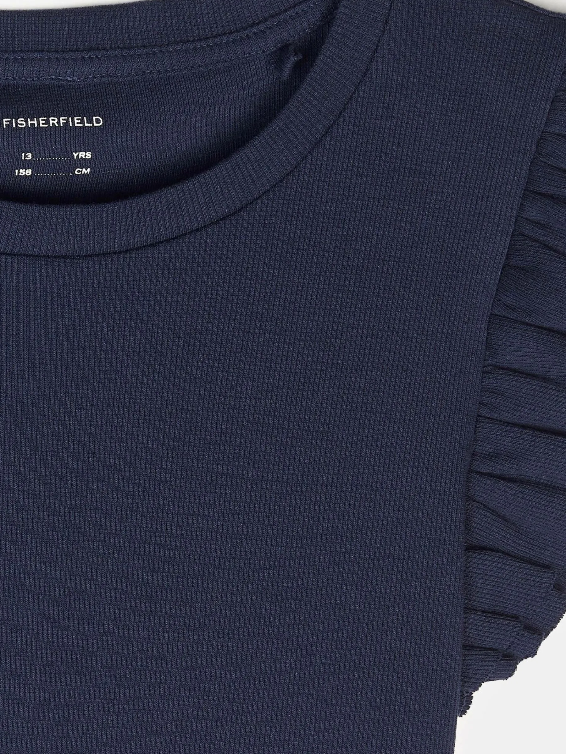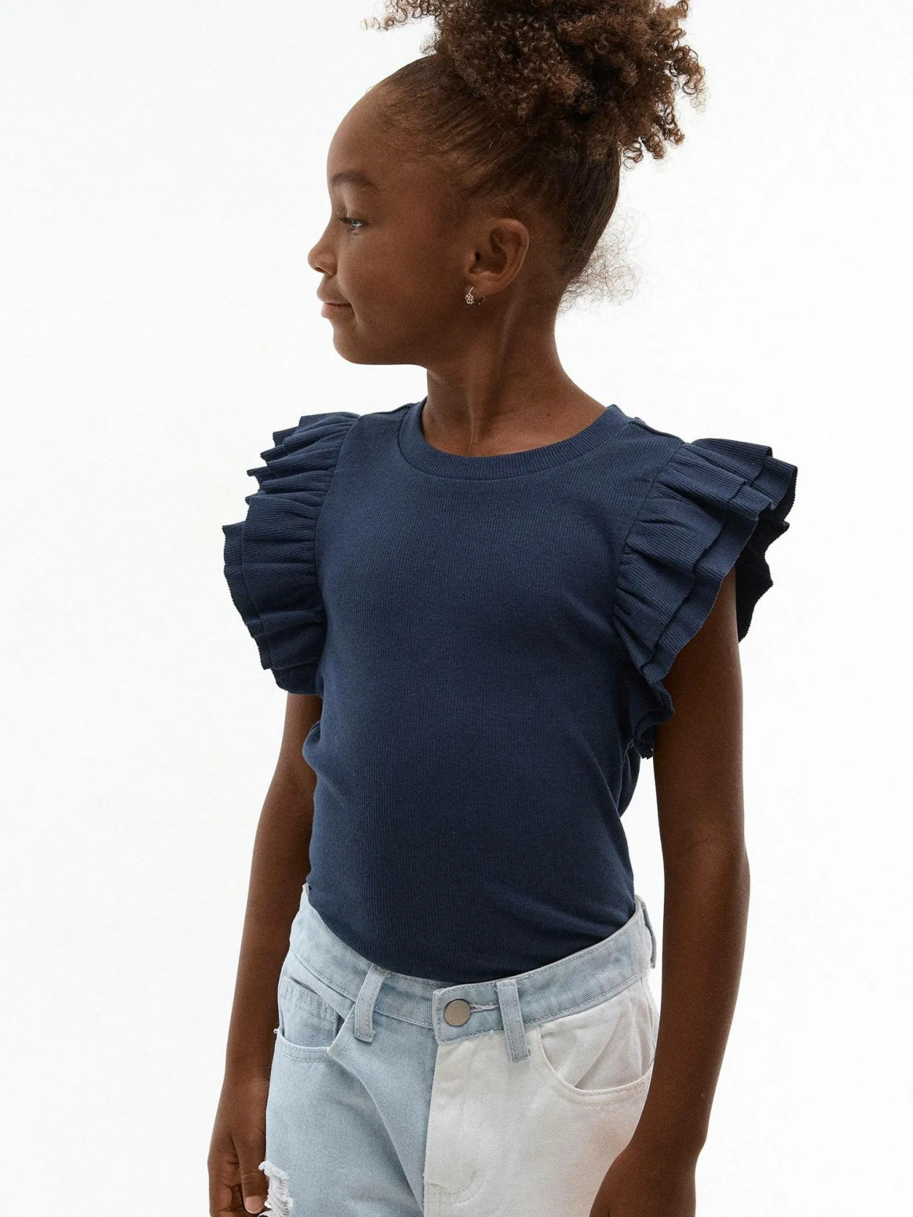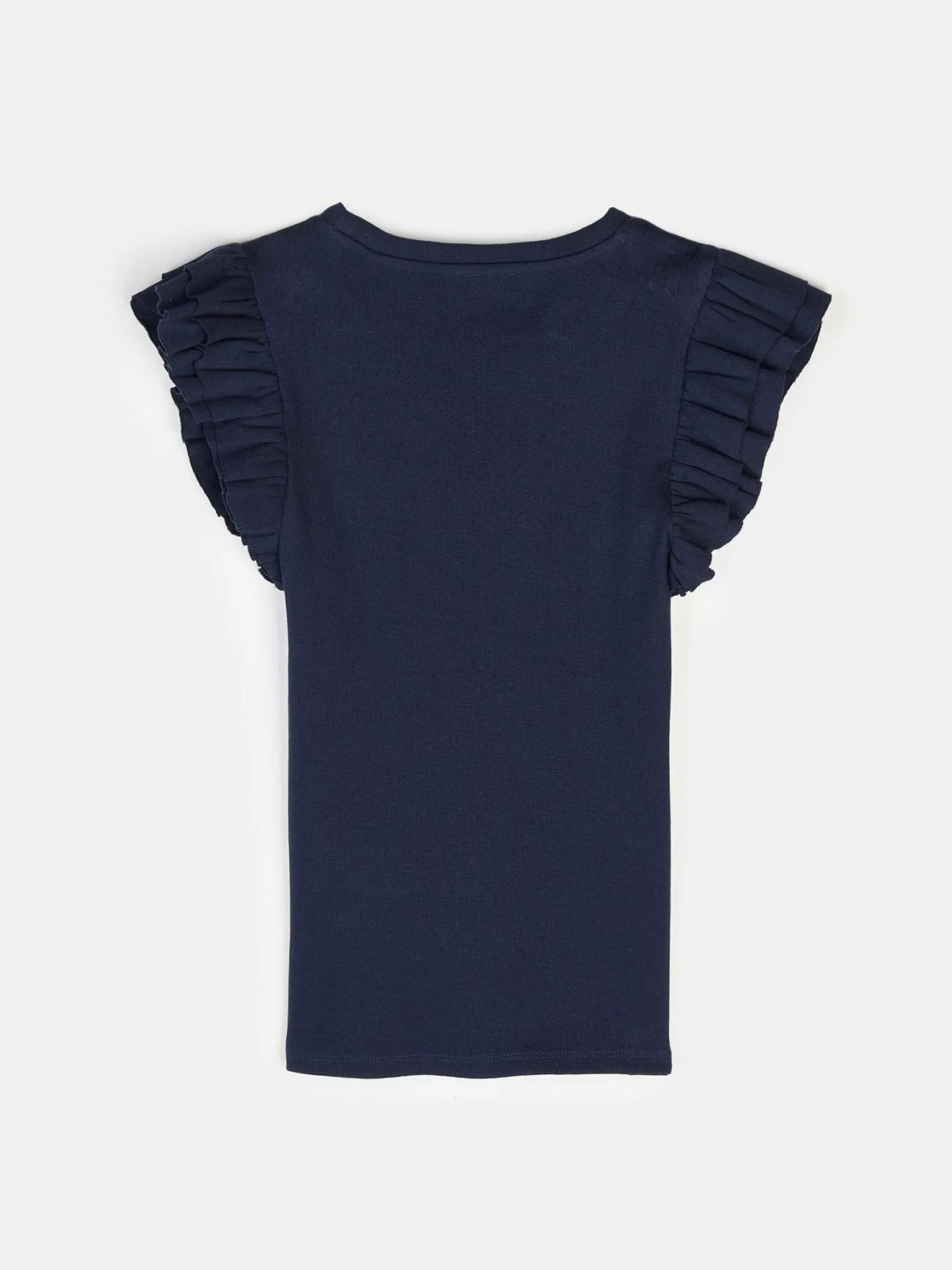 Zdjęcia z modelką mogą nie odpowiadać rzeczywistemu kolorowi produktu.Kolor: granatowyKrój: z falbanąTyp: koszulka…
