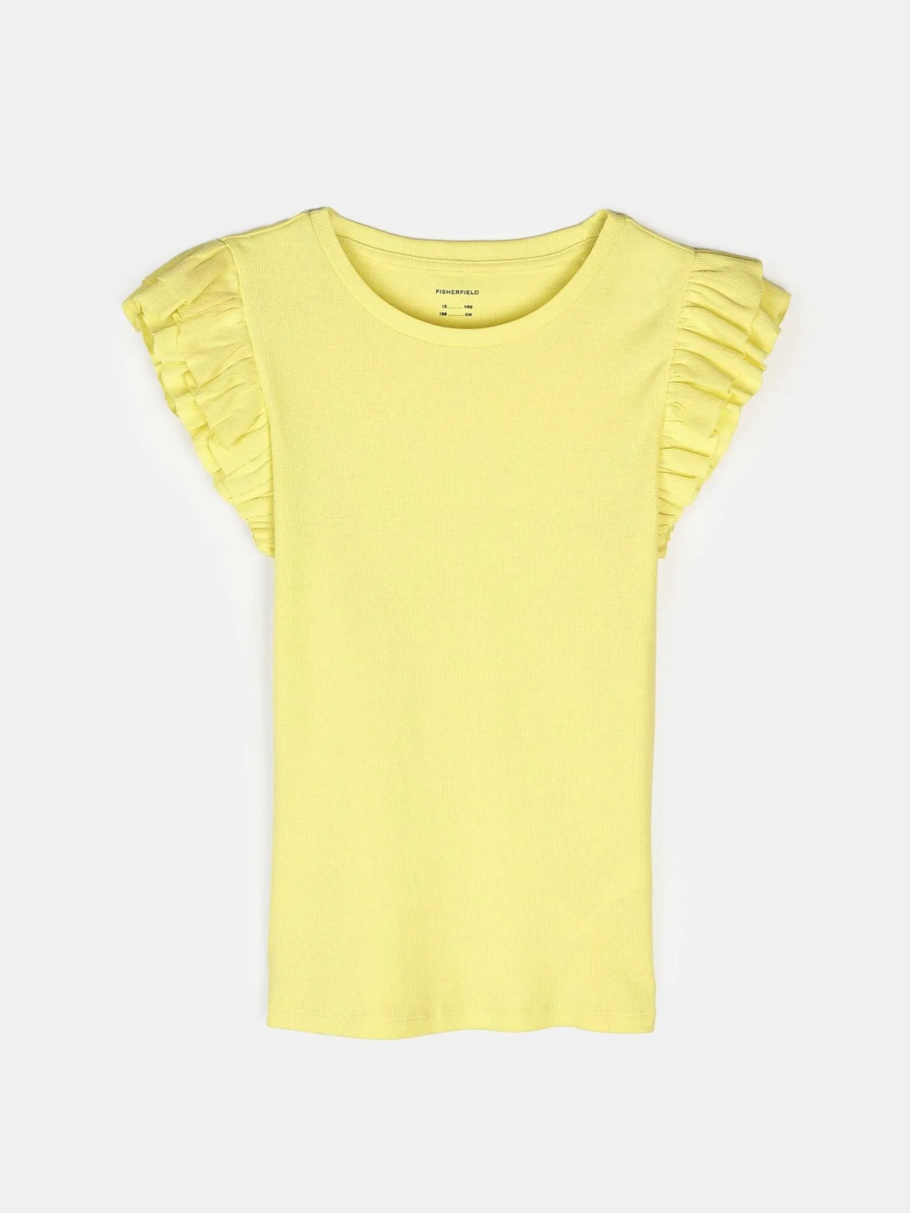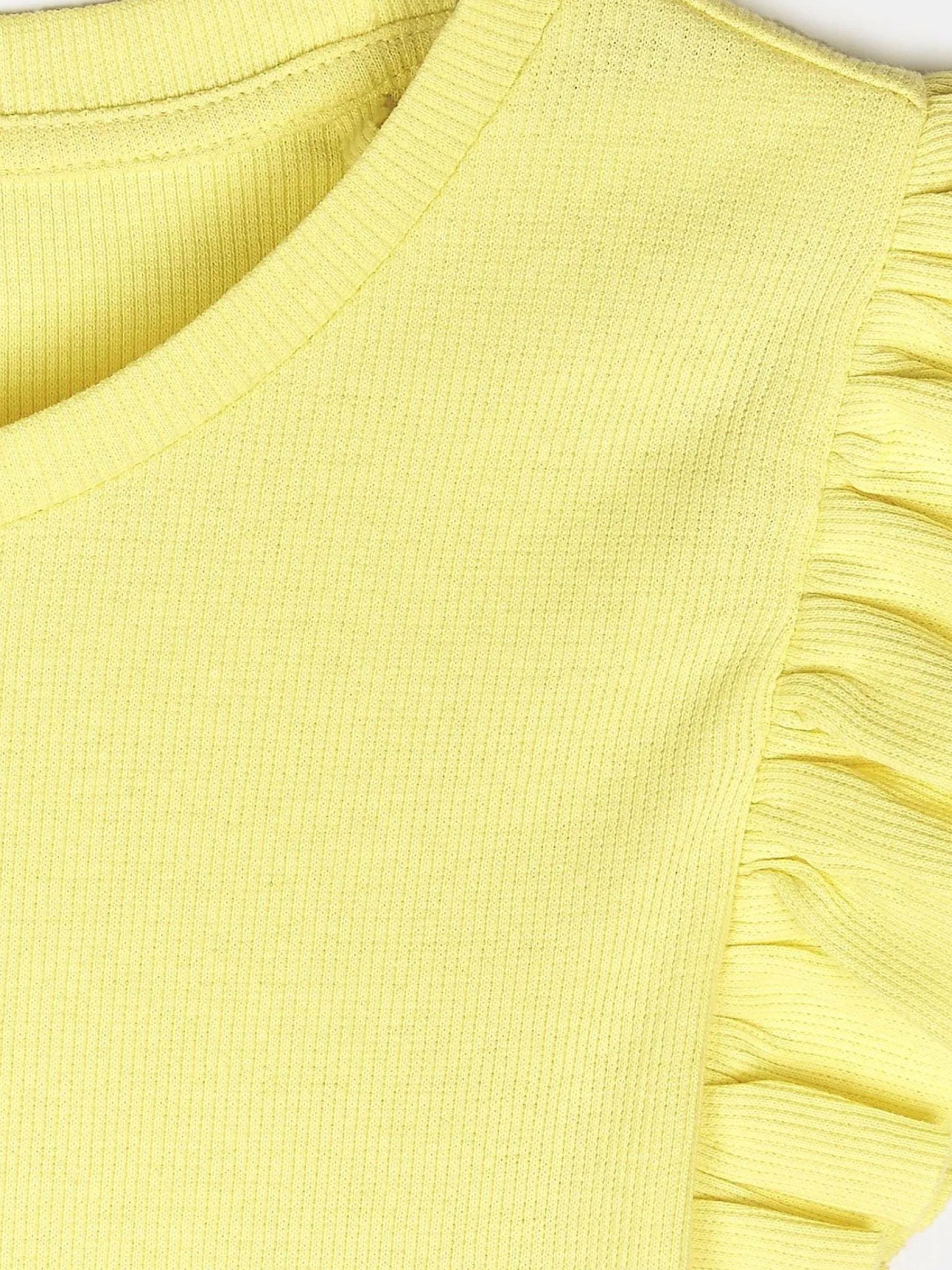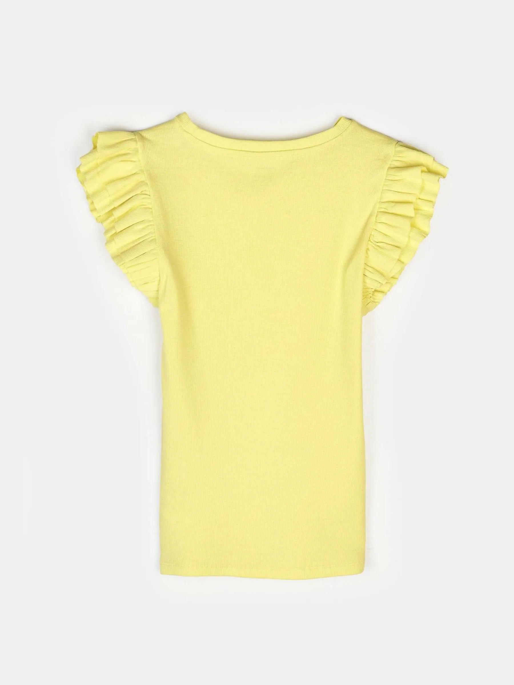 Kolor: żółtyKrój: z falbanąTyp: koszulkaRekaw: krótki rękawDługość: krótkiPattern style: pojedynczy kolor, ż…
