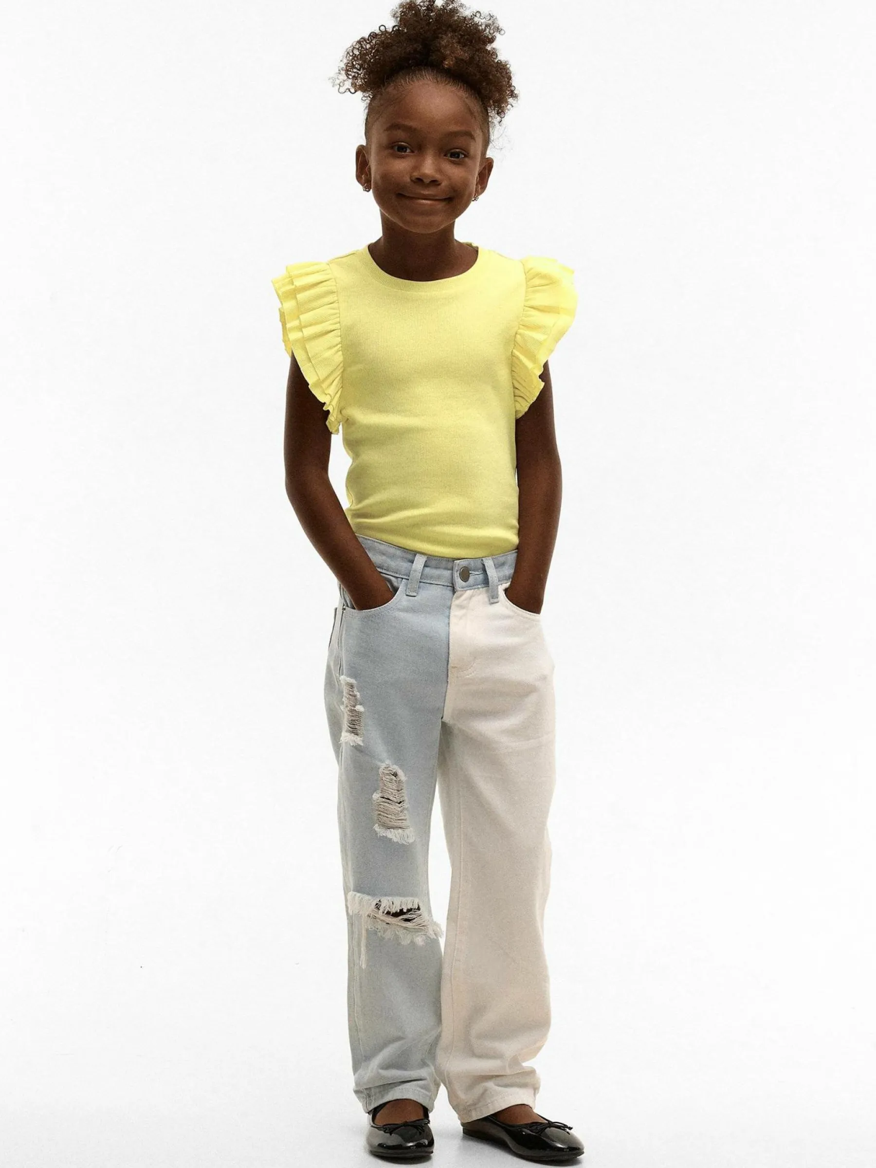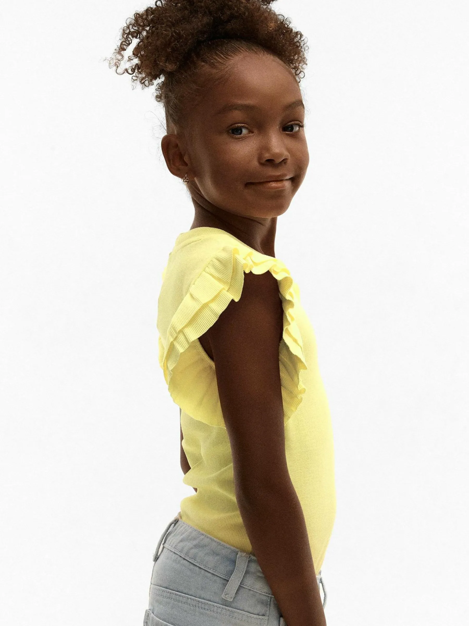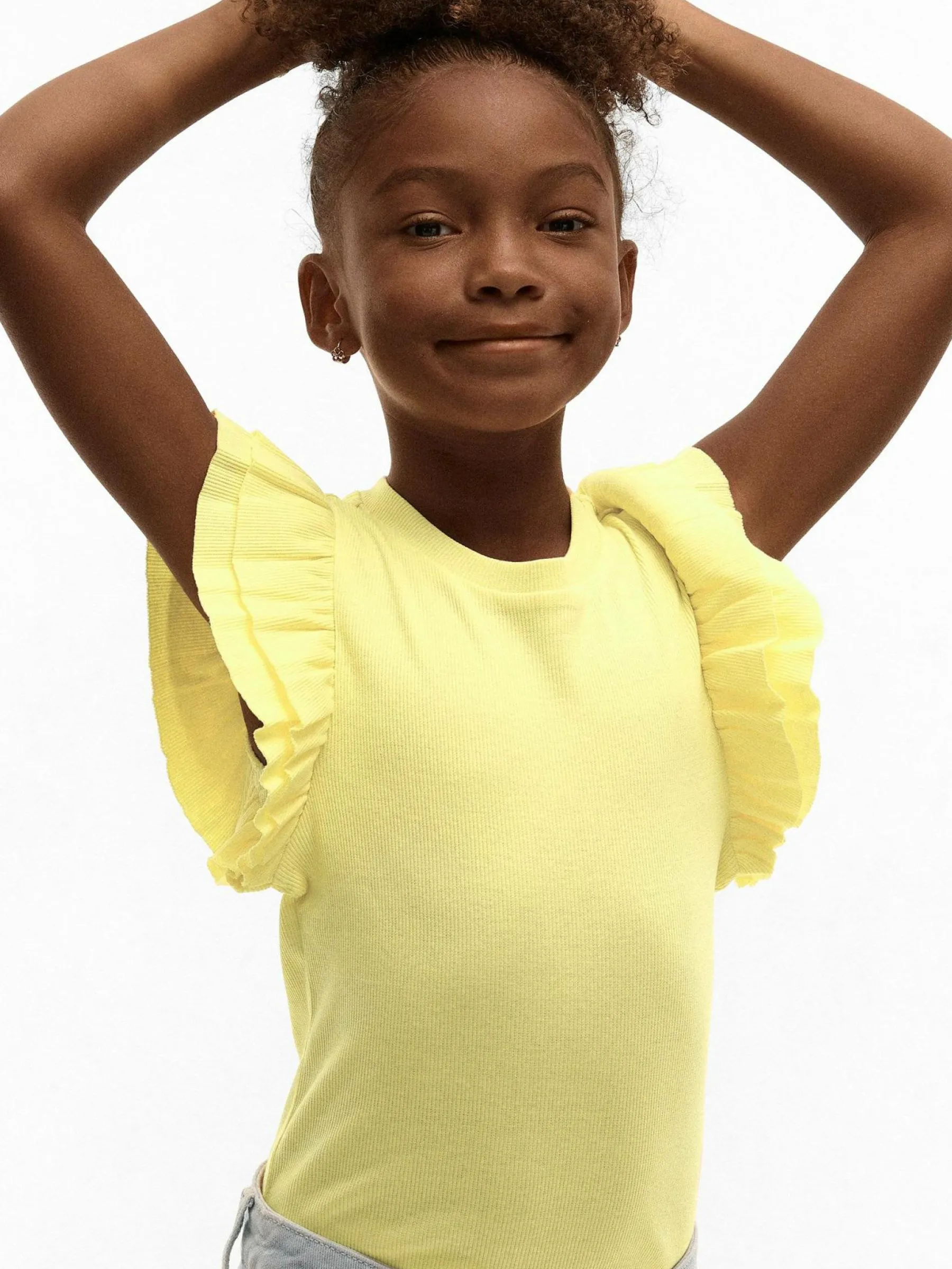 Kolor: żółtyKrój: z falbanąTyp: koszulkaRekaw: krótki rękawDługość: krótkiPattern style: pojedynczy kolor, ż…
